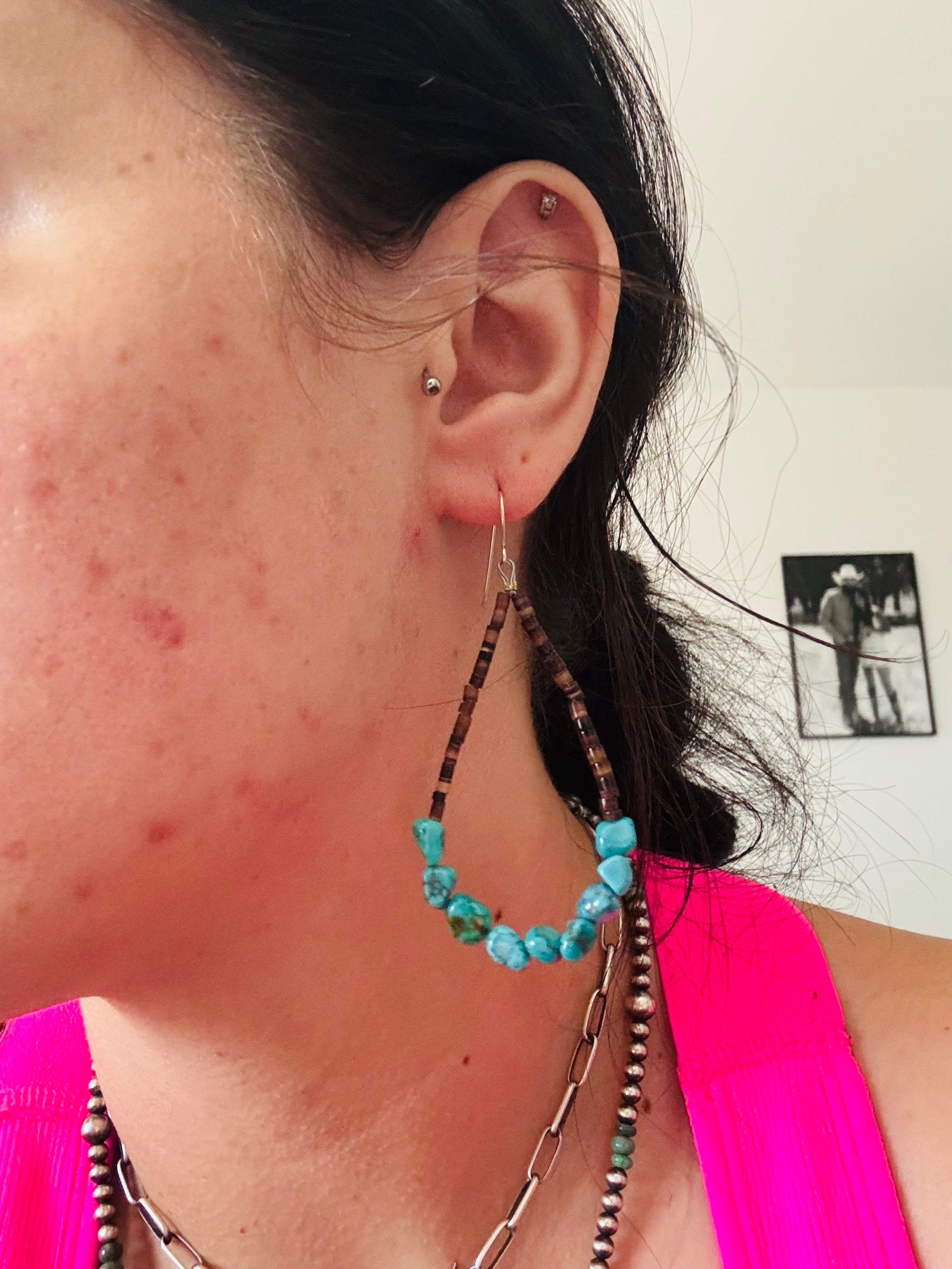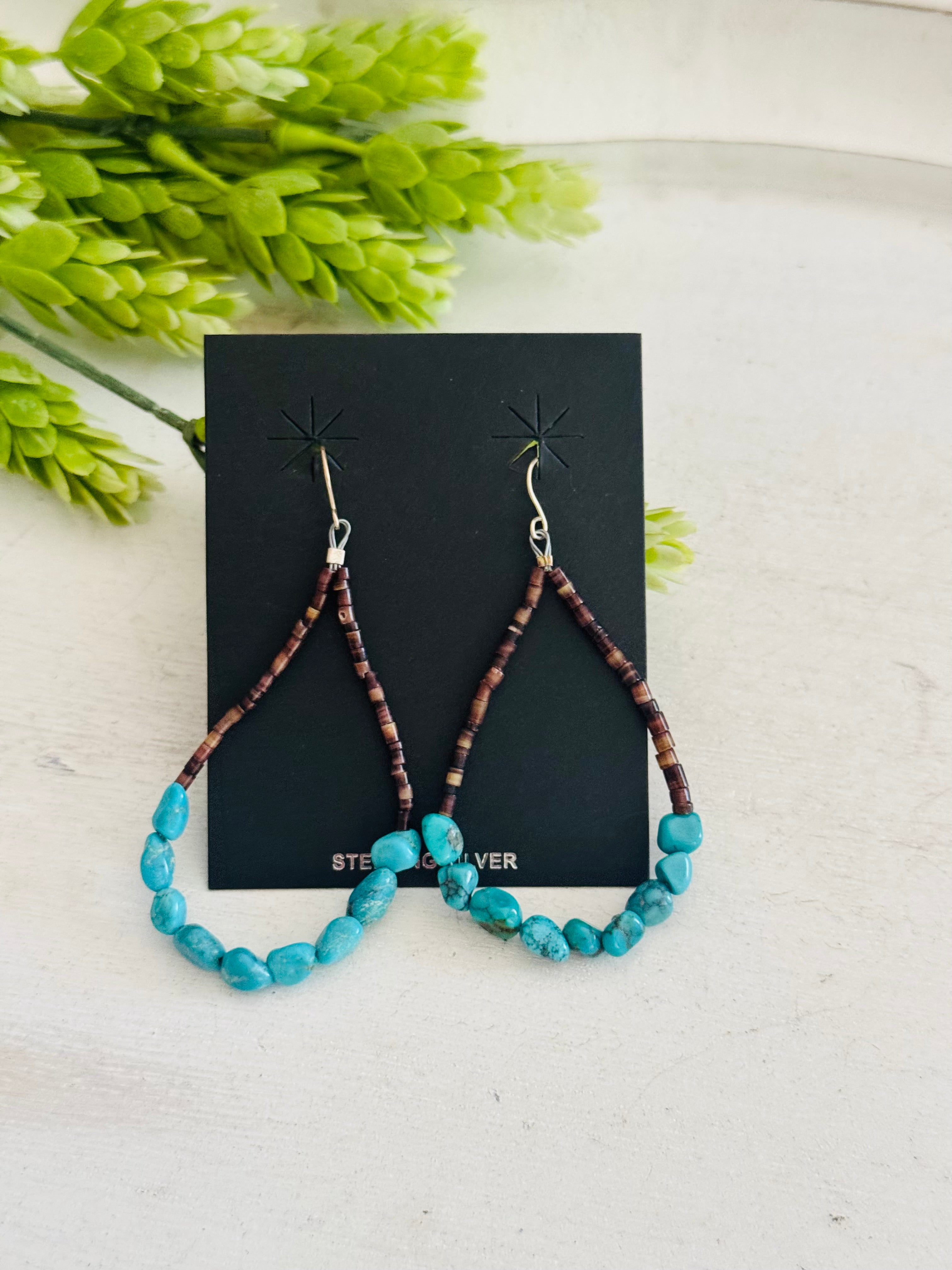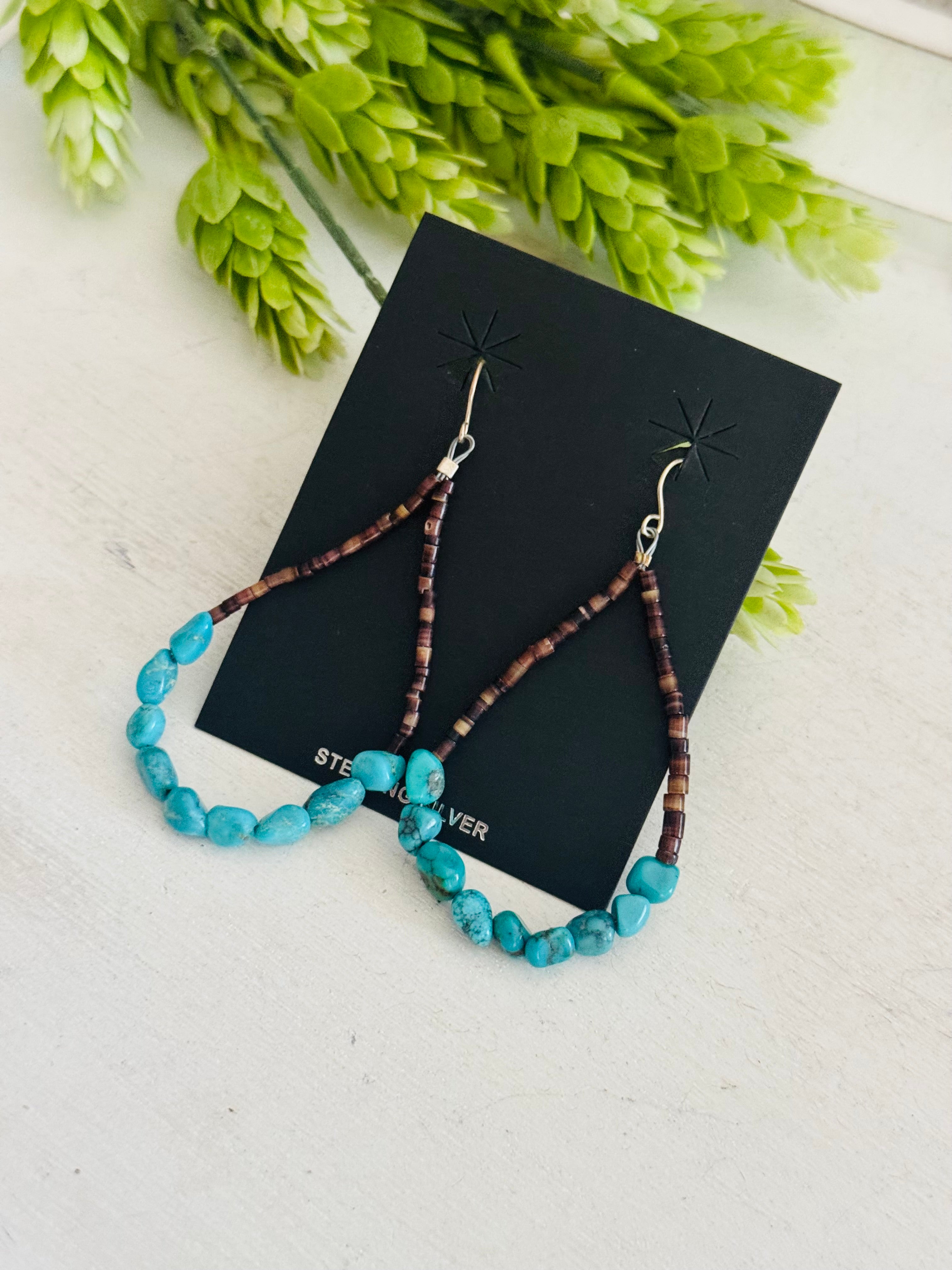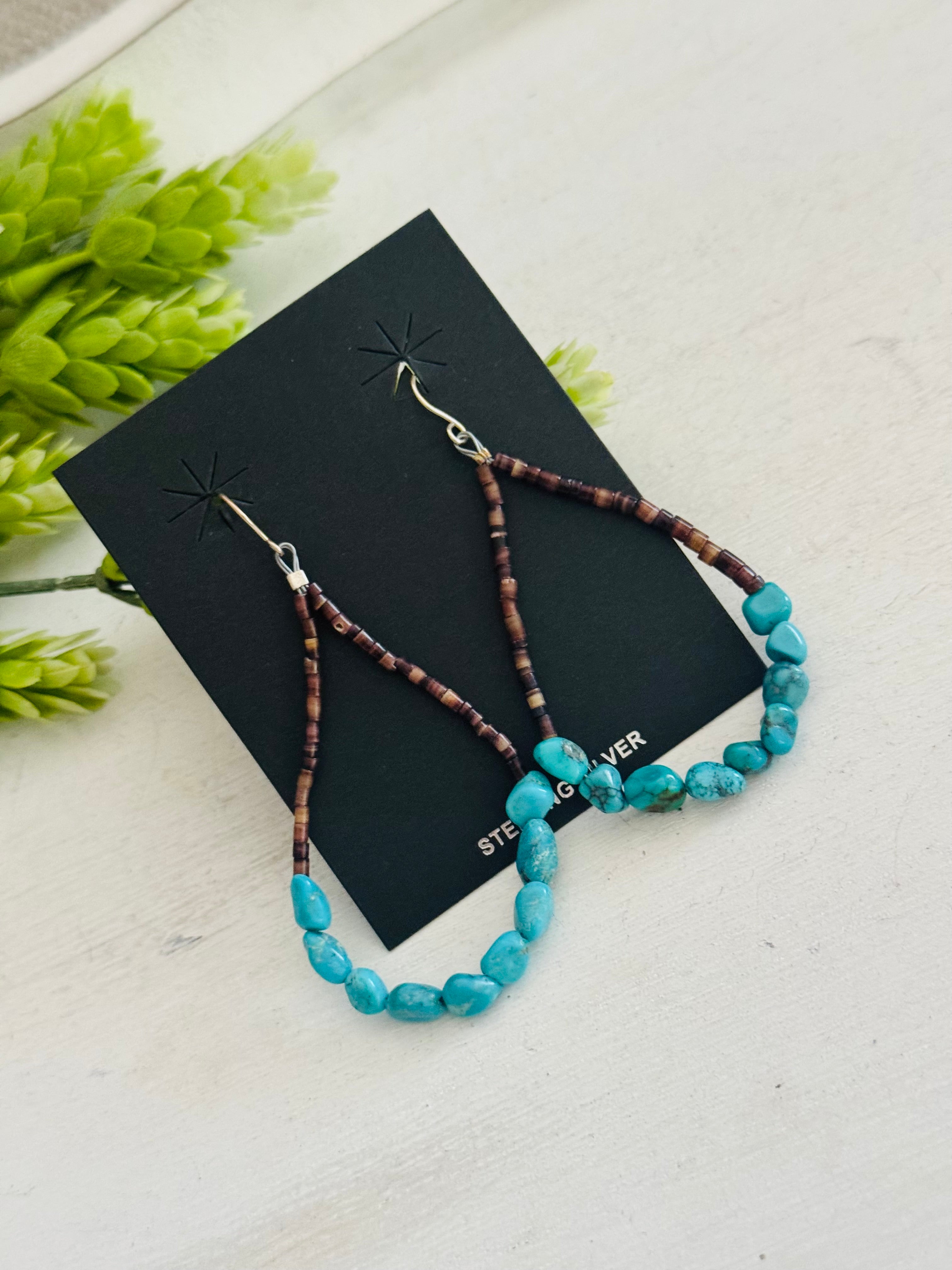 Southwest Strung Kingman Turquoise & Sterling Silver Beaded Heshi Dangle Earrings. It measures 3 inches long.