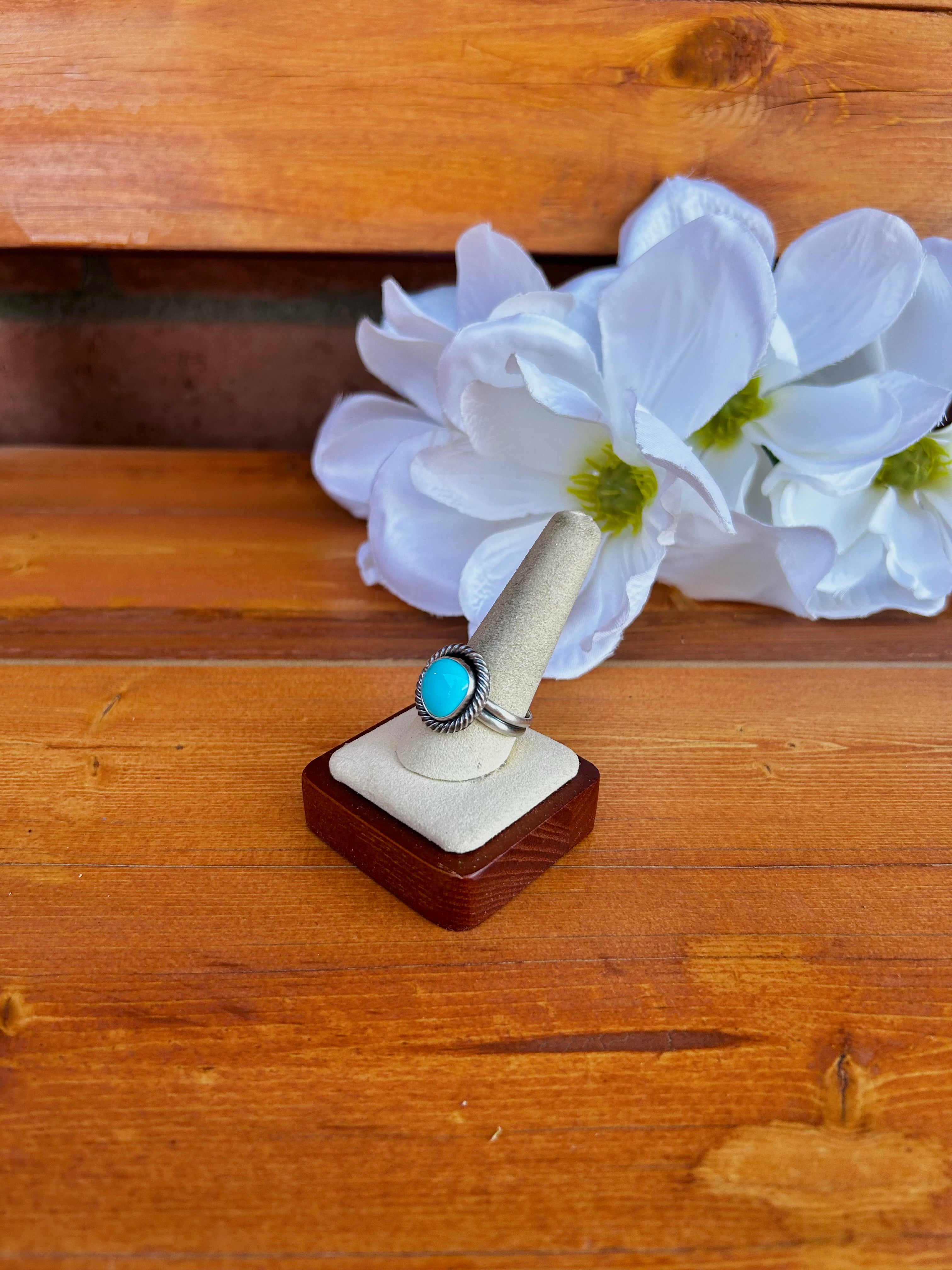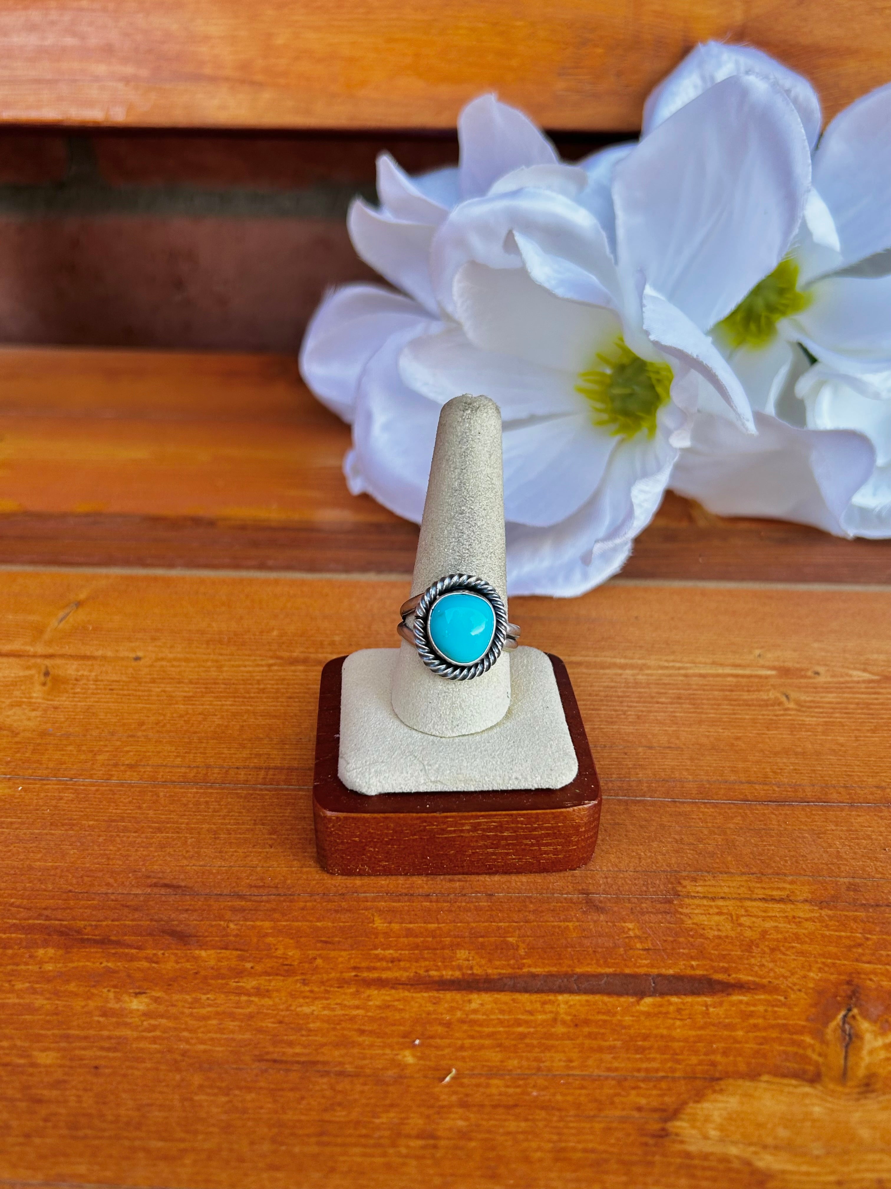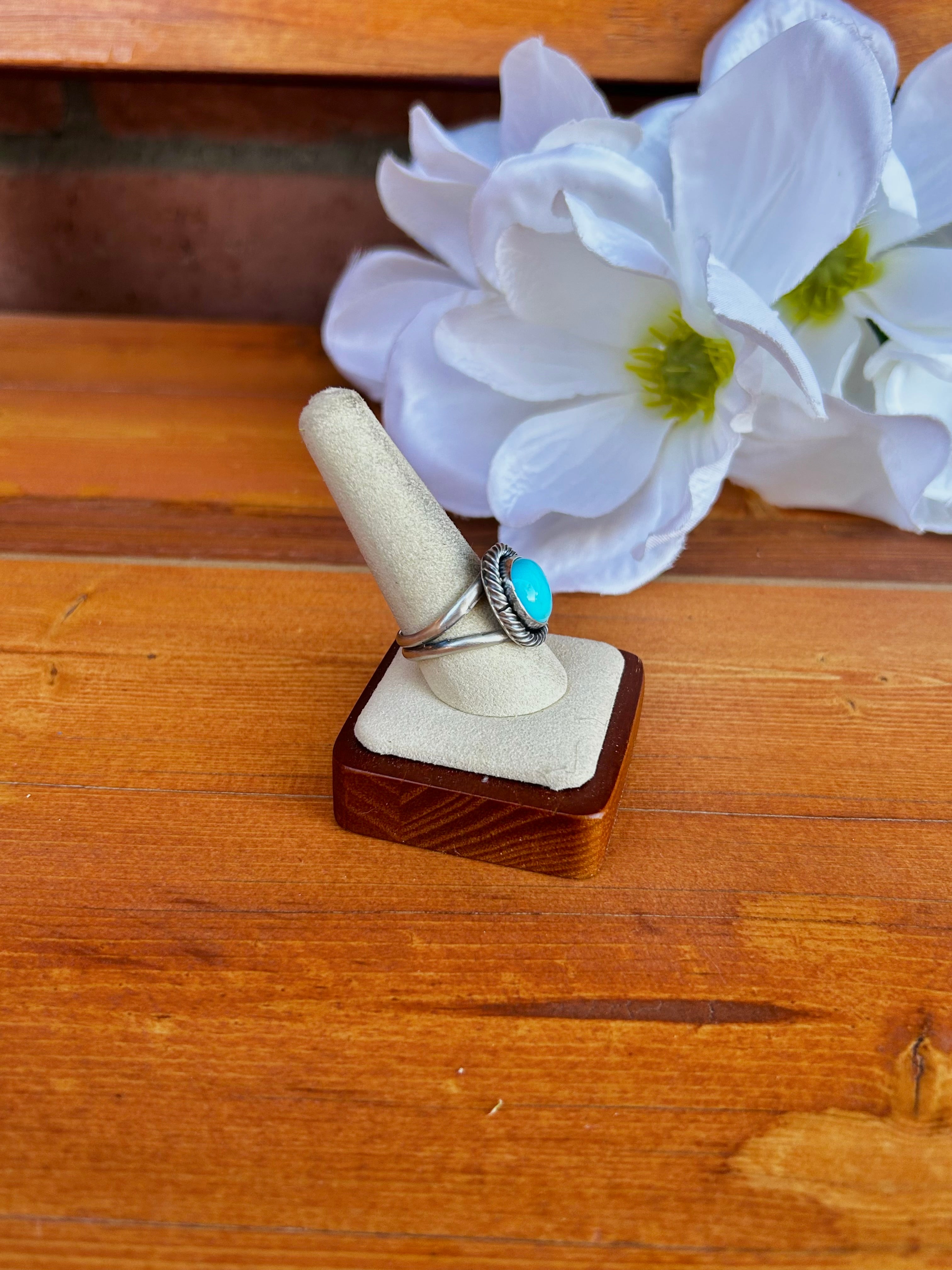 Danny Henio Kingman Turquoise & Sterling Silver Adjustable Ring. It measures 3/4 of an inch long and 5/8 of an inch wide. Signed by the artist and stamped sterling silver.