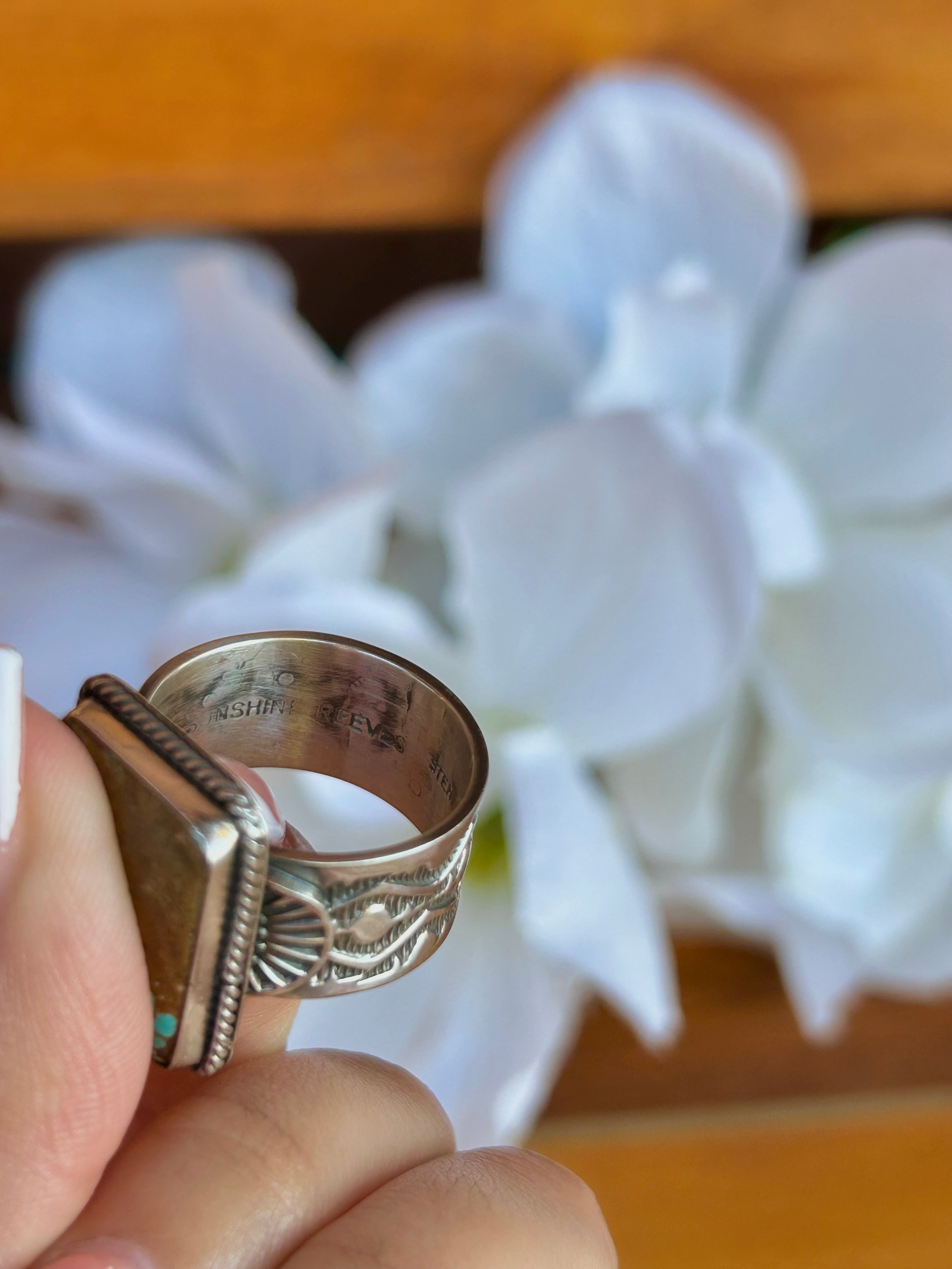 Sunshine Reeves #8 Turquoise & Sterling Silver Ring Size 11.5. It measures 7/8 of an inch long and 3/4 of an inch wide. Signed by the artist and stamped sterling silver.