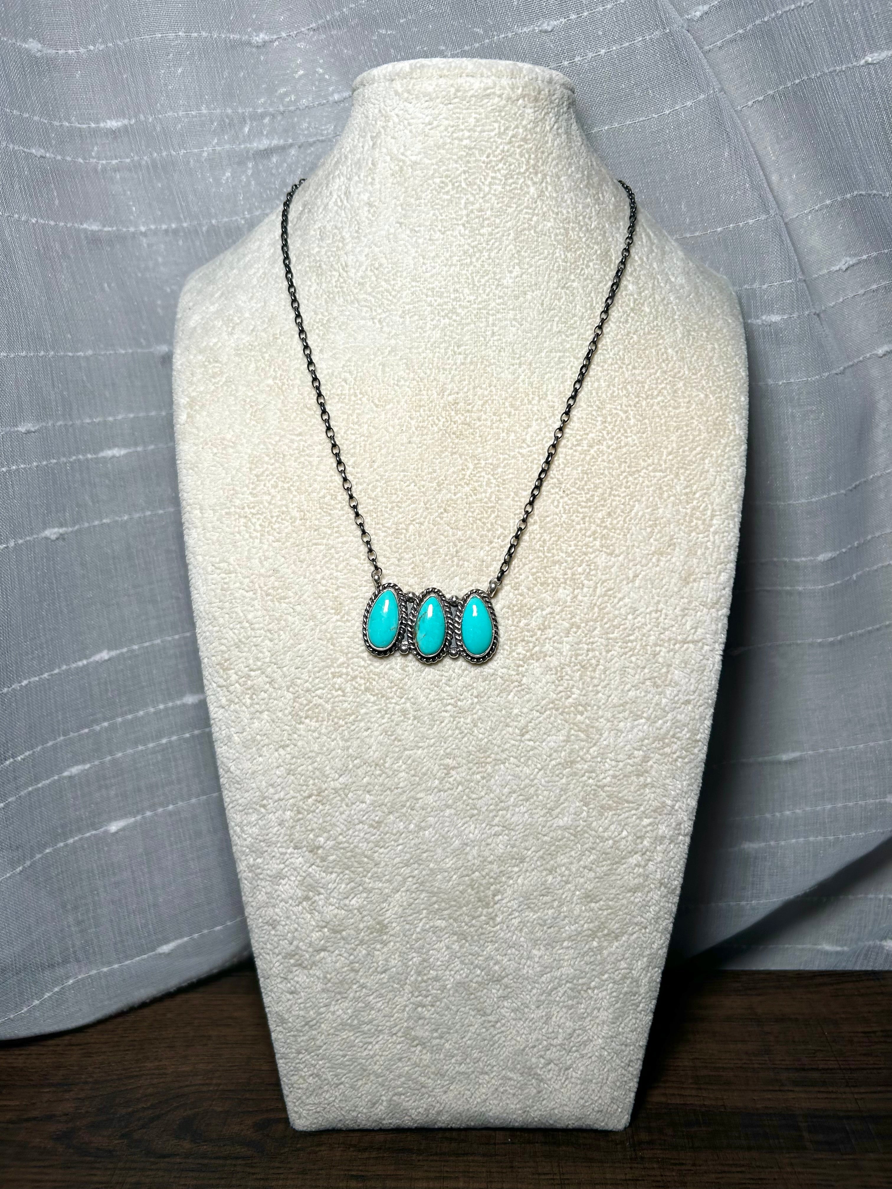 Donovan Skeets Kingman Turquoise & Sterling Silver Necklace. It measures 18 3/4 inches long with hang while the chain by itself measures 17 inches long. Signed by the artist and stamped sterling silver.