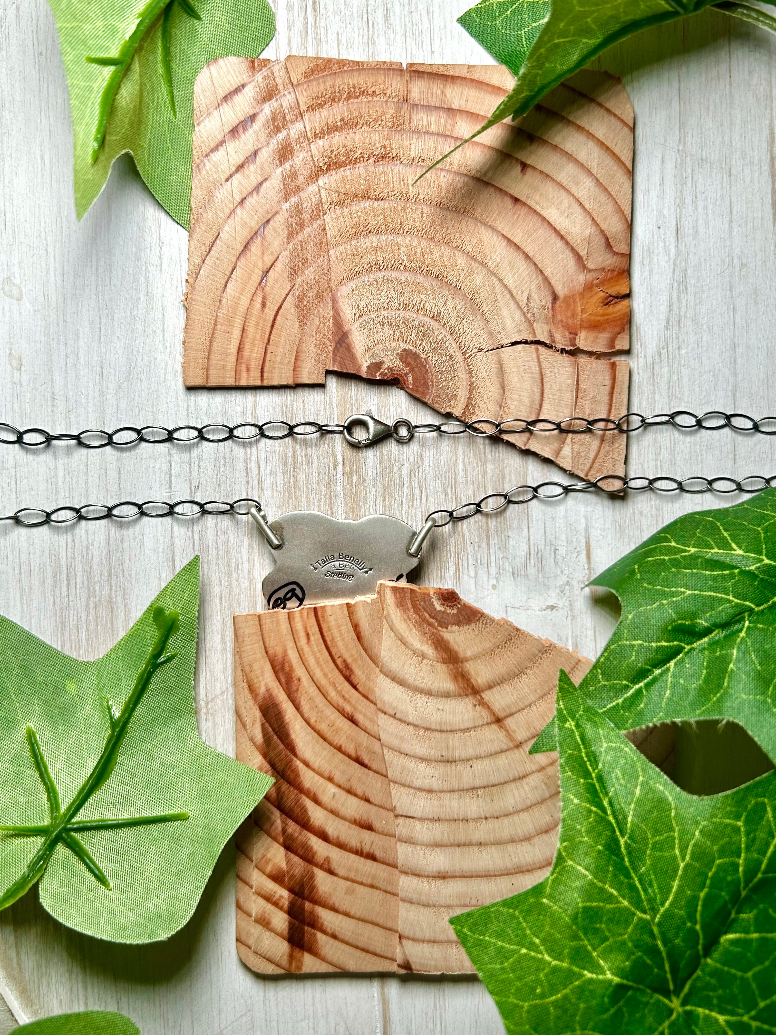 Talia Benally Blue Ridge Turquoise & Sterling Silver Necklace. It measures 18 3/4 inches long with hang while the chain measures 17 inches long. Signed by the artist and stamped sterling silver.