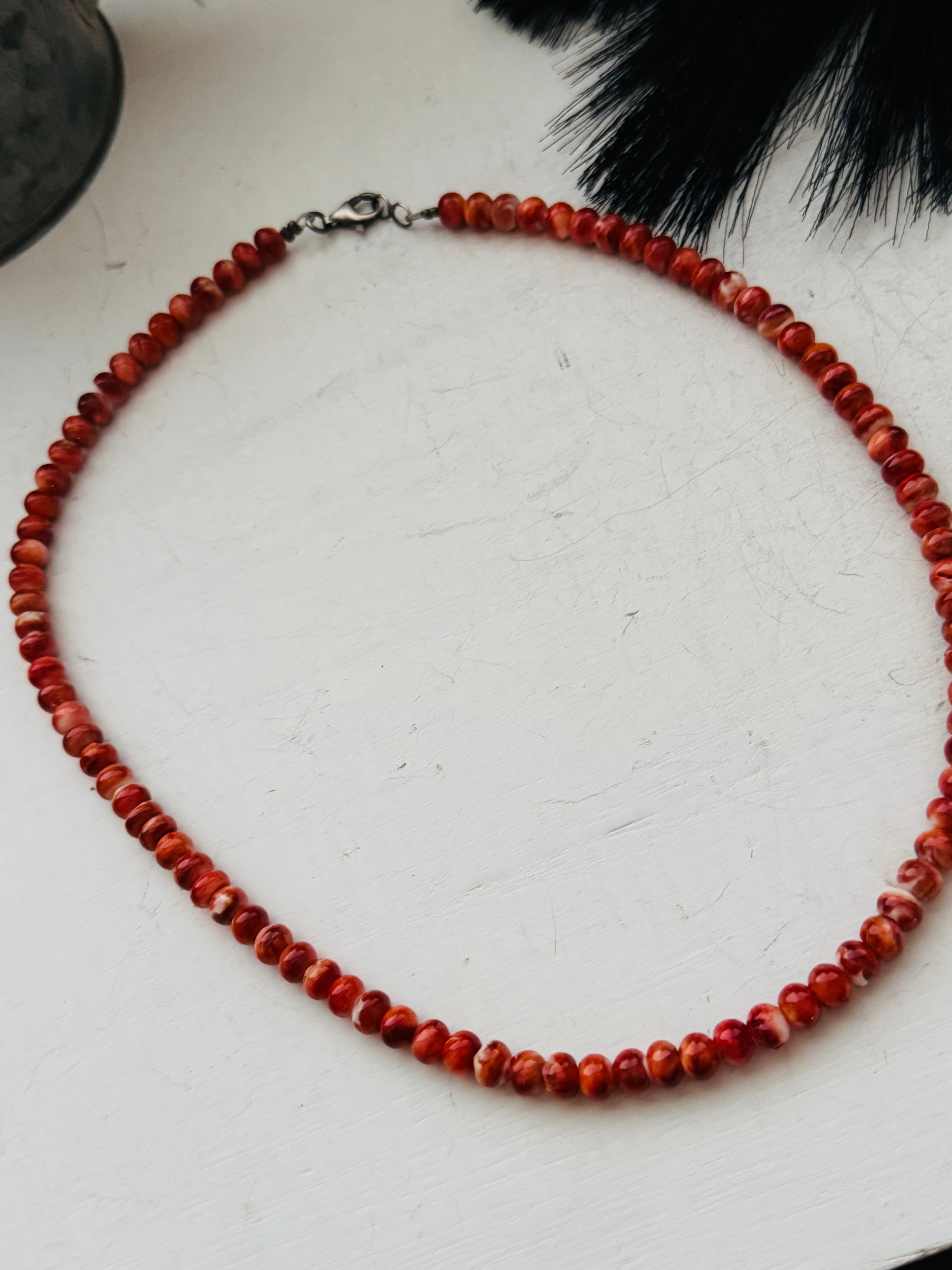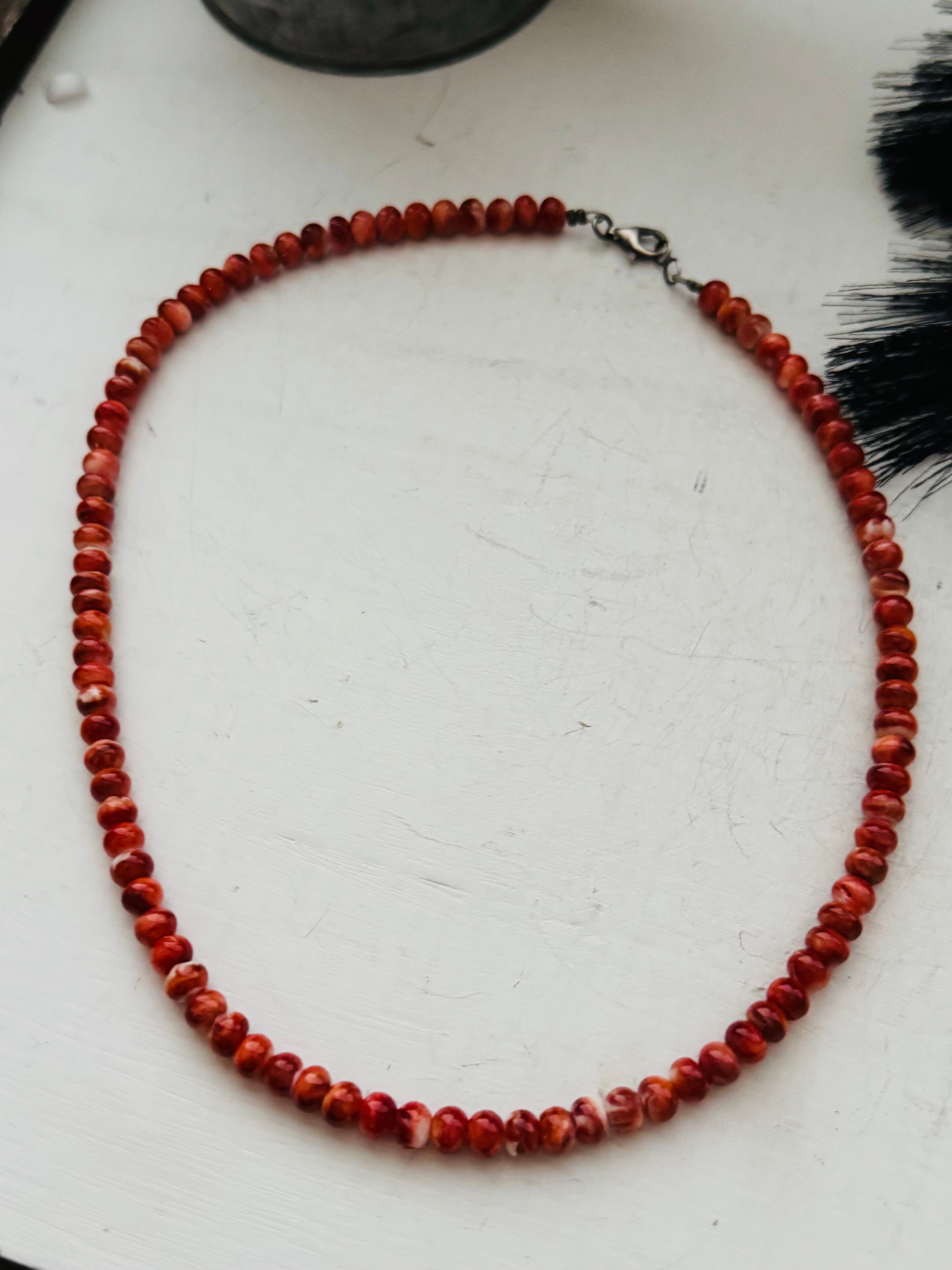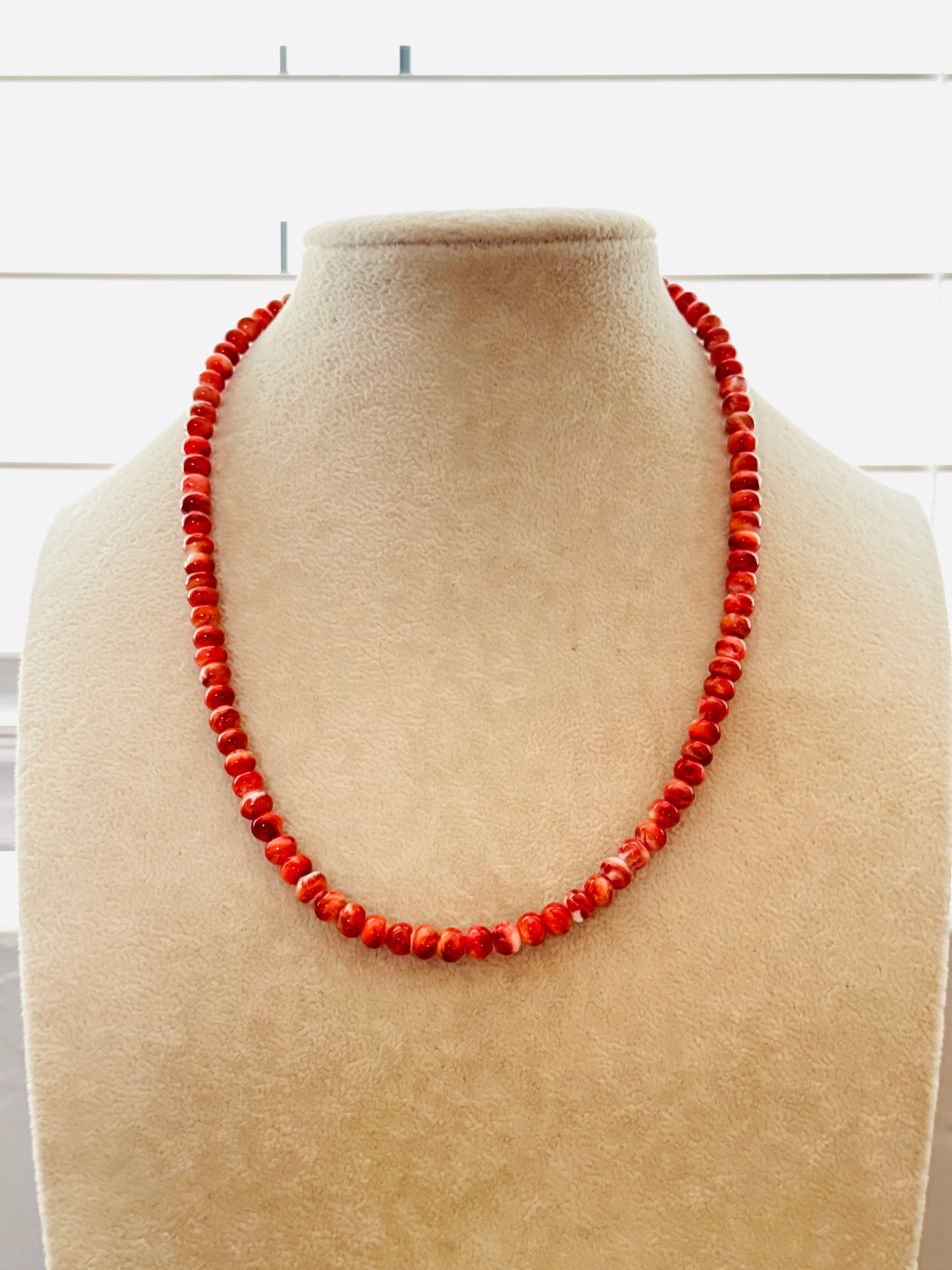 Theresa Skeets Red Spiny Oys & Sterling Silver Beaded Necklace. It measures 18 inches long.