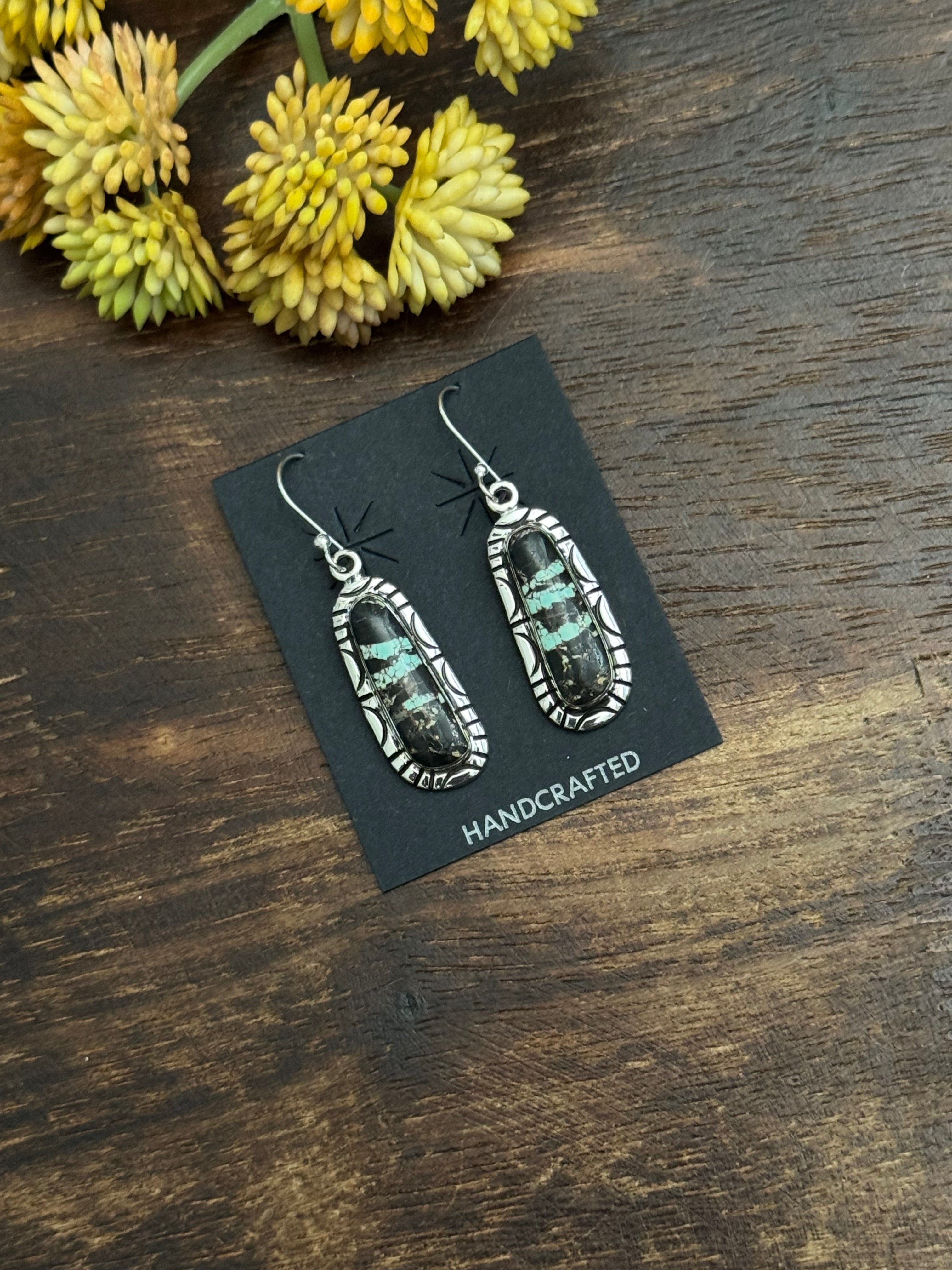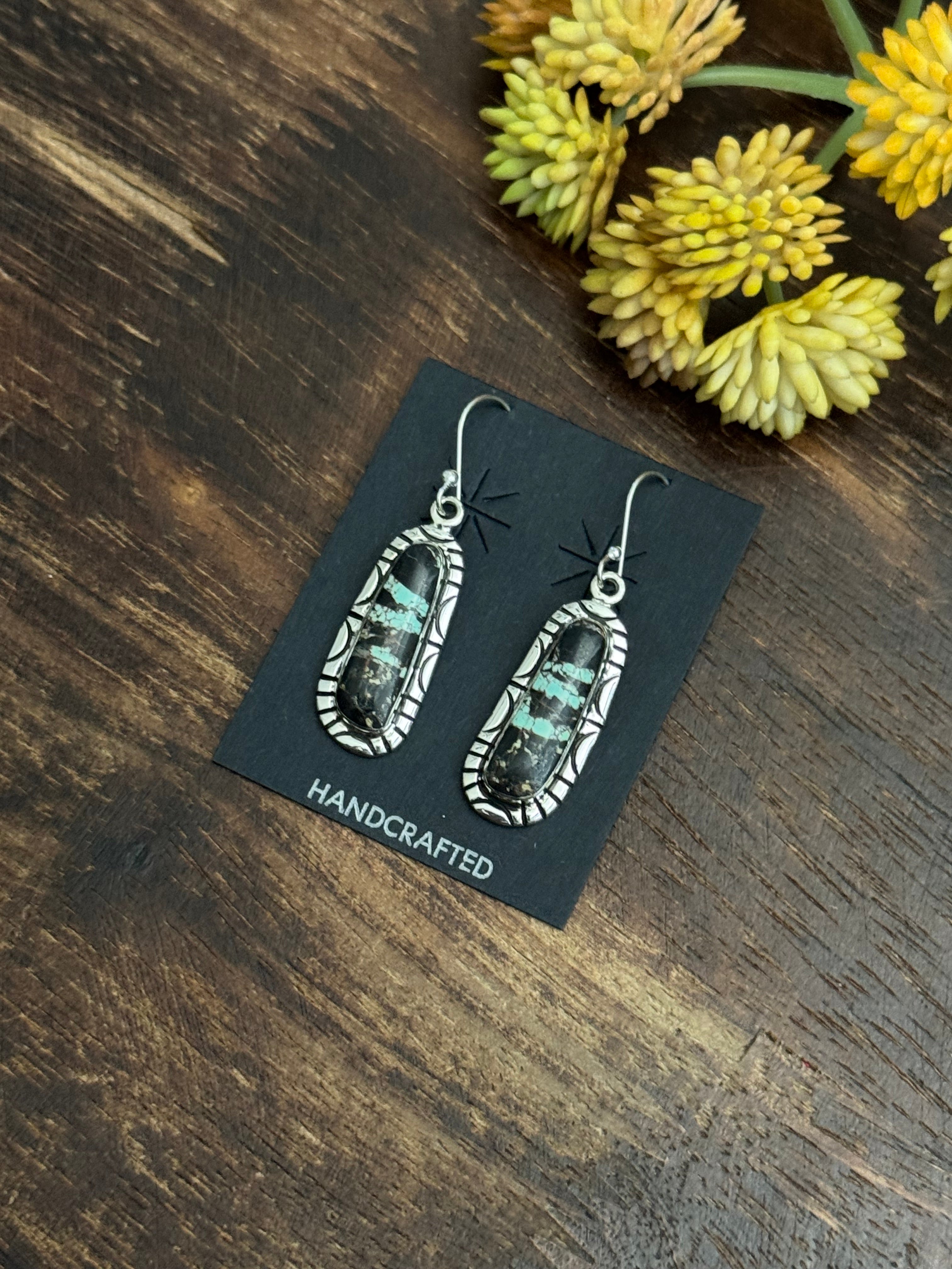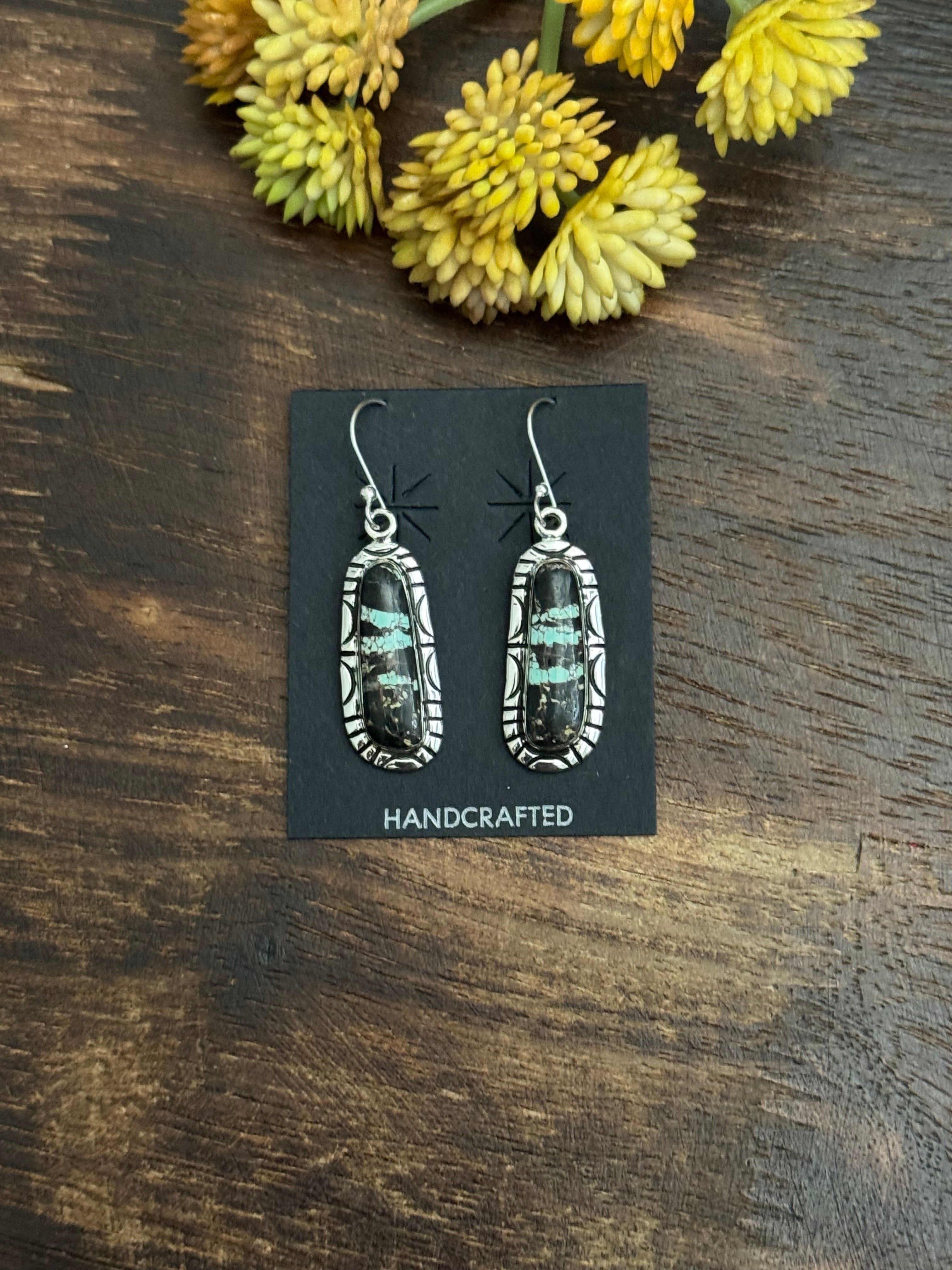 Navajo Made Black Jack Turquoise & Sterling Silver Dangle Earrings