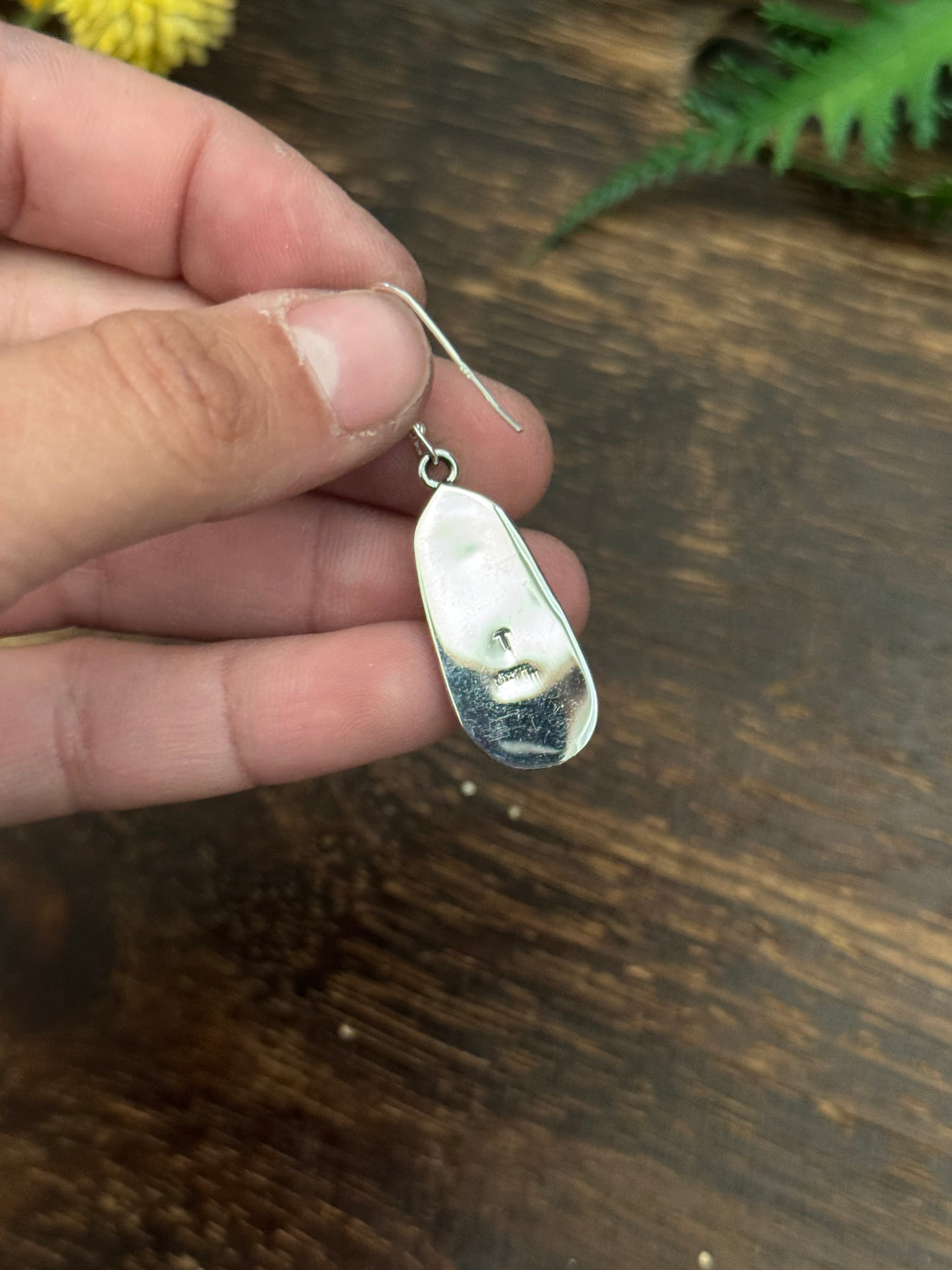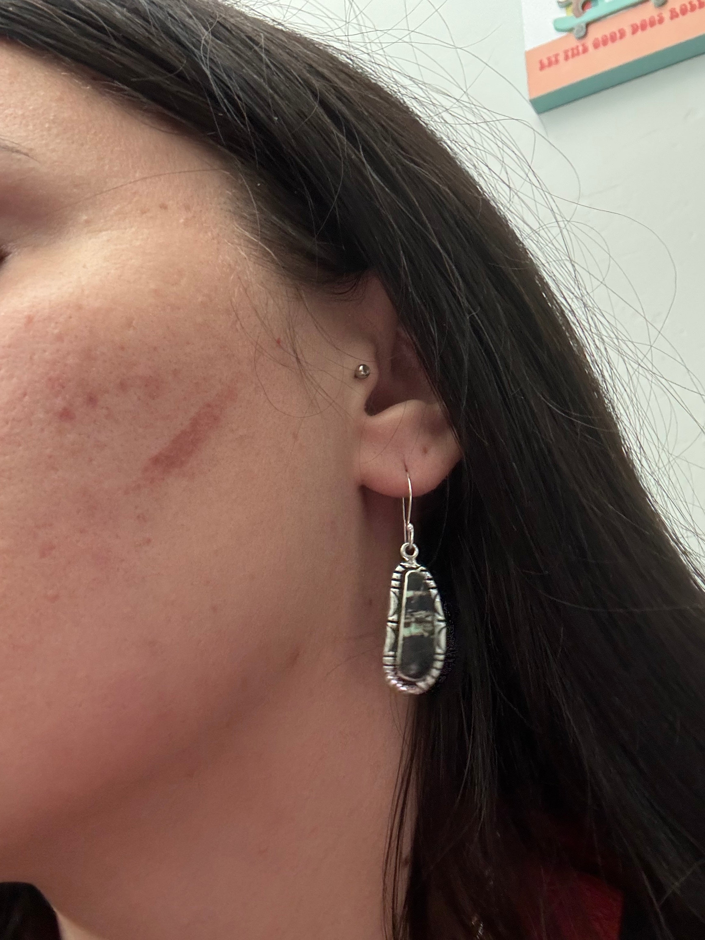 Navajo Made Black Jack Turquoise & Sterling Silver Dangle Earrings. They measure just over 1 5/8 inches long and 1/2 of an inch wide. Signed by the artist and stamped sterling silver.