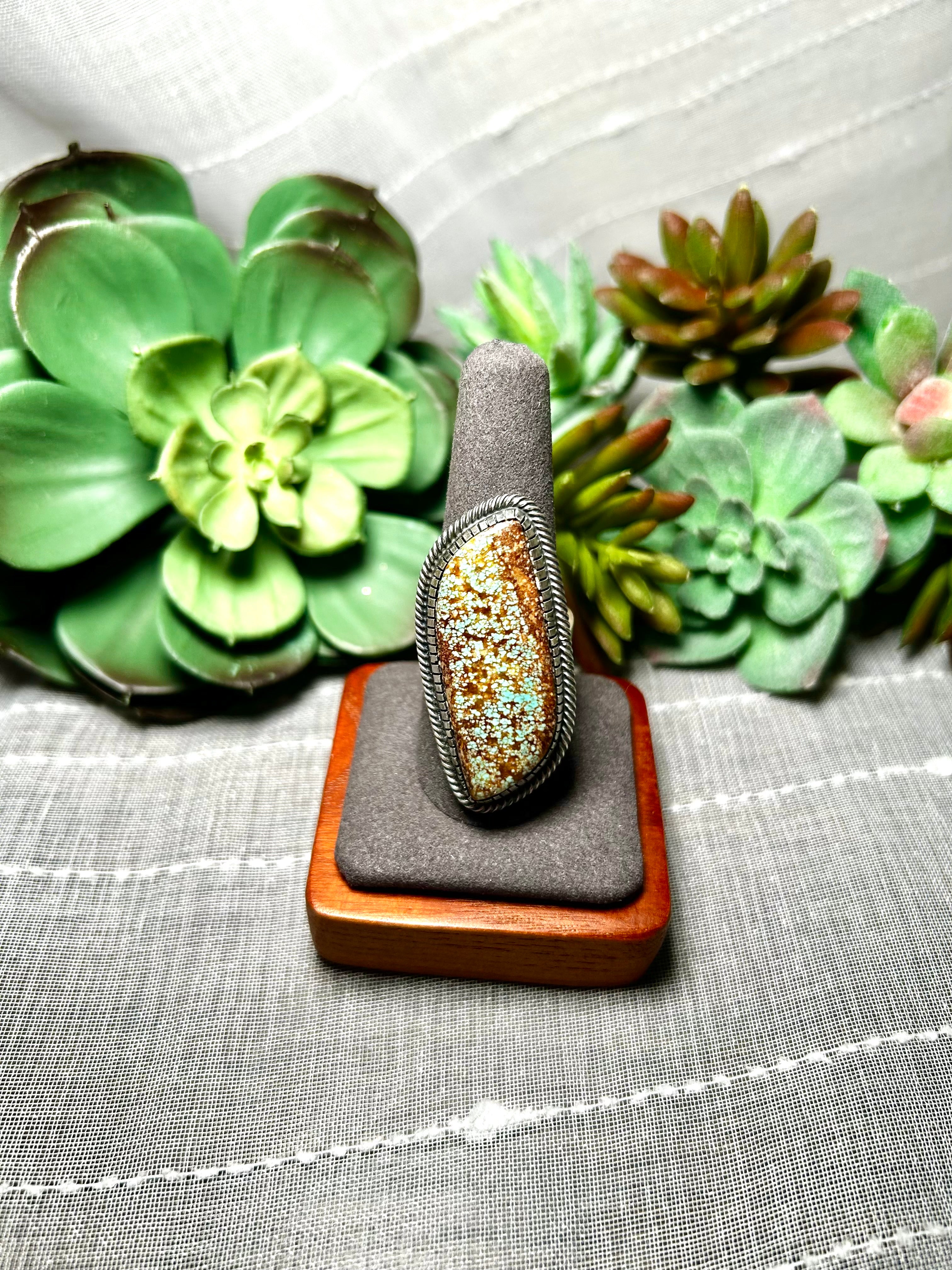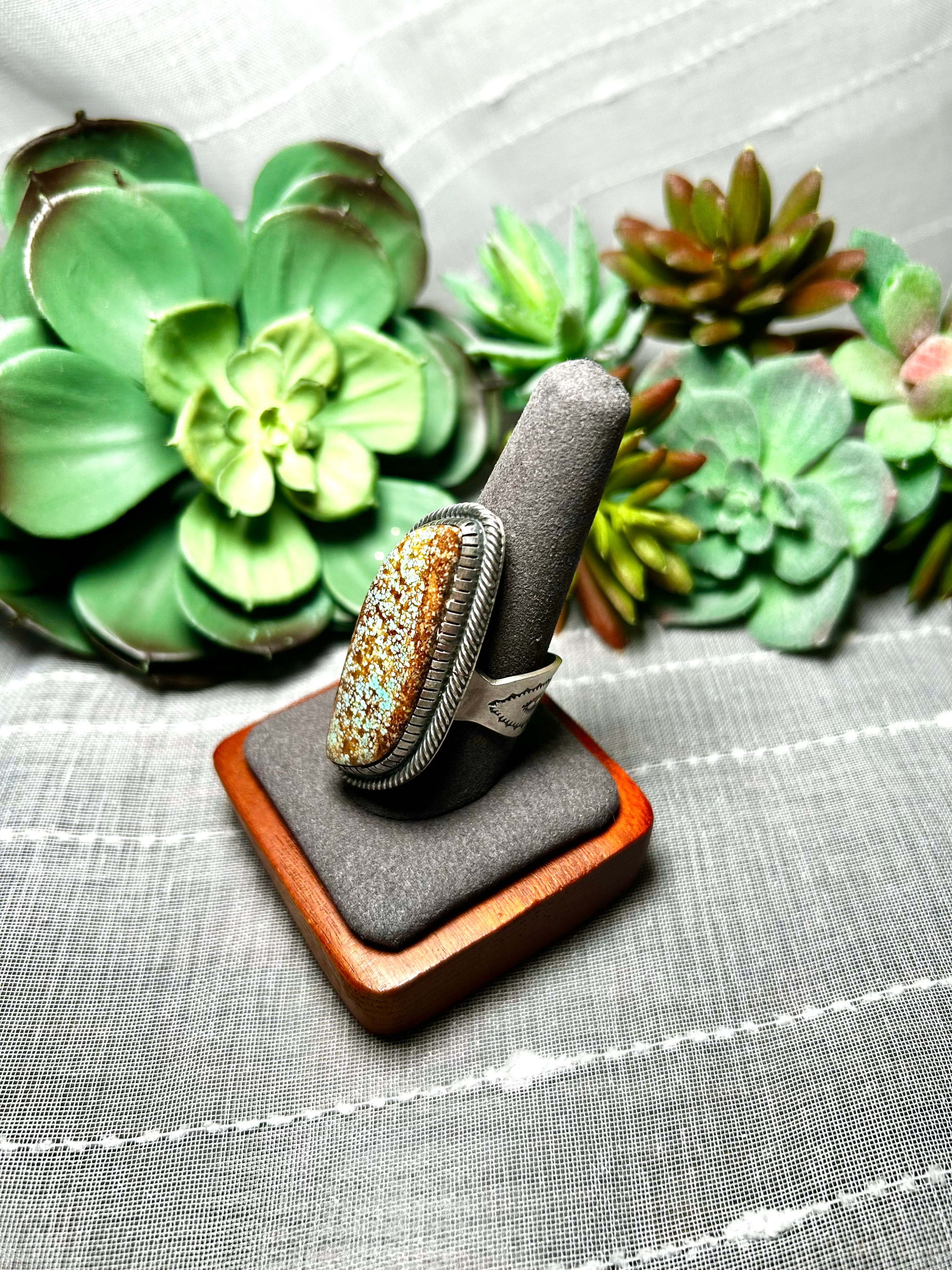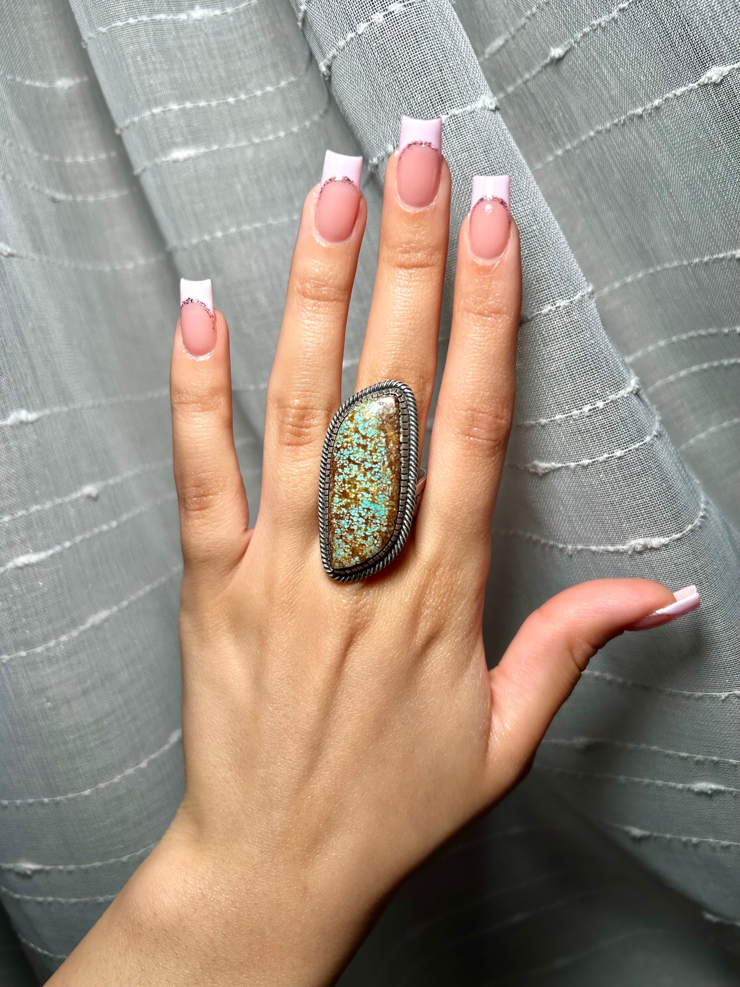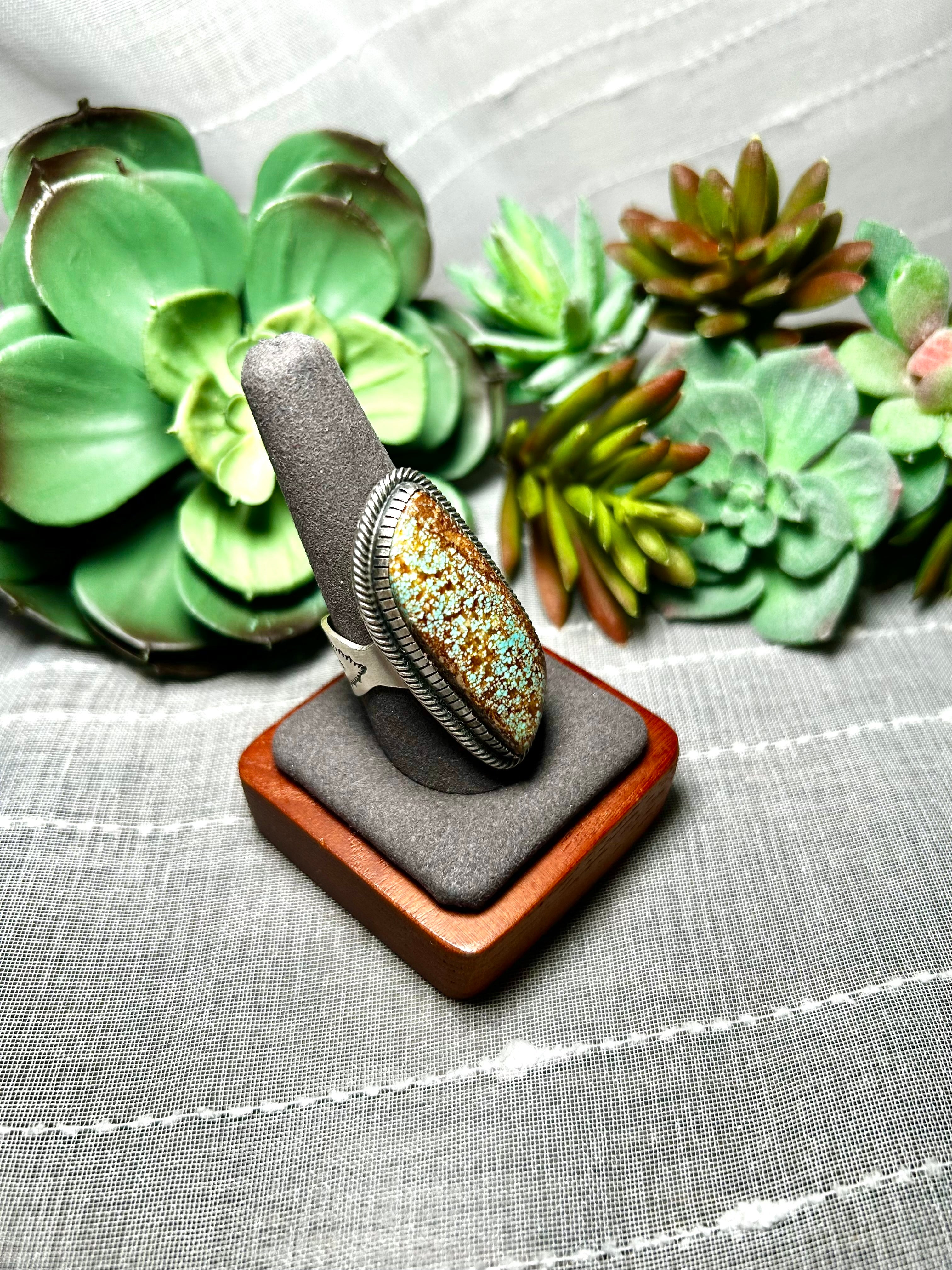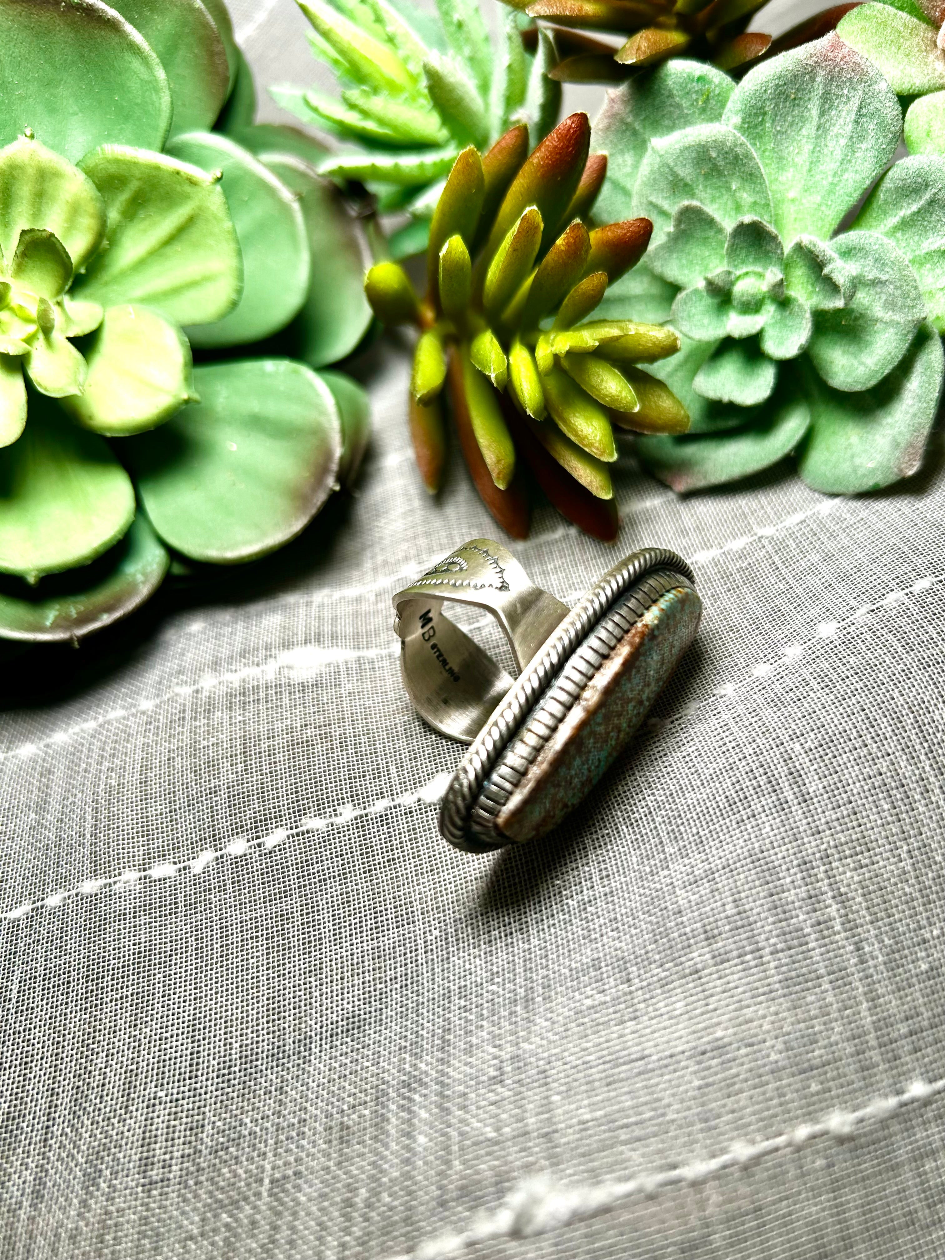 Matilda Benally #8 Turquoise & Sterling Silver Ring Size 7.75. It measures 1 3/4 inches long and 3/4 of an inch wide. Signed by the artist and stamped sterling silver.