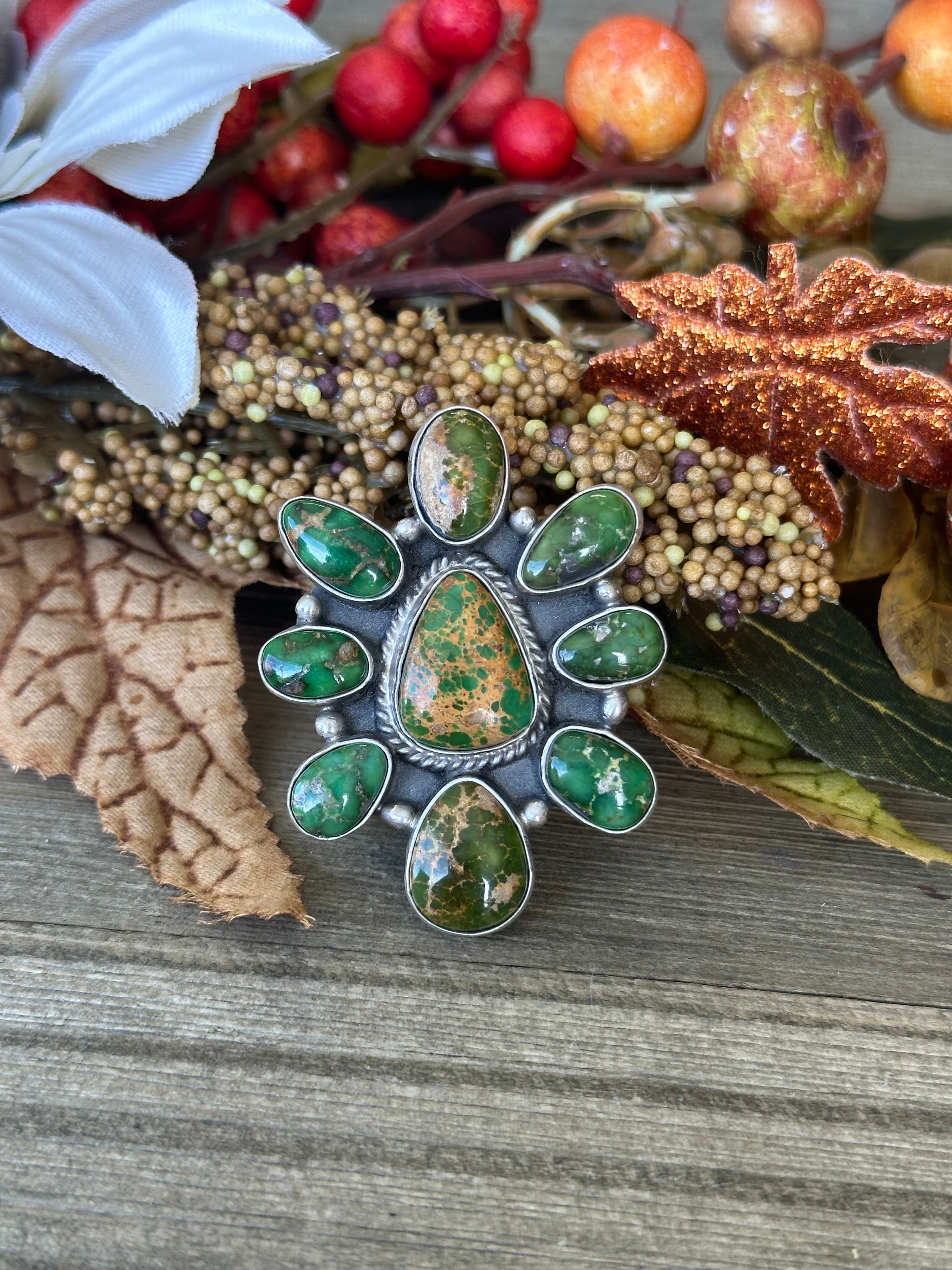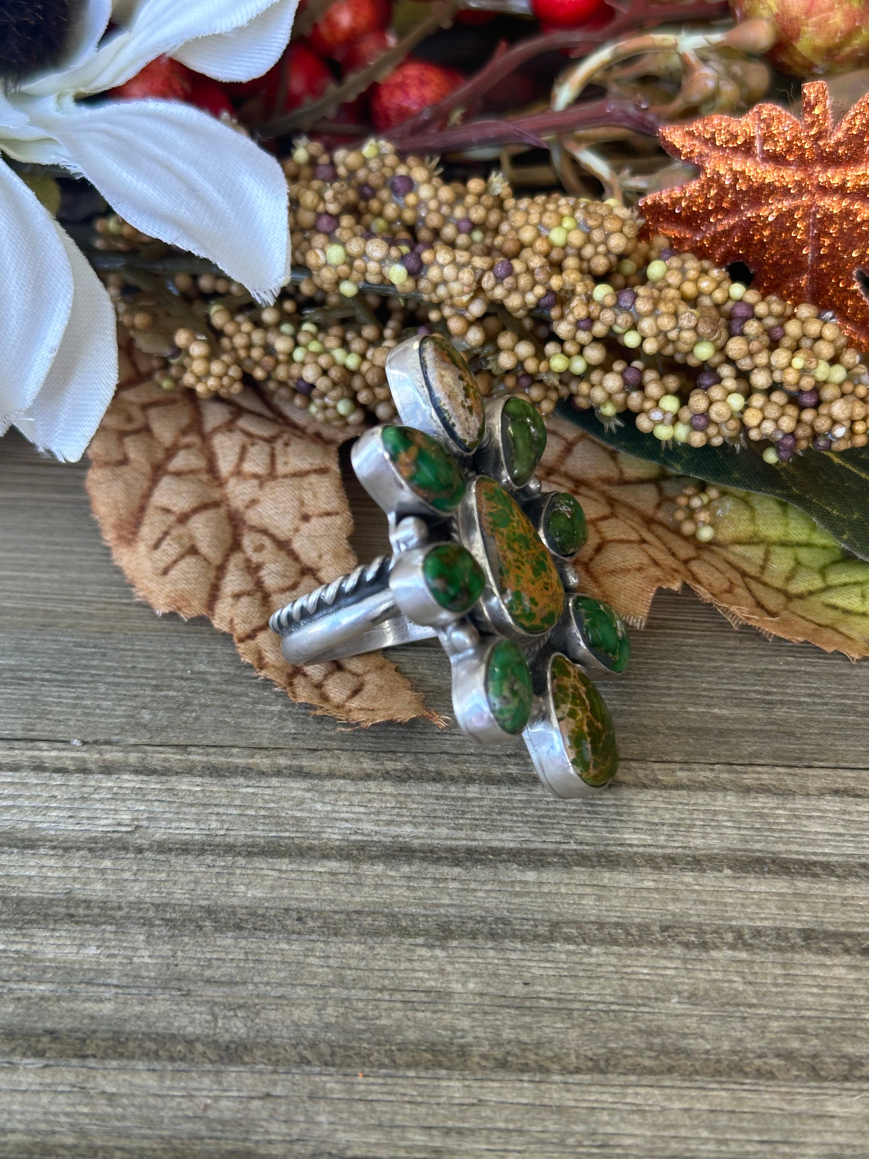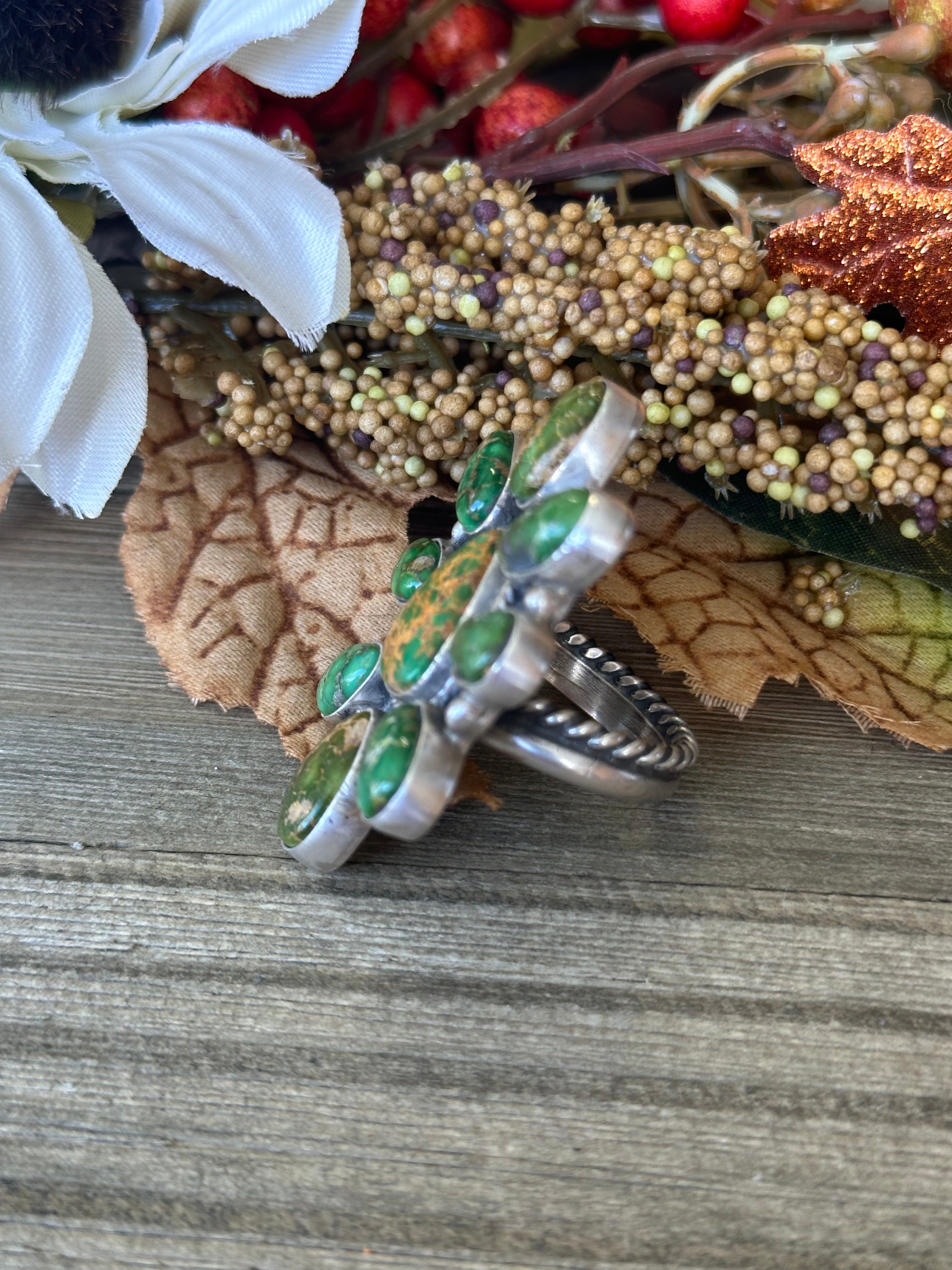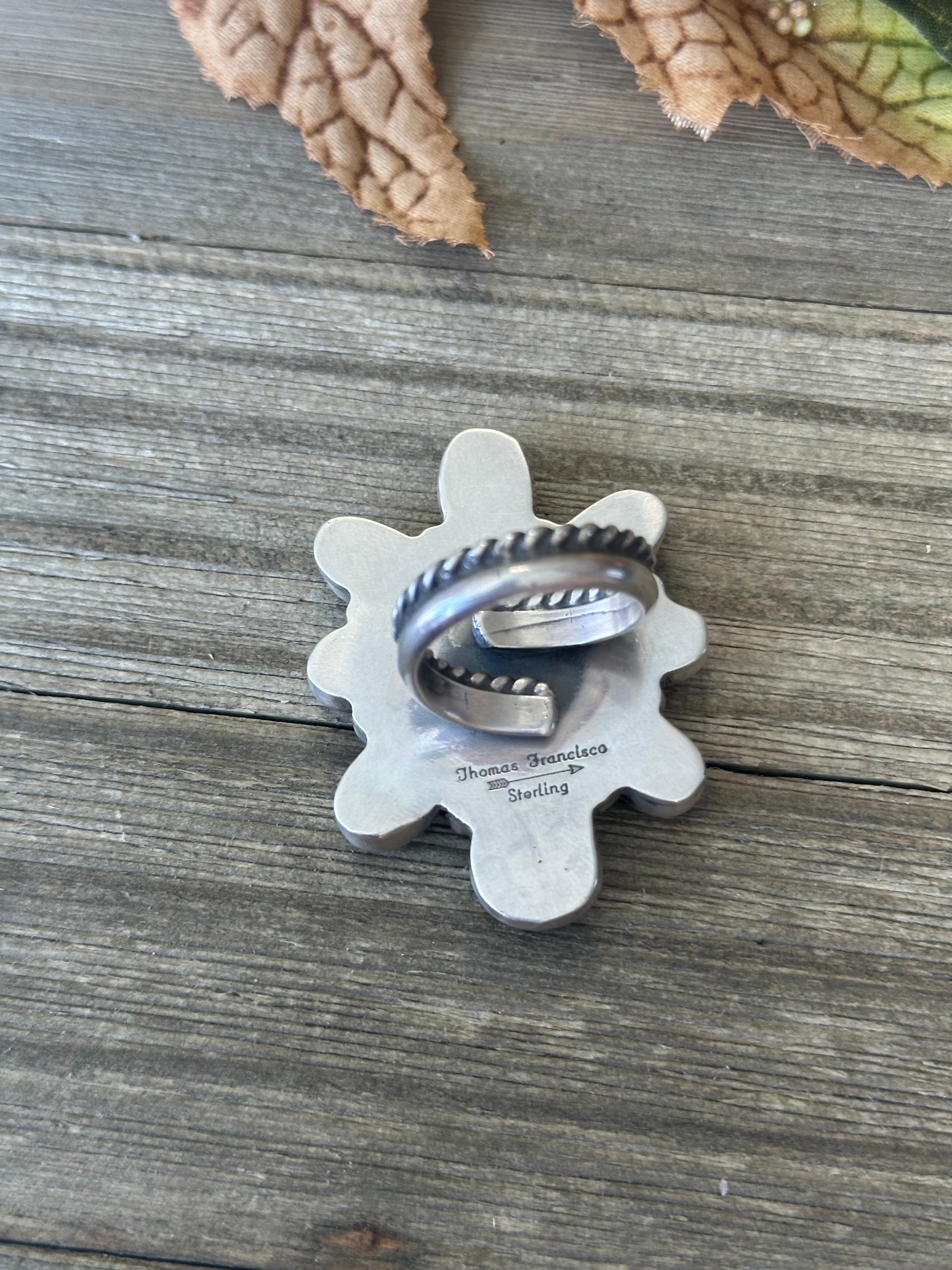Beautiful ring, Thomas Francisco Sonoran Gold Turquoise & Sterling Silver Cluster Adjustable Ring Sitting on Size 8.5. It measures 2 inches long and 1 1/2 inches wide. Signed by the artist and stamped sterling silver.
