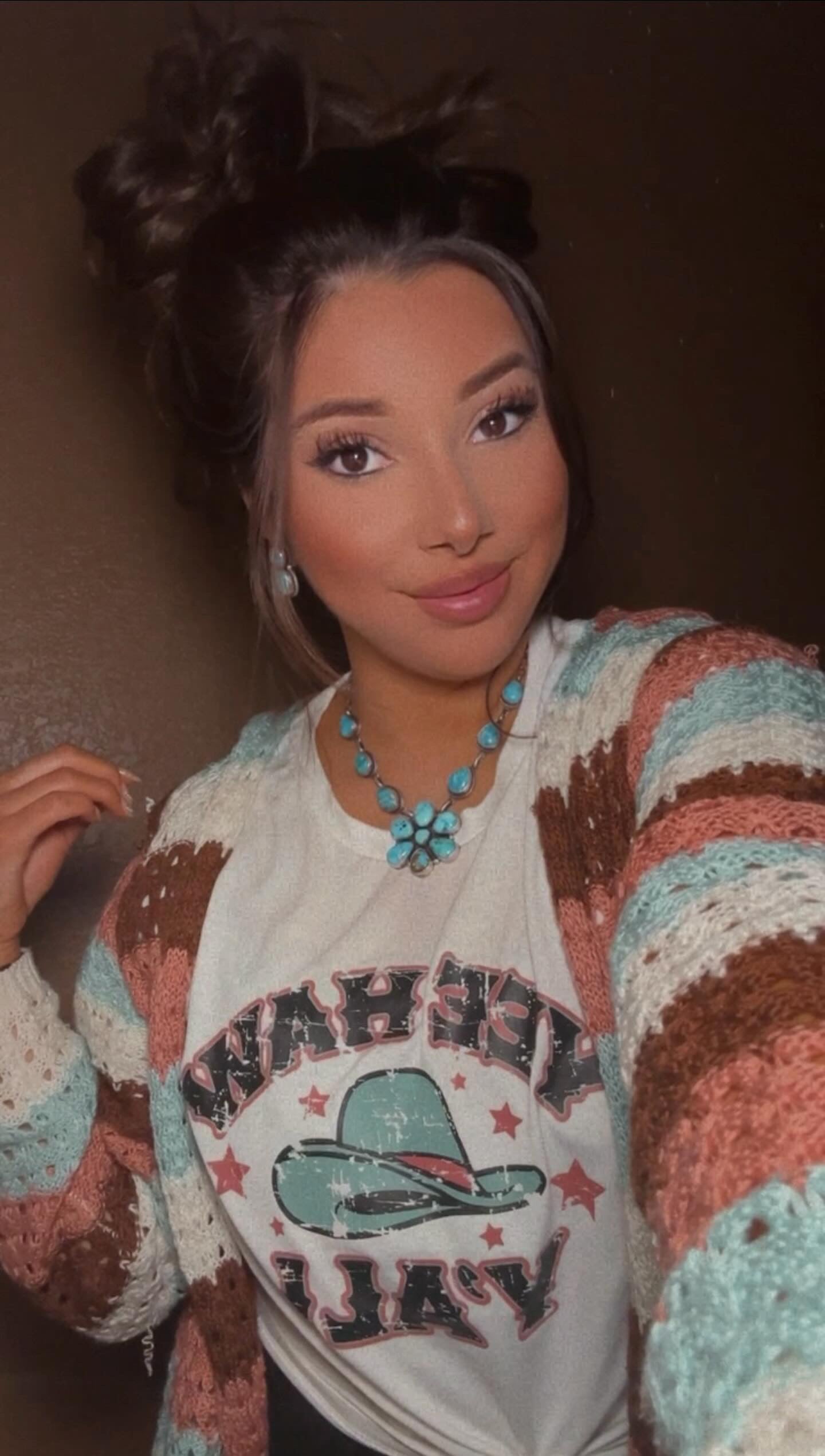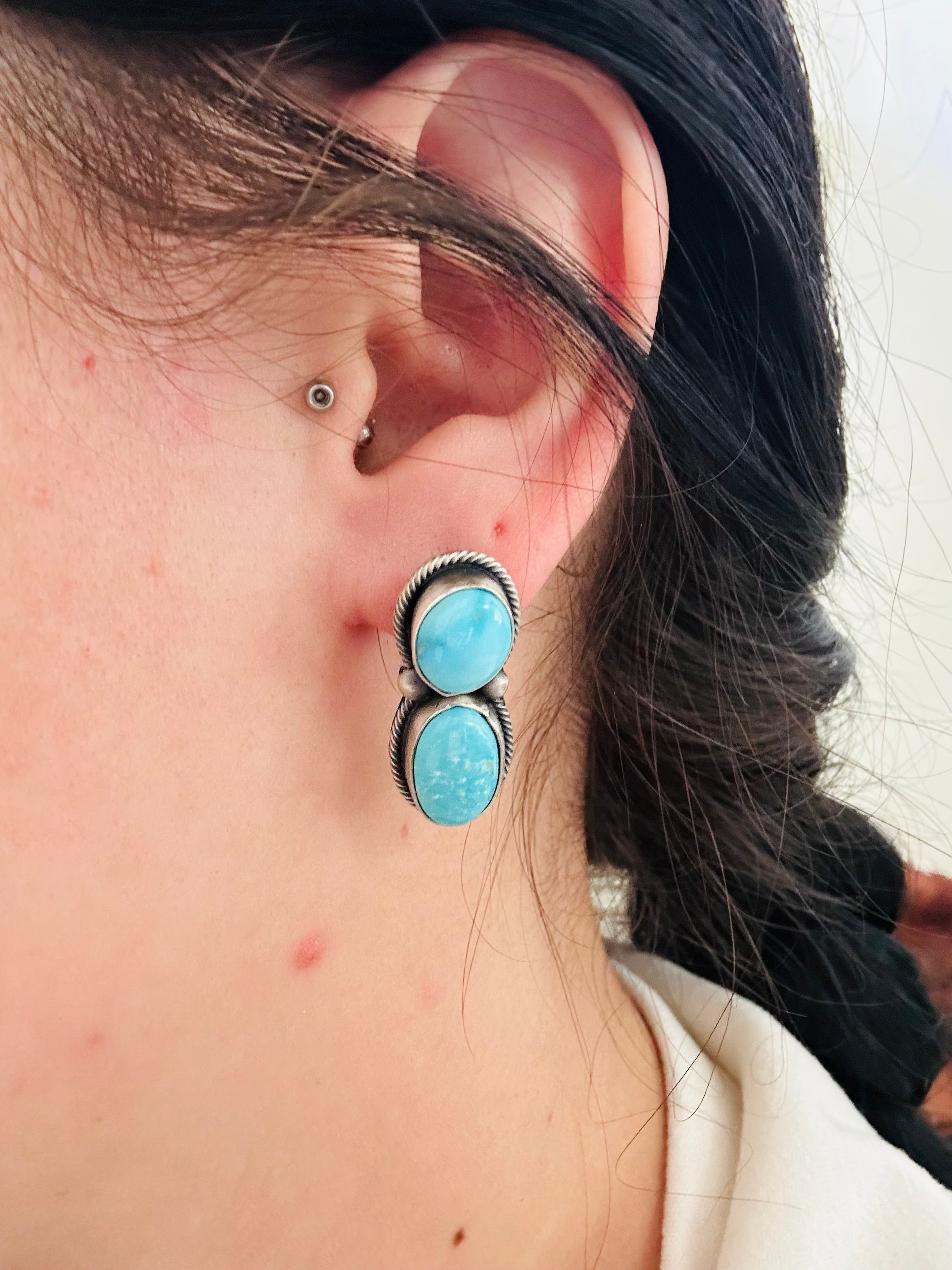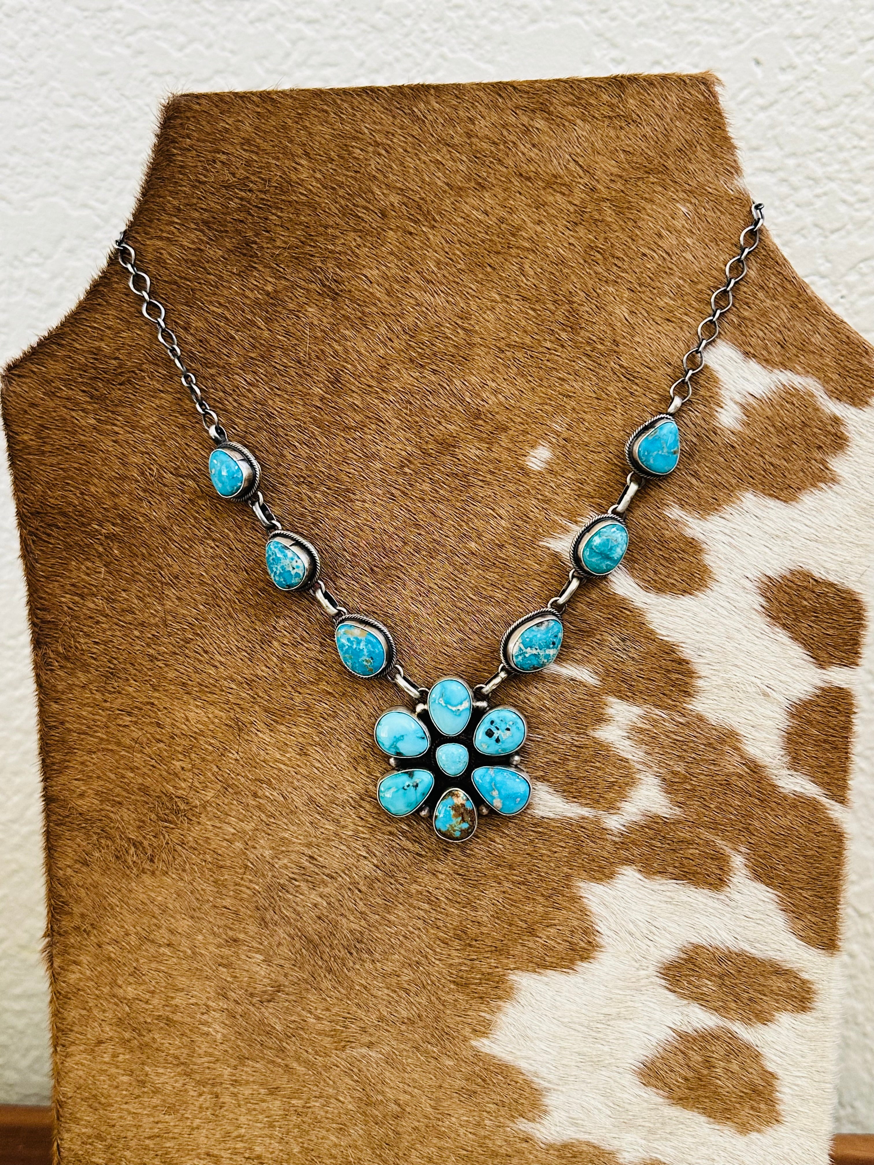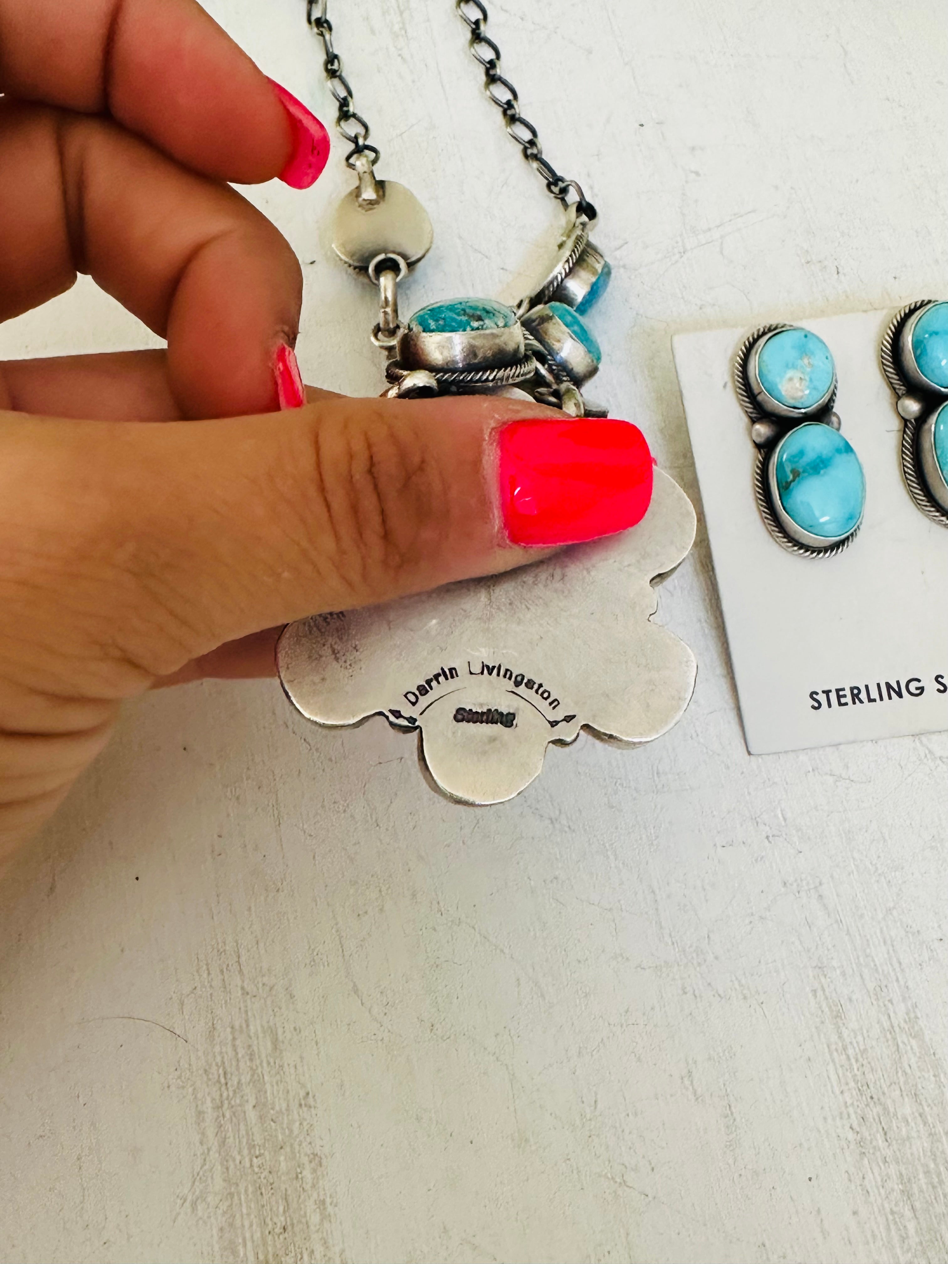 Beautiful Necklace and Earring set.Darrin Livingston Valley Blue Turquoise & Sterling Silver Cluster Necklace Set. It measures 23 inches long with hang while the chain measures 20 inches long. Signed by the artist and stamped sterling silver.