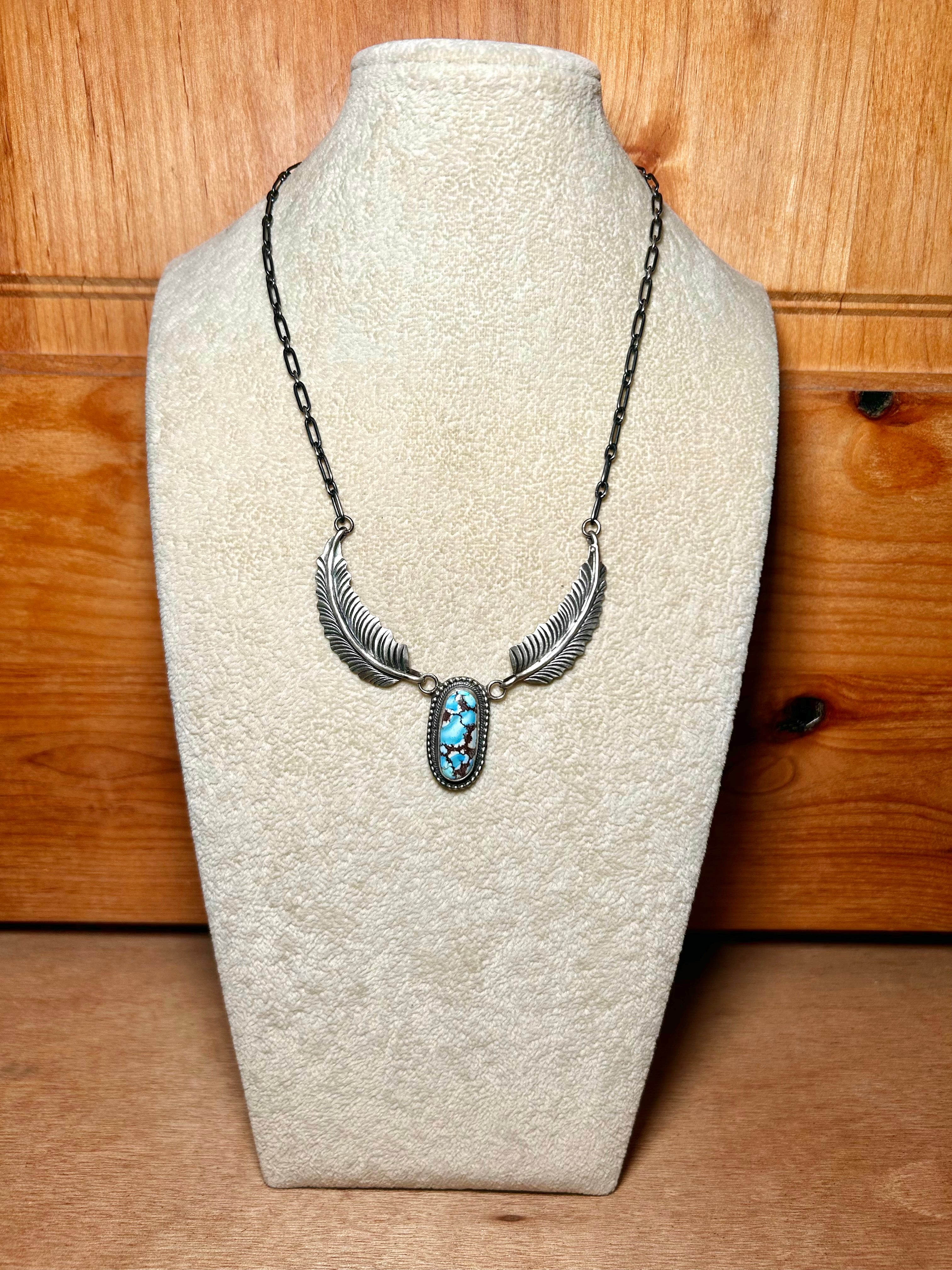 Lydia Beggy Golden Hill Turquoise & Sterling Silver Necklace. It measures 21 inches long with hang while the chain measures 15 inches long. Signed by the artist and stamped sterling silver.
