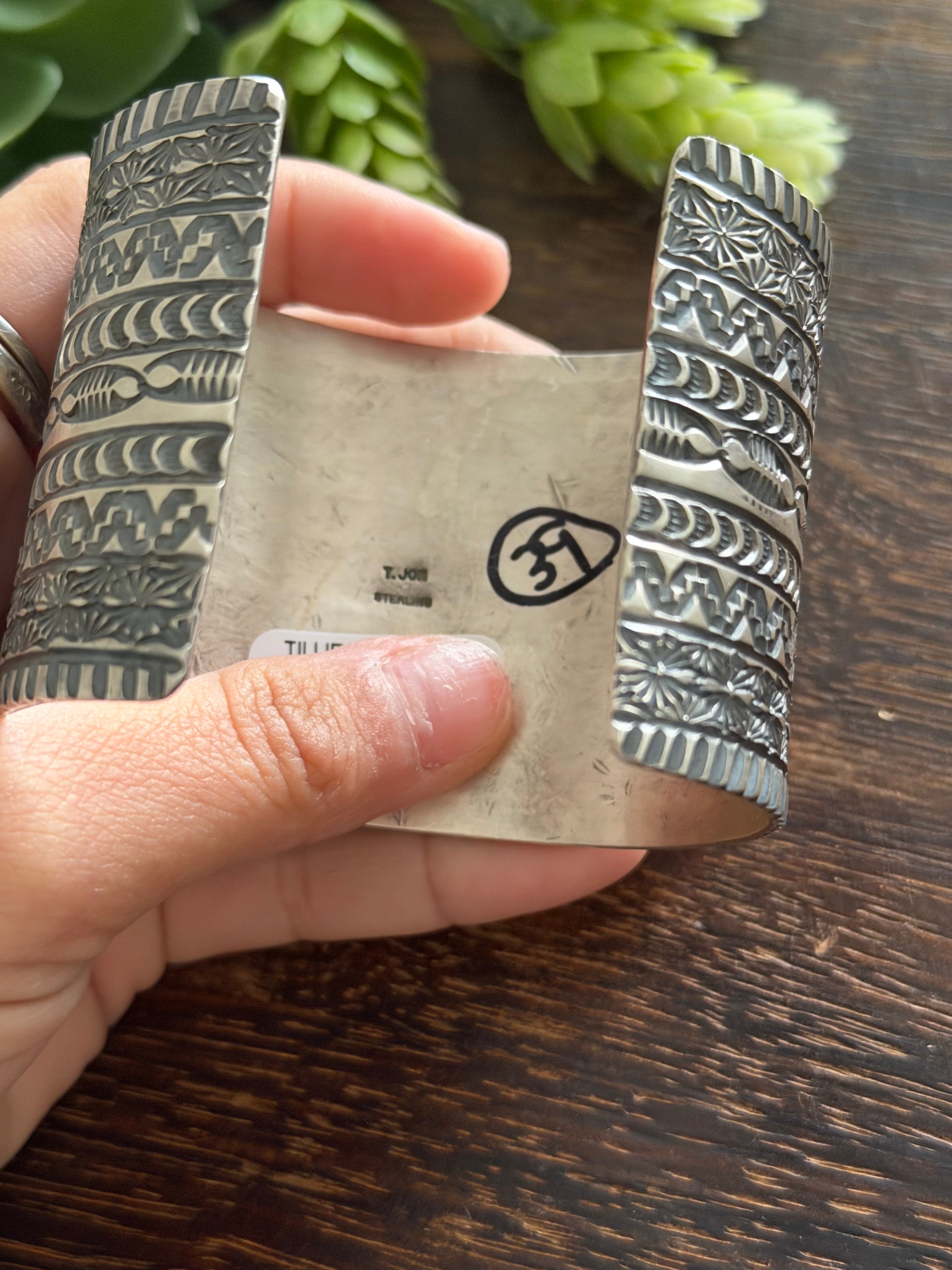 Tillie John Golden Hills Turquoise & Sterling Silver Liberty Dime Cluster Cuff Bracelet. It measures 2 inches wide with an inside circumference of 5 7/8 inches and a gap of 1 1/4 inches. Signed by the artist and stamped sterling silver.