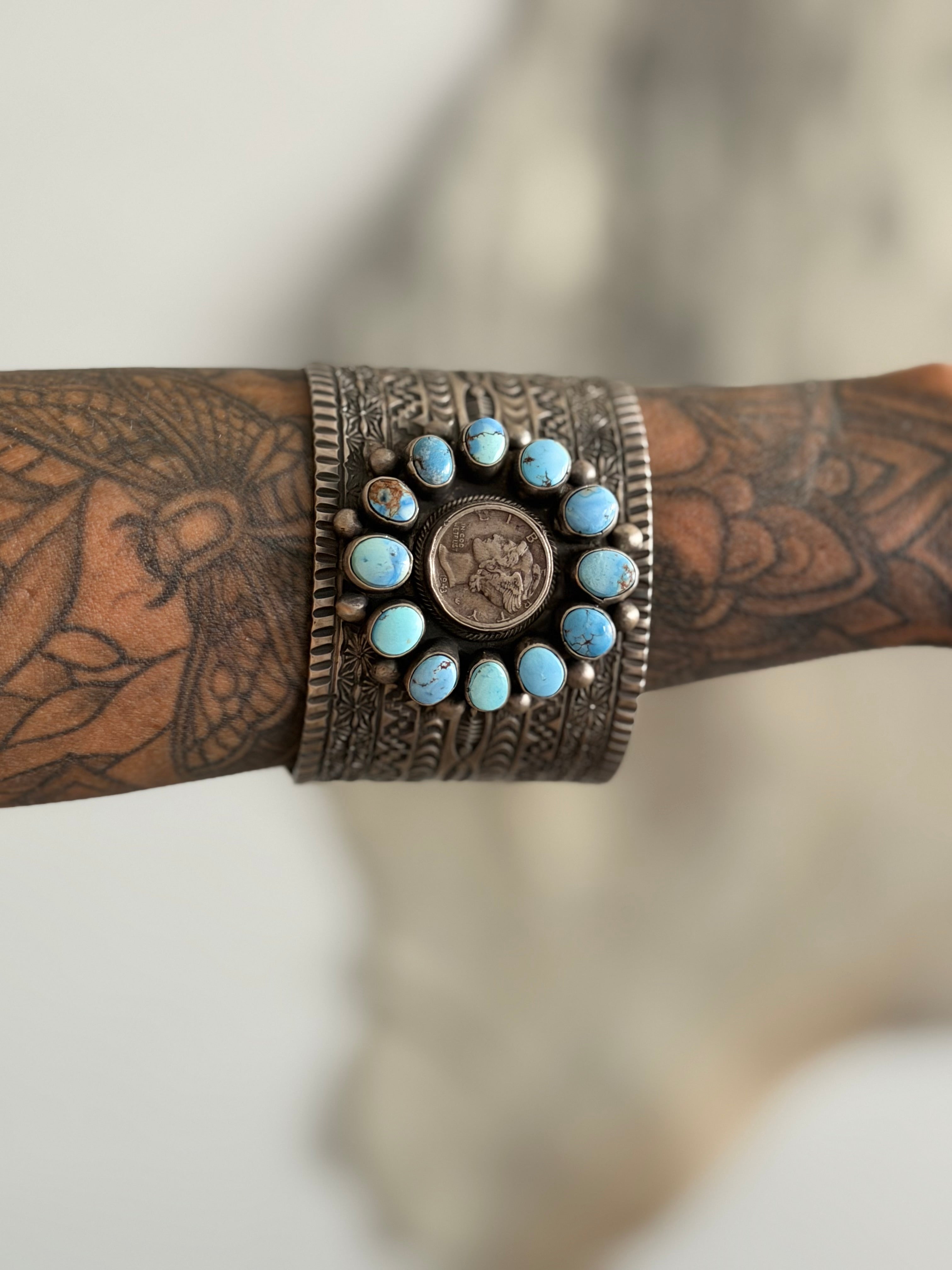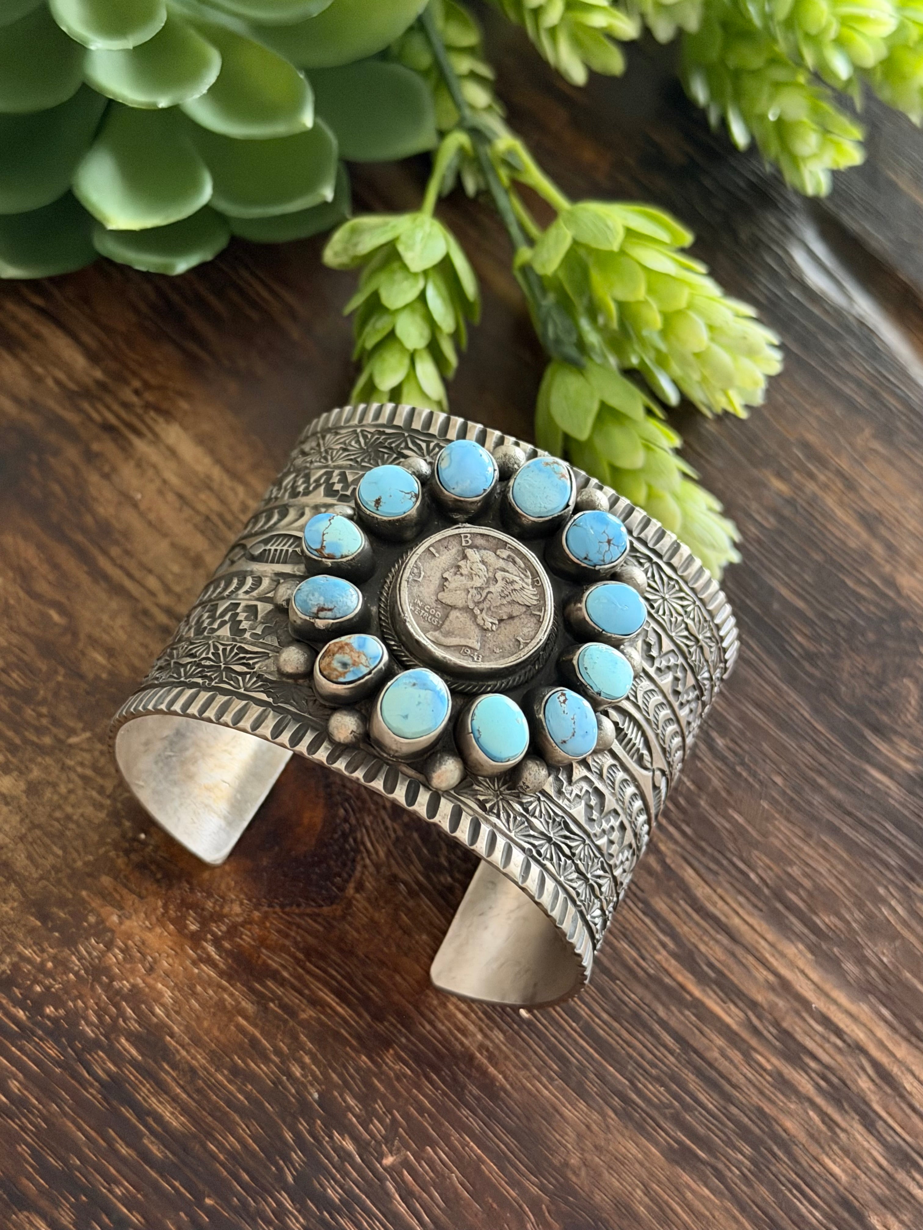 Tillie John Golden Hills Turquoise & Sterling Silver Liberty Dime Cluster Cuff Bracelet