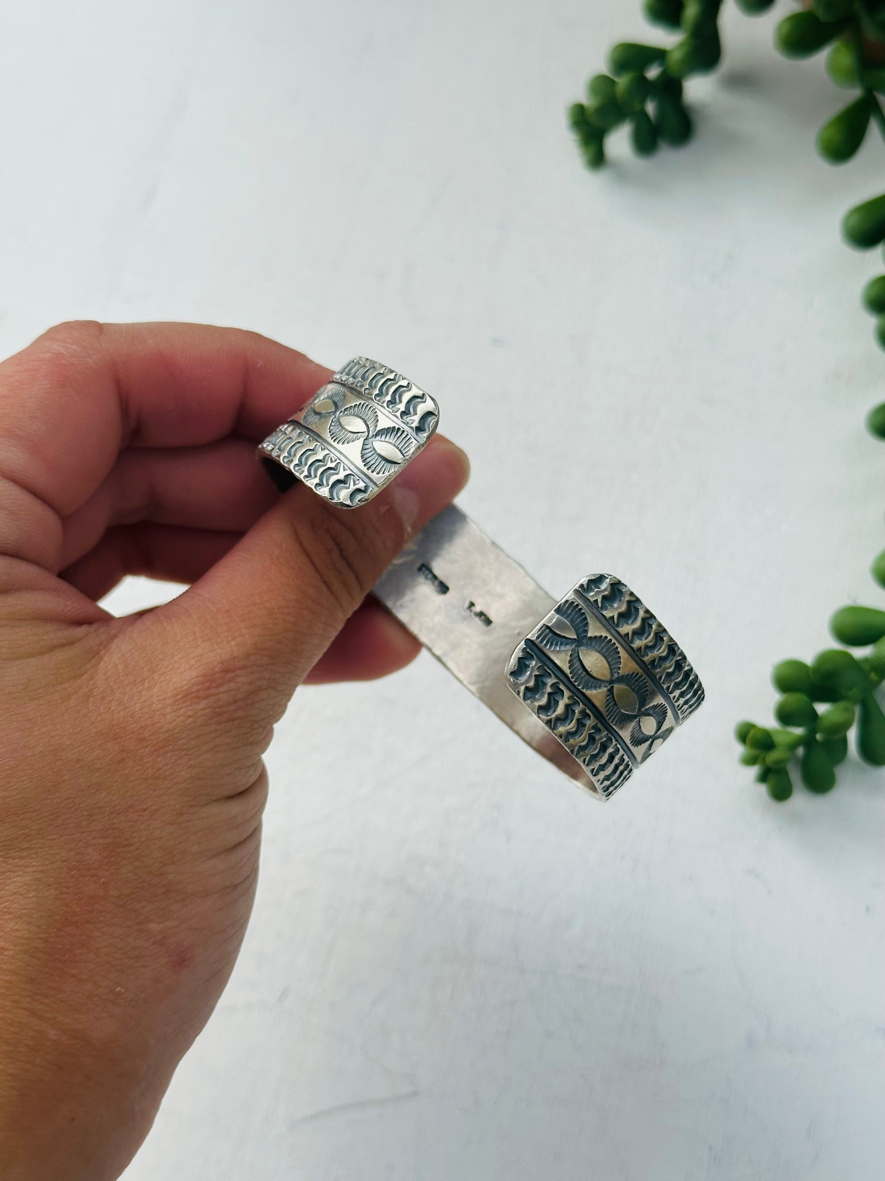Beautiful Tillie John Palomino Variscite and Sterling Silver Cuff Bracelet. Amazing stones in this piece! It measures 3/4 of an inch wide with an inside circumference of 5 7/8 inches and a gap of 1 inch. Signed by the artist and stamped sterling silver.