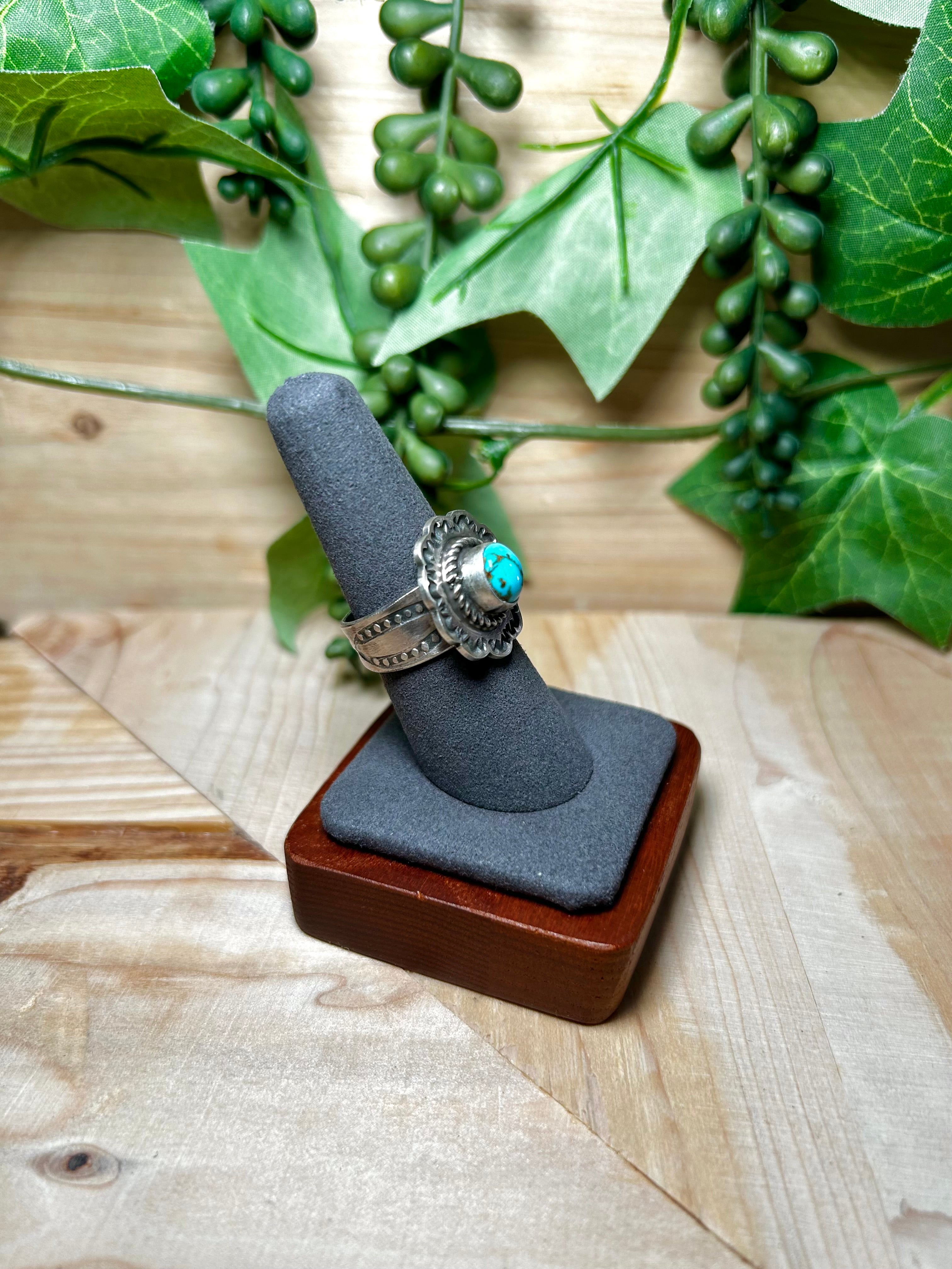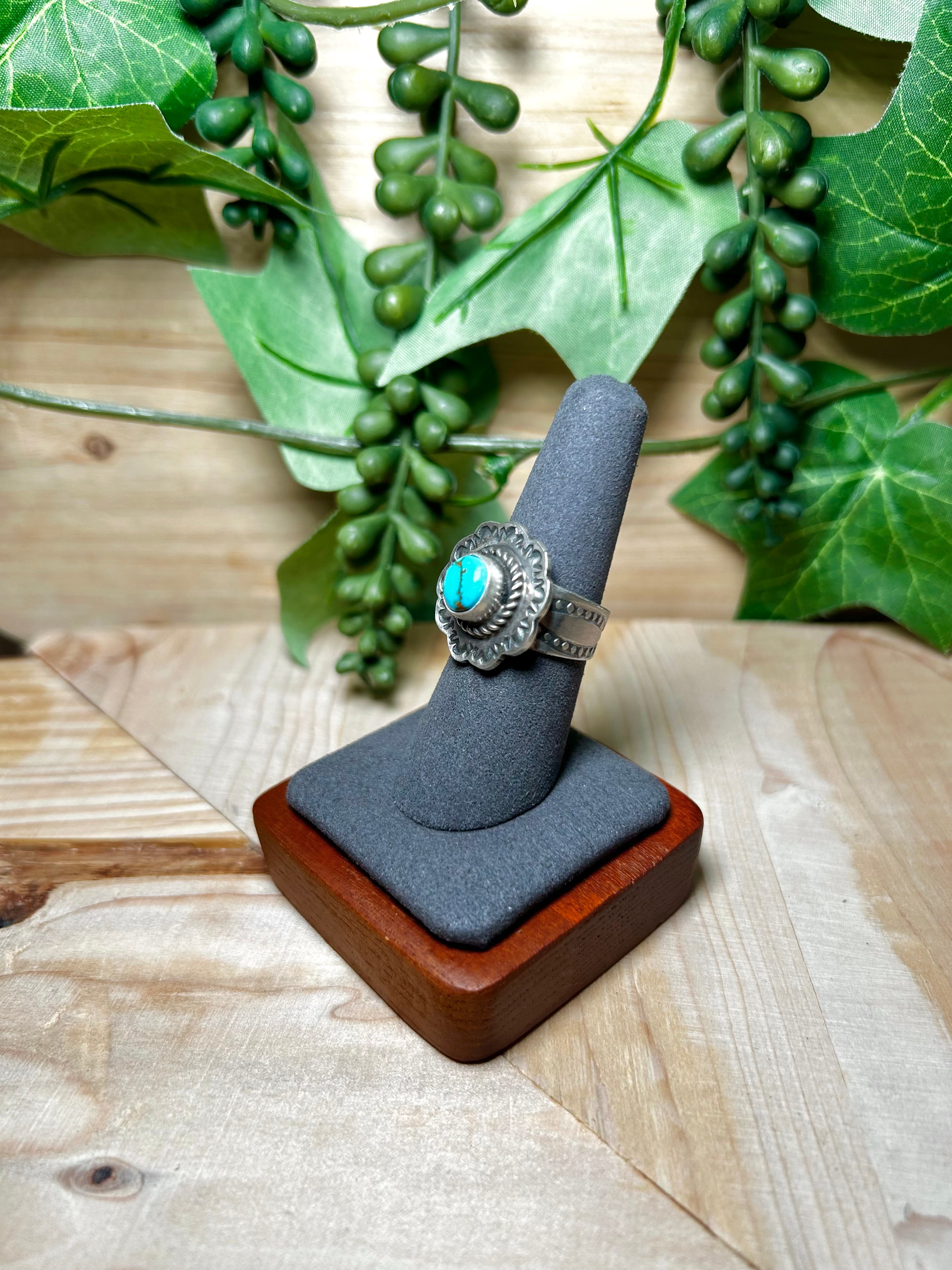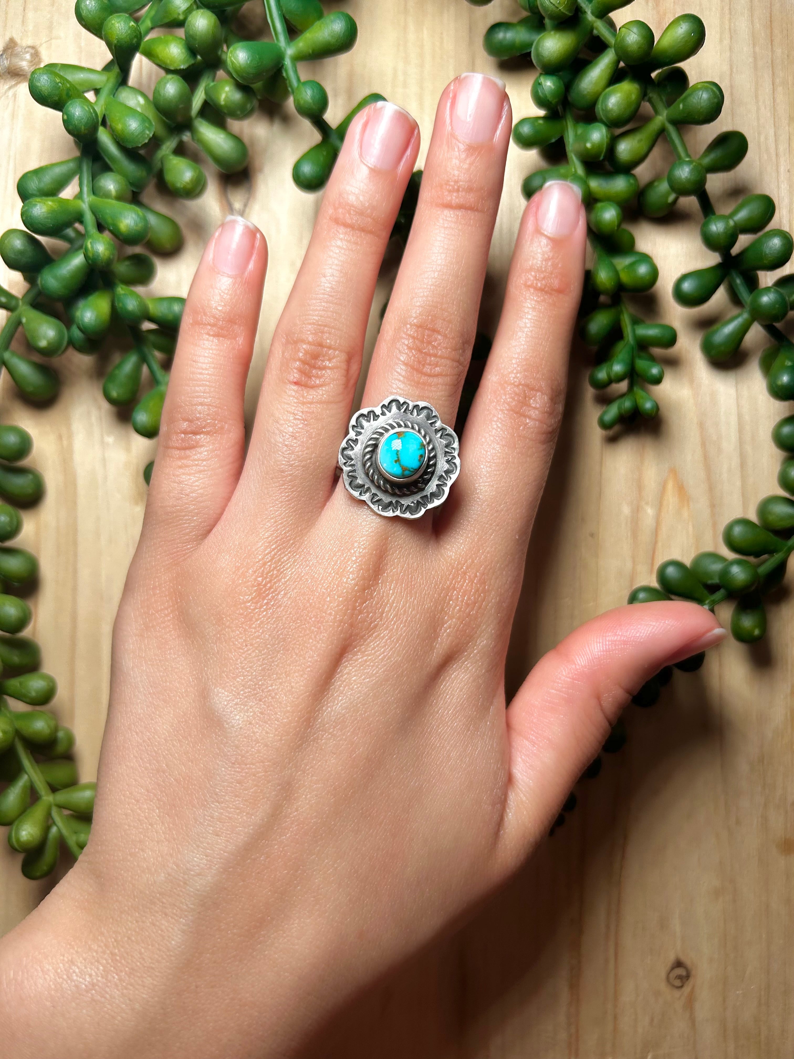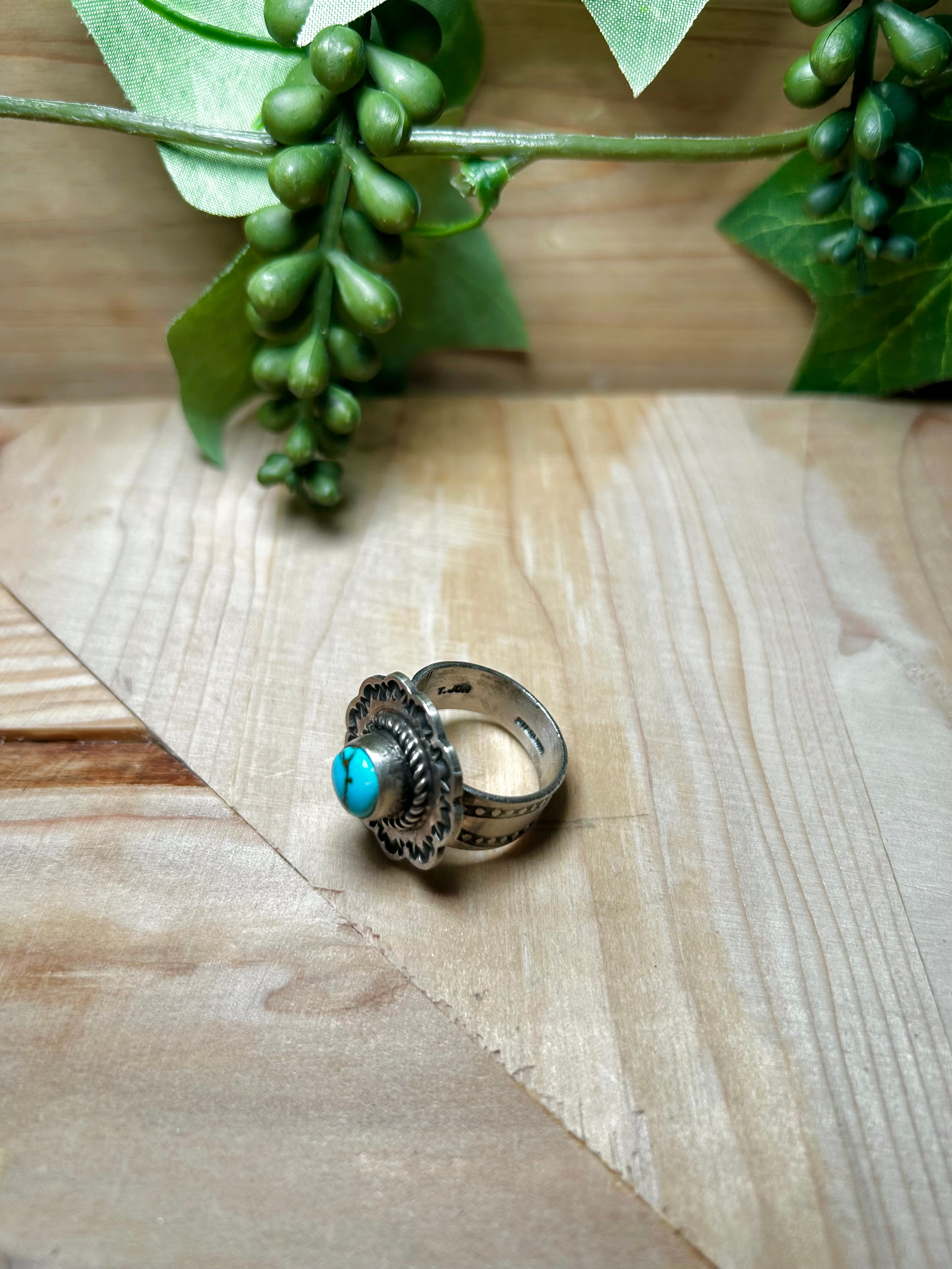 Tillie John Sonoran Gold & Sterling Silver Ring Size 7.5. It measures 7/8 of an inch long and 7/8 of an inch wide. Signed by the artist and stamped sterling silver.
