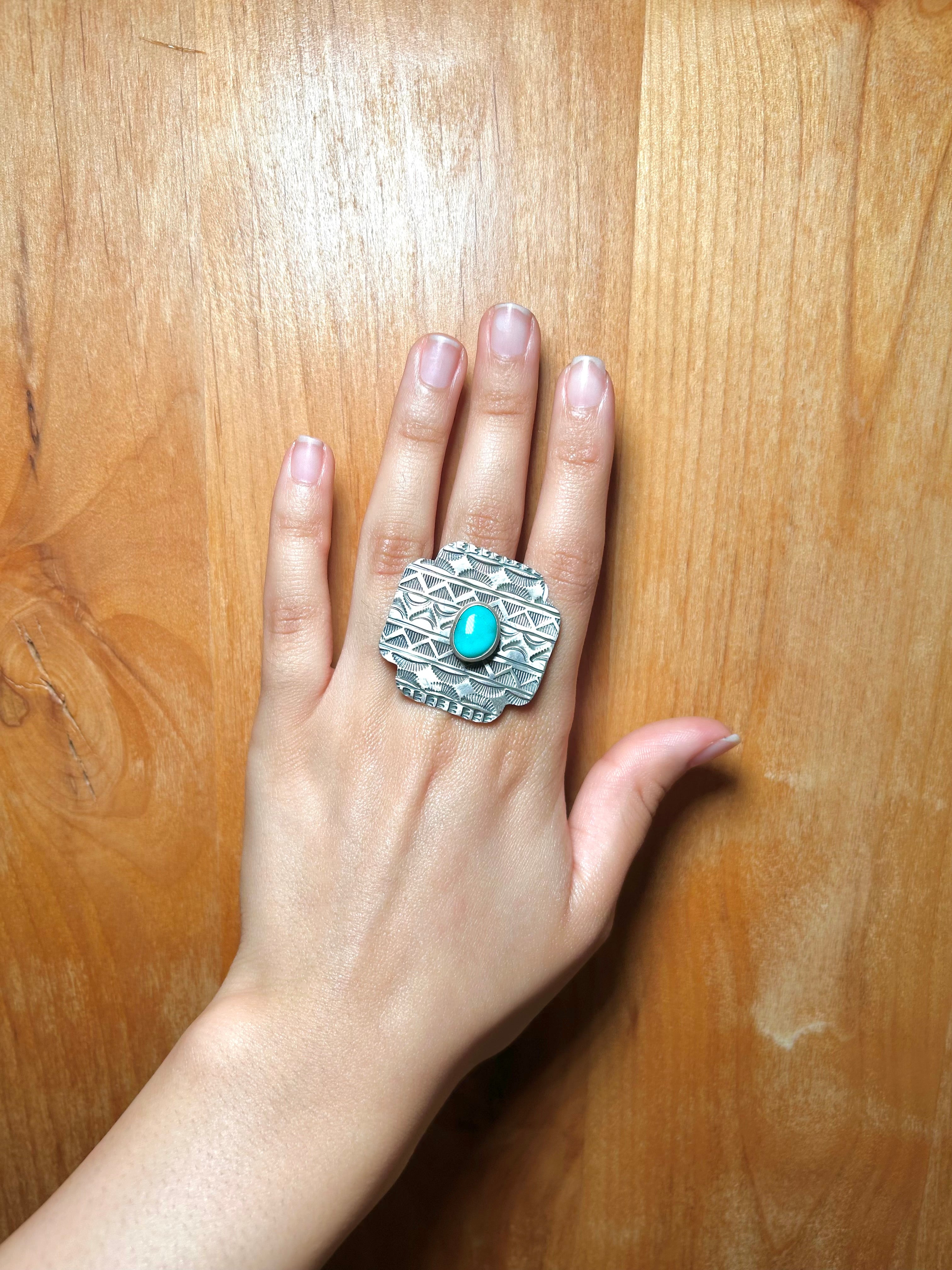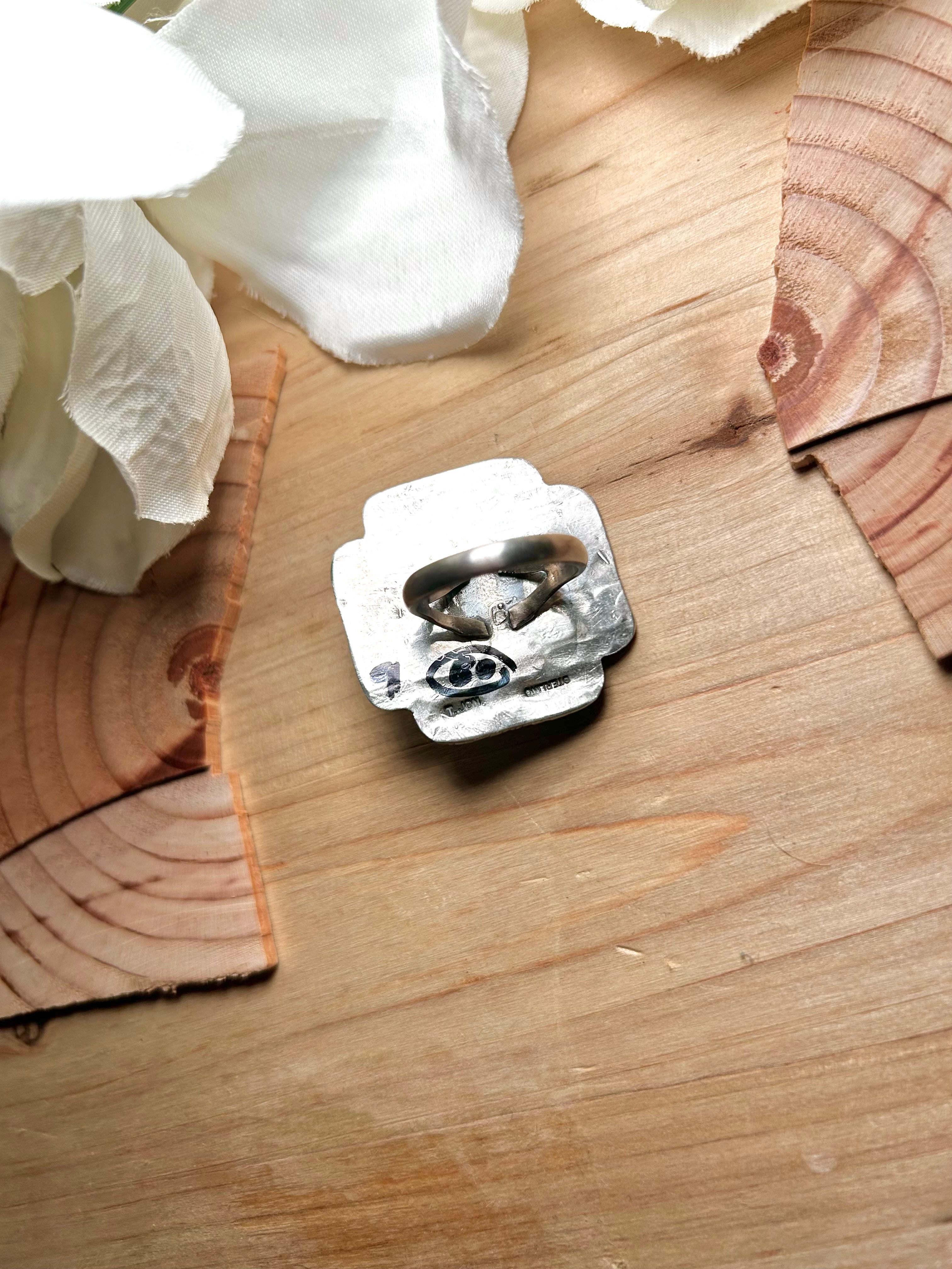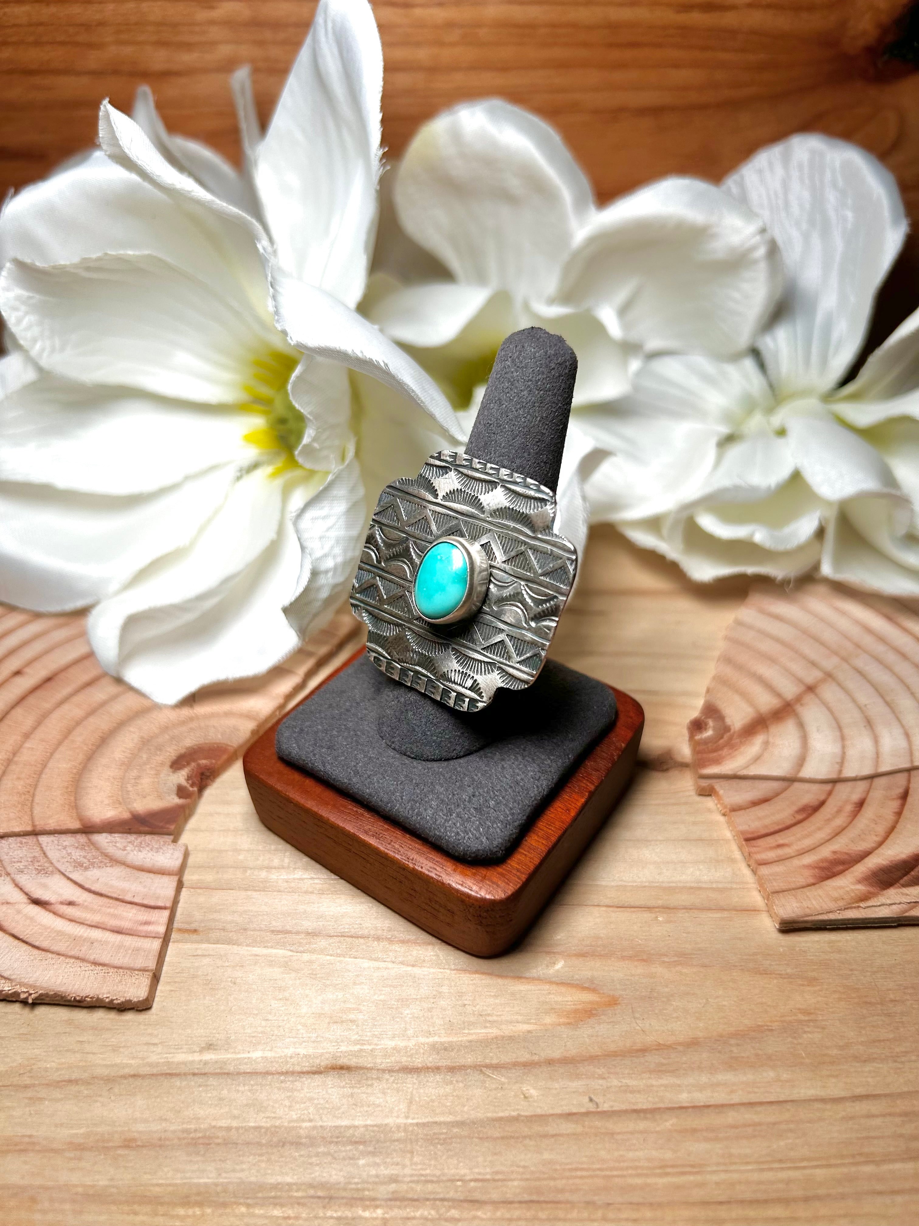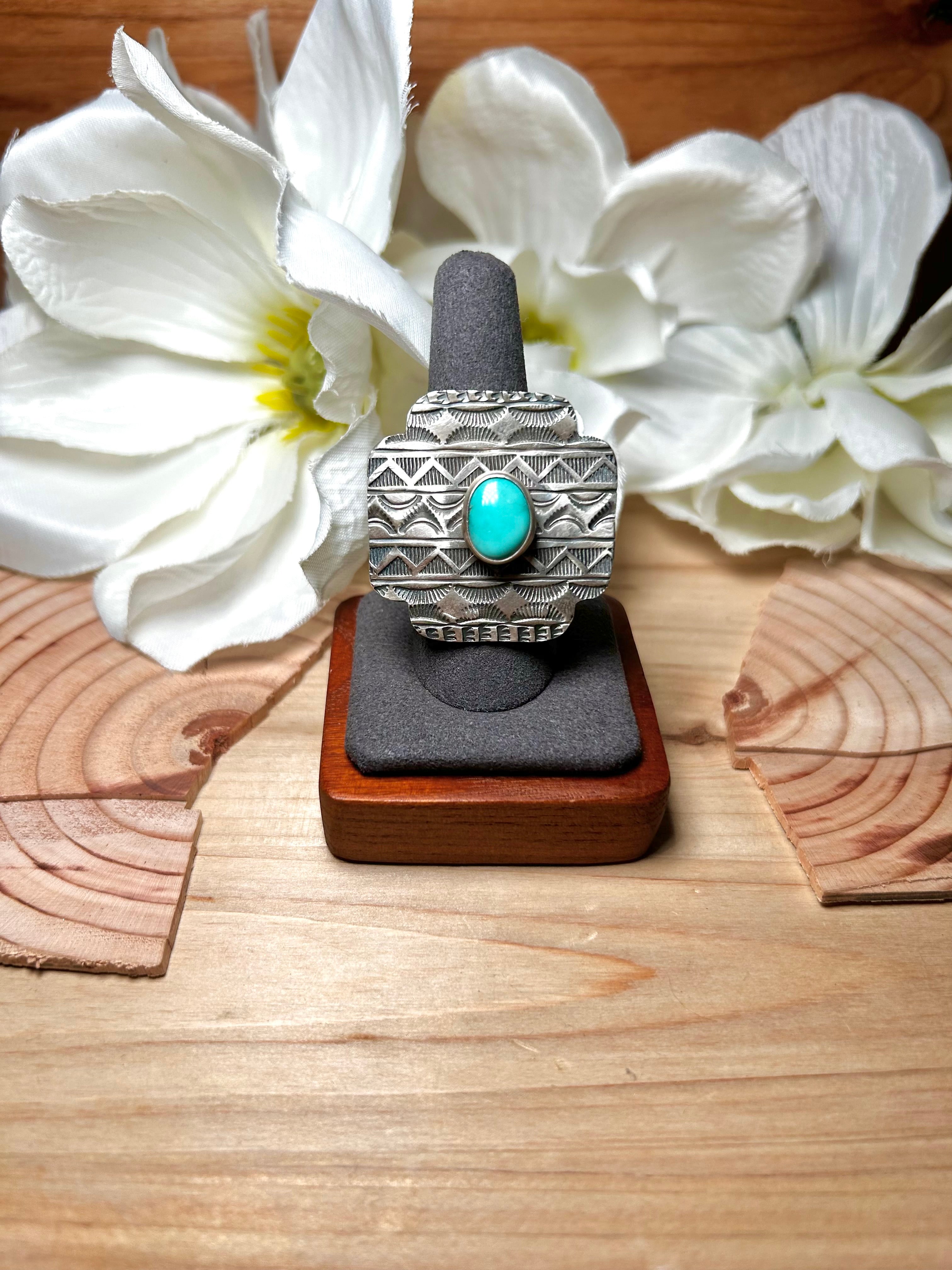 Tillie Jon Kingman Turquoise & Sterling Silver Ring Size 9. It measures 1 3/8 inches long and 1 3/8 inches wide. Signed by the artist and stamped sterling silver.