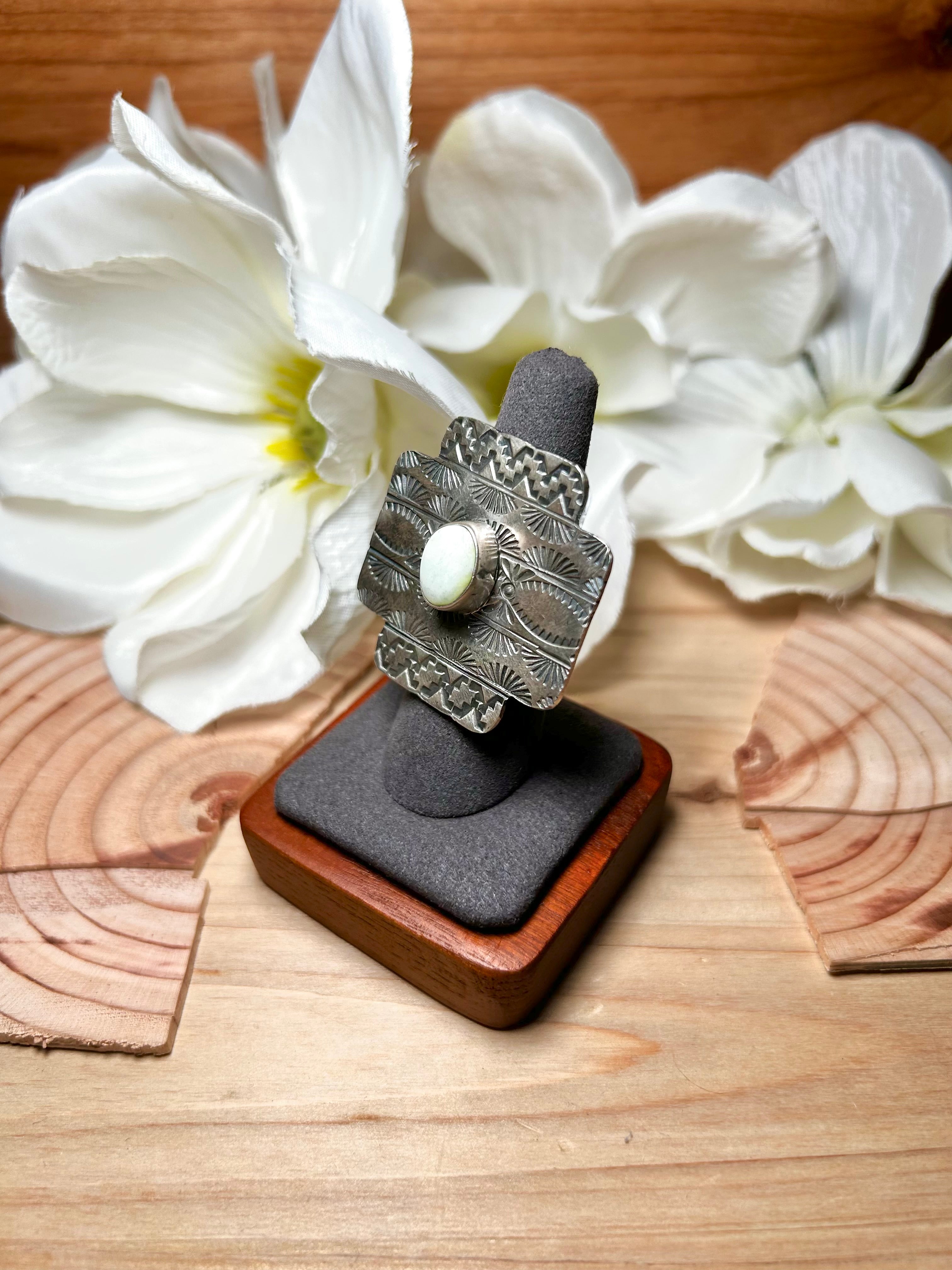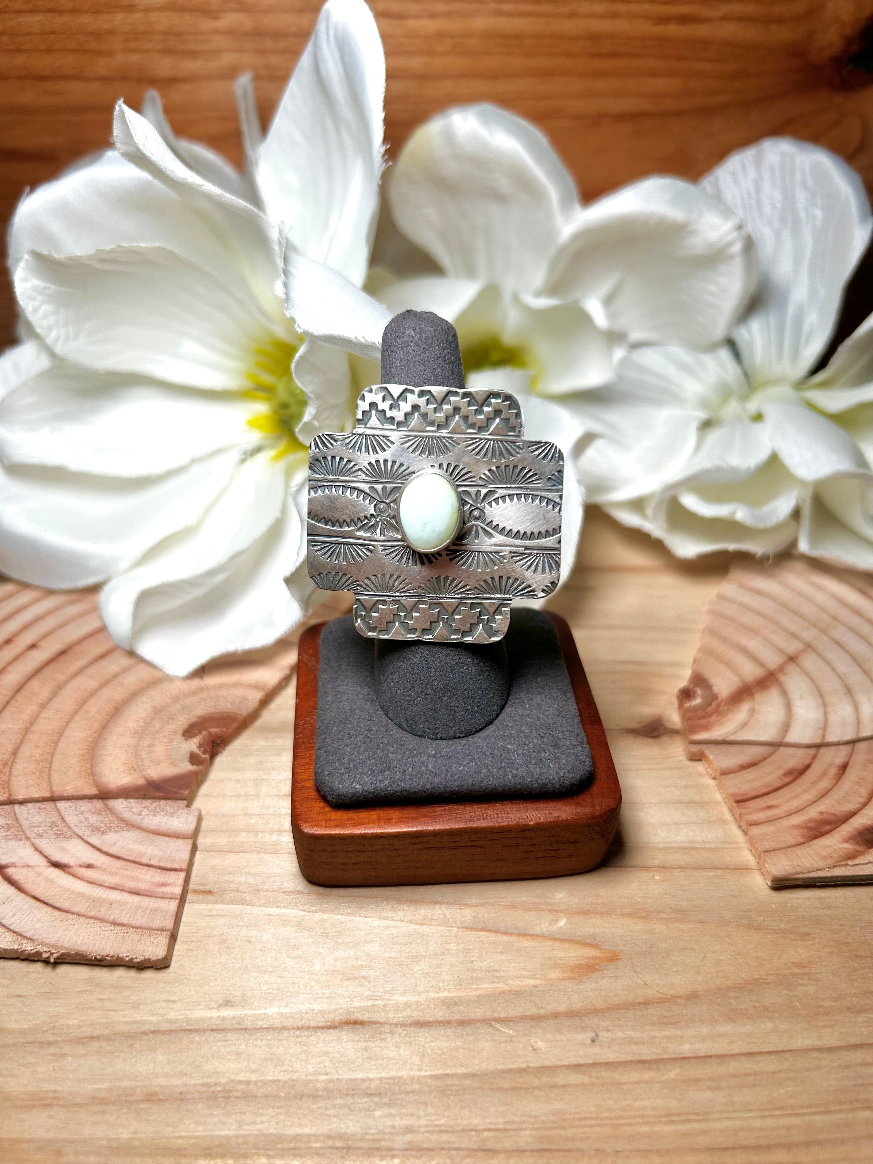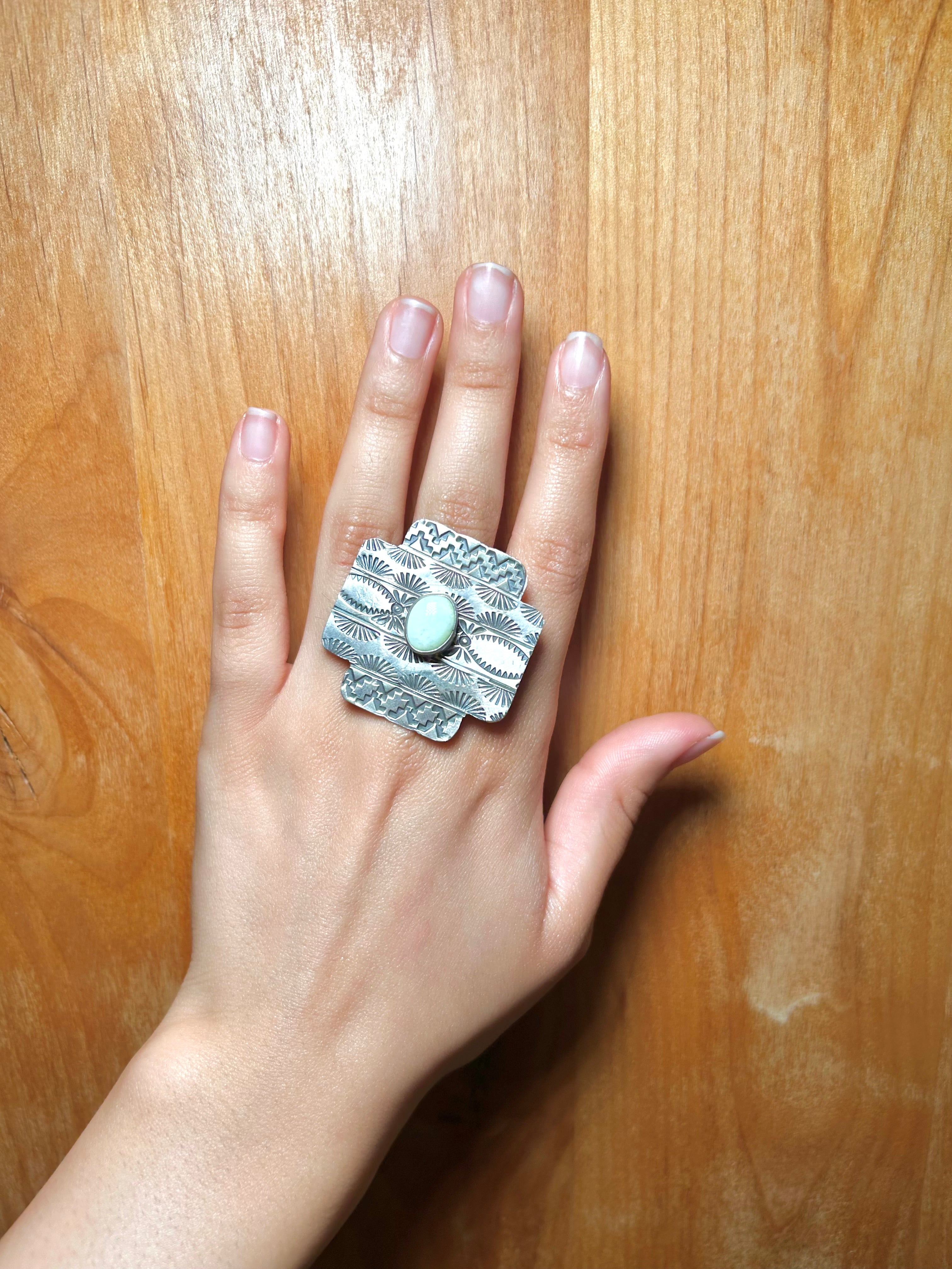 Tillie Jon Palomino Variscite & Sterling Silver Ring Size 7. It measures 1 1/2 inches long and 1 1/2 inches wide. Signed by the artist and stamped sterling silver.