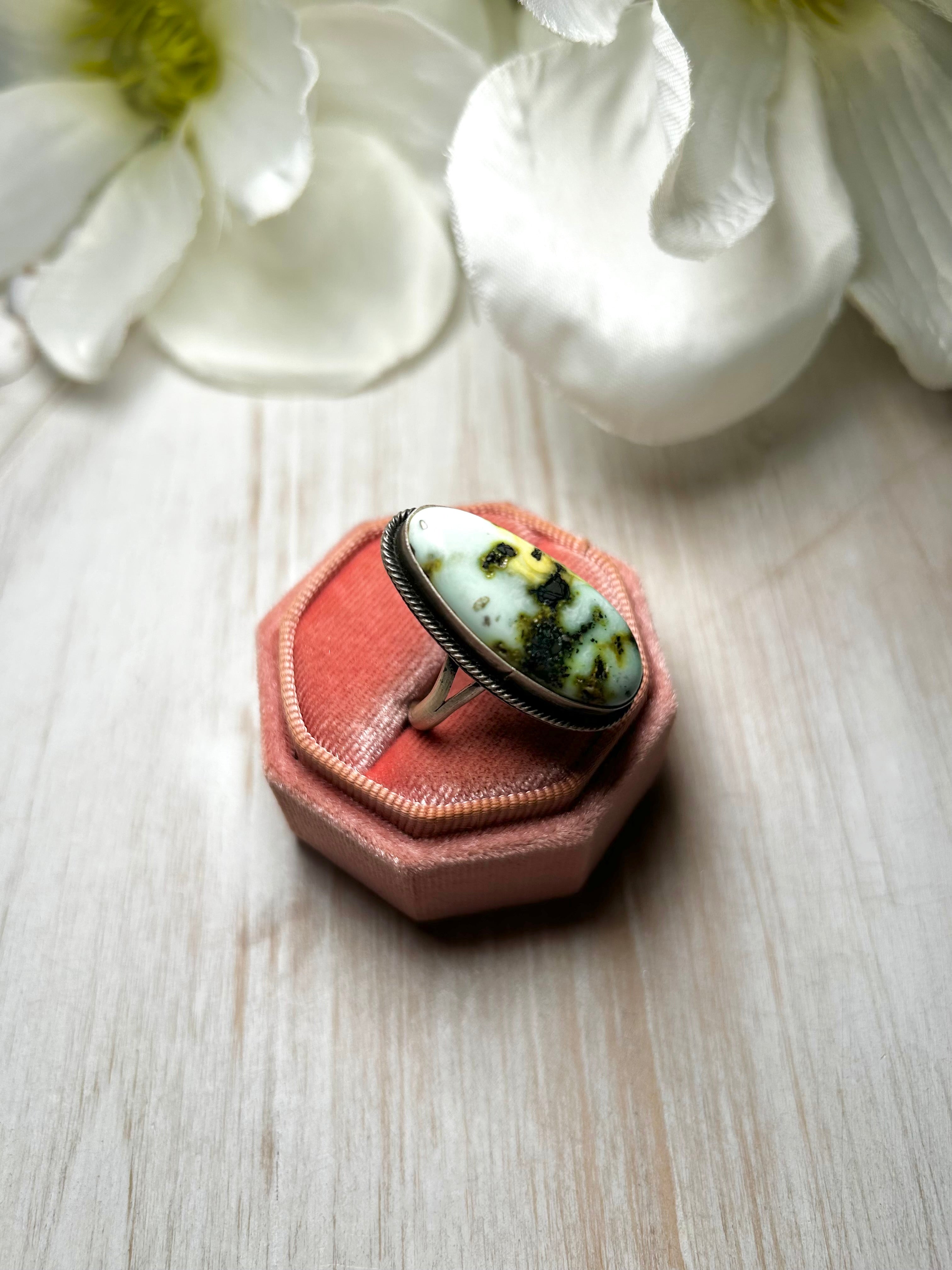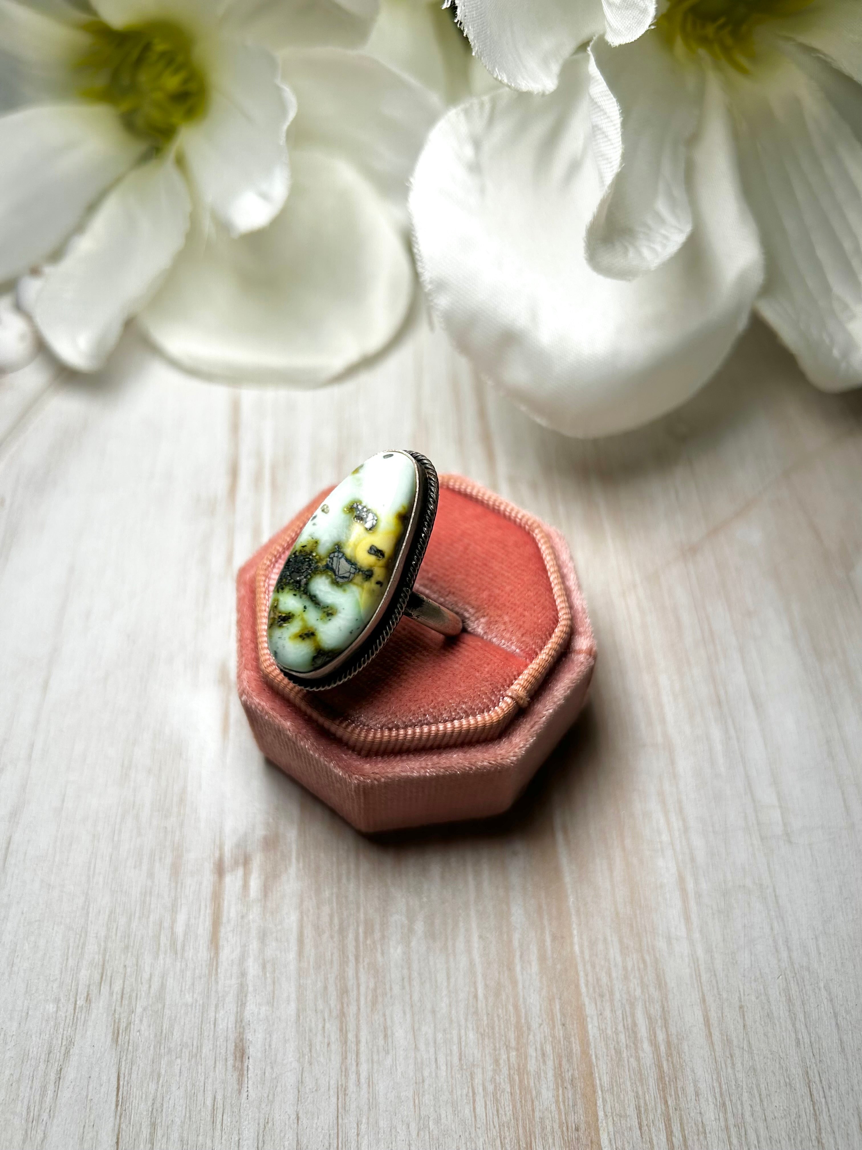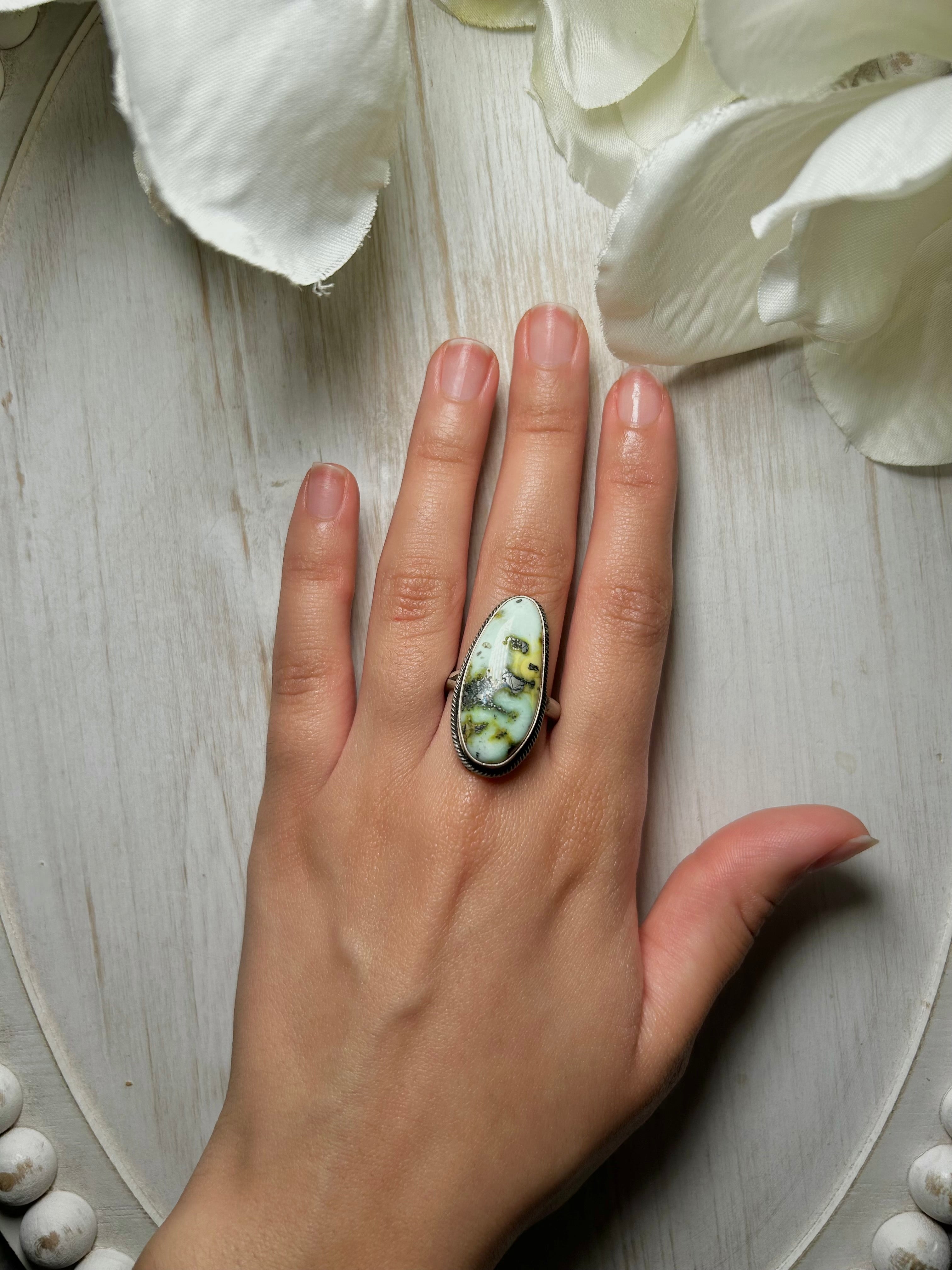 Eli Skeets Palomino Variscite & Sterling Silver Adjustable Ring. It measures 1 3/8 inches long and 5/8 of an inch wide. Signed by the artist and stamped sterling silver.