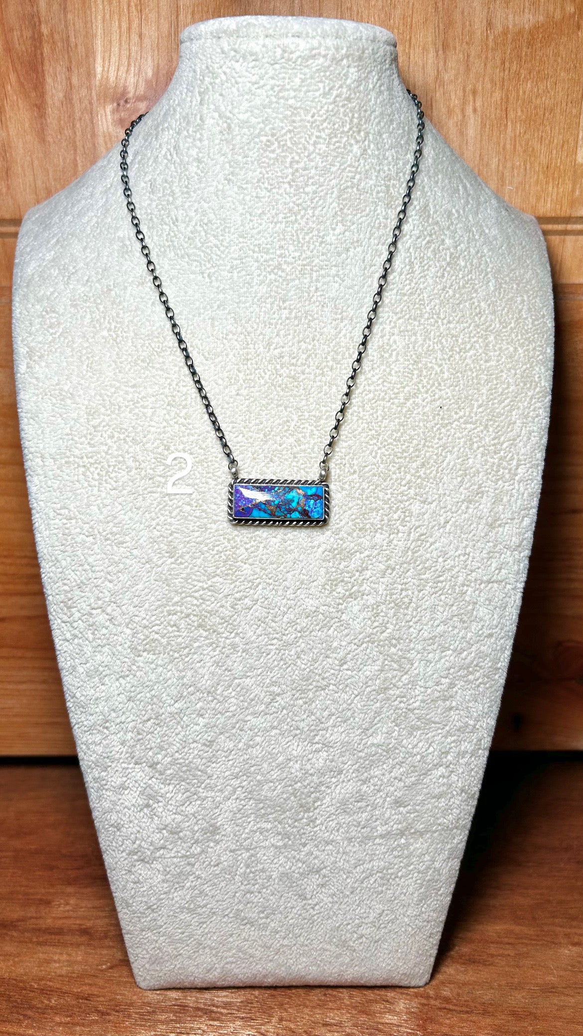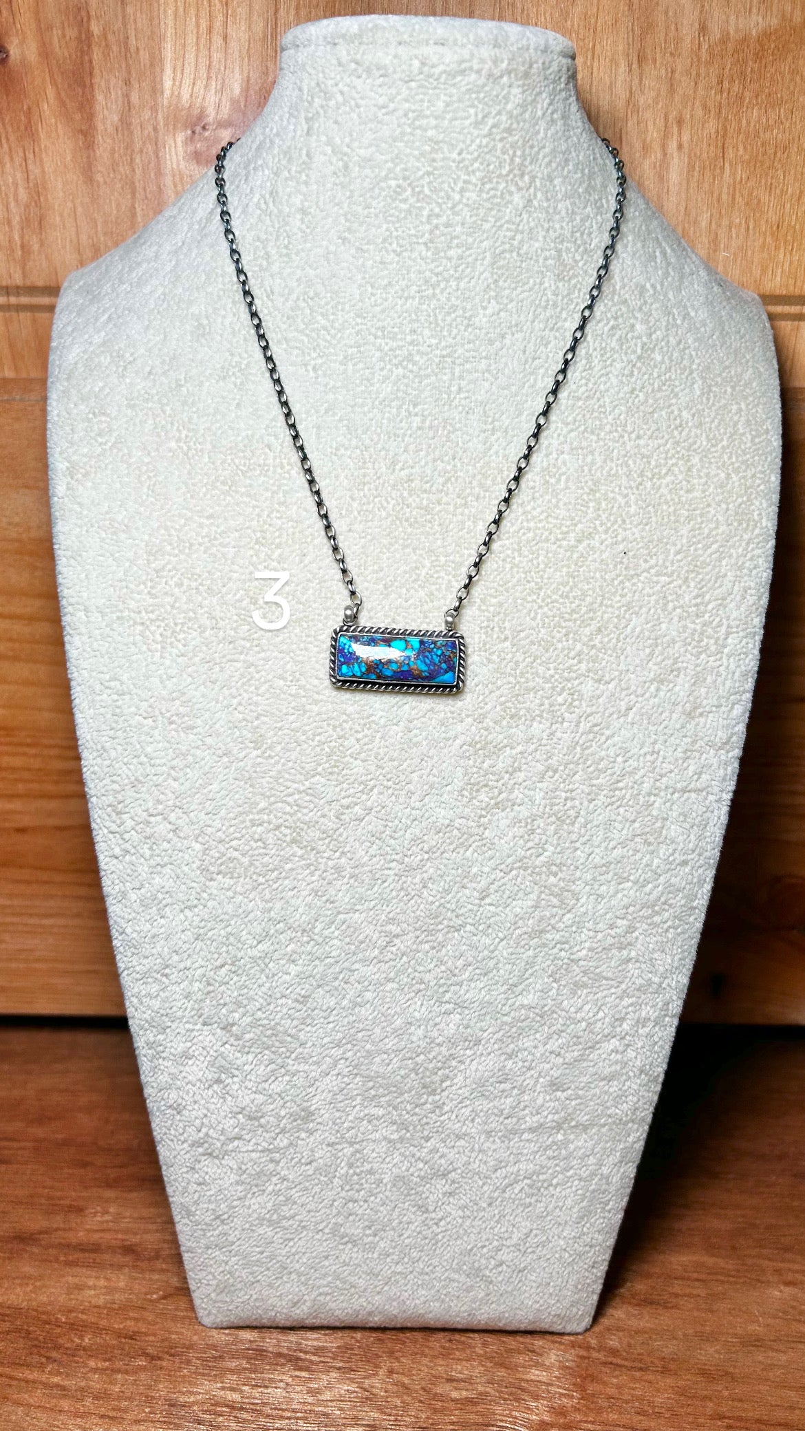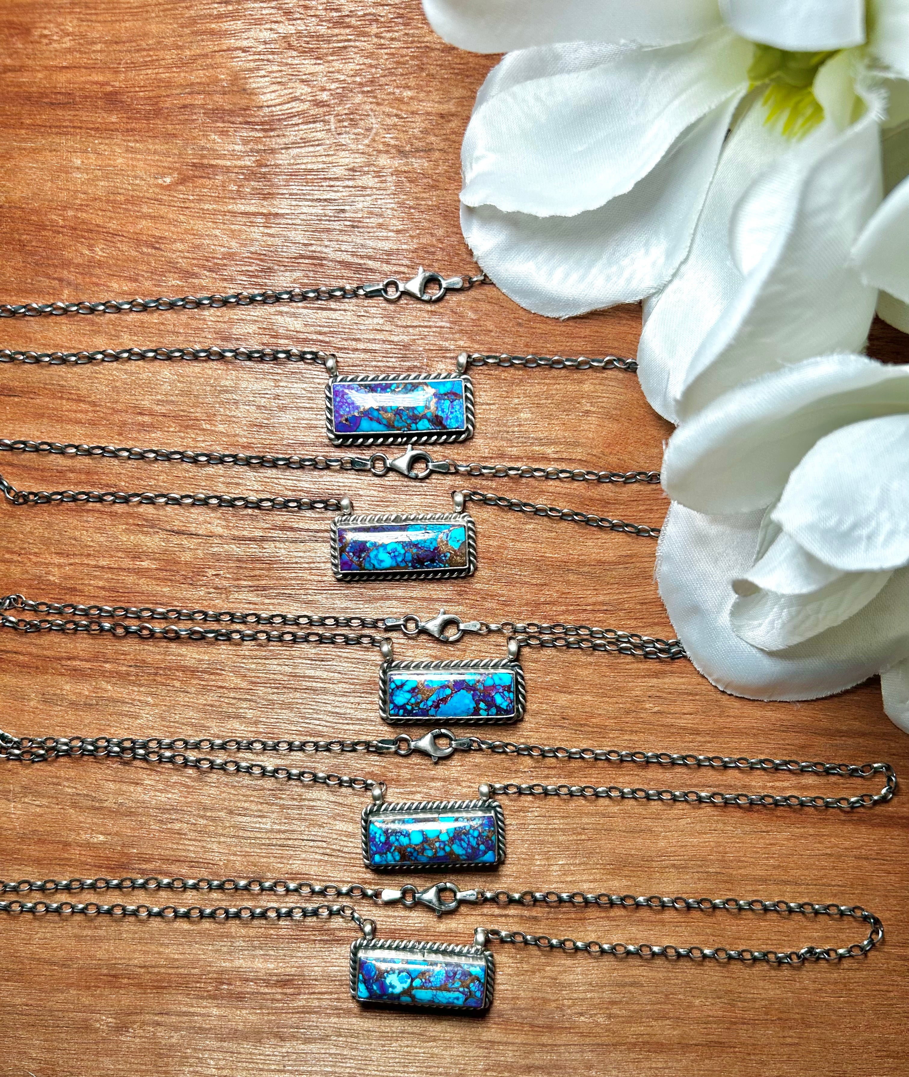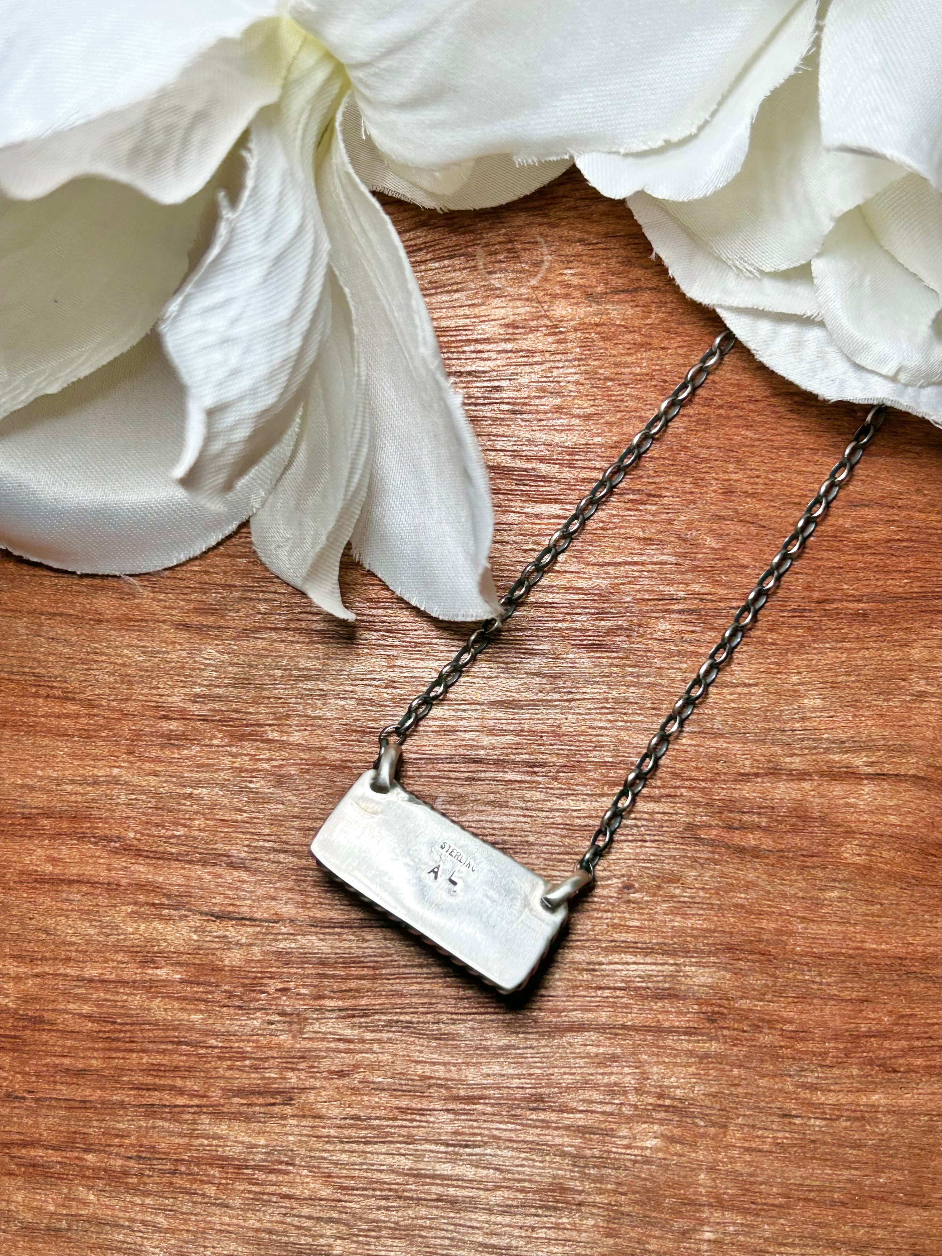 Johnny Dixon Mohave Turquoise & Sterling Silver Necklace. It measures 16 3/4 inches long with hang while the chain by itself measures 15 inches . Signed by the artist and stamped sterling silver.