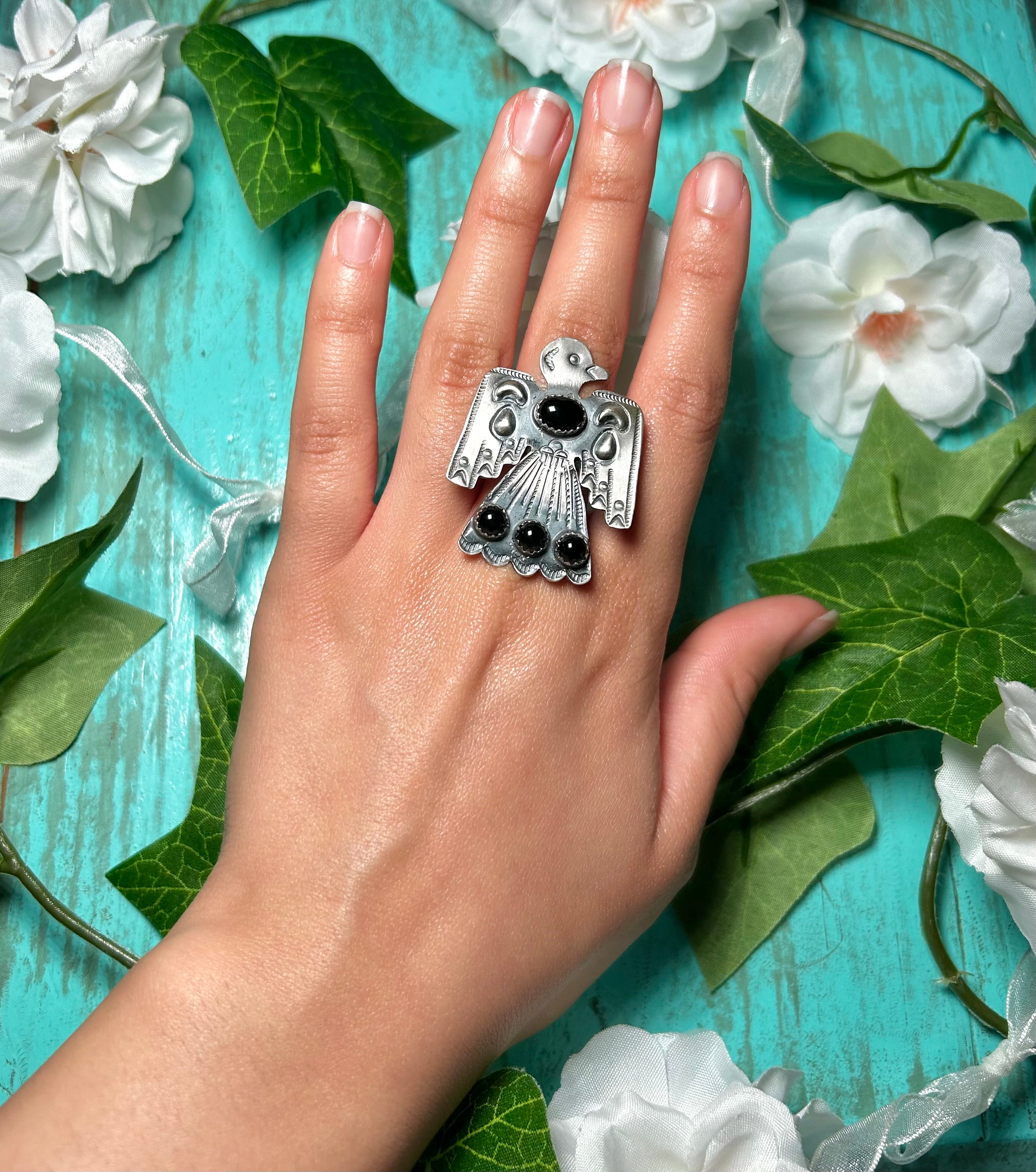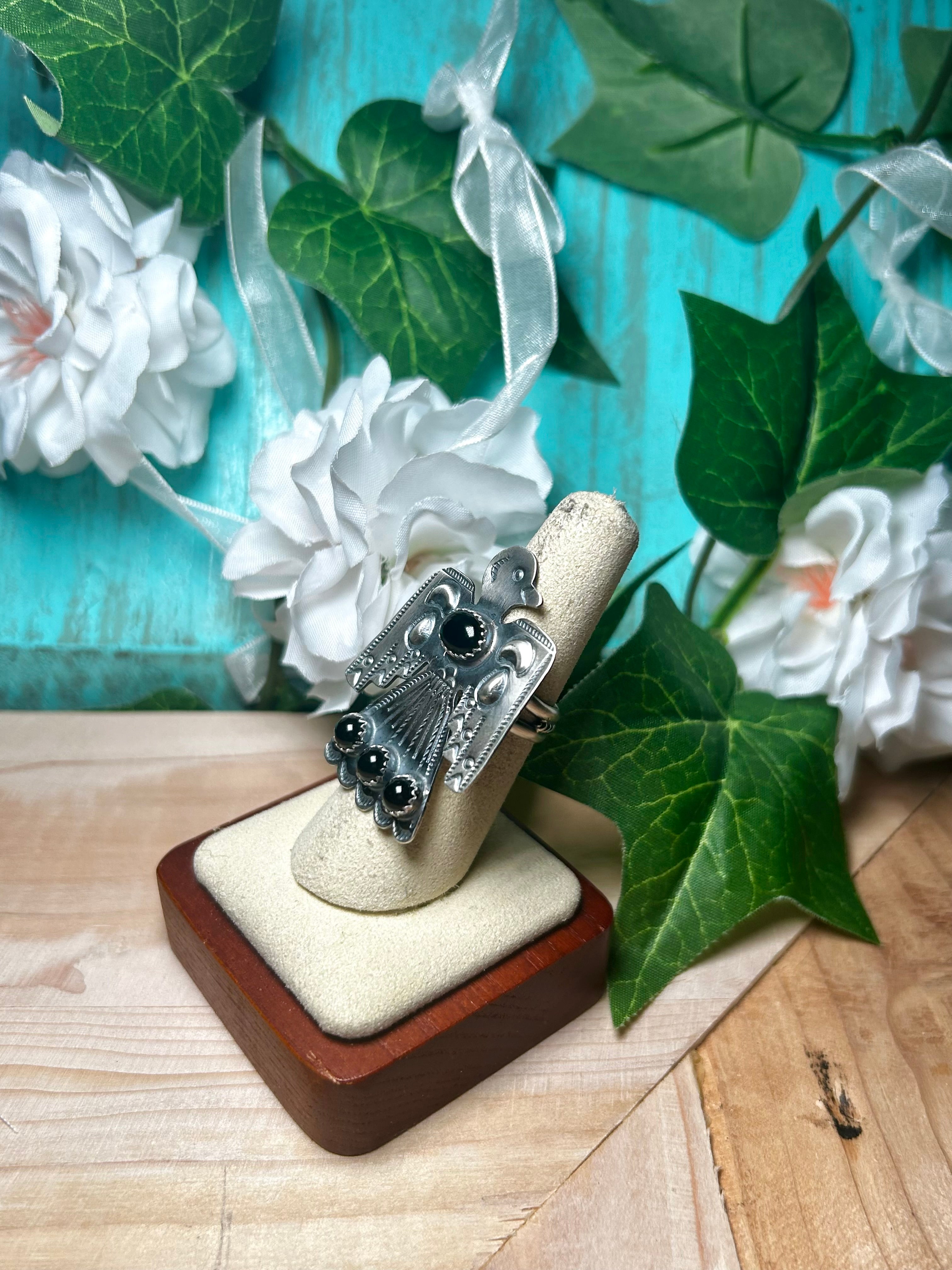 Tim Yazzie Onyx & Sterling Silver Adjustable Ring. It measures 1 5/8 inches long and 1 5/8 inches wide. Stamped sterling silver and signed.