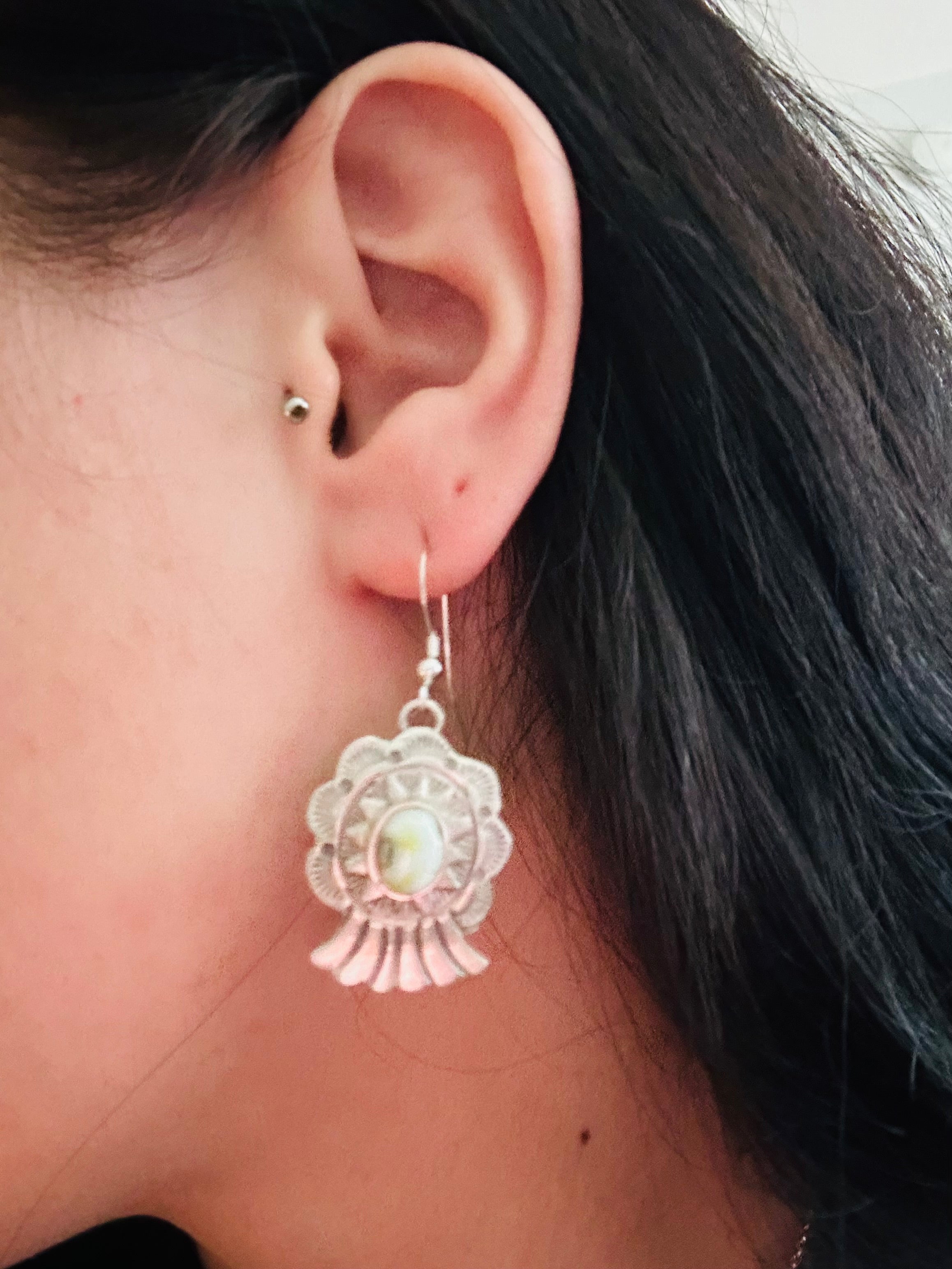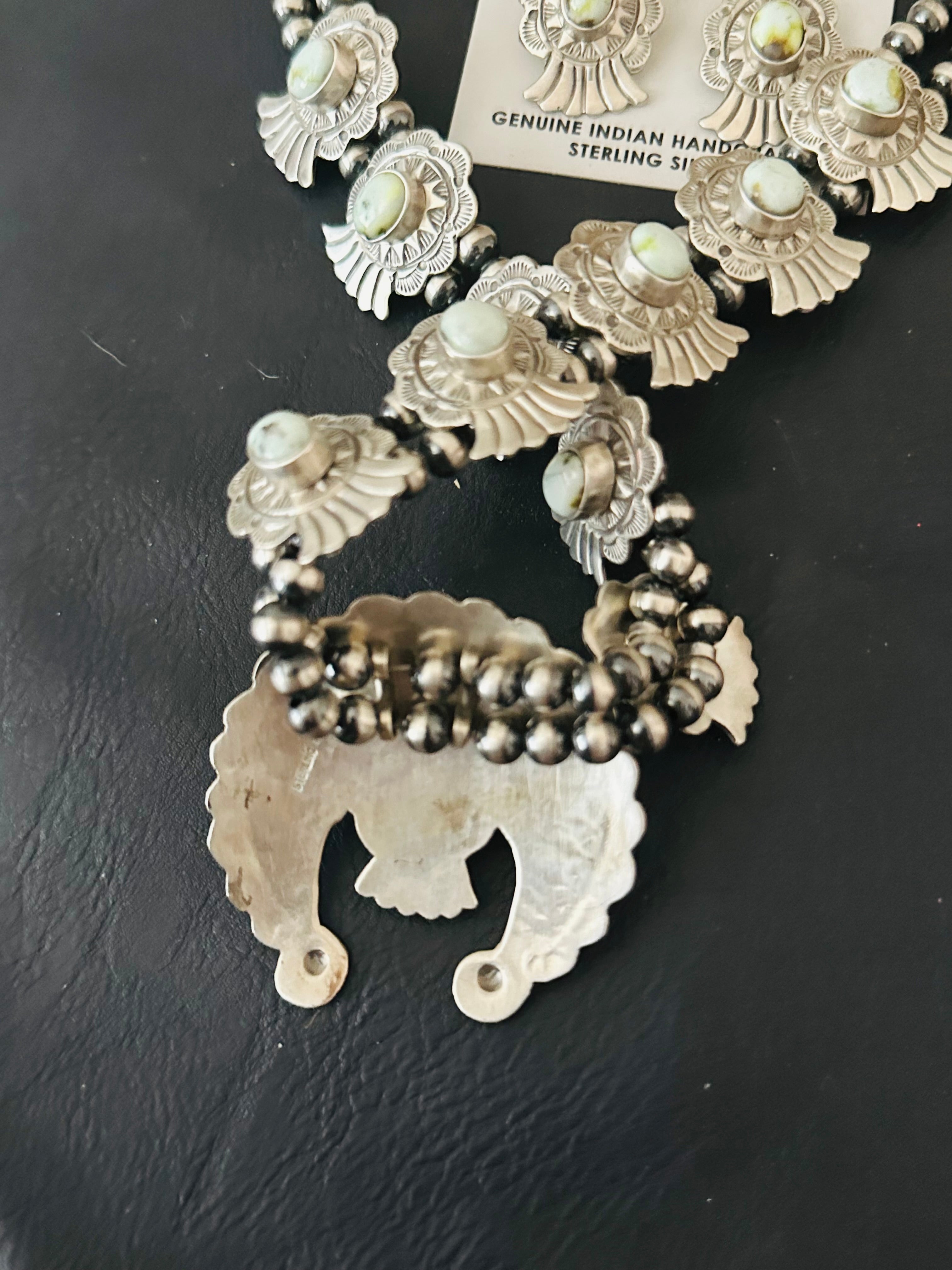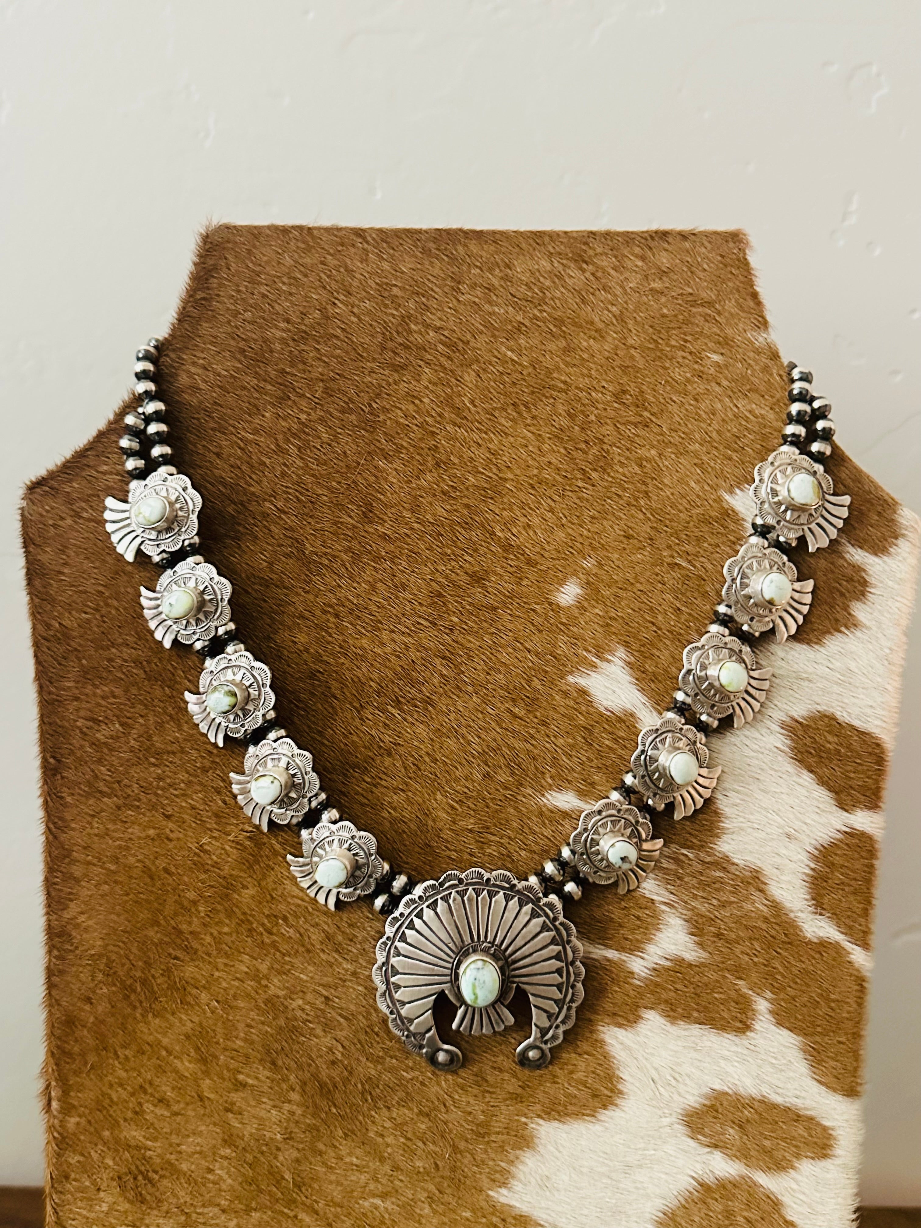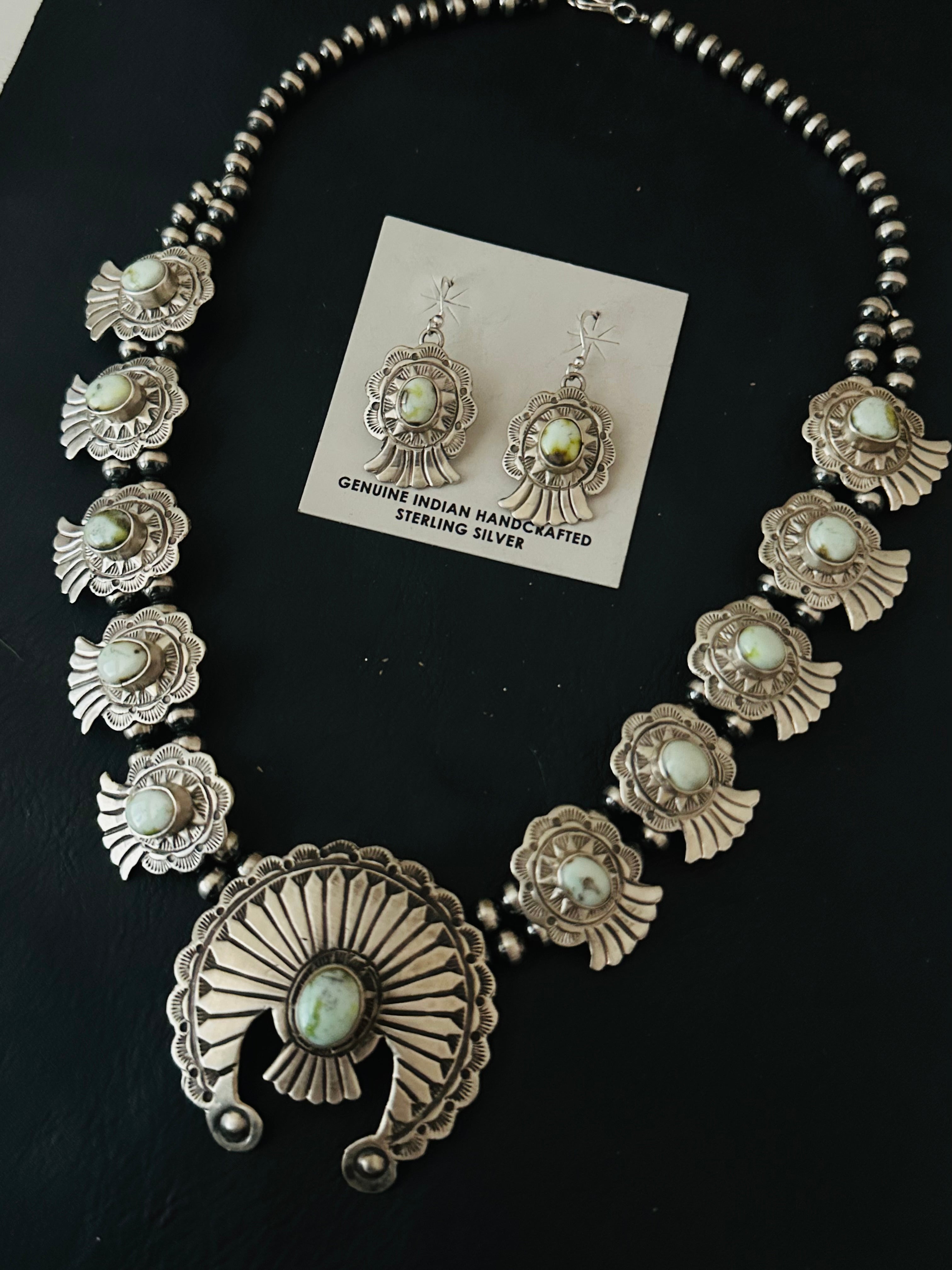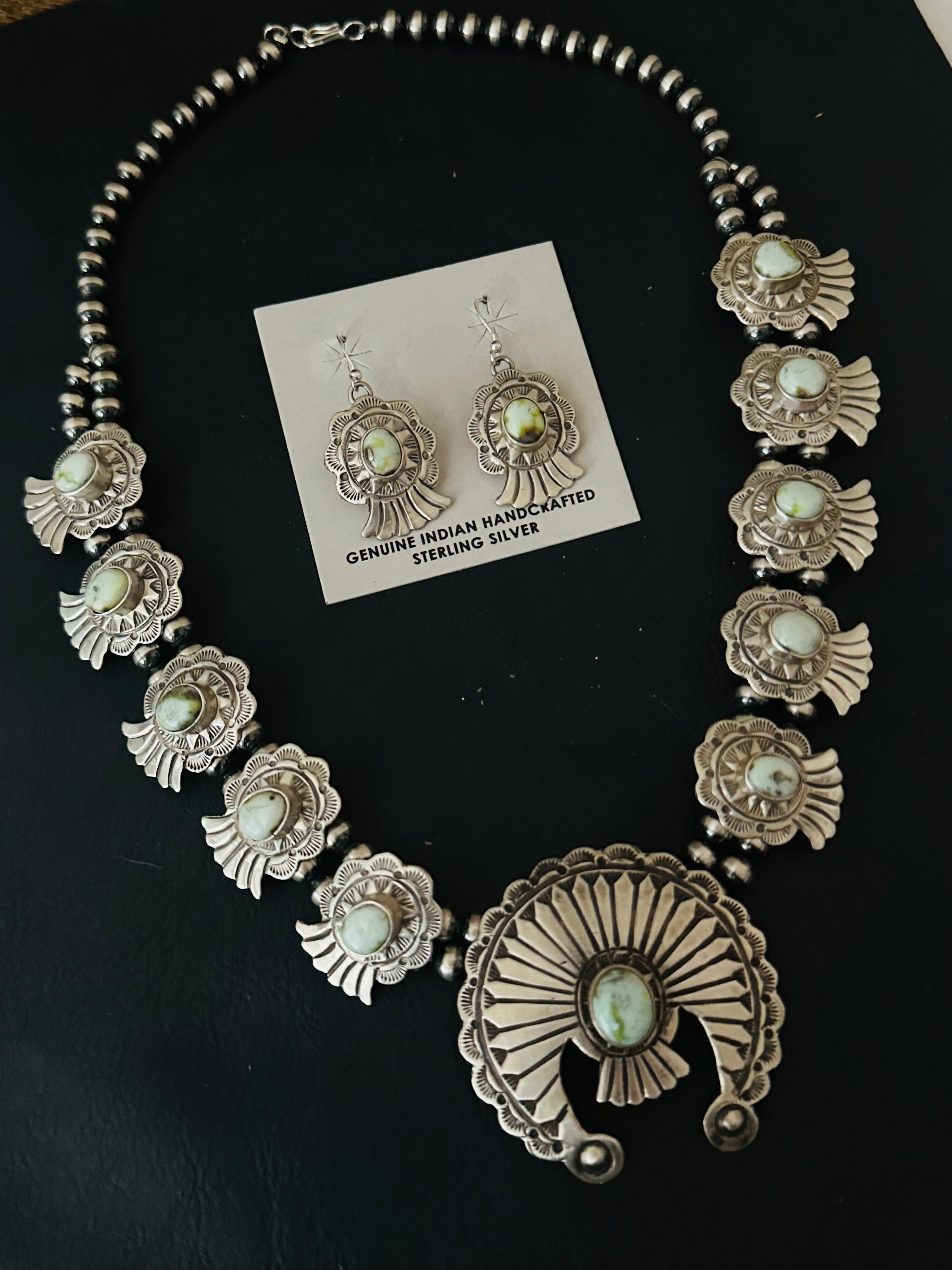 Marcella James Palomino Variscite & Sterling Silver Necklace Set. The necklace measures 22 inches long while the chain alone measures 19 inches long. Signed by the artist and stamped sterling silver.