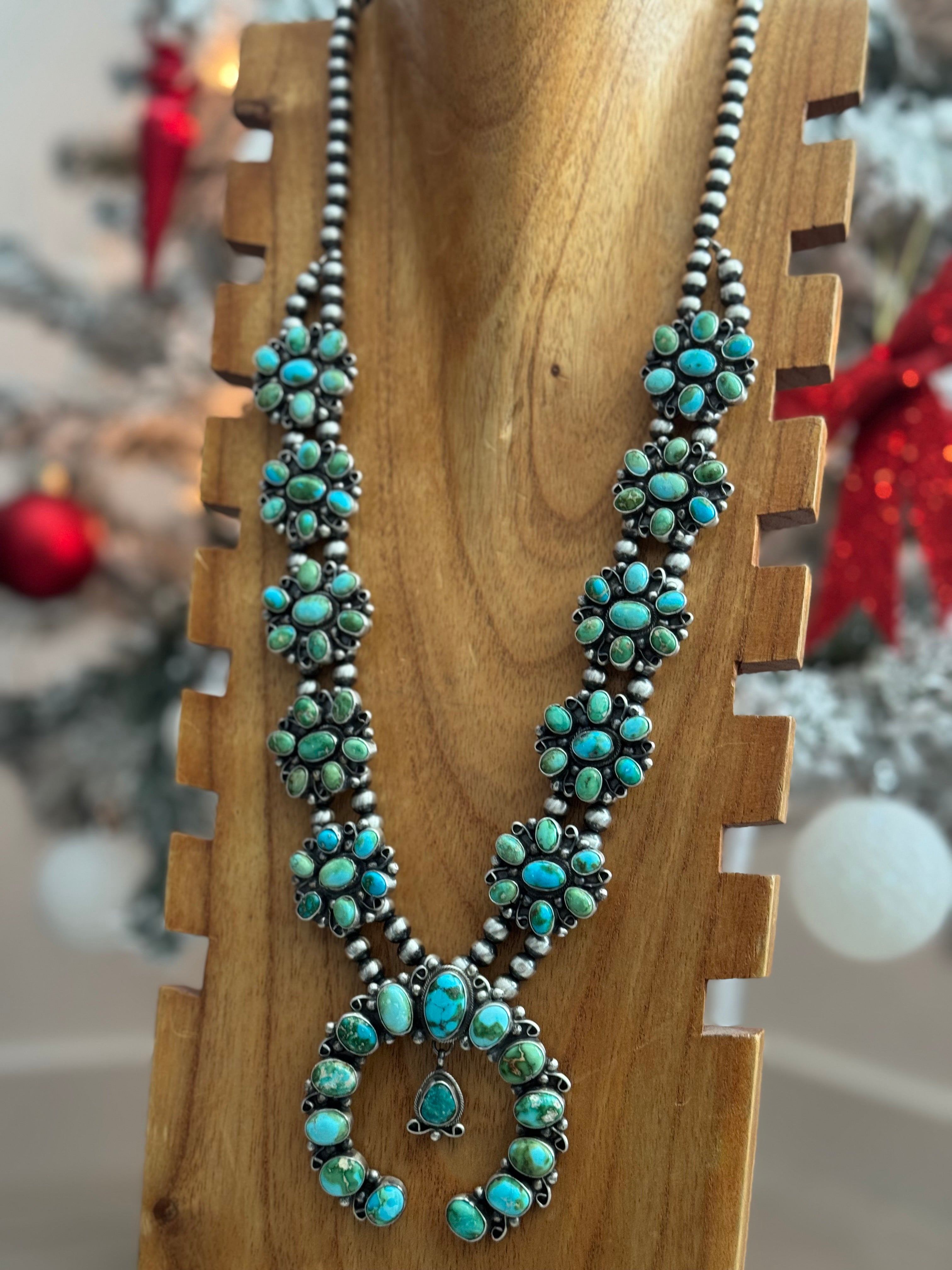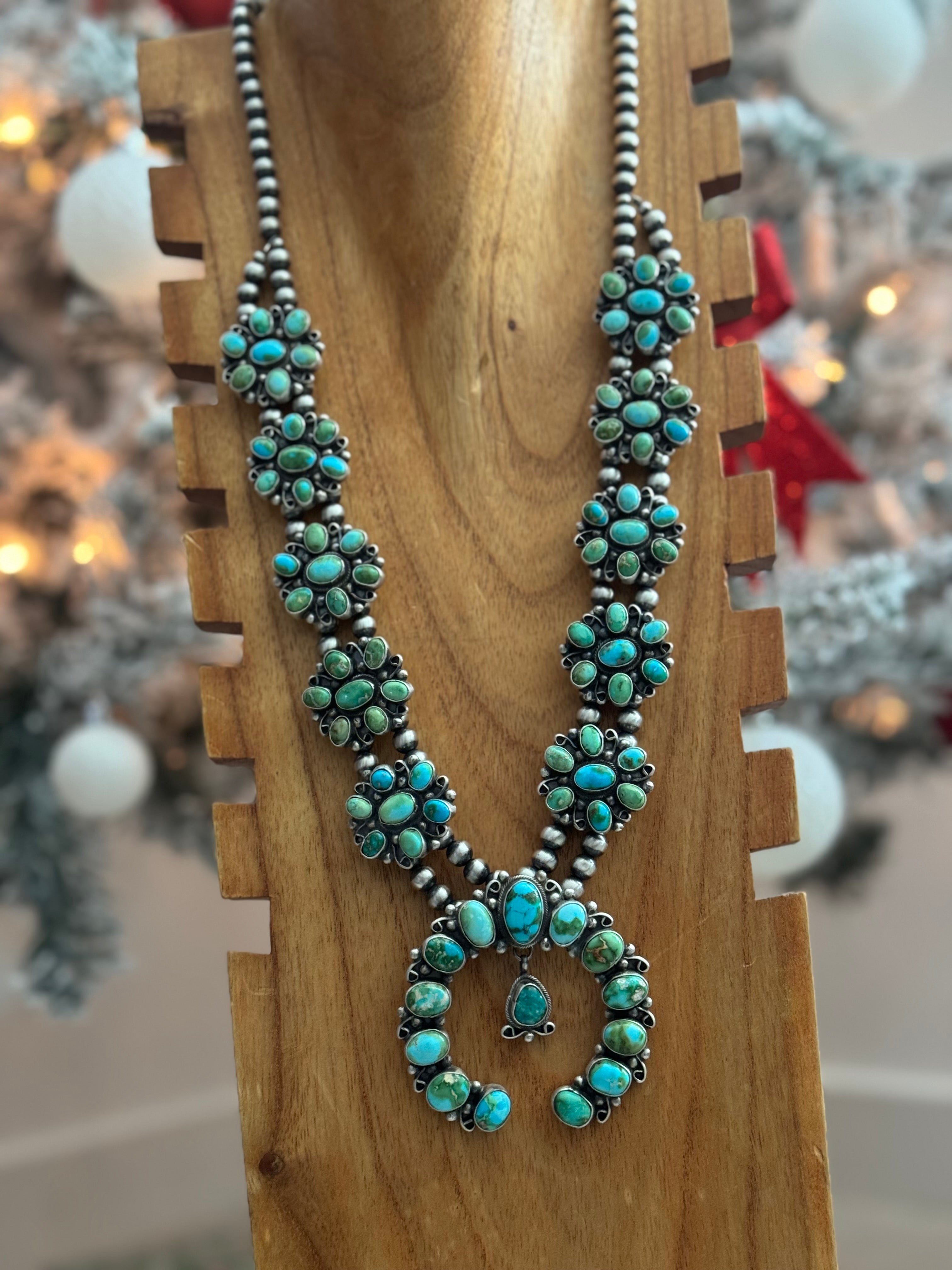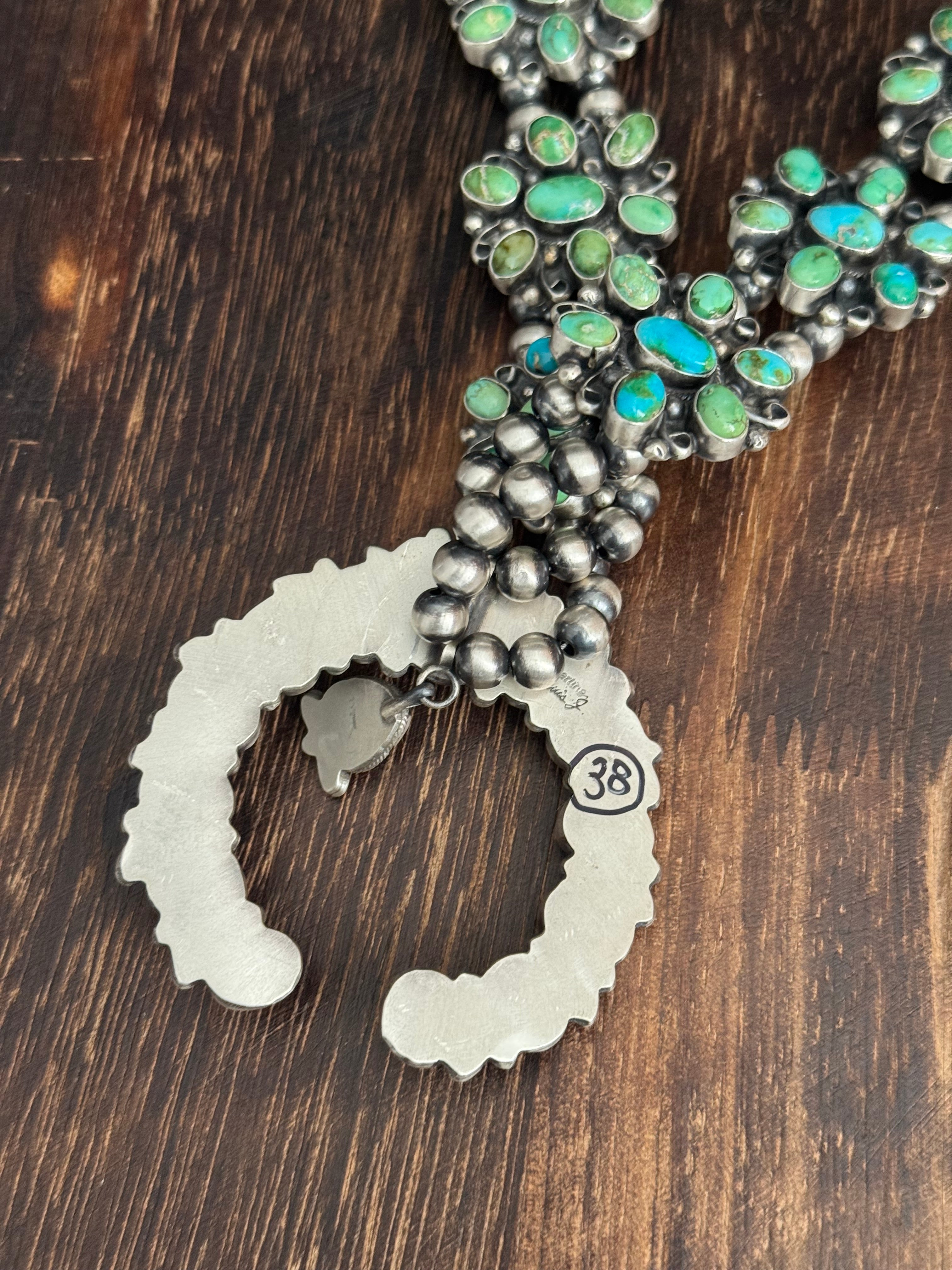 Travis J. Sonoran Mountain Turquoise & Sterling Silver Cluster Squash Necklace Set. It measures 31 inches long with hang while the chain measures 28 inches long. Signed by the artist and stamped sterling silver.