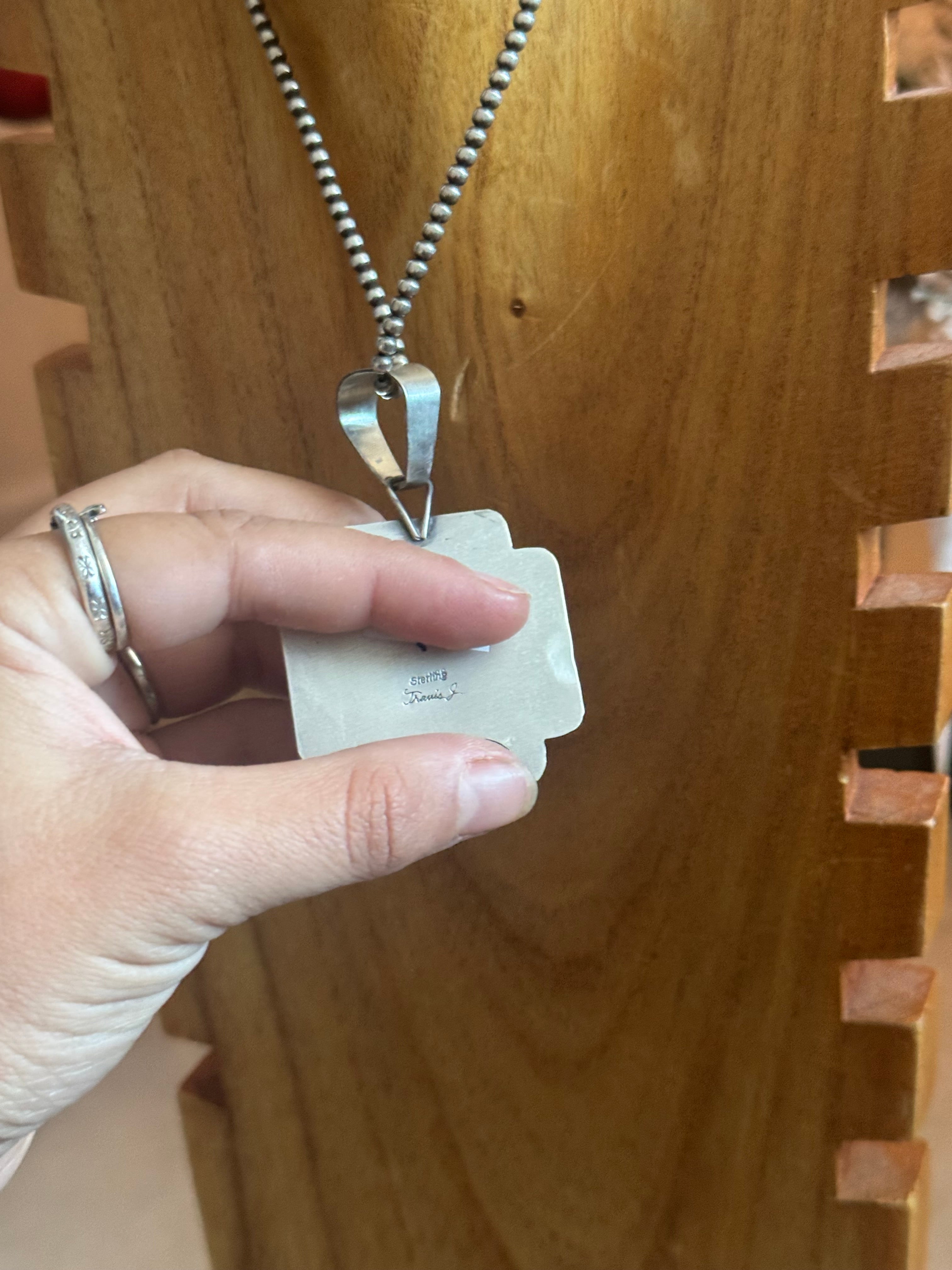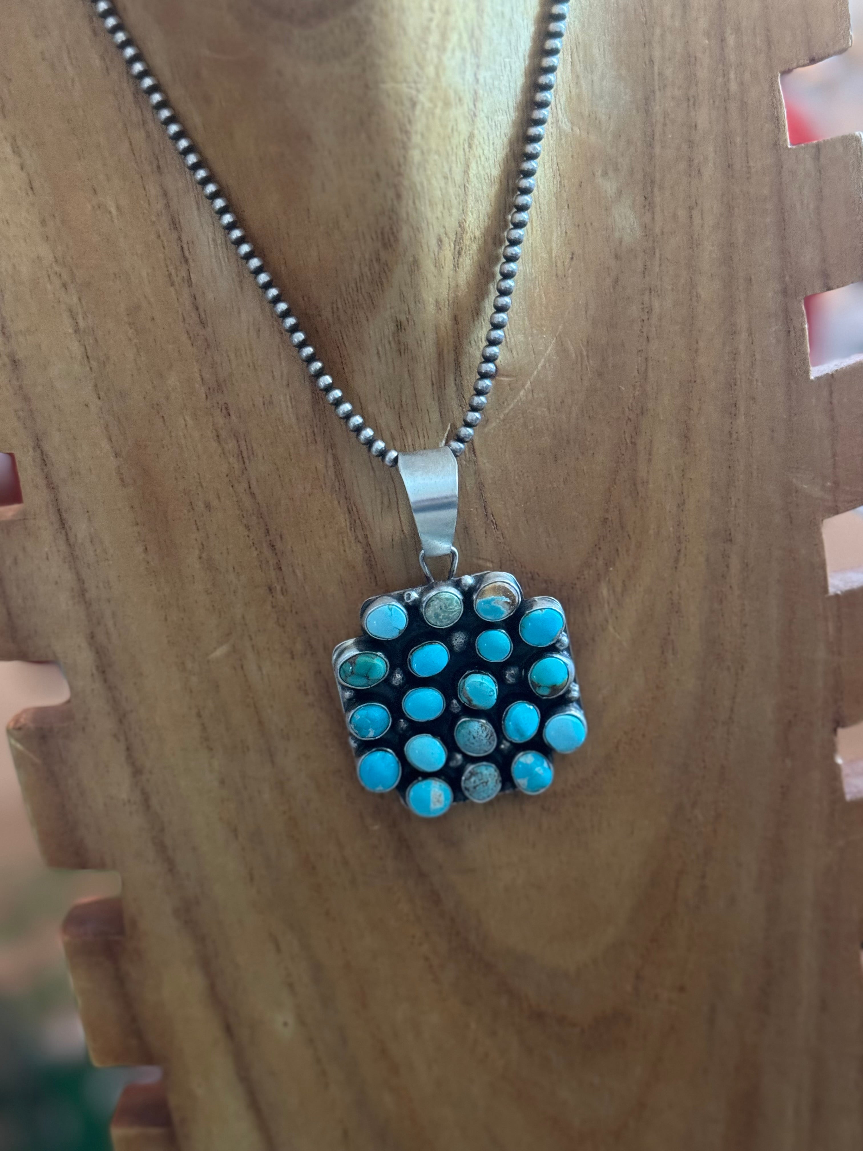 Travis Jim Mixed Turquoise & Sterling Silver Cluster Pendant. It measures 2 5/8 inches long and 1 5/8 inches wide. Pendant Only! Signed by the artist and stamped sterling silver.