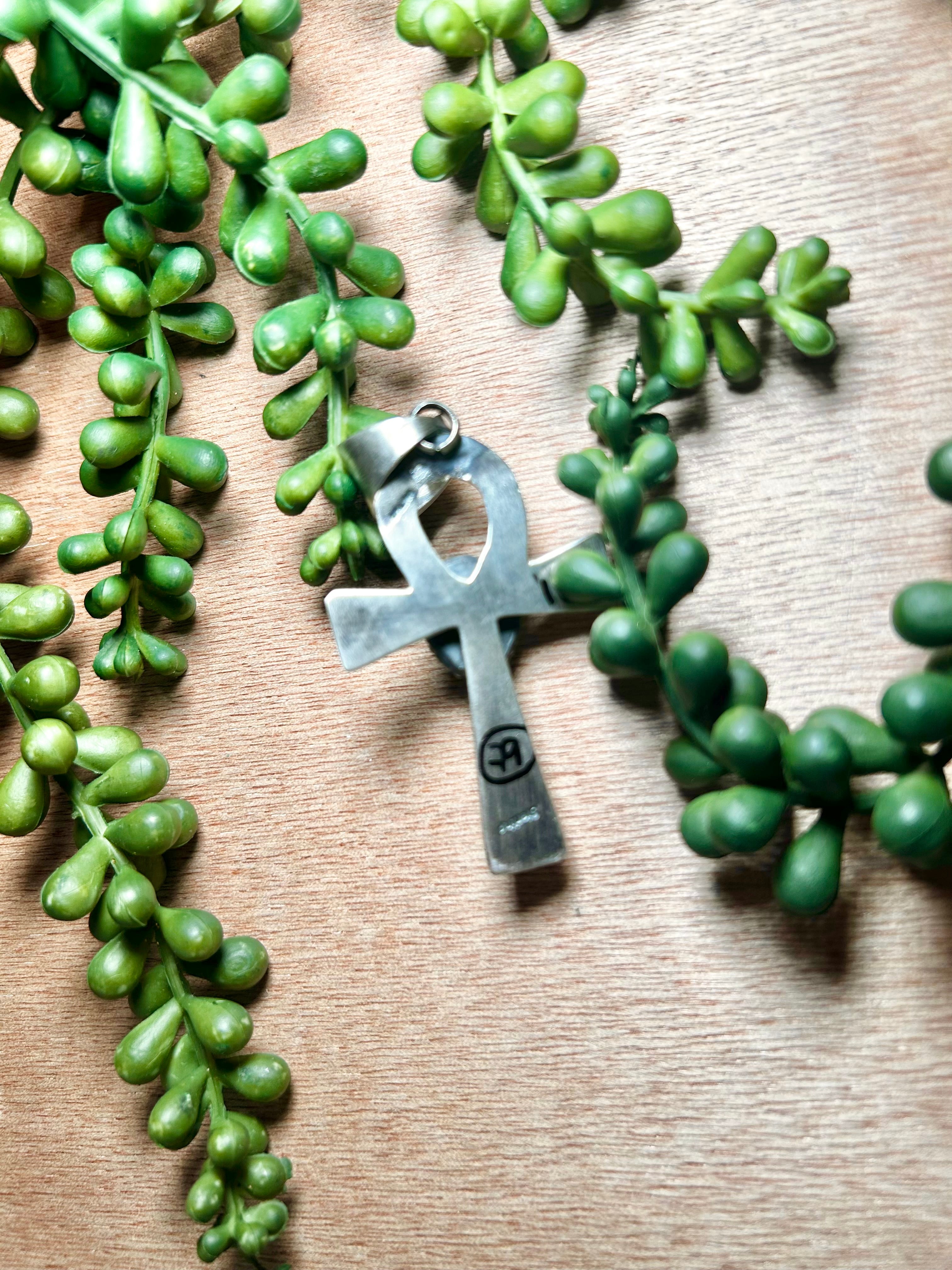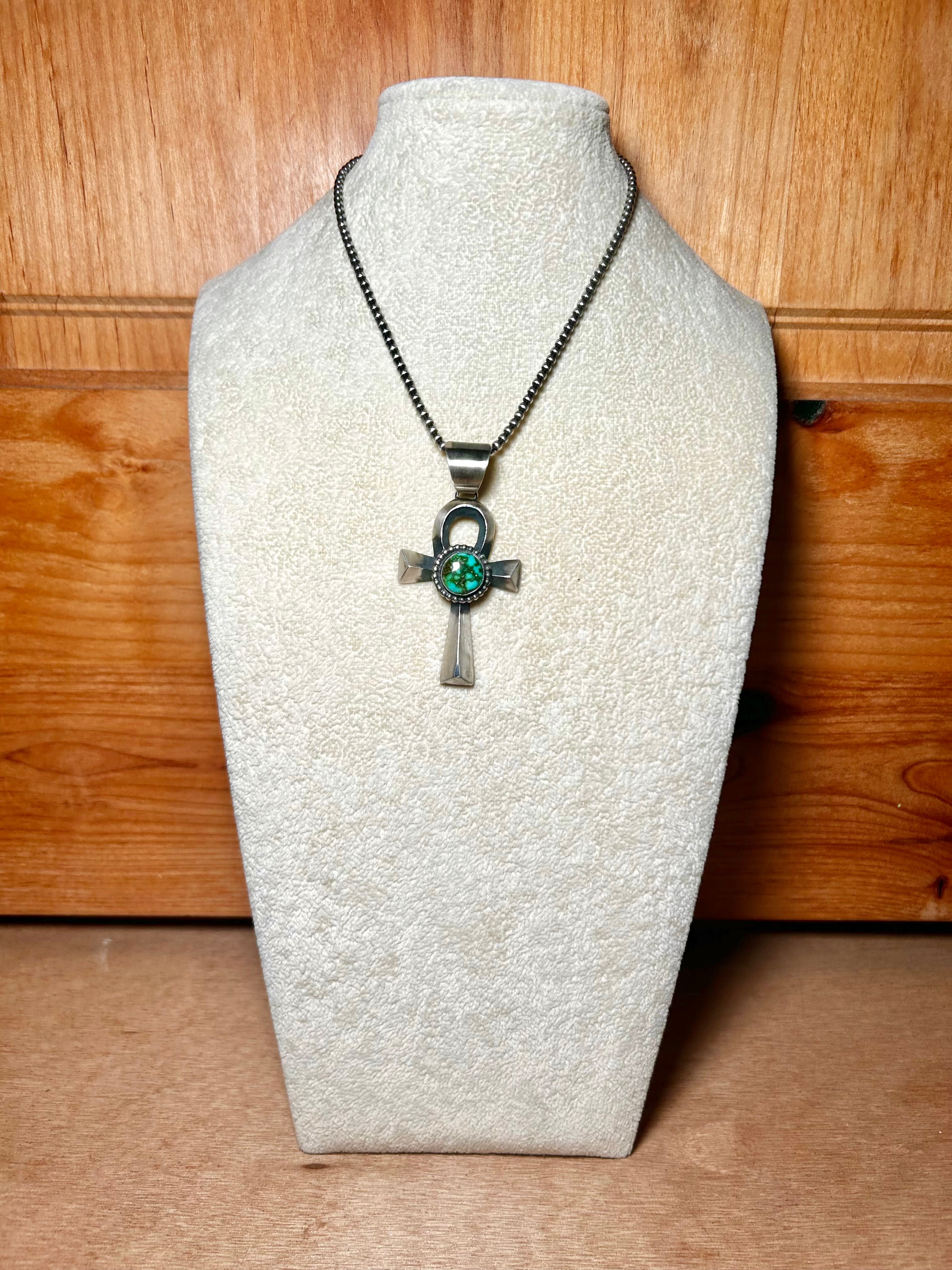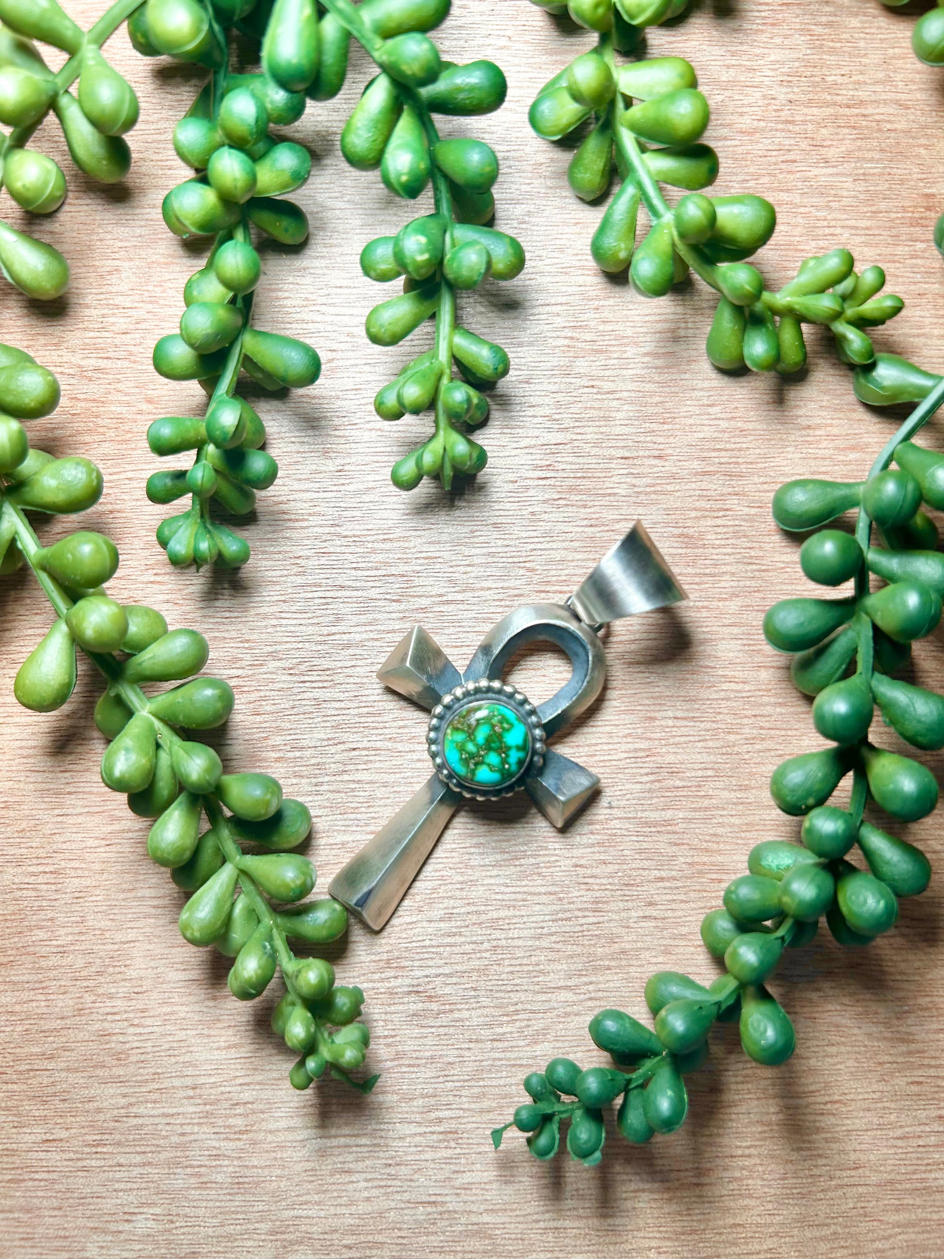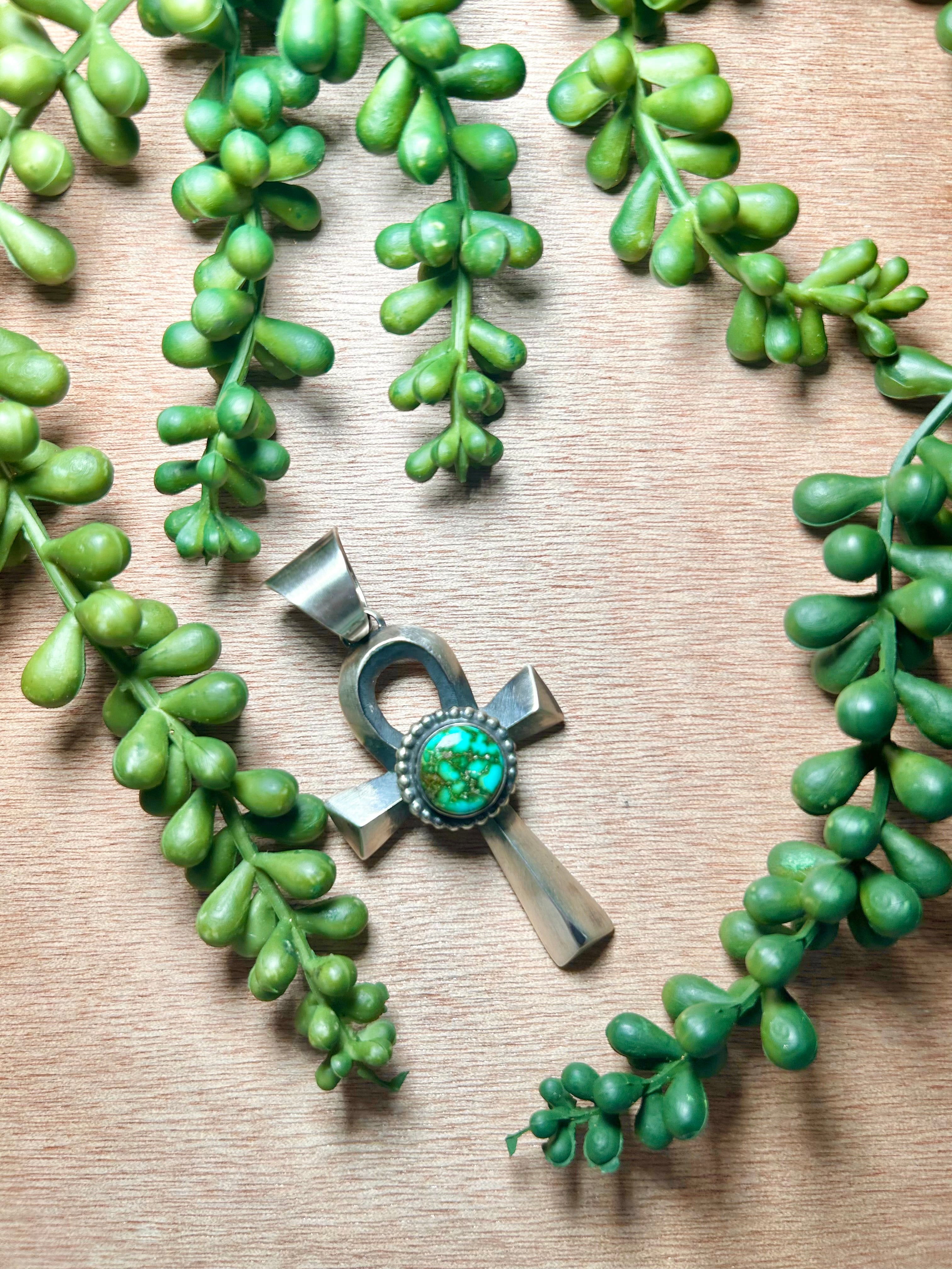 Chimney Butte Sonoran Mountain Turquoise & Sterling Silver Pendant. It measures 2 7/8 inches long and 1 3/8 inches wide. Pendant Only! Signed by the artist and stamped sterling silver.