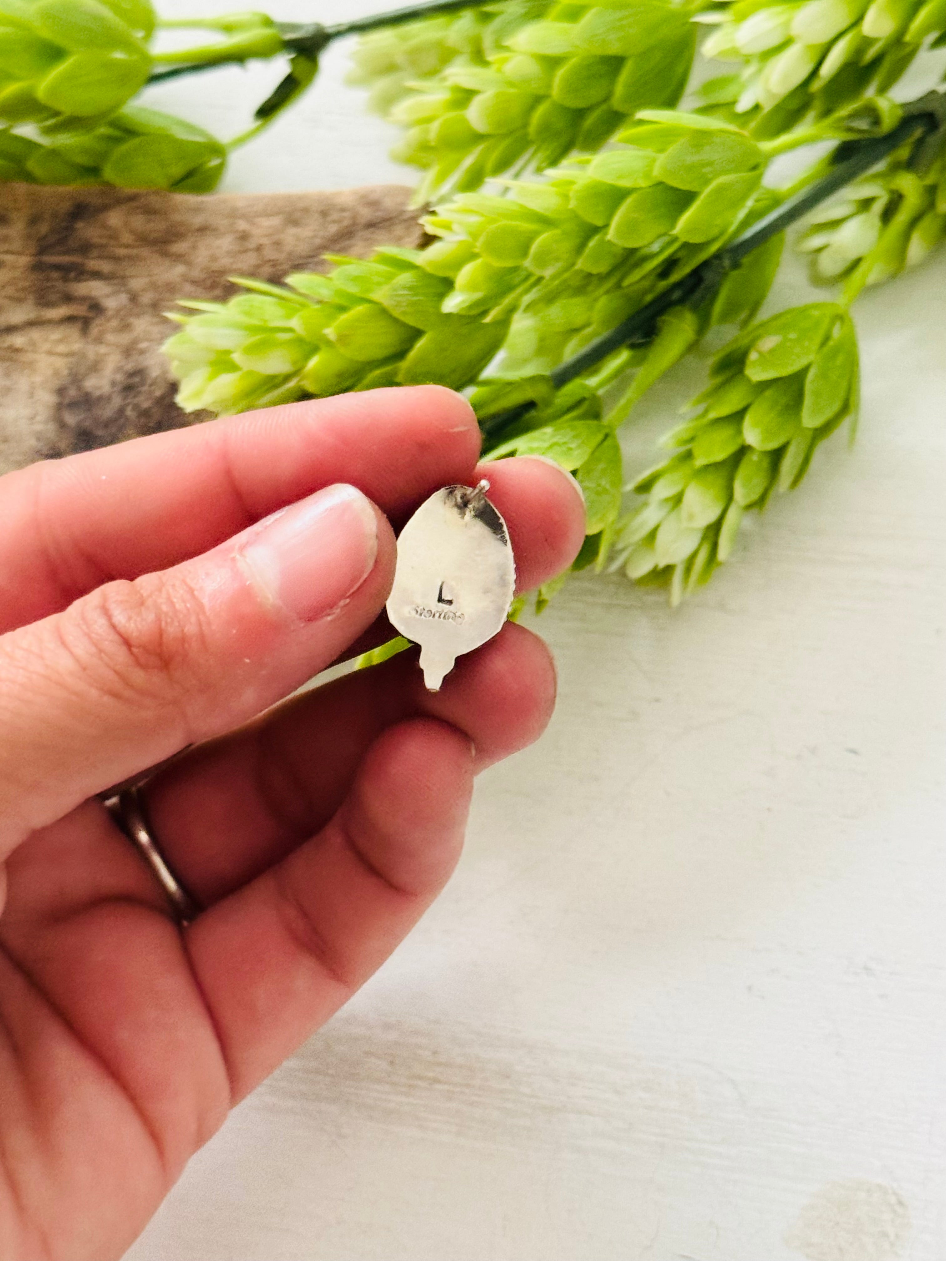 Trish Largo Kingman Turquoise & Sterling Silver Post Earrings. It measures 3/4 of an inch long and 1/2 of an inch wide. Signed by the artist and stamped sterling silver.