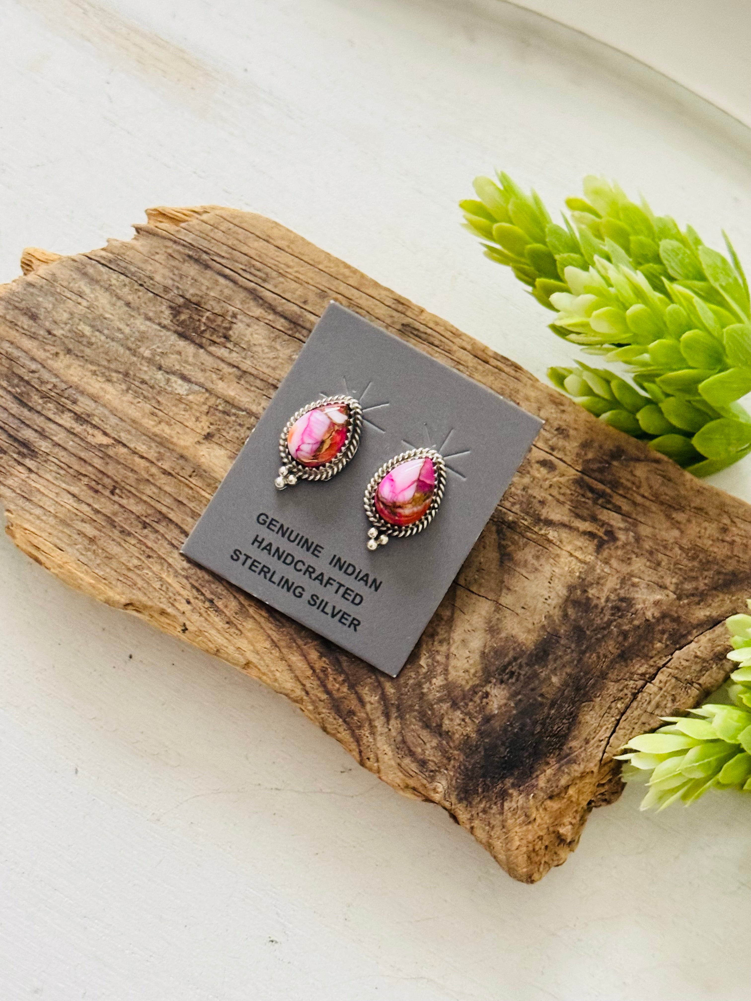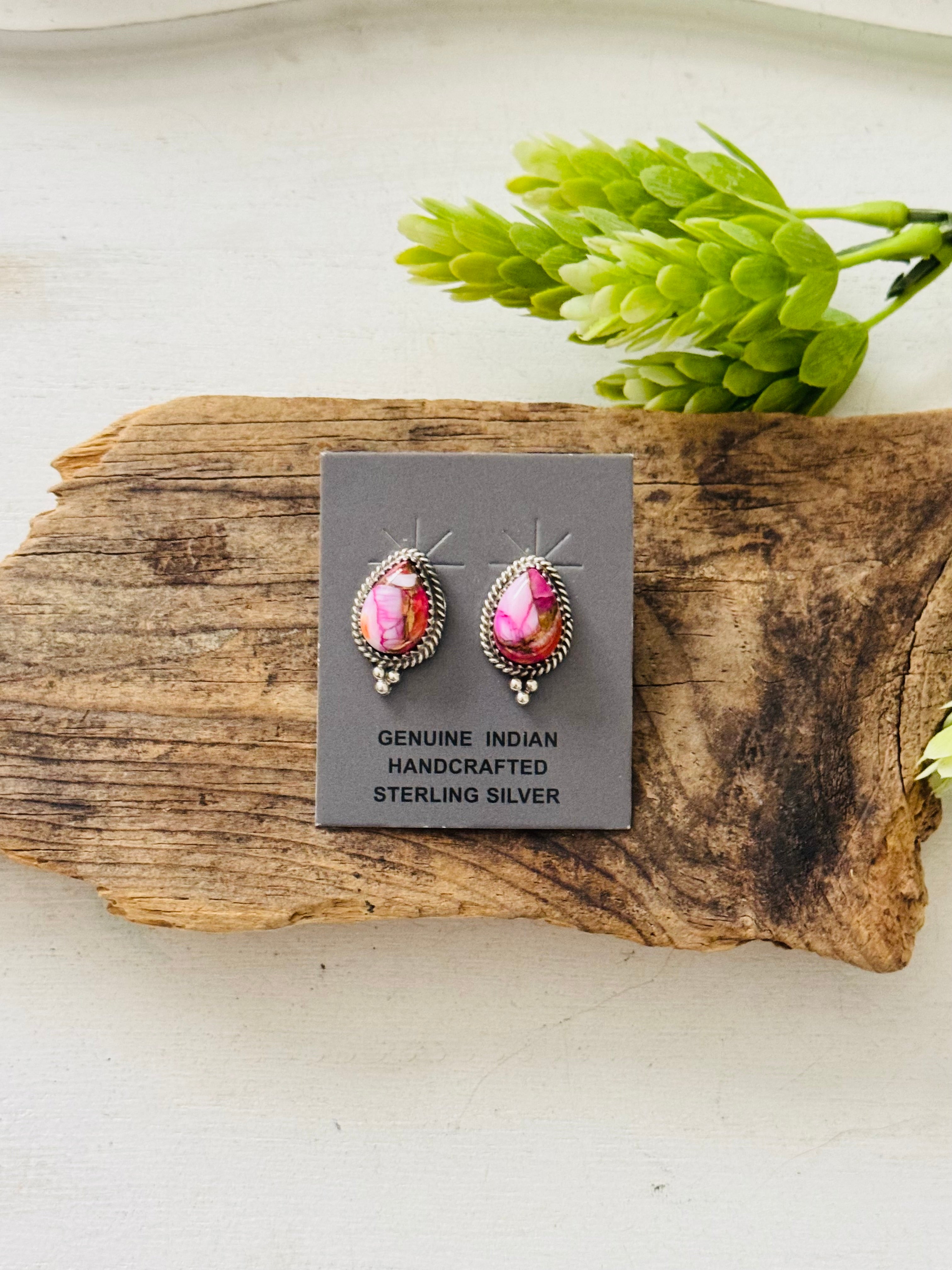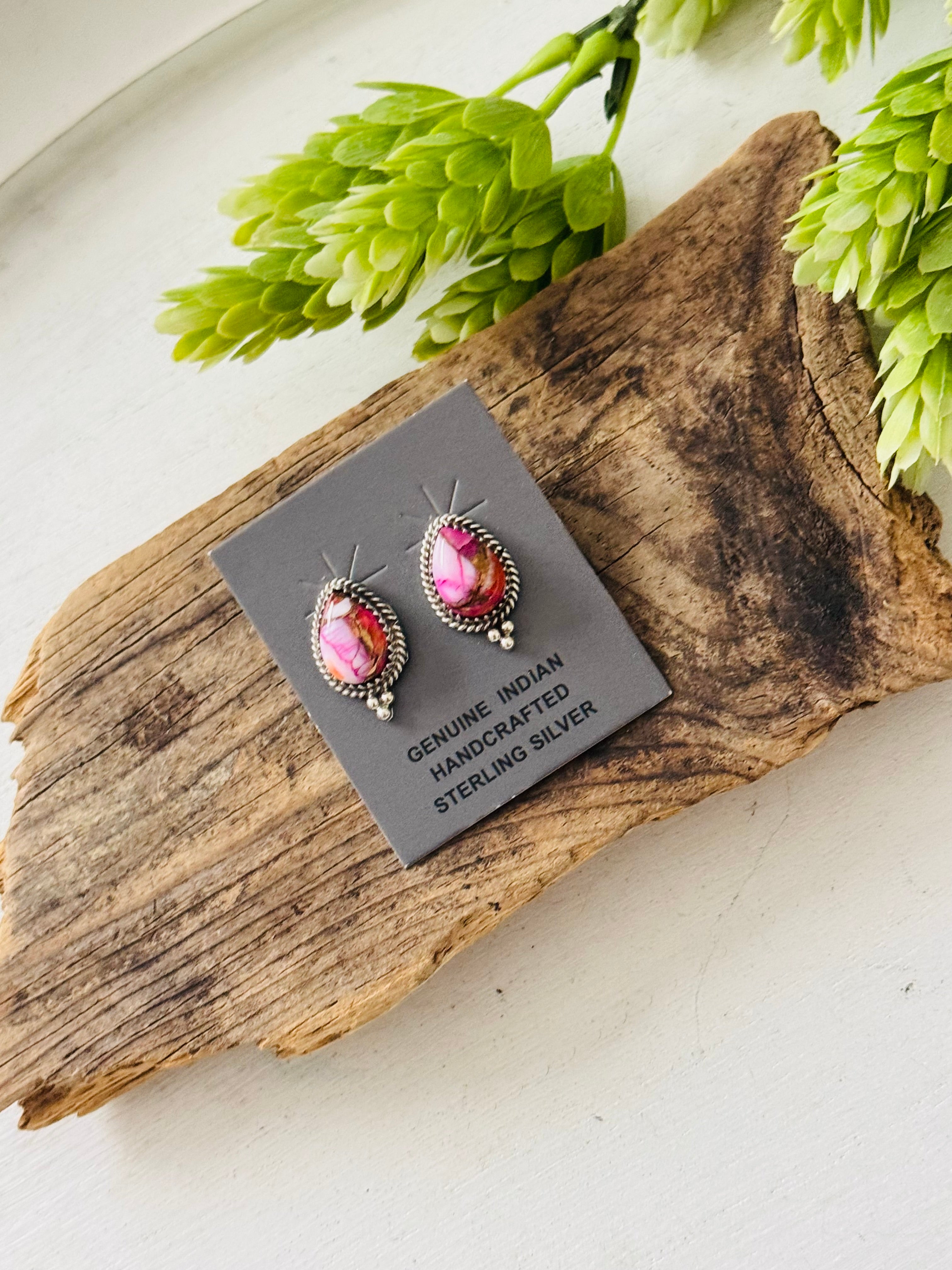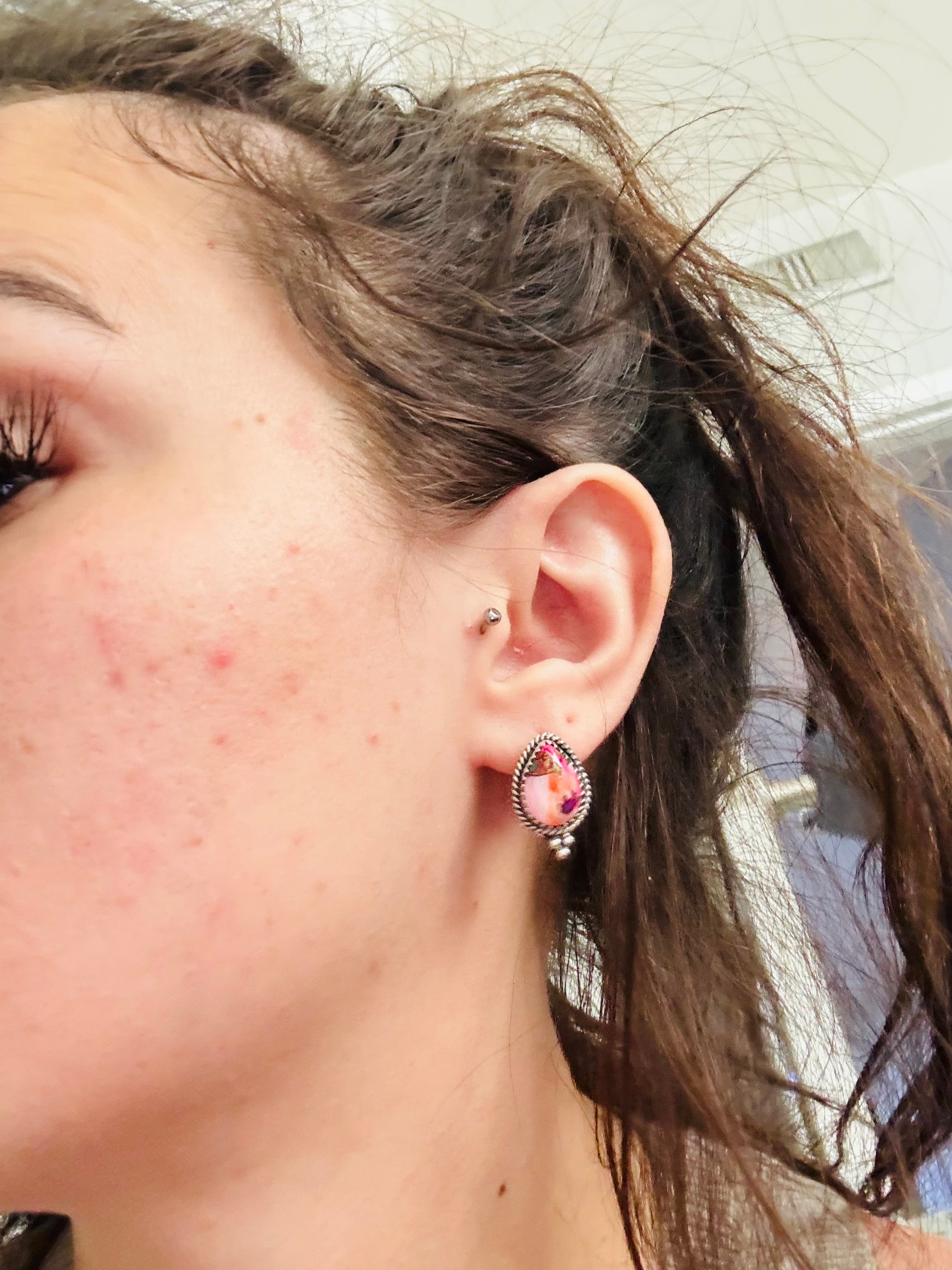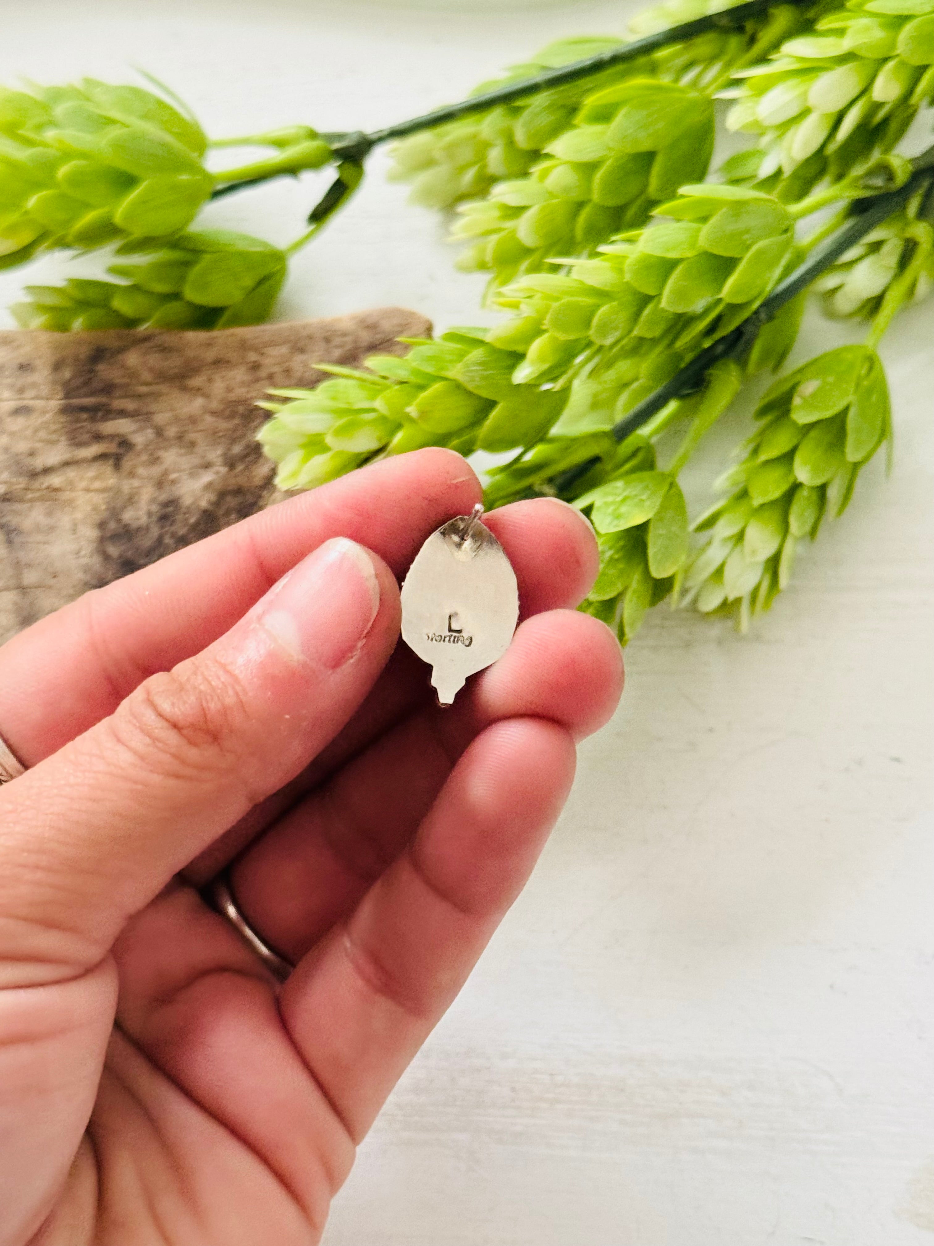 Trish Largo Mohave Turquoise & Sterling Silver Post Earrings. It measures 3/4 of an inch long and 1/2 of an inch wide. Signed by the artist and stamped sterling silver.