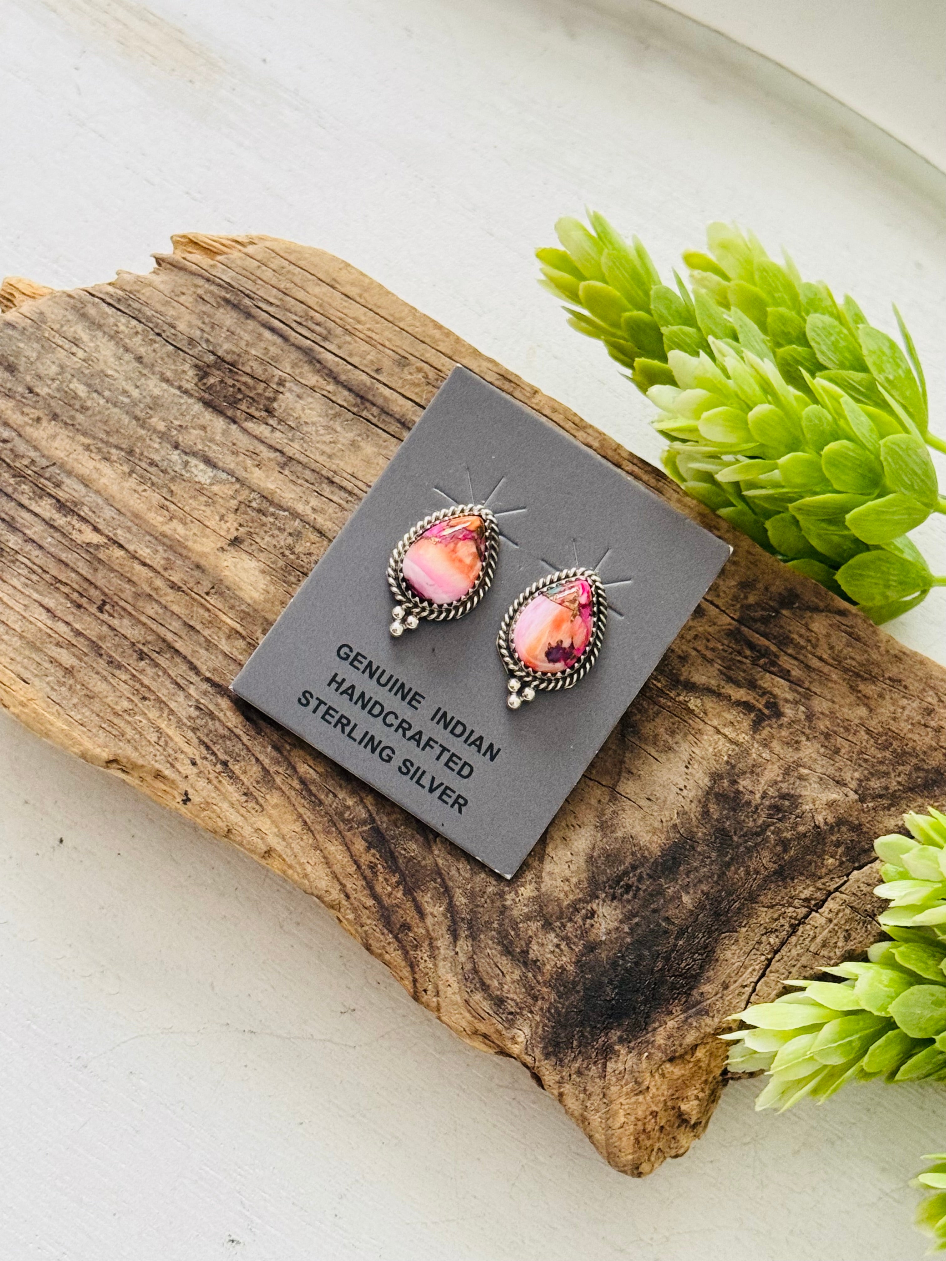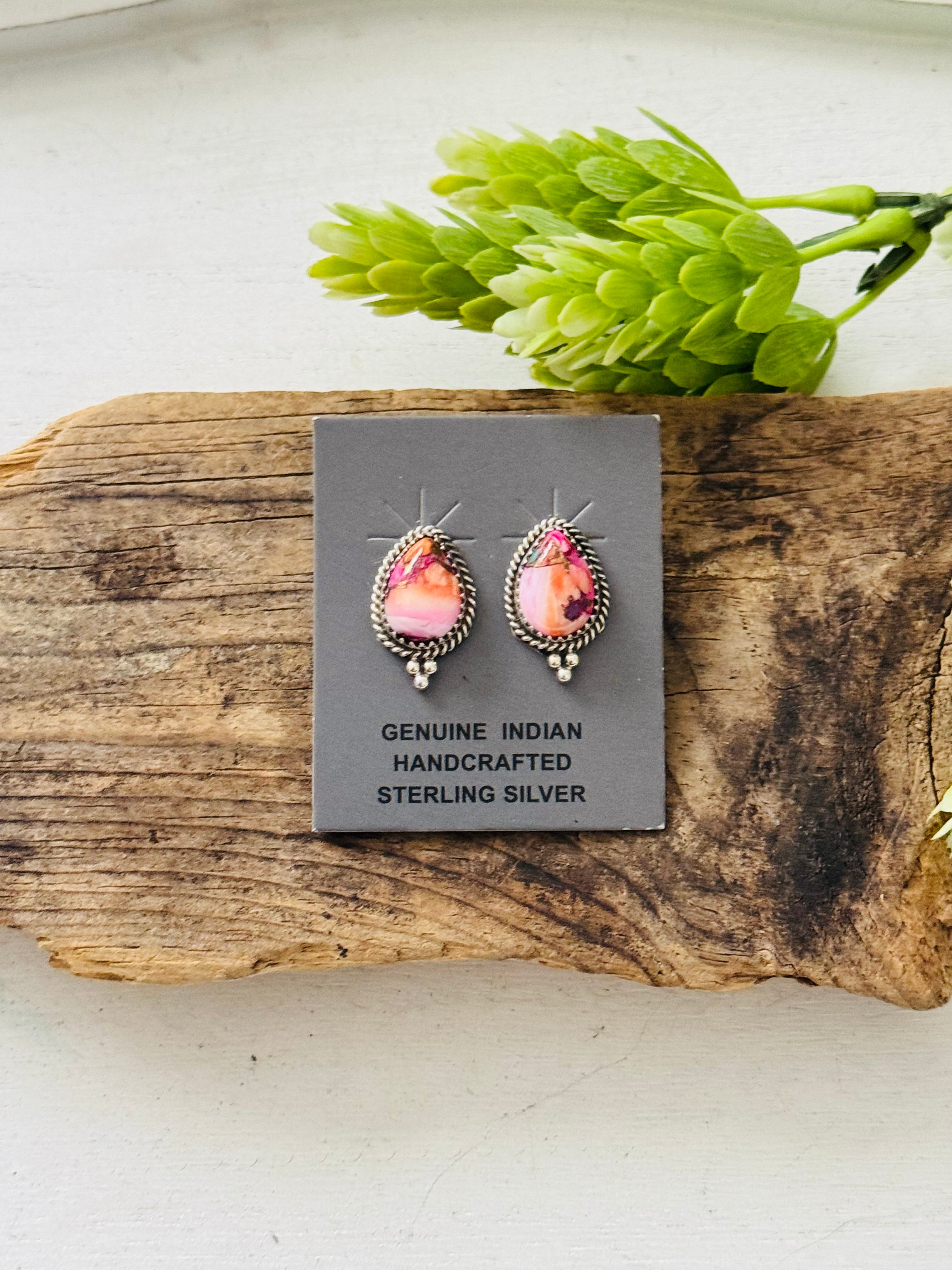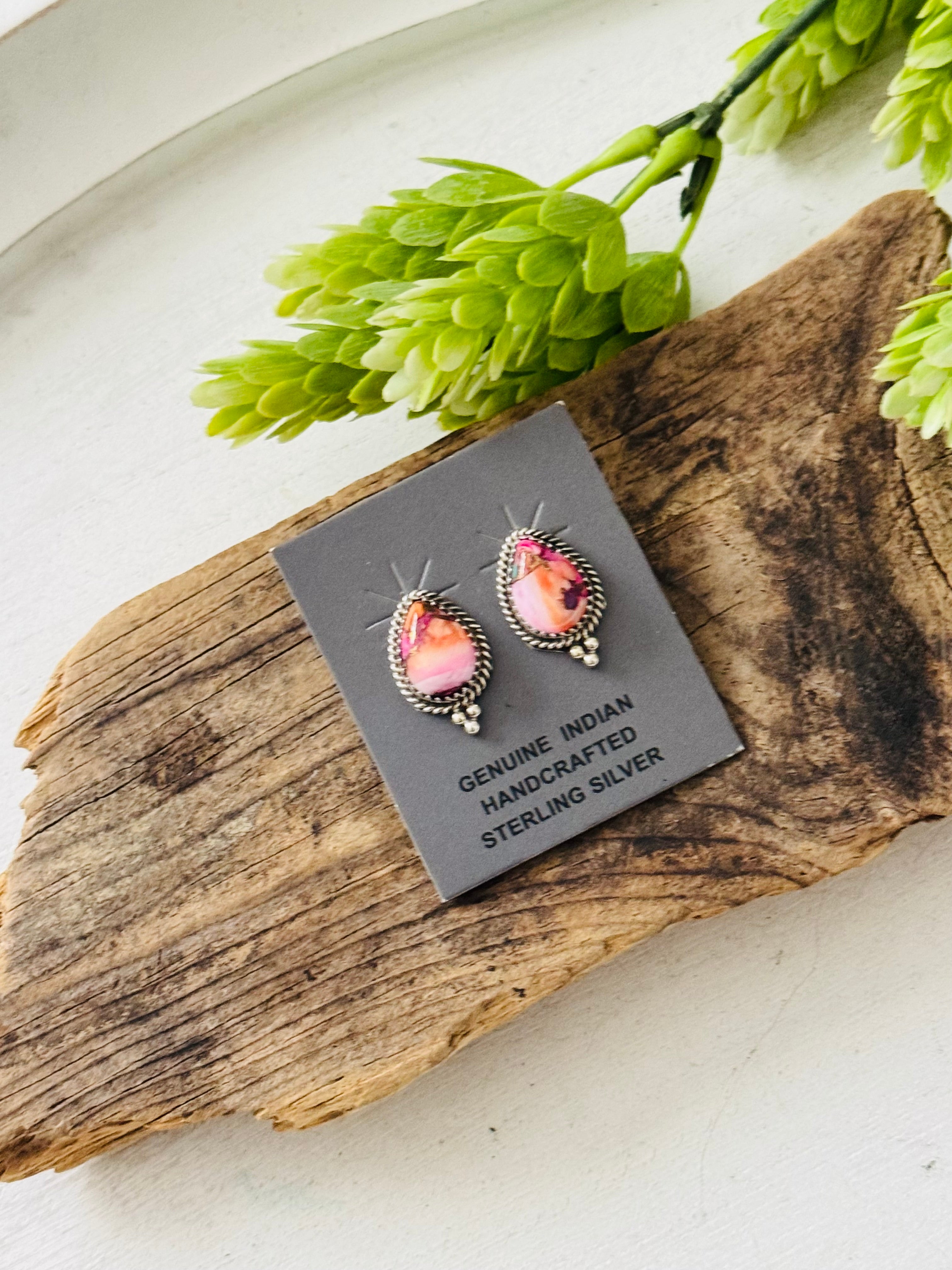 Trish Largo Mohave Turquoise & Sterling Silver Post Earrings. It measures 3/4 of an inch long and 1/2 of an inch wide. Signed by the artist and stamped sterling silver.