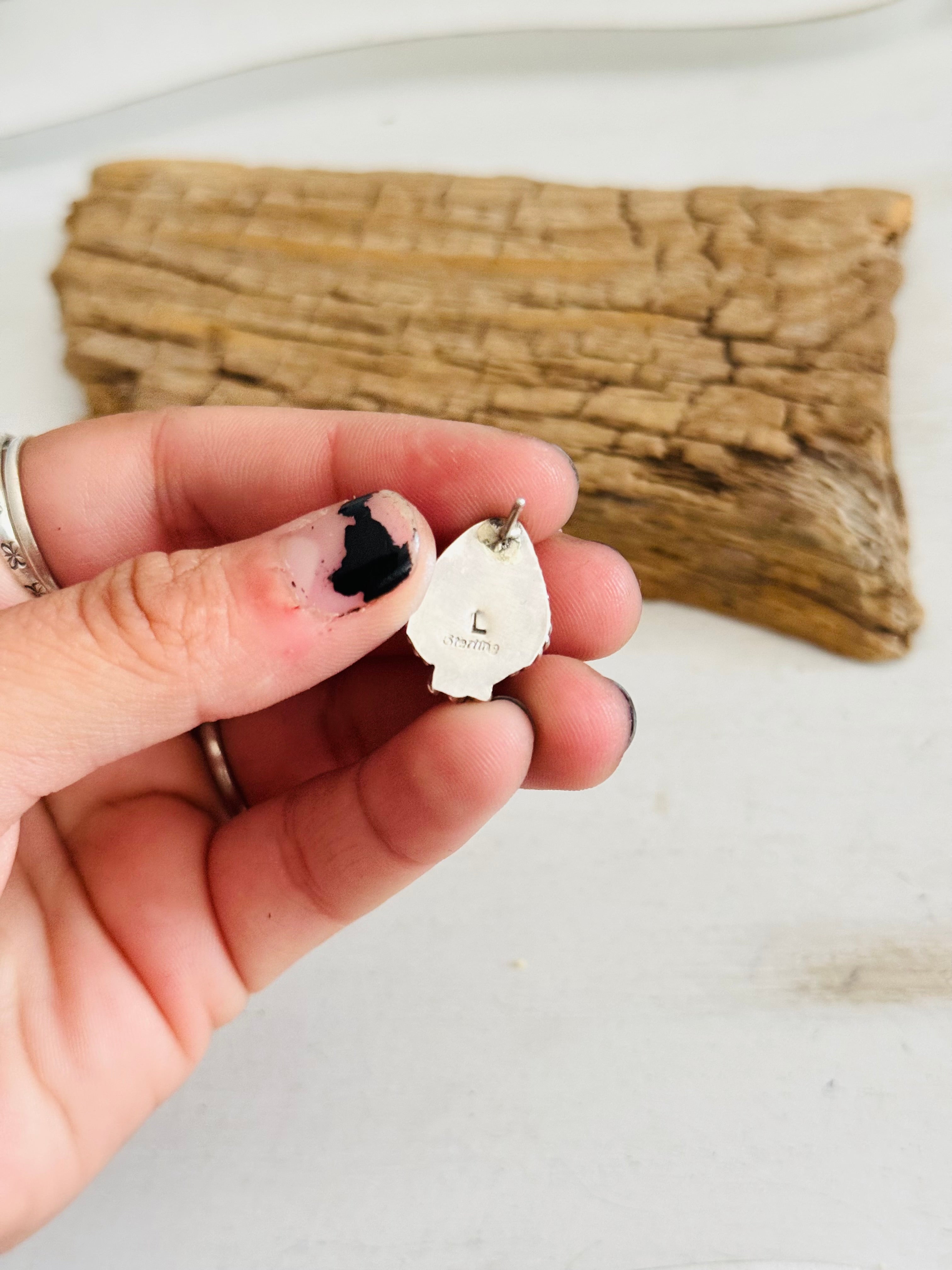 Trish Largo Purple Mohave Composite & Sterling Silver Post Earrings. It measures 3/4 of an inch long and just over 1/2 of an inch wide. Signed by the artist and stamped sterling silver.