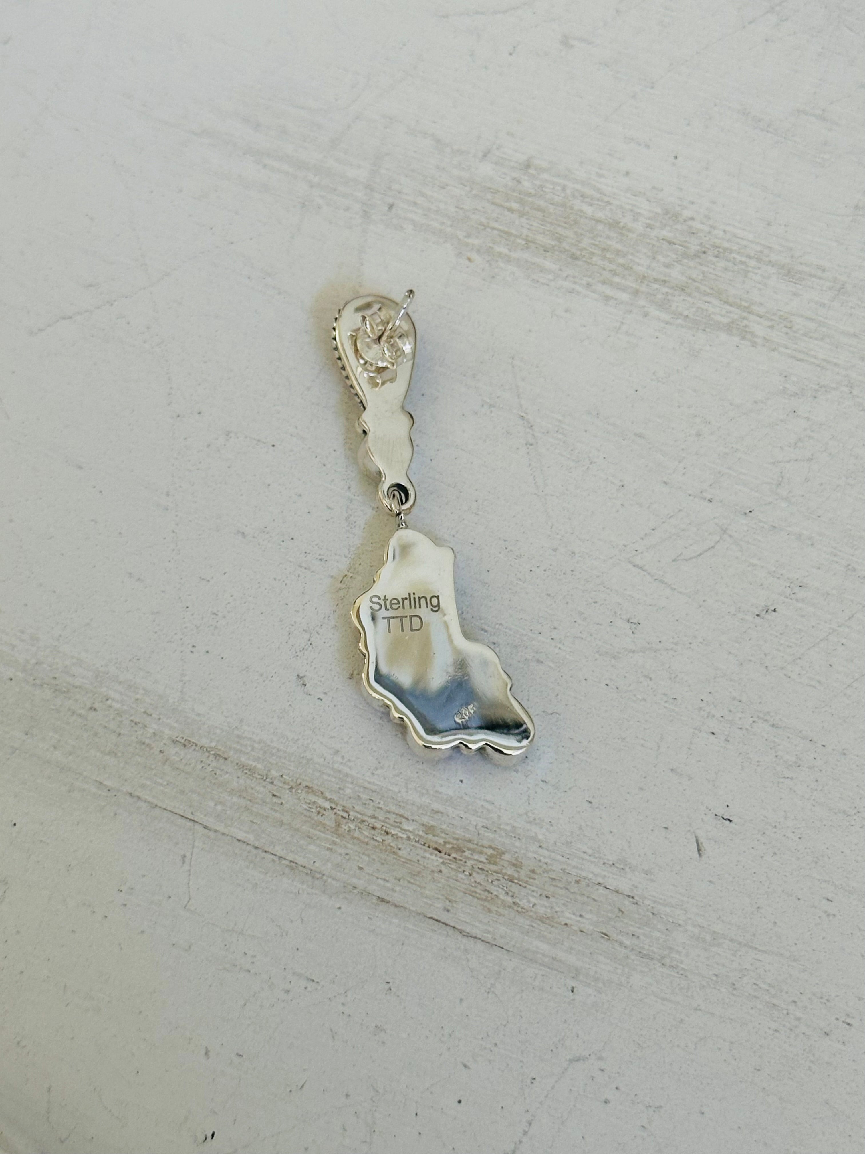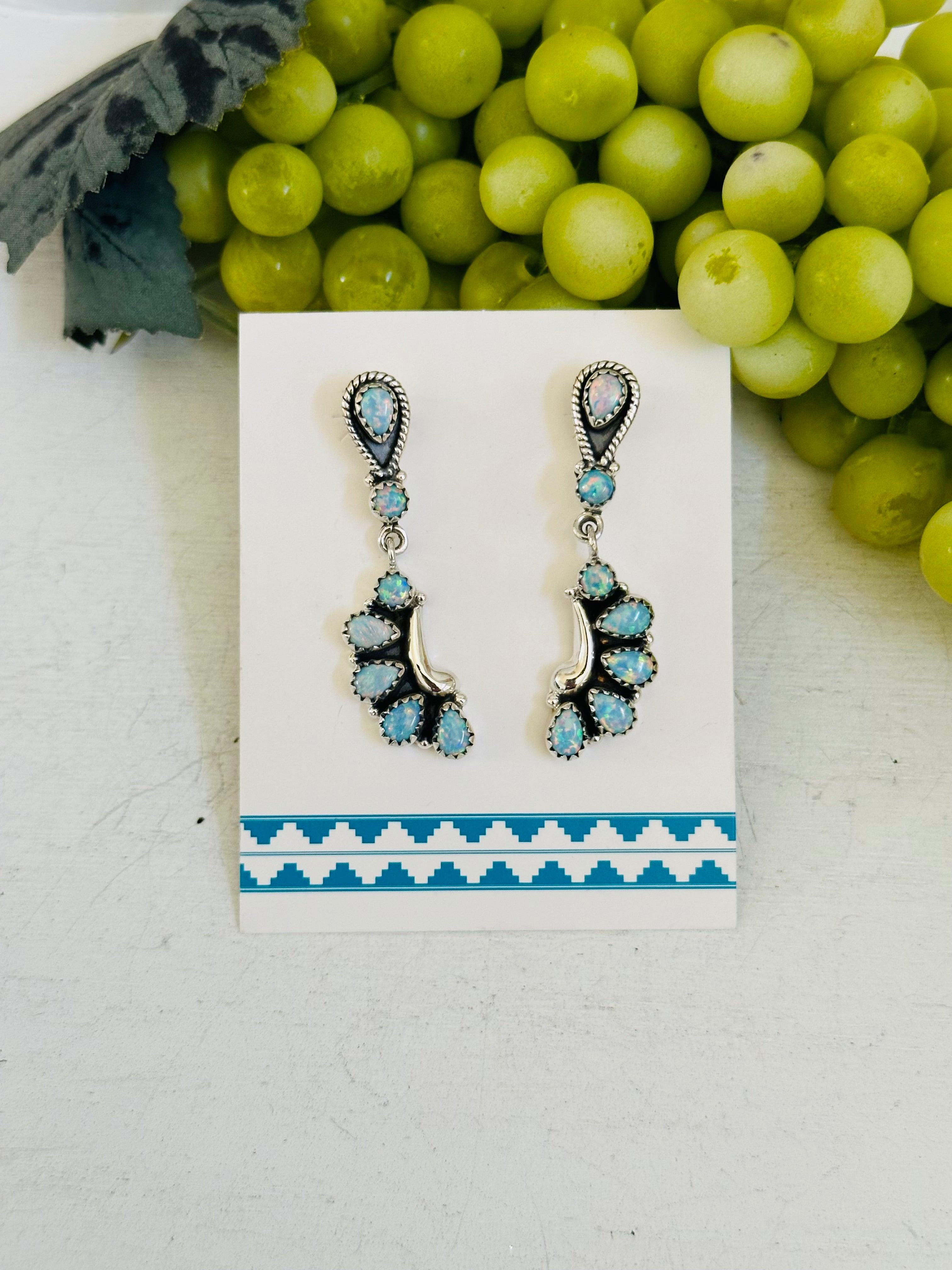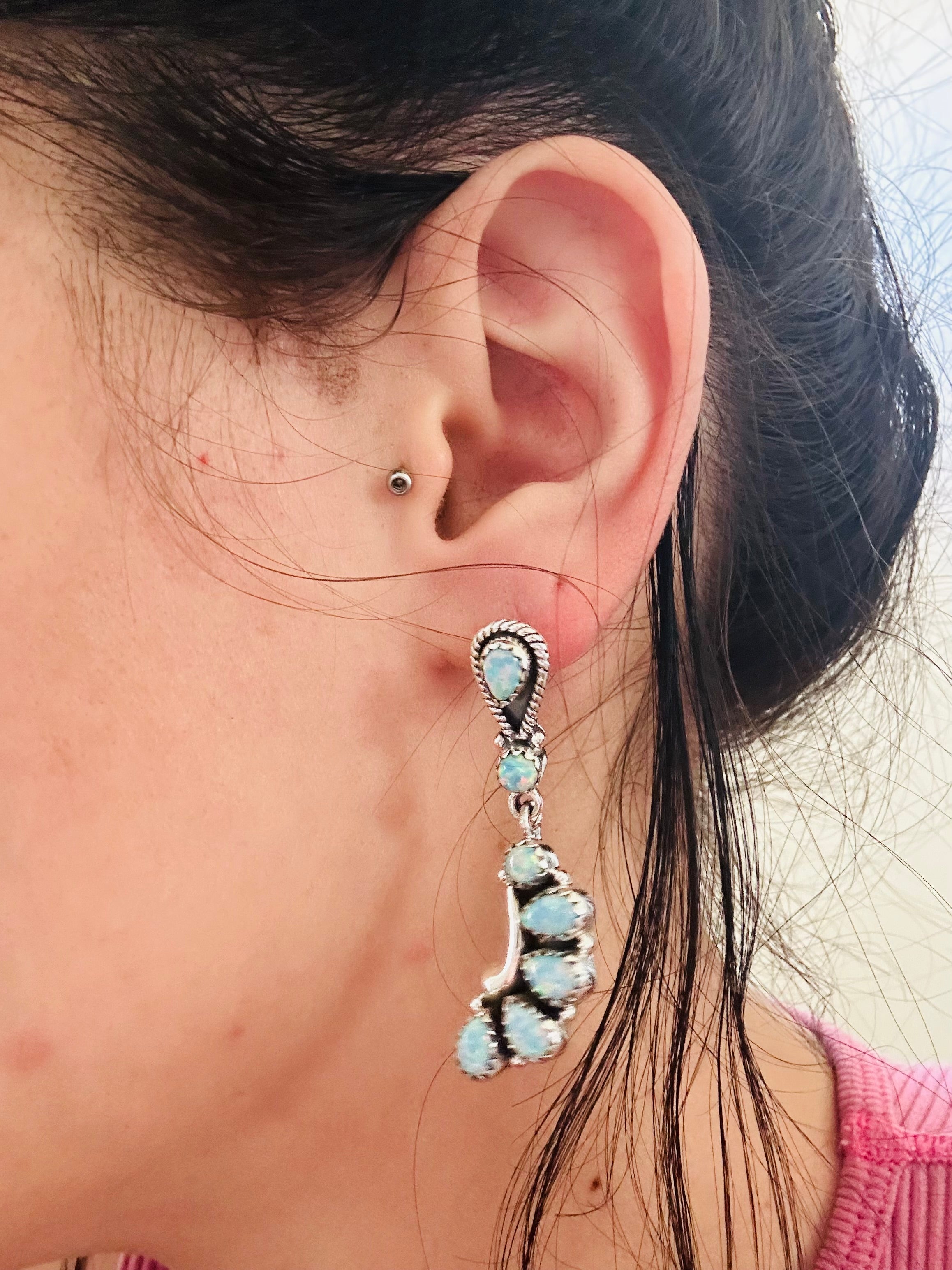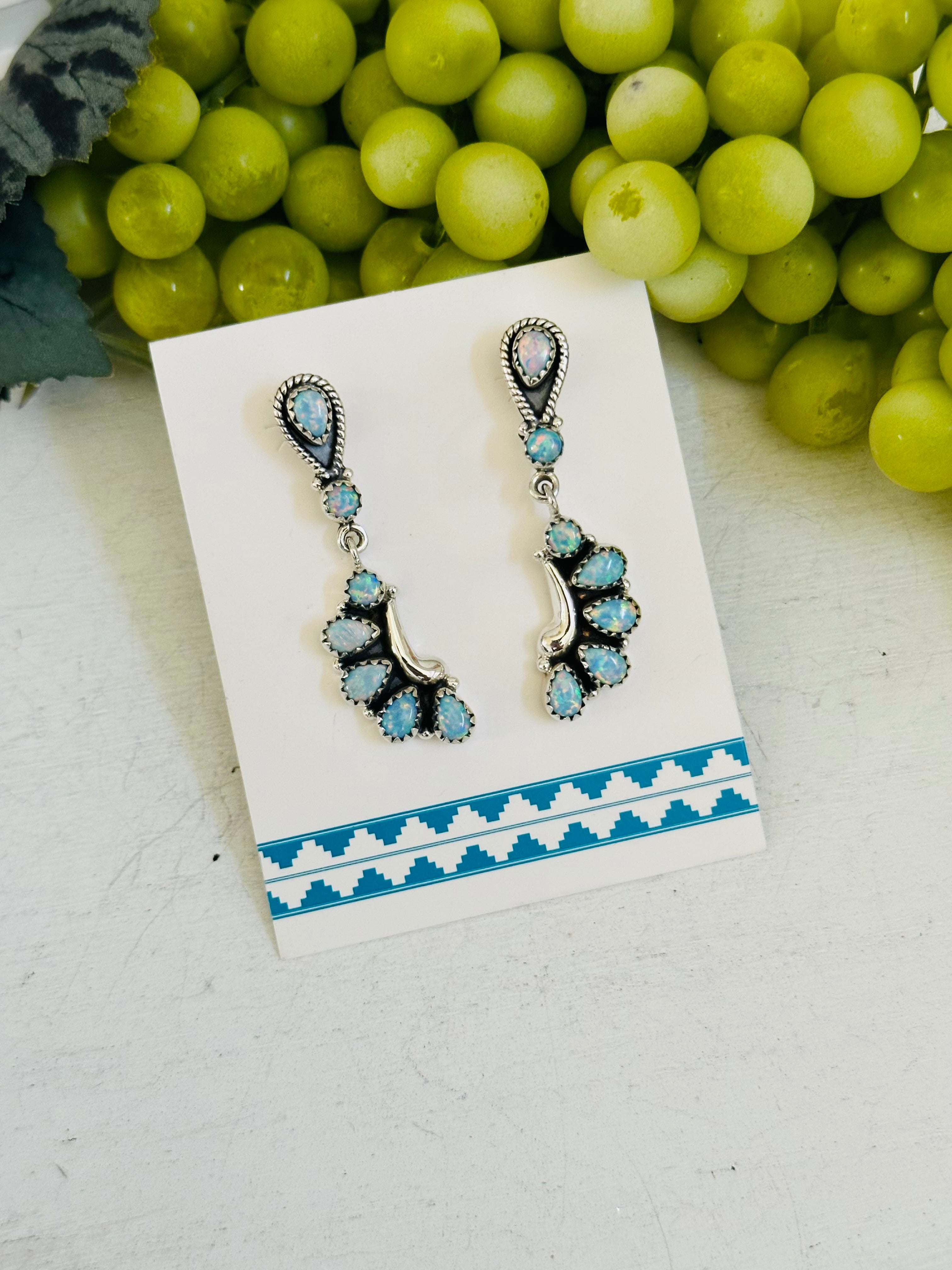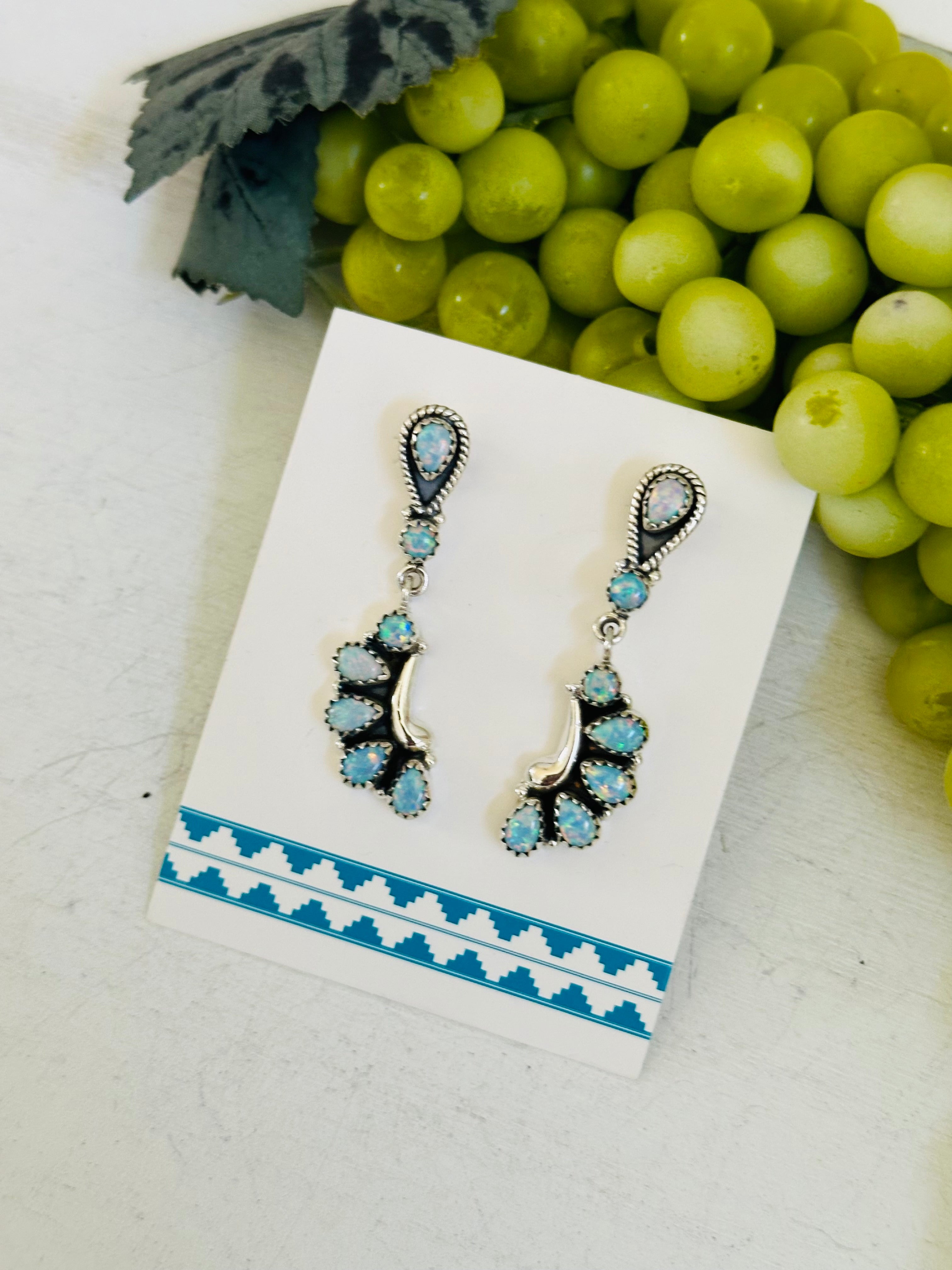 Breathtaking earrings. Southwest Handmade Opal & Sterling Silver Post Dangle Earrings. It measures 1 7/8 inches long and 1/2 of an inch wide. Signed by the artist and stamped sterling silver.