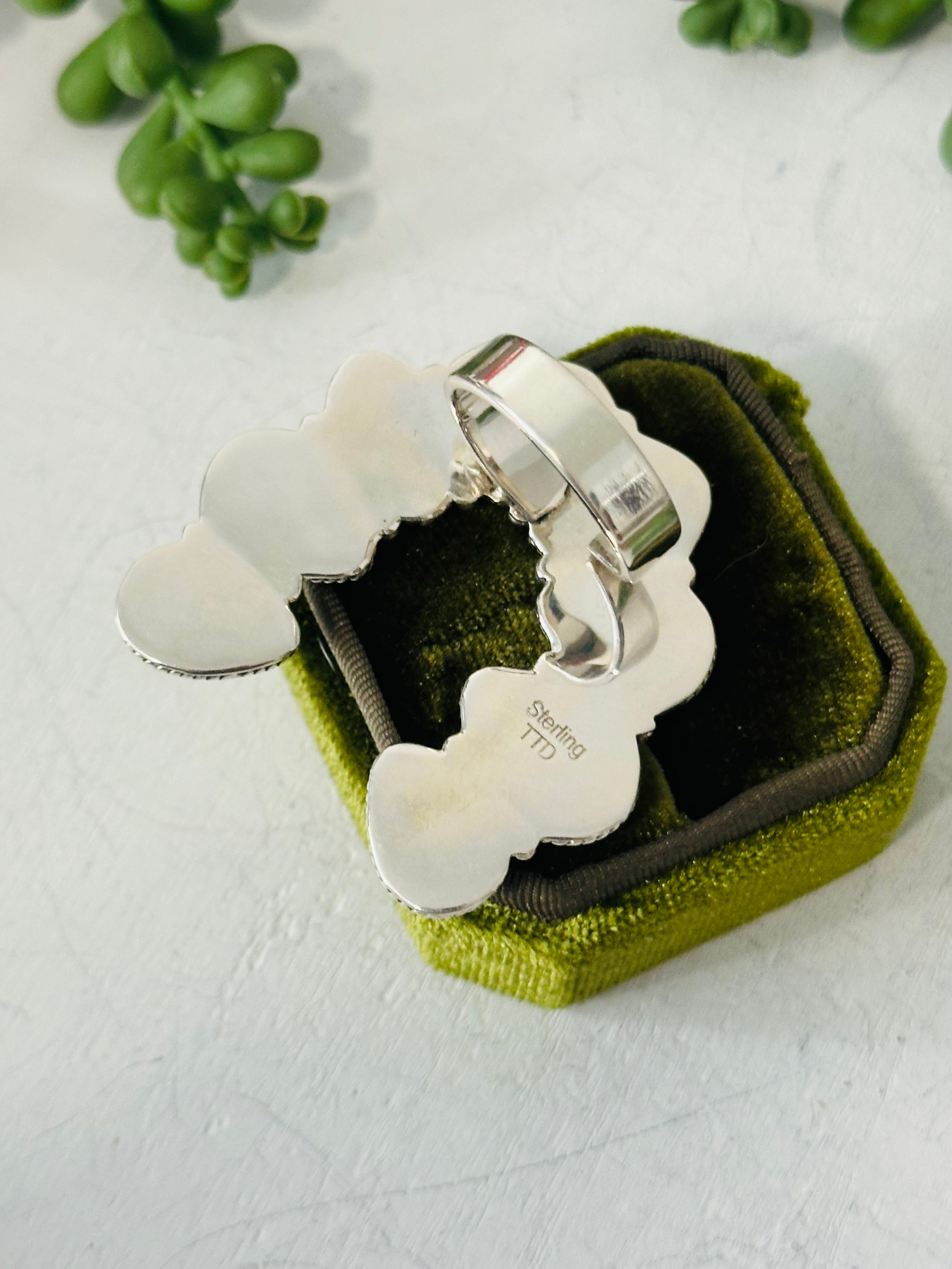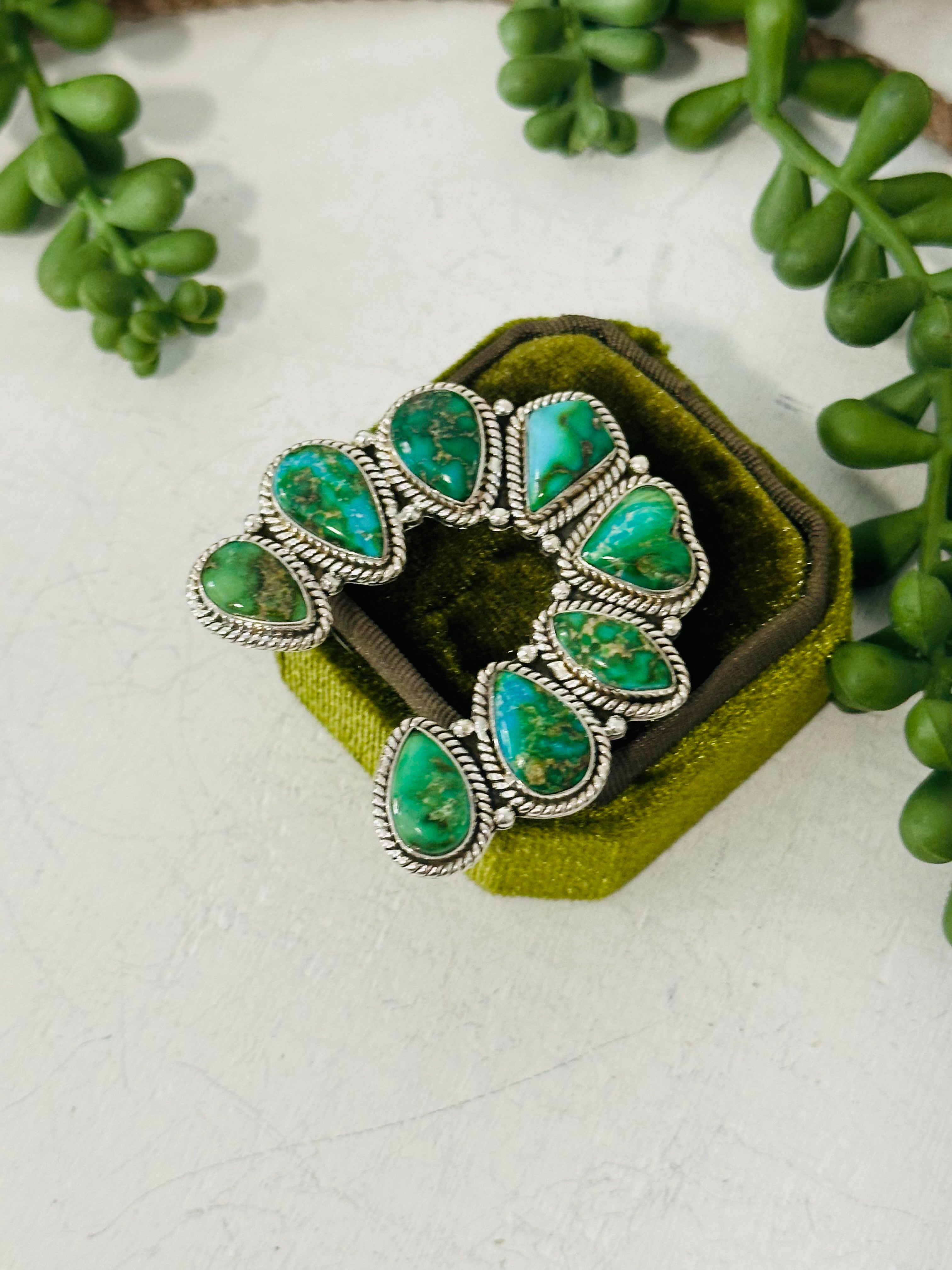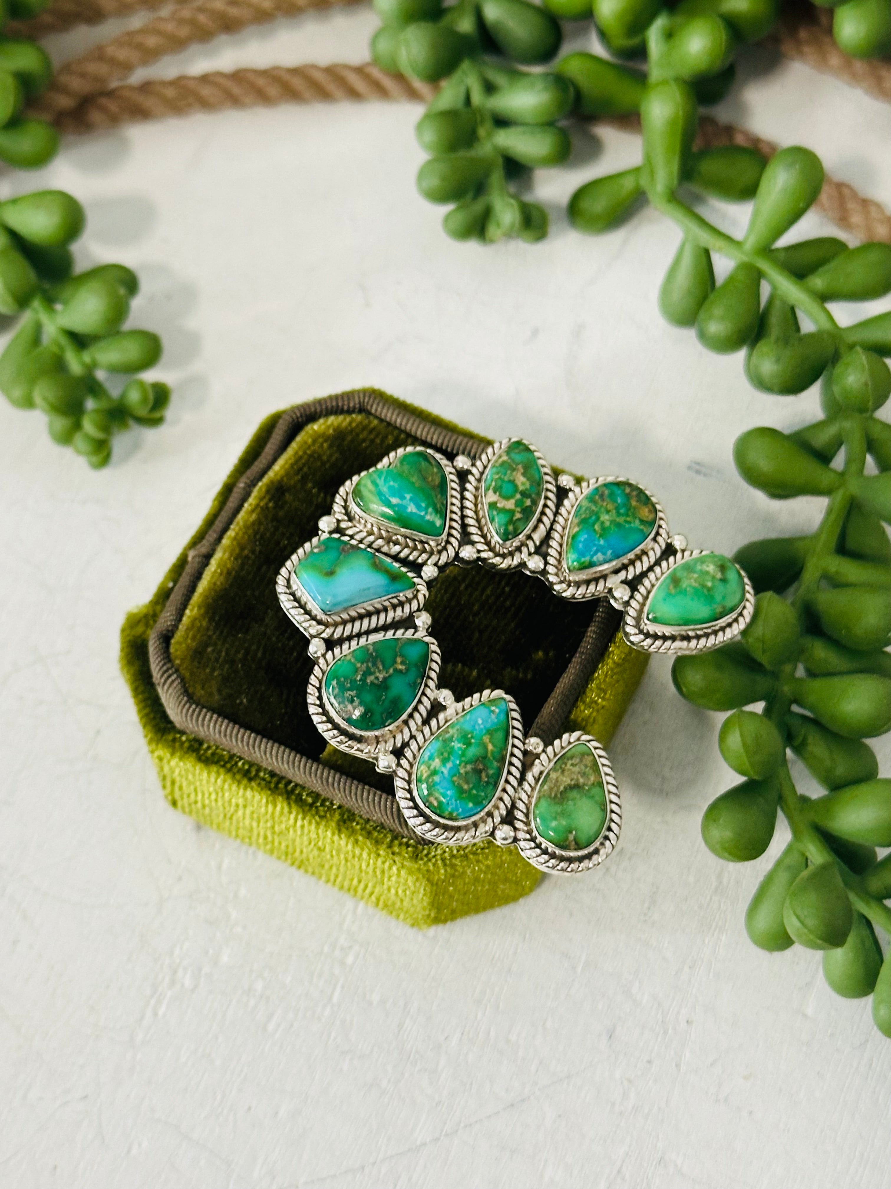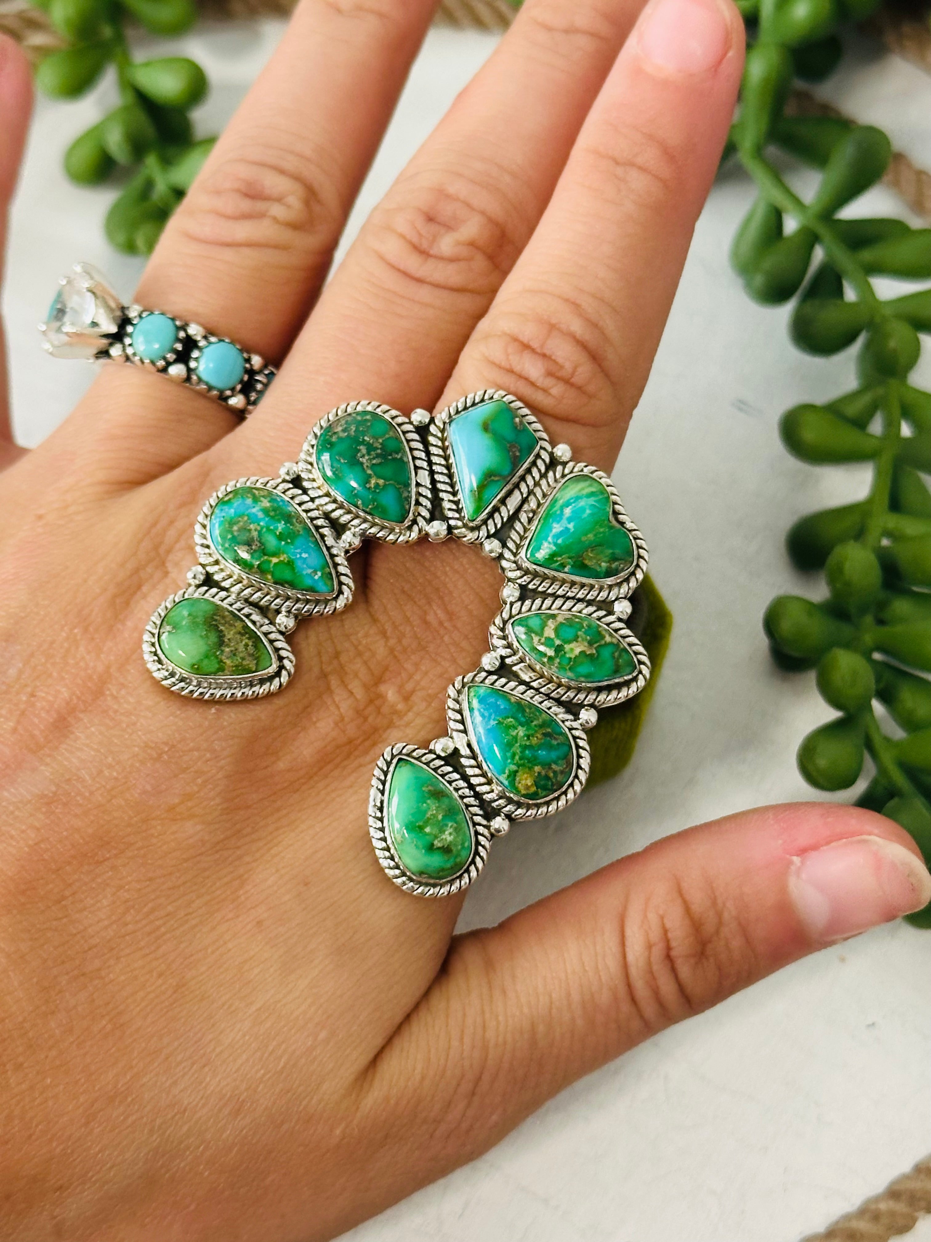 Beautiful naja ring. Southwest Handmade Sonoran Mountain Turquoise & Sterling Silver Adjustable Cluster Naja Ring. It measures 1 3/4 inches long and 1 5/8 inches wide. Signed by the artist and stamped sterling silver.