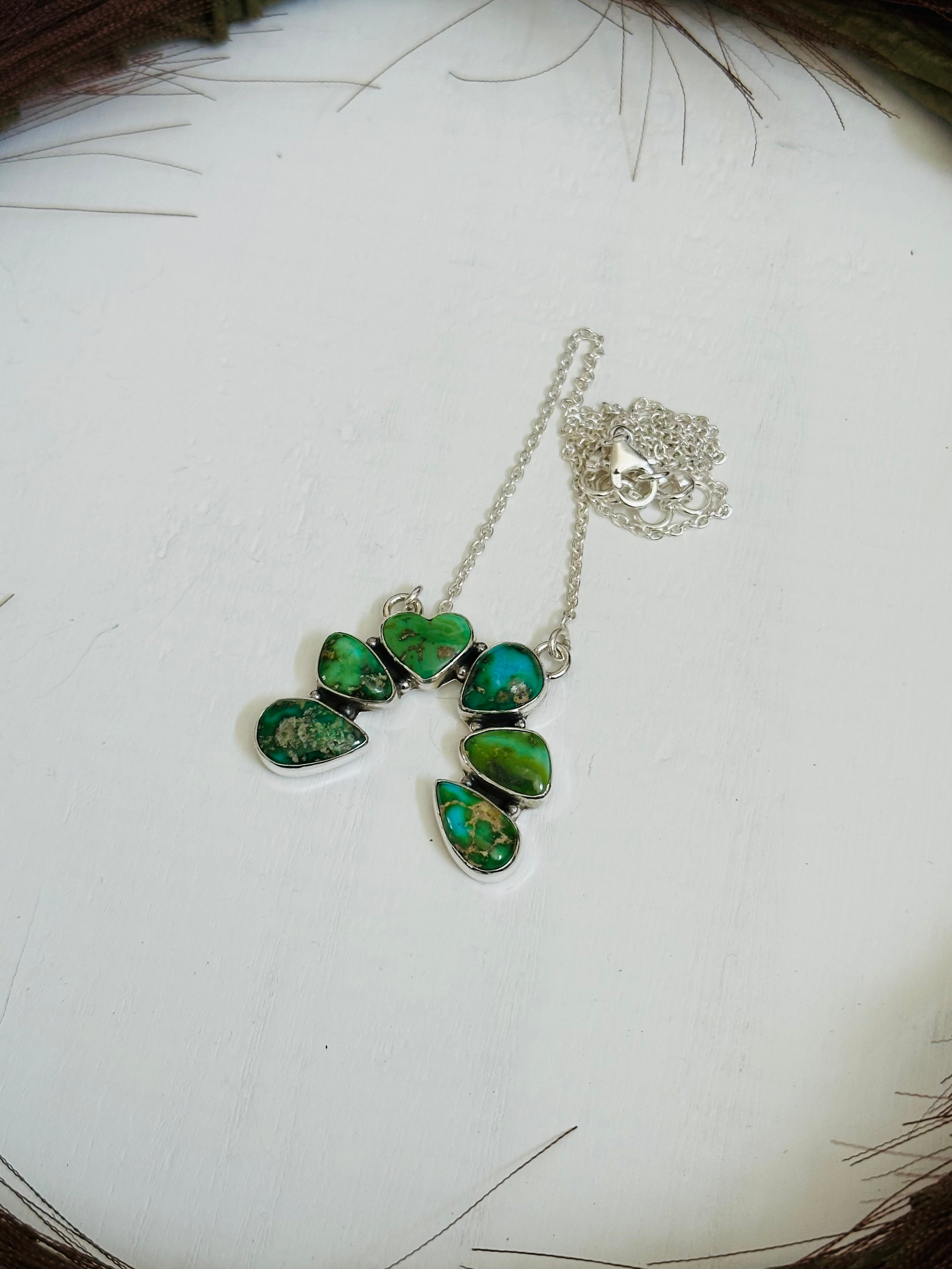Beautiful necklace. Southwest Handmade Sonoran Mountain Turquoise & Sterling Silver Cluster Naja Necklace. It measures 19 inches long with hang while the chain by itself measures 17 inches long but can be adjusted down to 16 inches long. Signed by the artist and stamped sterling silver.