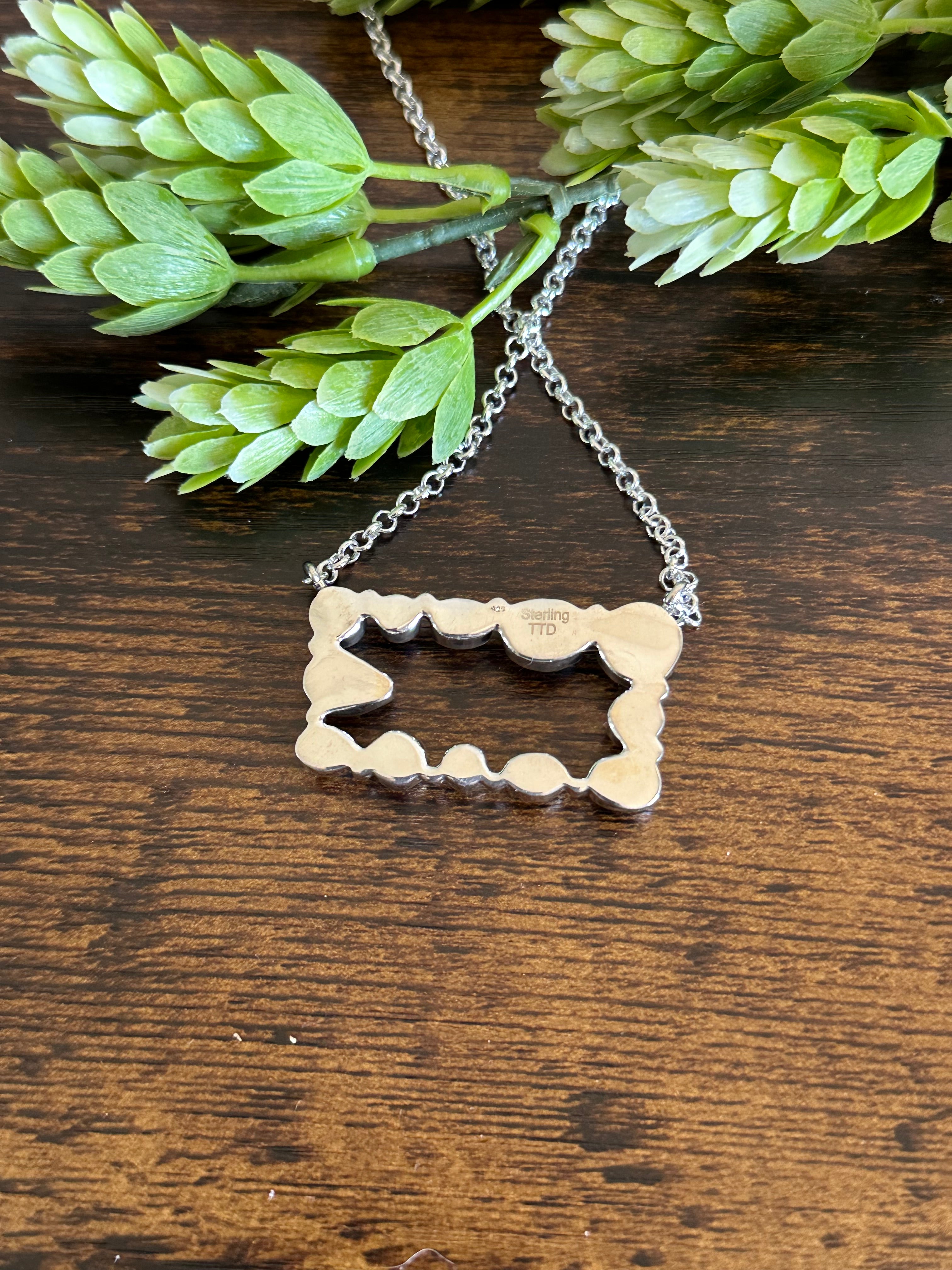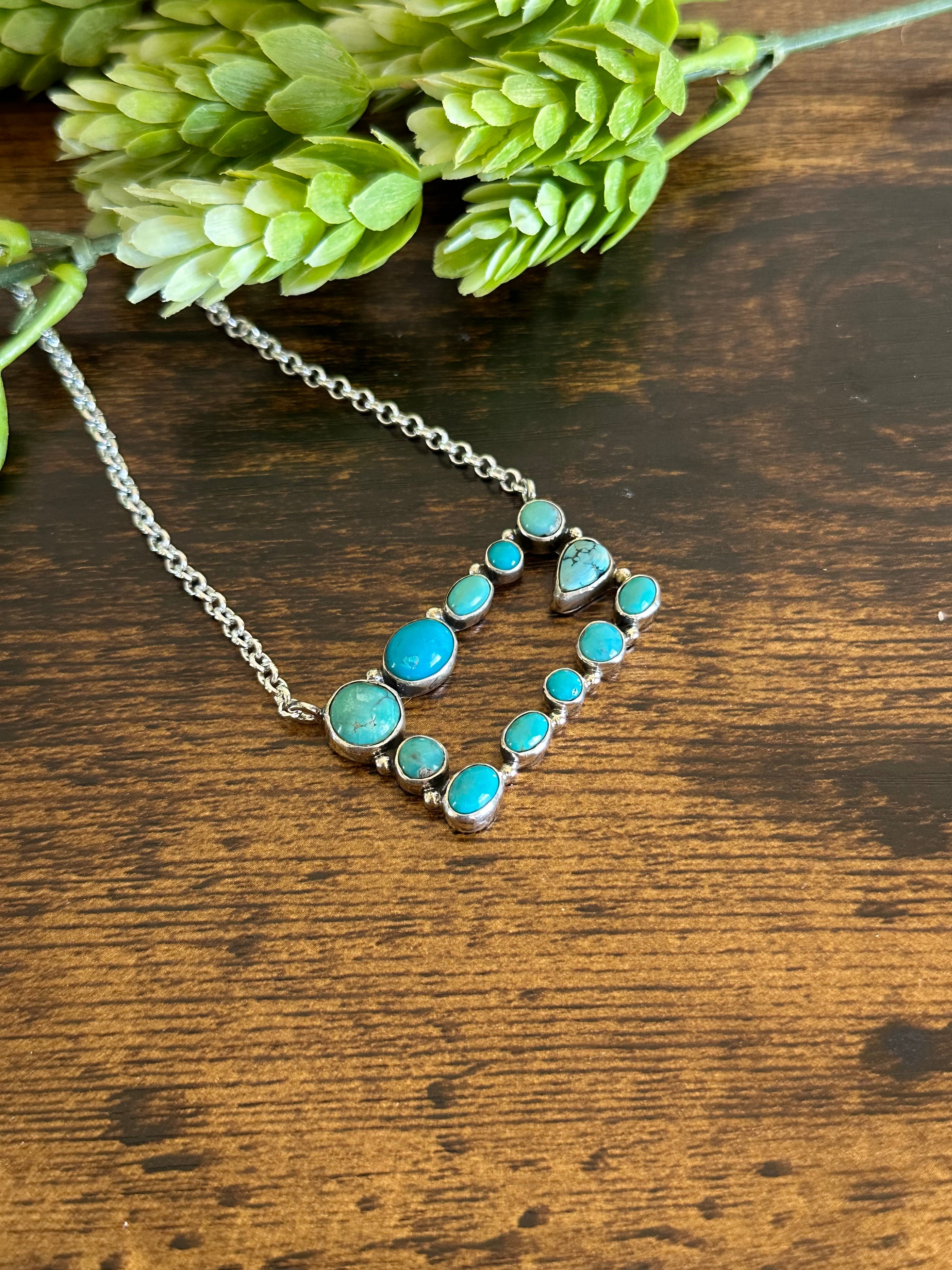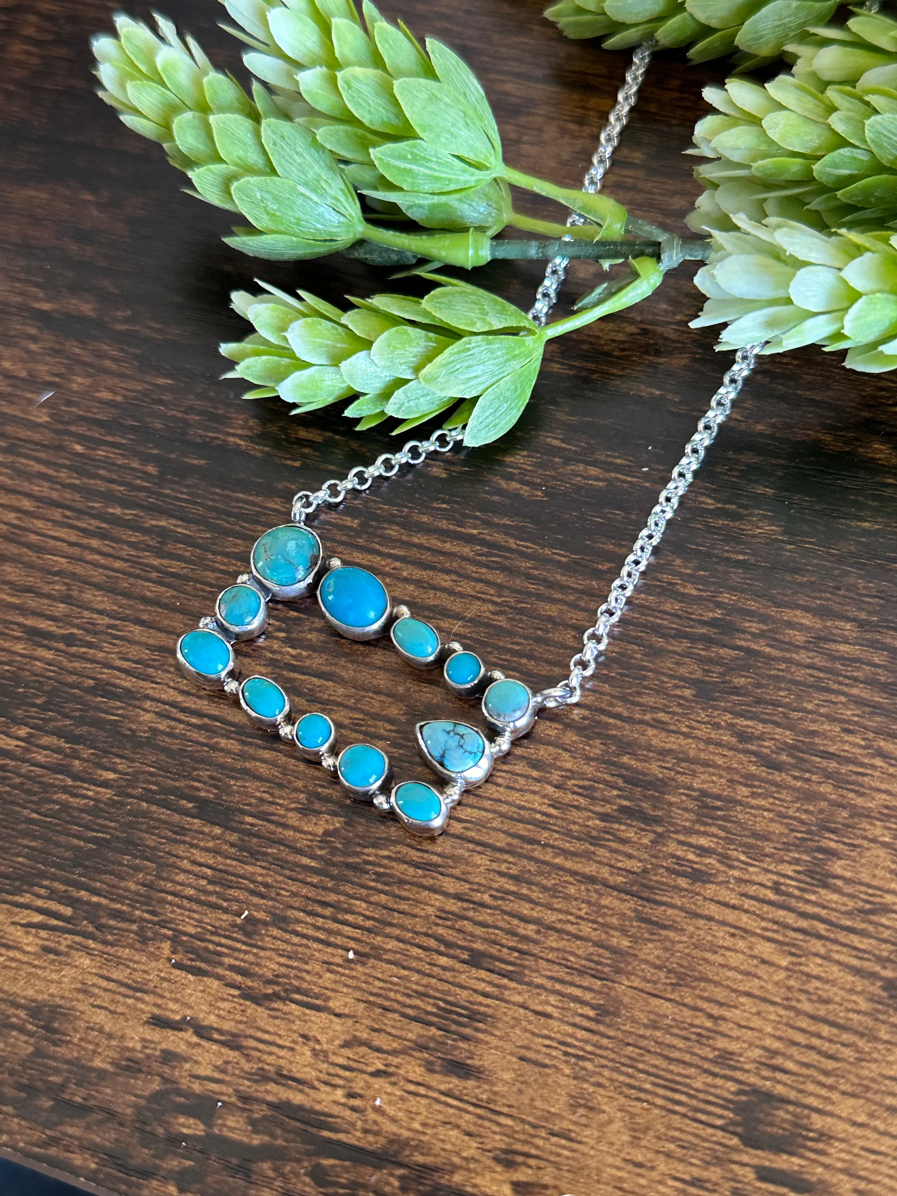 Beautiful necklace, great sterling around stone. Southwest Handmade Kingman Turquoise & Sterling Silver Cluster Necklace. It measures 20 inches long with hang while the chain by itself measures 17 inches long but can adjust down to 15 inches long. Signed by the artist and stamped sterling silver. Stones will differ in shape and color due to natural stones.