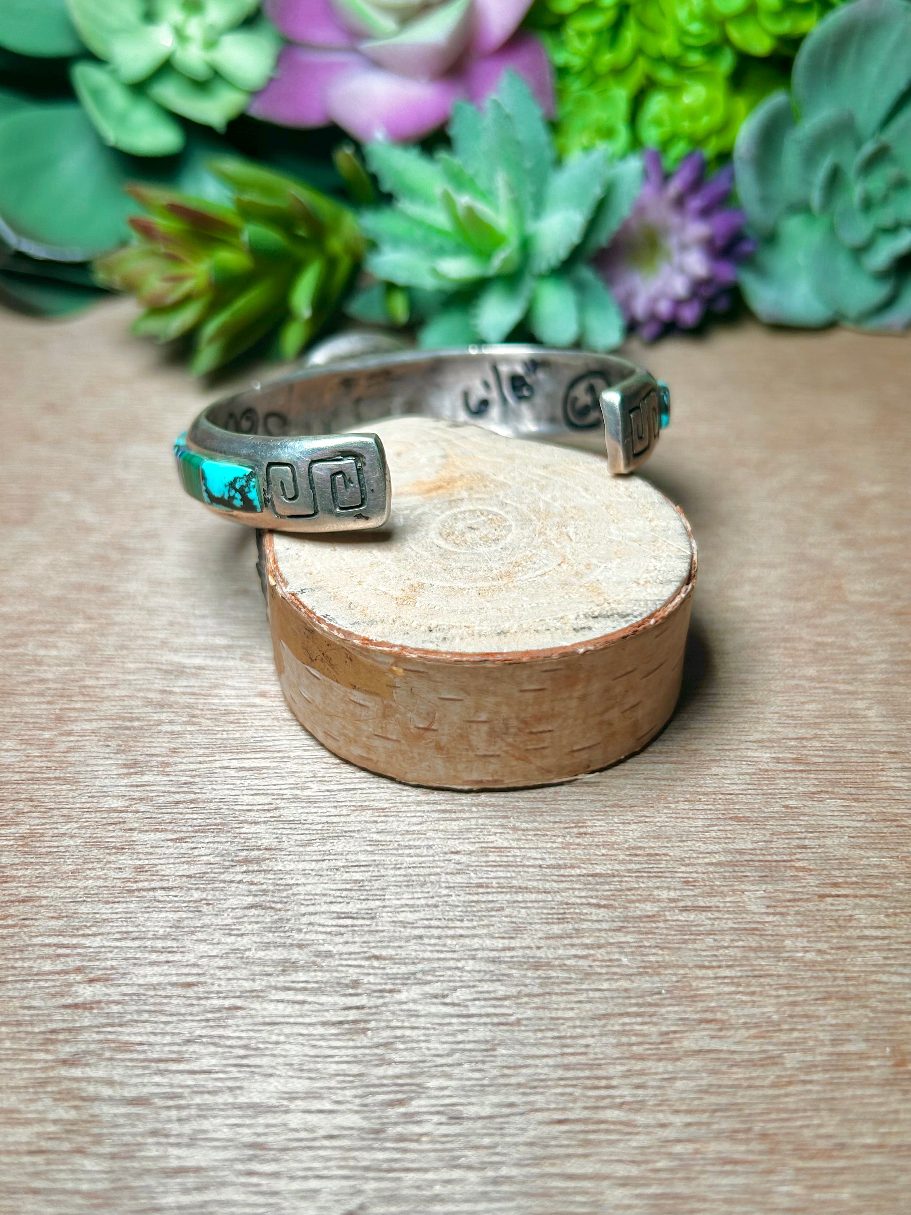 Vintage Navajo Multi Stone & Sterling Silver Cuff Bracelet. It measures 7/8 of an inch wide with an inside circumference of 5 1/8 inches and a gap of 1 1/8 inches. Signed by the artist and stamped sterling silver.
