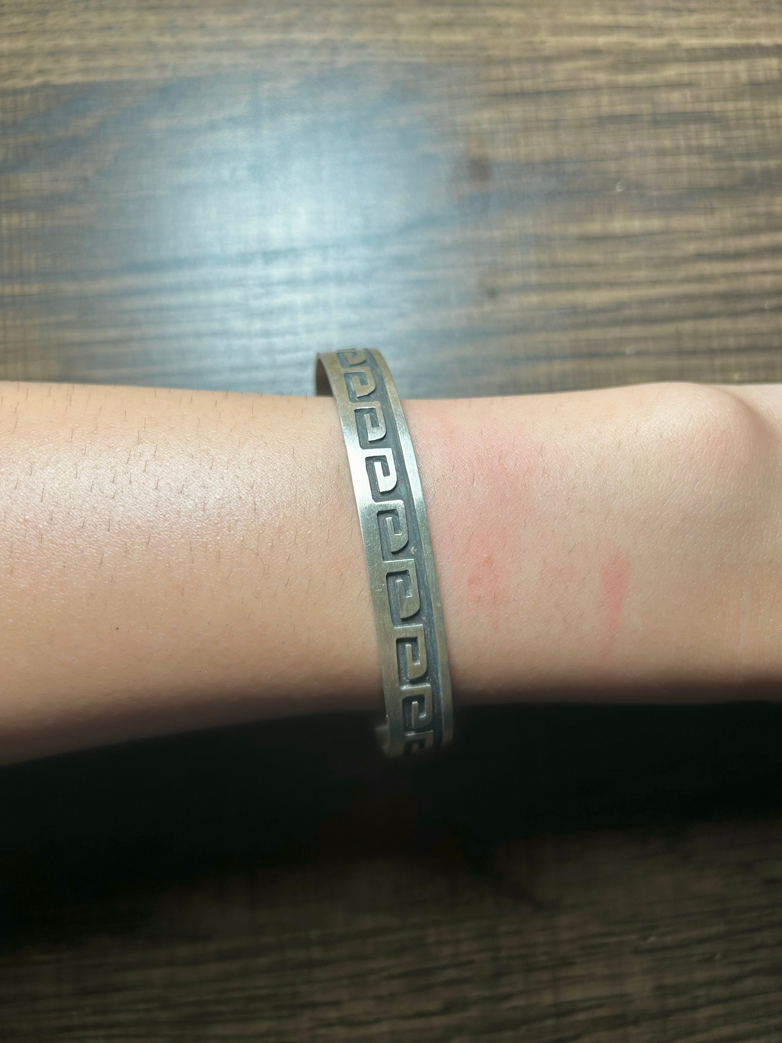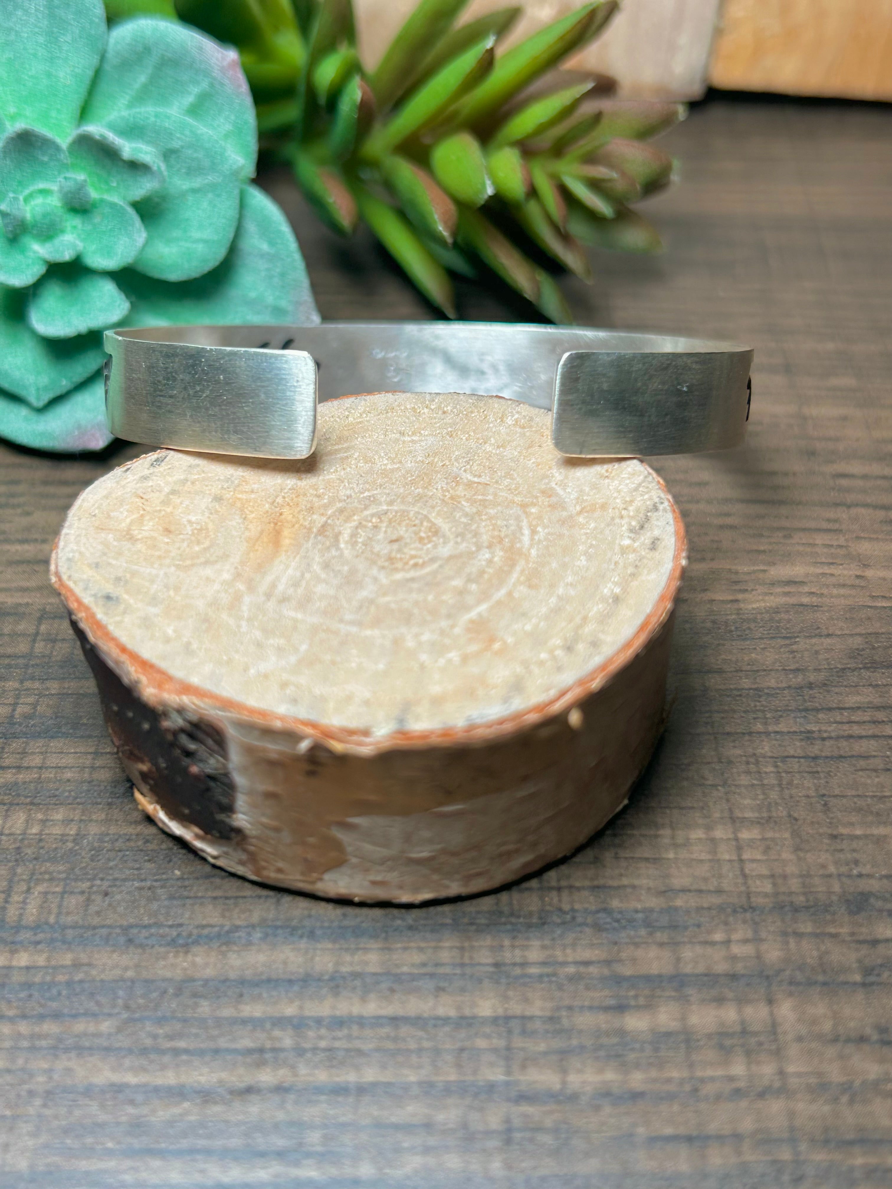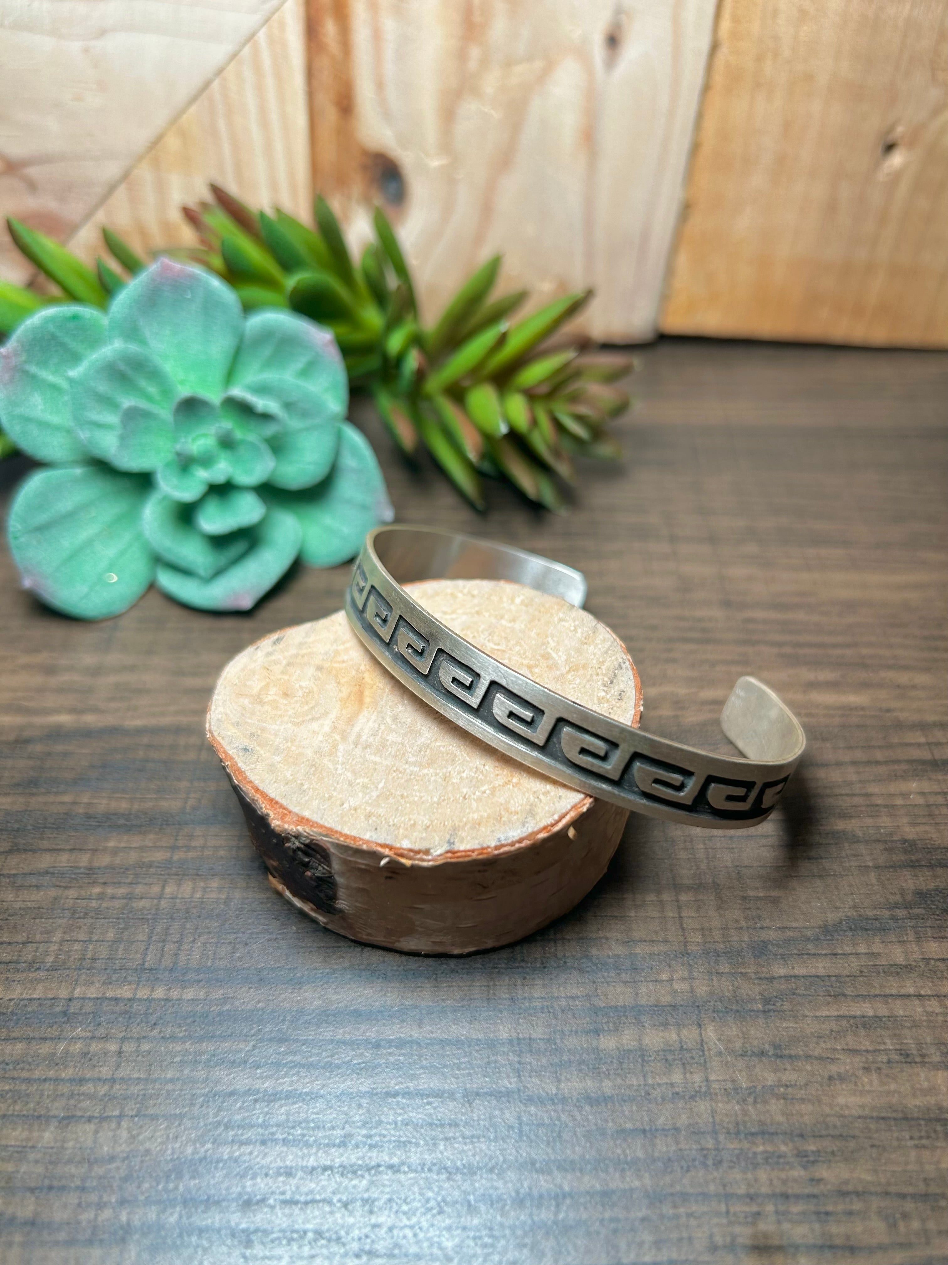 Navajo Made Sterling Silver Cuff Bracelet. It measures 3/8 of an inch wide with an inside circumference of 5 7/8 inches and a gap of 1 1/8 inches. Signed by the artist and stamped sterling silver.