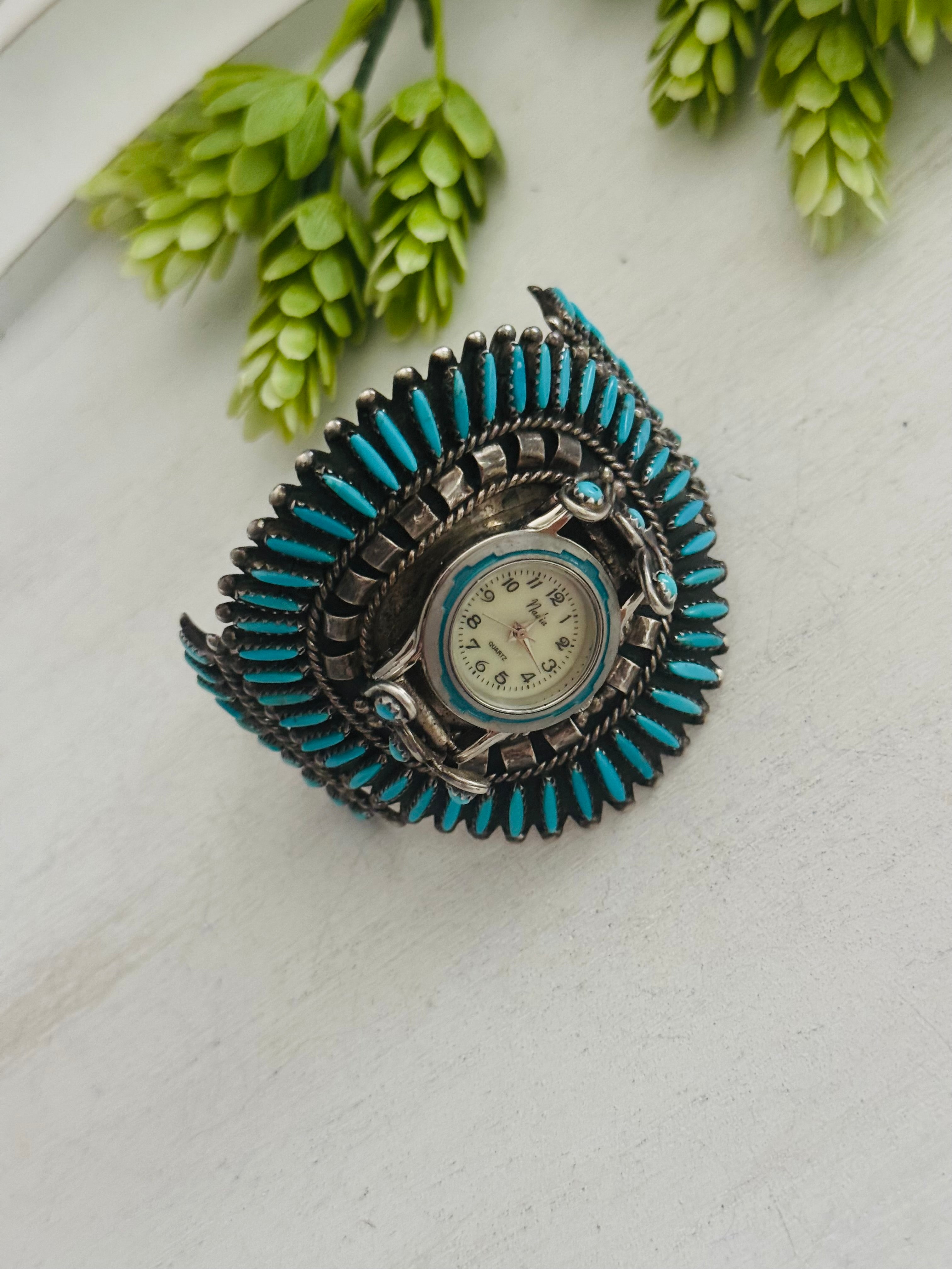 Vintage Zuni Made Kingman Turquoise & Sterling Silver Cluster Watch Cuff Bracelet