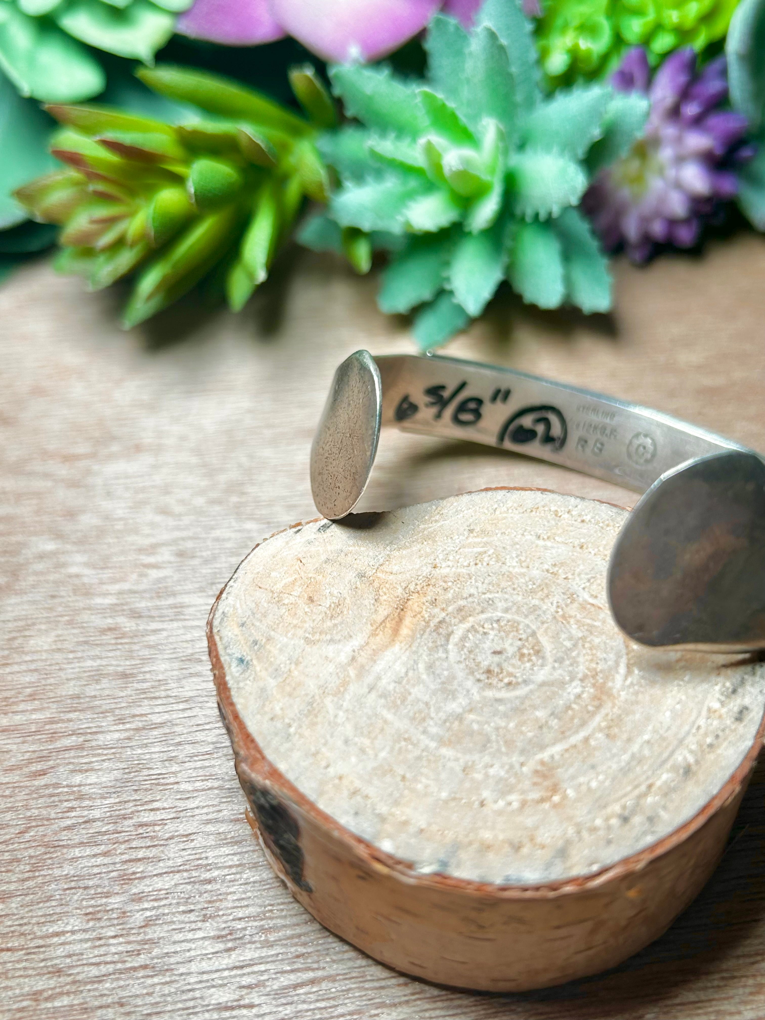 Vintage Navajo Made 14k Gold Fill & Sterling Silver Cuff Bracelet. It measures 3/8 of an inch wide with an inside circumference of 5 5/8 inches and a gap of 1 inch. Signed by the artist and stamped sterling silver.