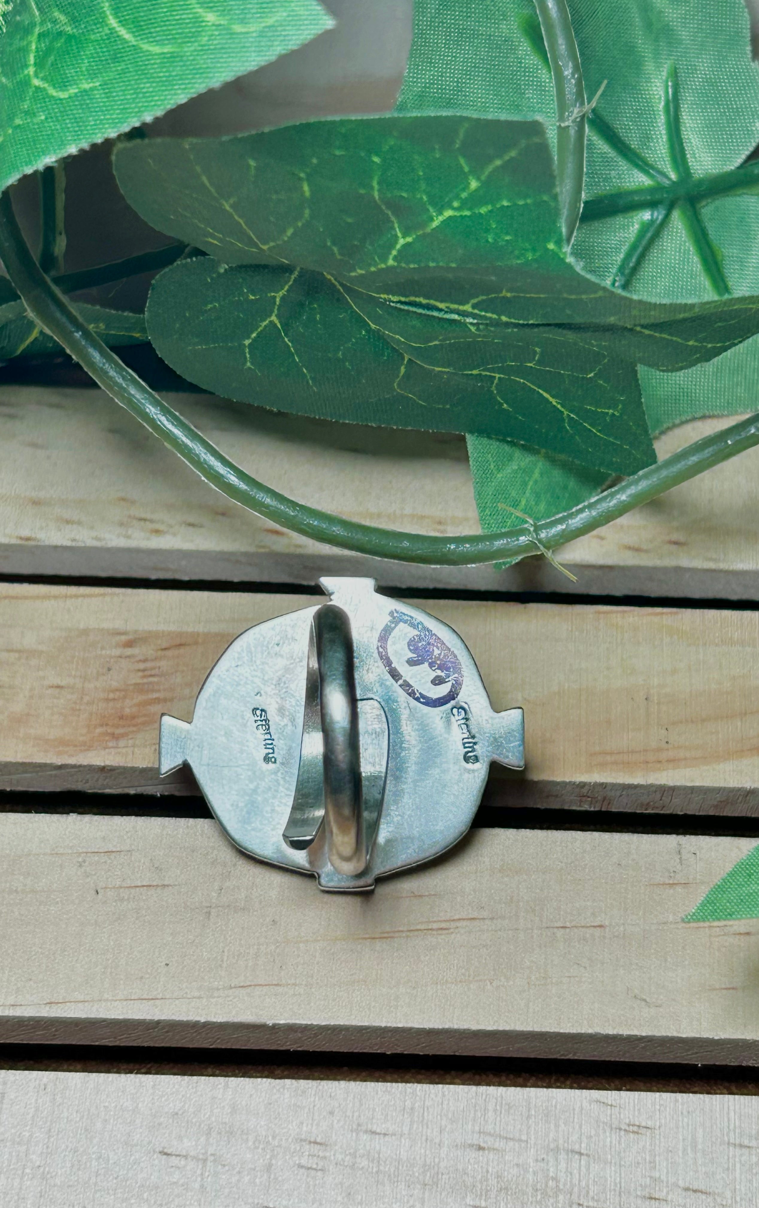 Navajo Made Royston Turquoise & Sterling Sliver Cluster Adjustable Ring. It measures 1 3/8 inches long and 1 1/8 inches wide. Signed by the artist and stamped sterling silver.
