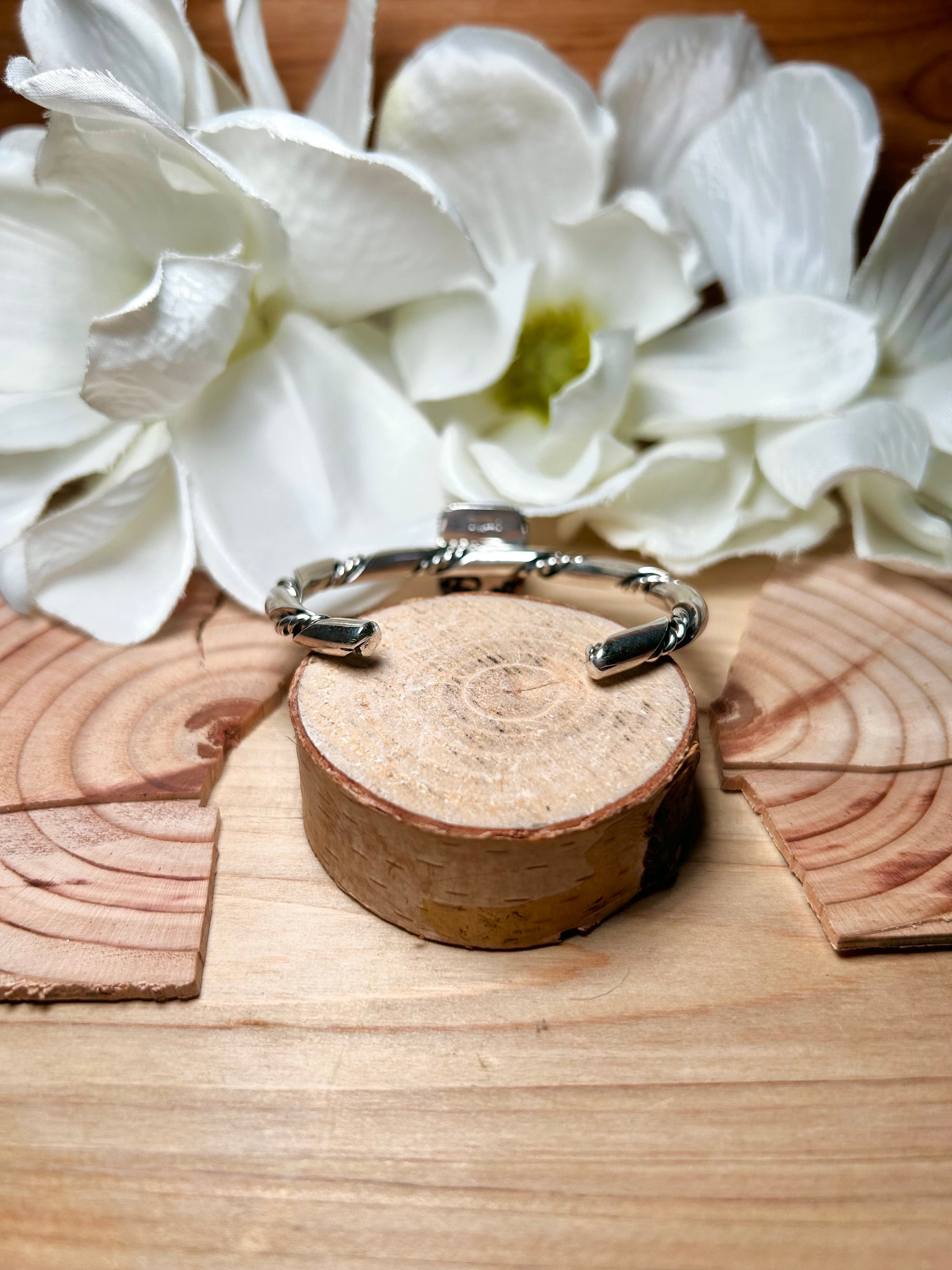 Wydell Billie Kingman Turquoise & Sterling Silver Cuff Bracelet. It measures 3/4 of an inch wide with an inside circumference of 5 1/8 inches and a gap of 1 1/8 inches. Signed by the artist and stamped sterling silver.
