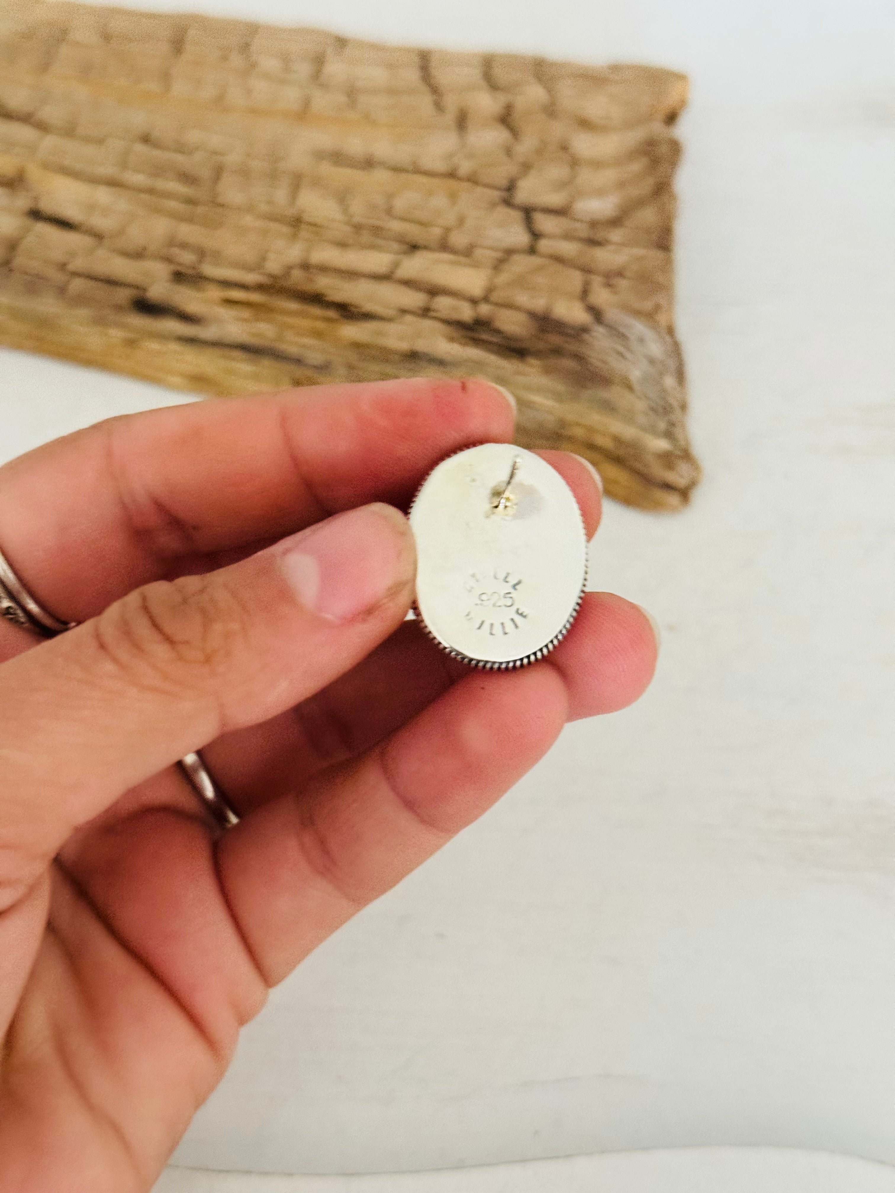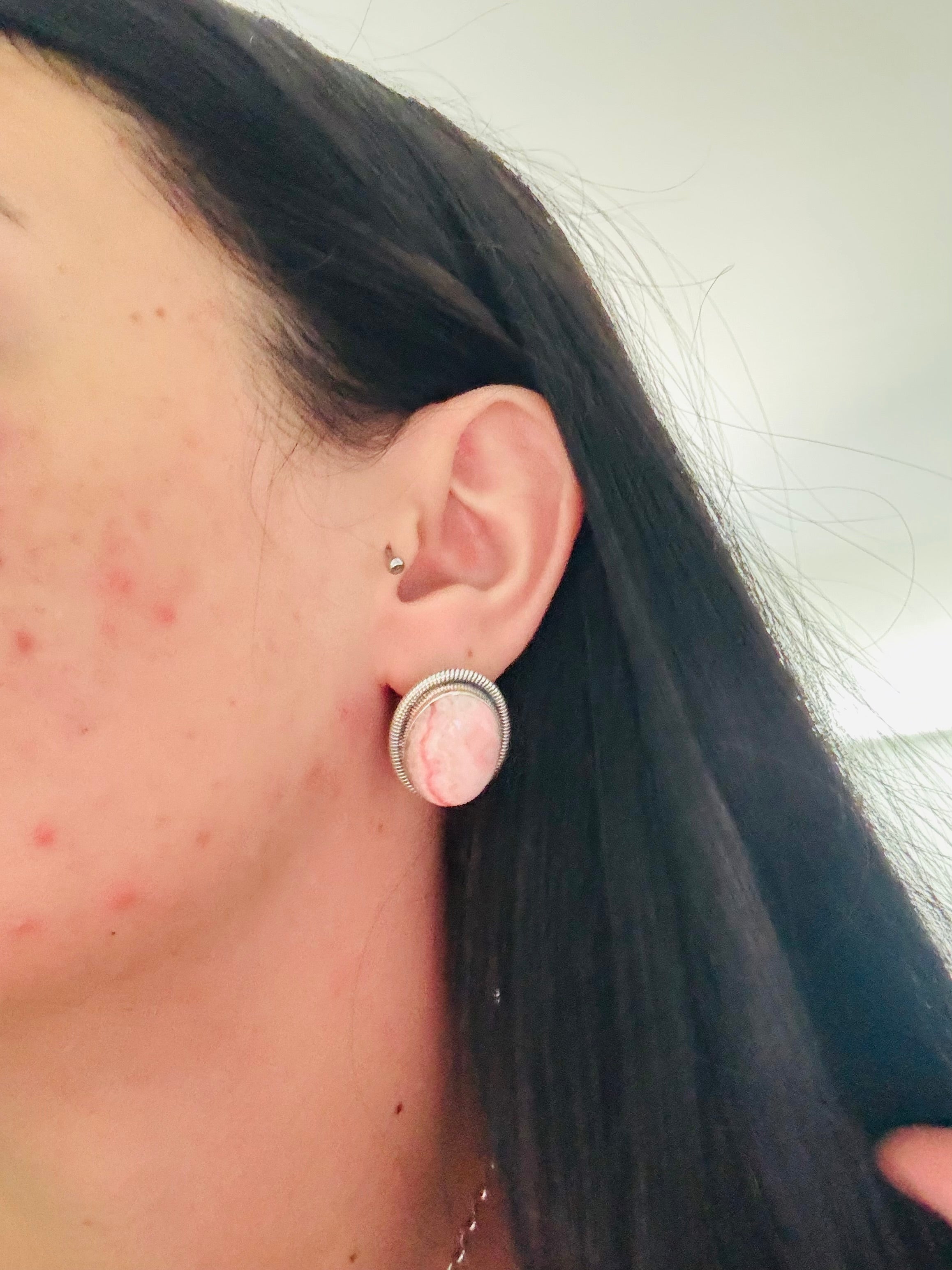 Wydell Billie Rhodochrosite & Sterling Silver Post Earrings. They measure 1 inch long and just over 3/4 of an inch wide. Signed by the artist and stamped sterling silver.