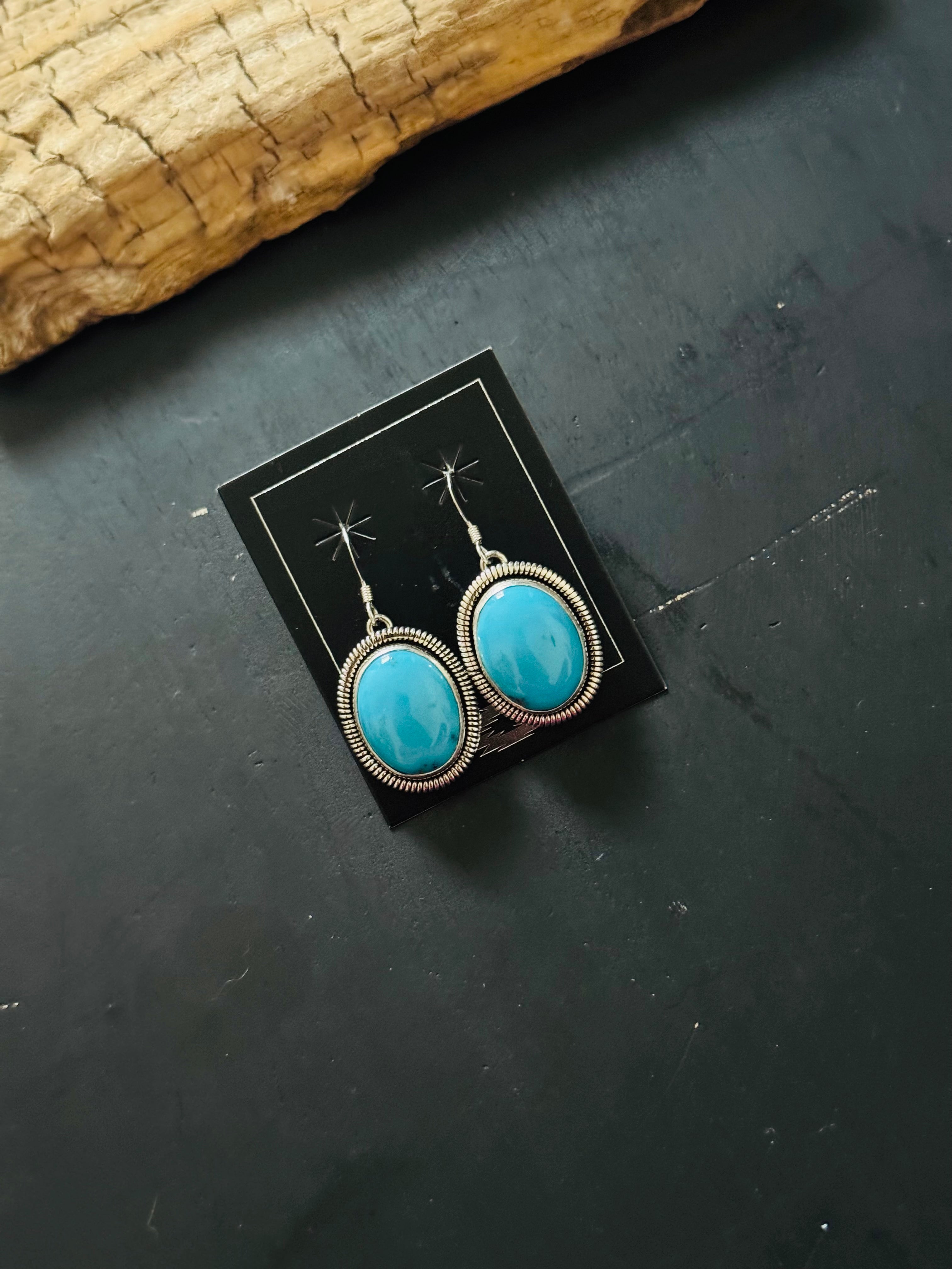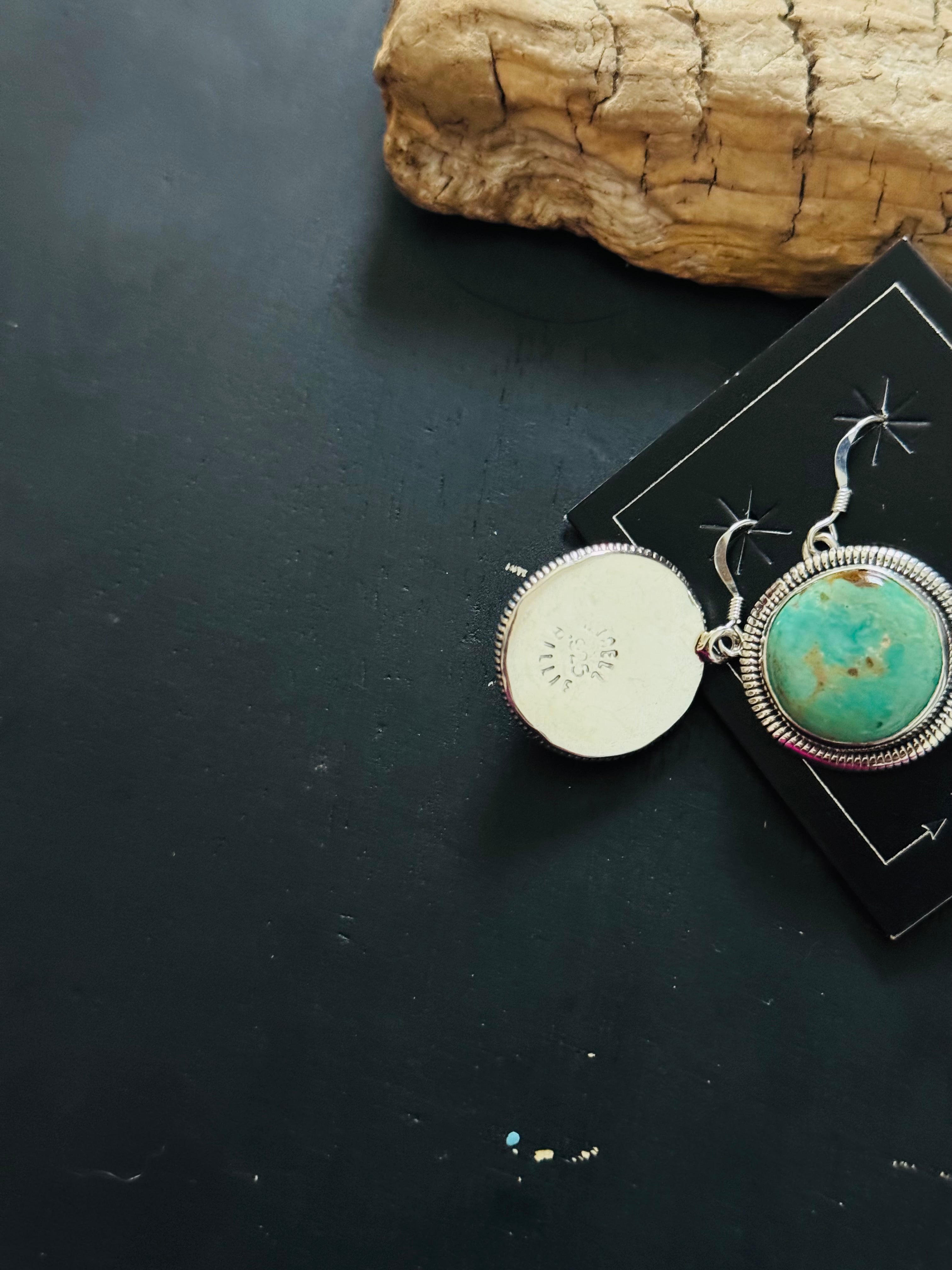 Wydelle Billie Kingman Turquoise & Sterling Silver Dangle Earrings. It measures just over 1 3/8 inches long and 5/8 of an inch wide. Signed by artist and stamped sterling silver.