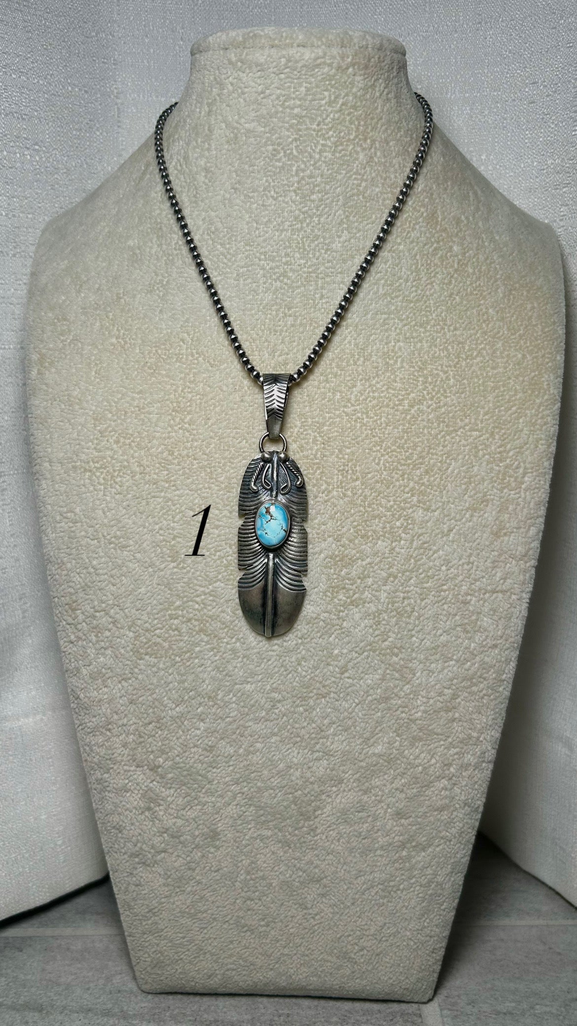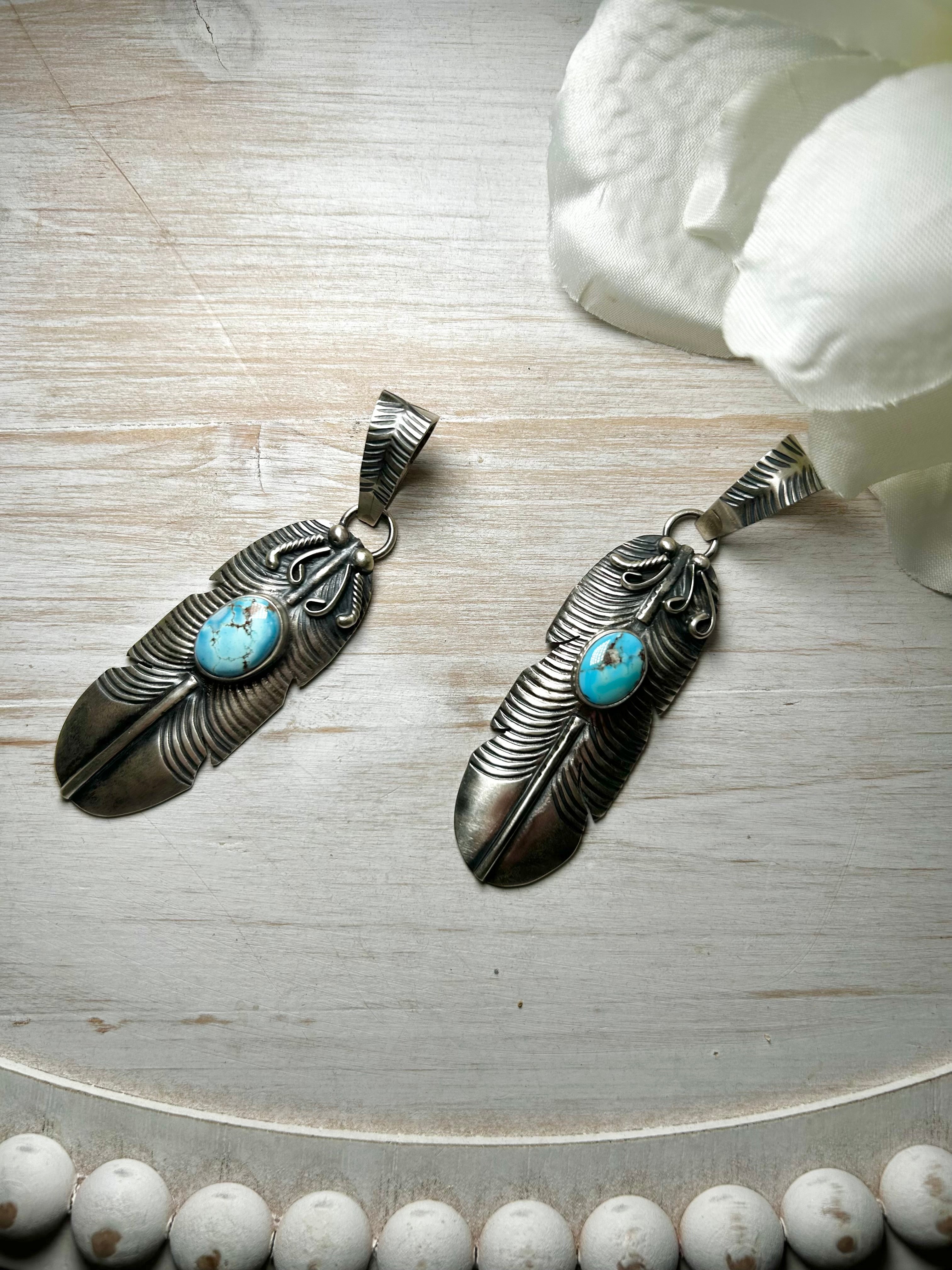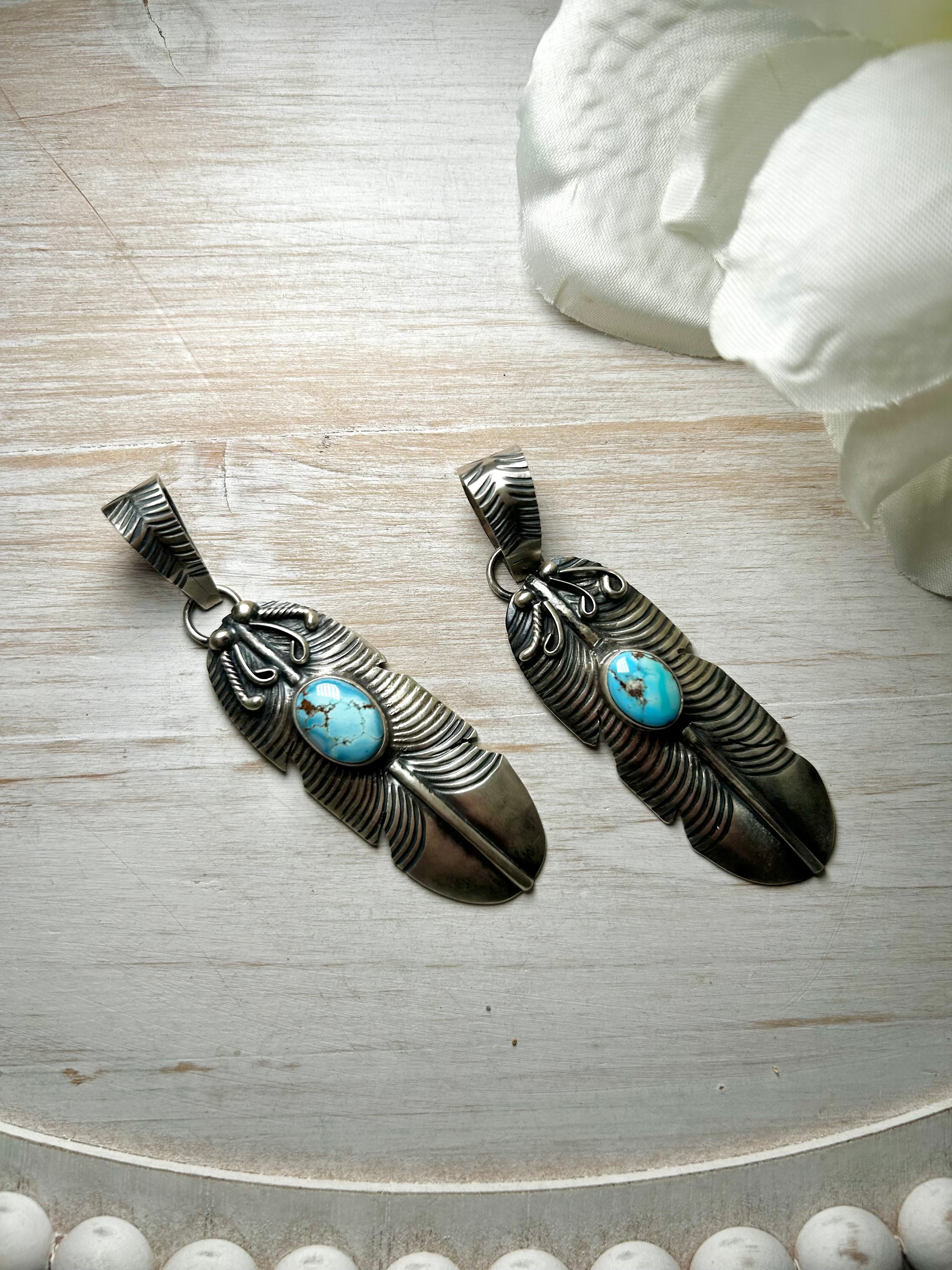 Navajo Made Golden Hill & Sterling Silver Pendant. It measures 3 3/8 inches long and 7/8 of an inch wide. Signed by the artist and stamped sterling silver. Pendant only!