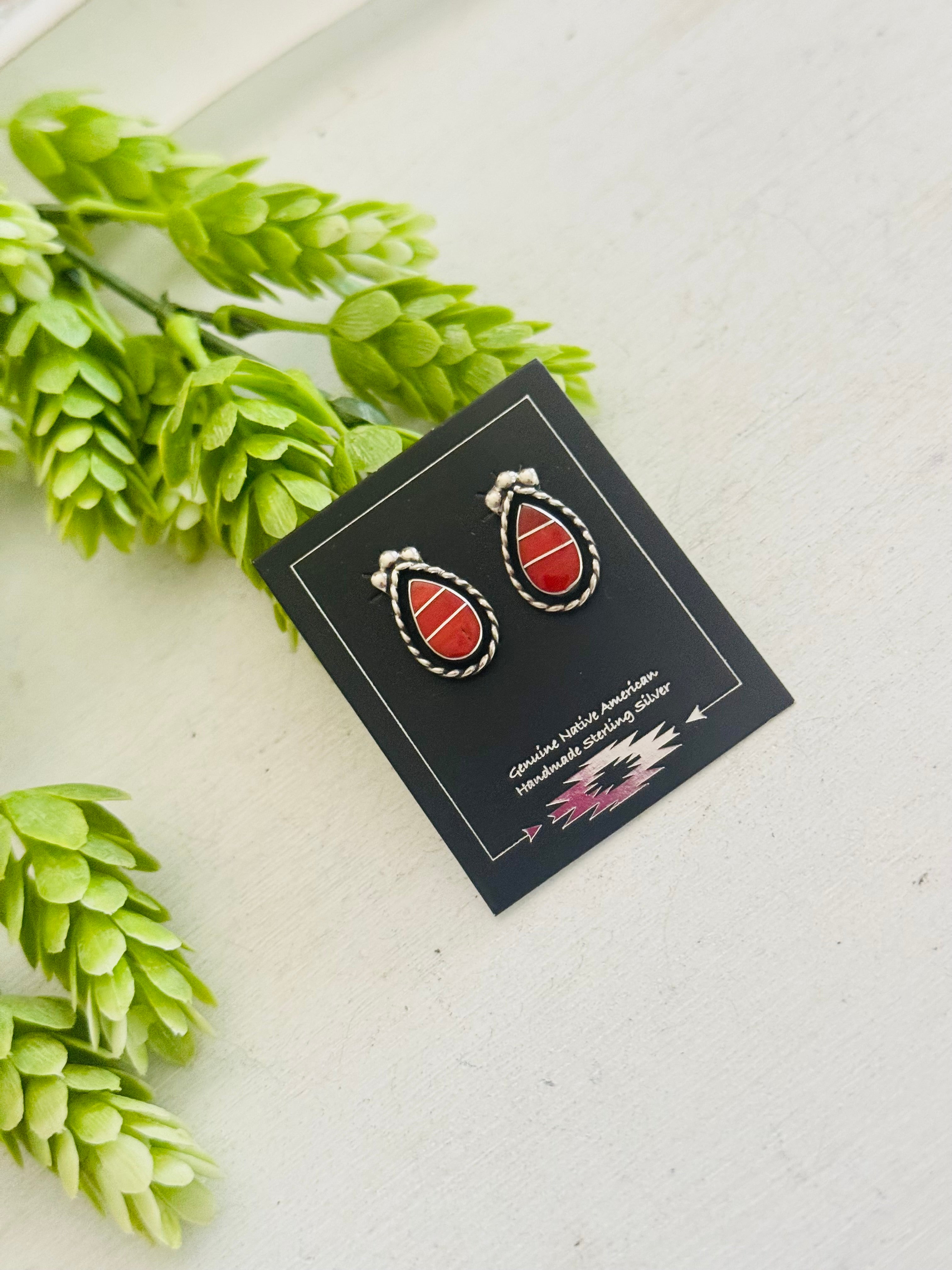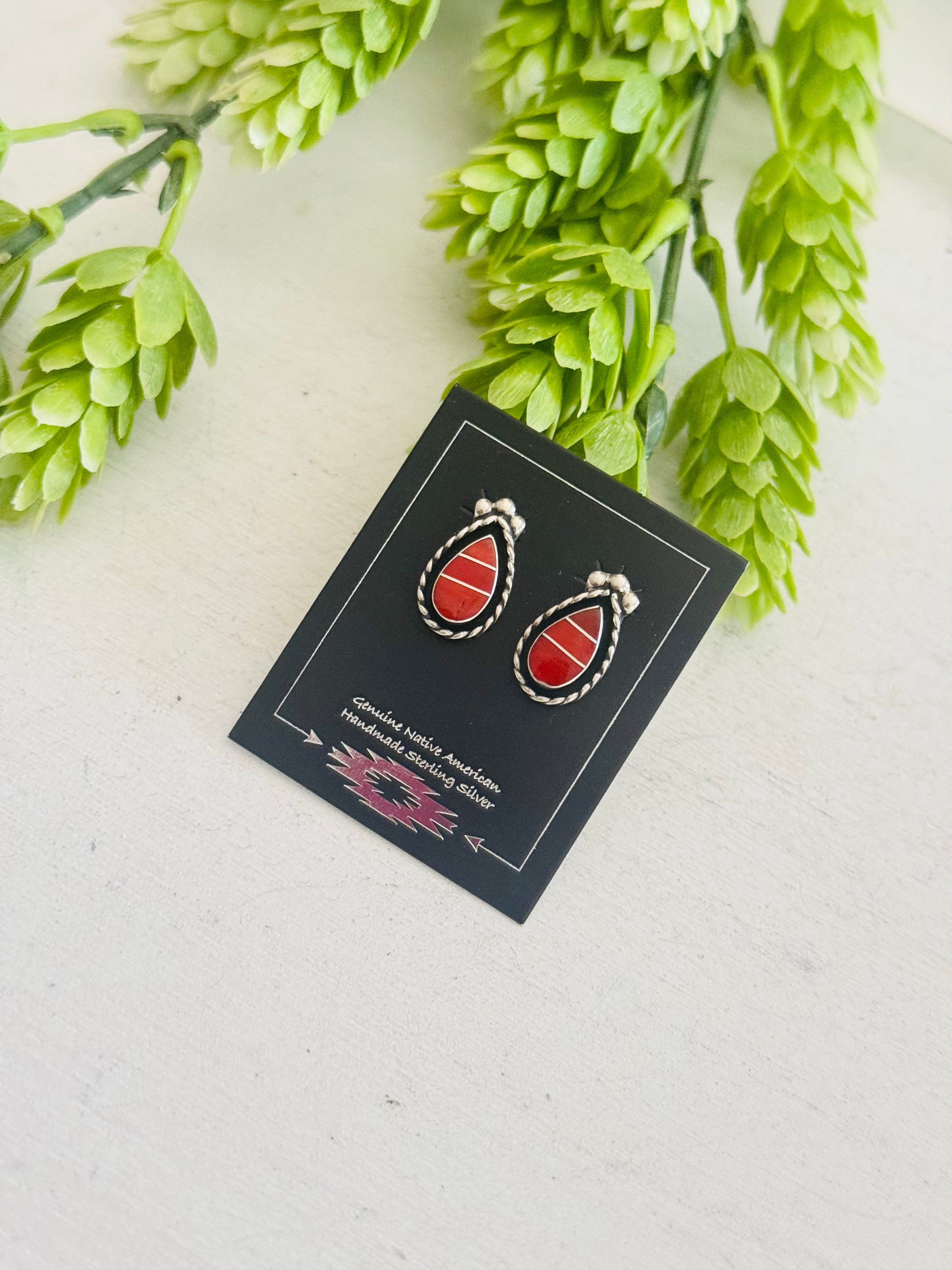 Zuni Made Coral & Sterling Silver Post Inlay Shadowbox Earrings. It measures just under 3/4 of an inch long and just under 1/2 of an inch wide. Stamped sterling silver and signed by artist.