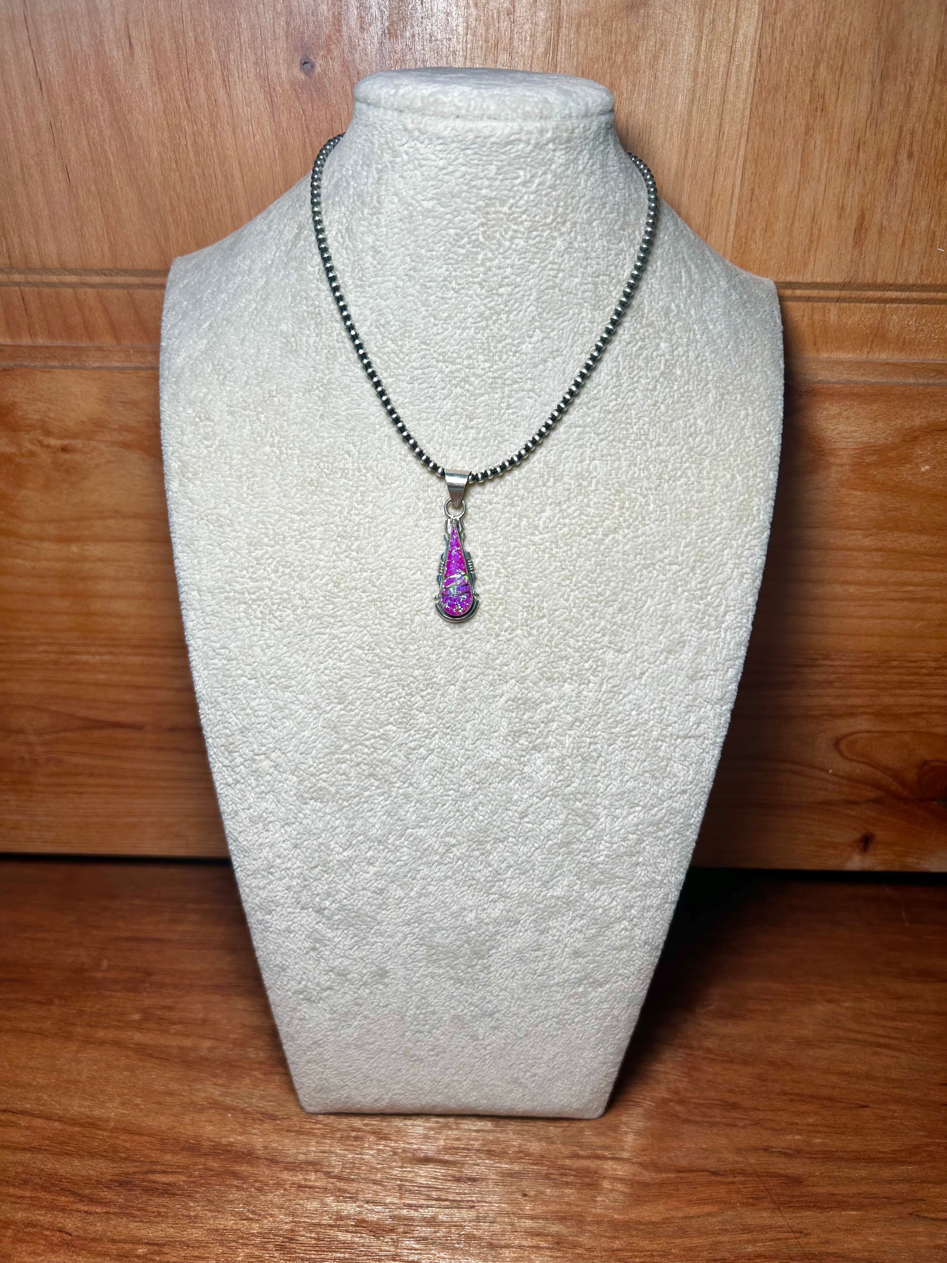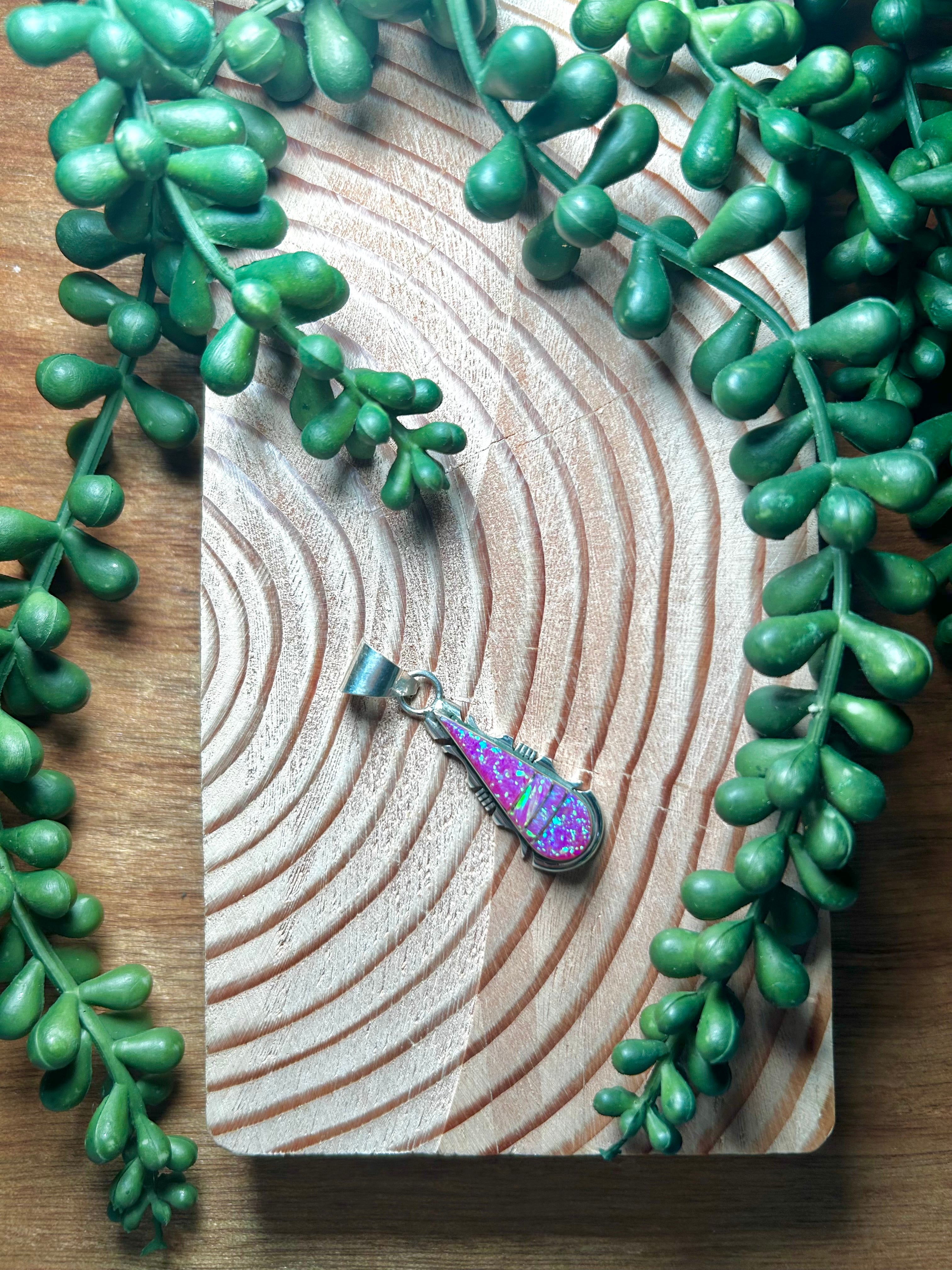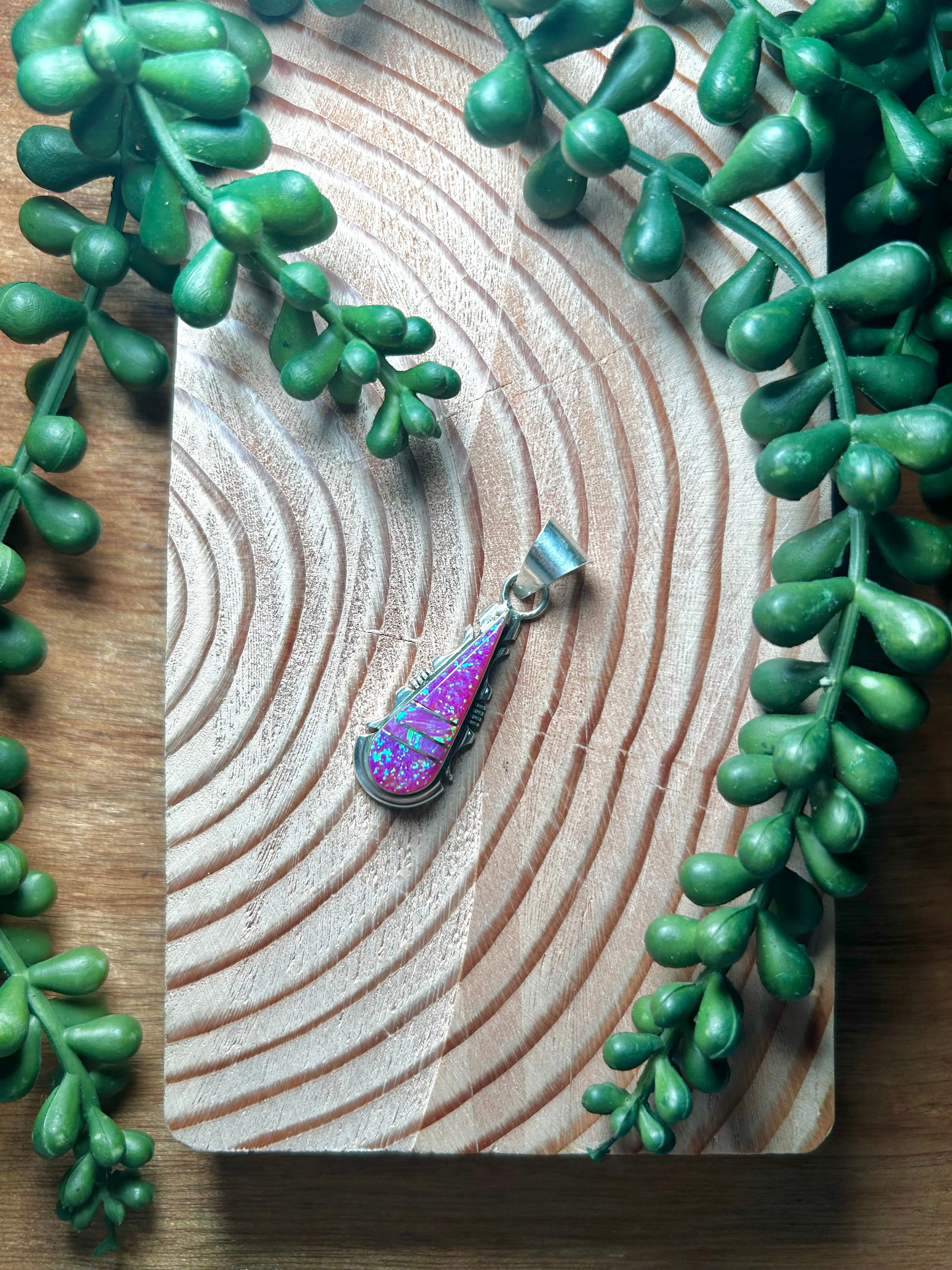 Steve Francisco Man-Made Opal & Sterling Silver Pendant. It measures 1 3/4 inches long and 1/2 of an inch wide. Signed by the artist and stamped sterling silver. Pendant only!