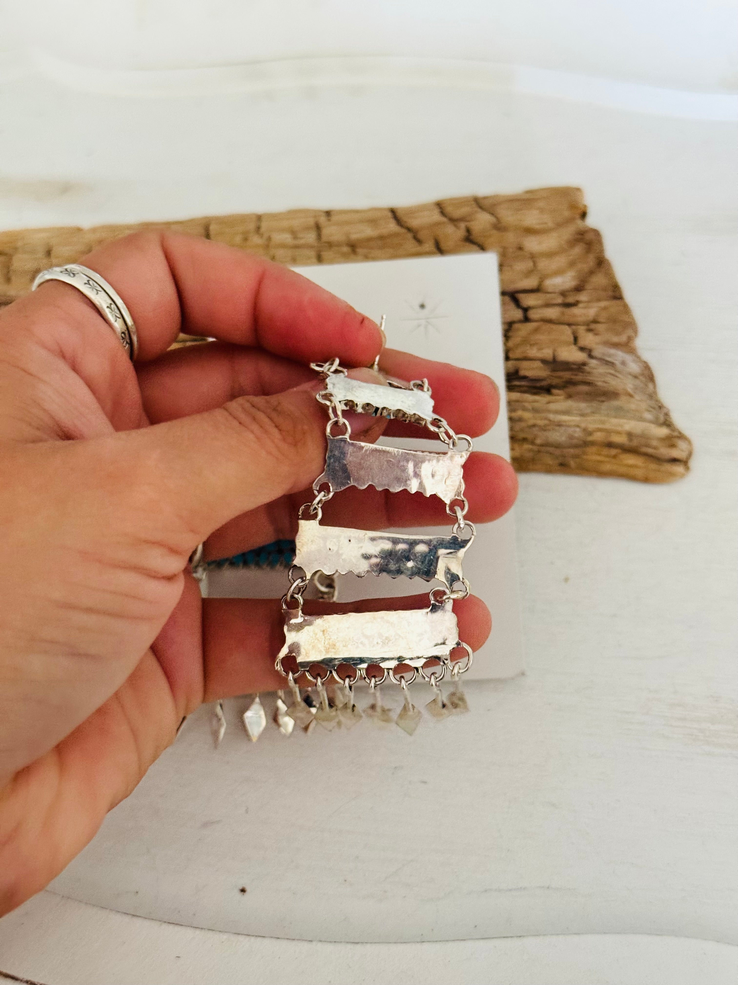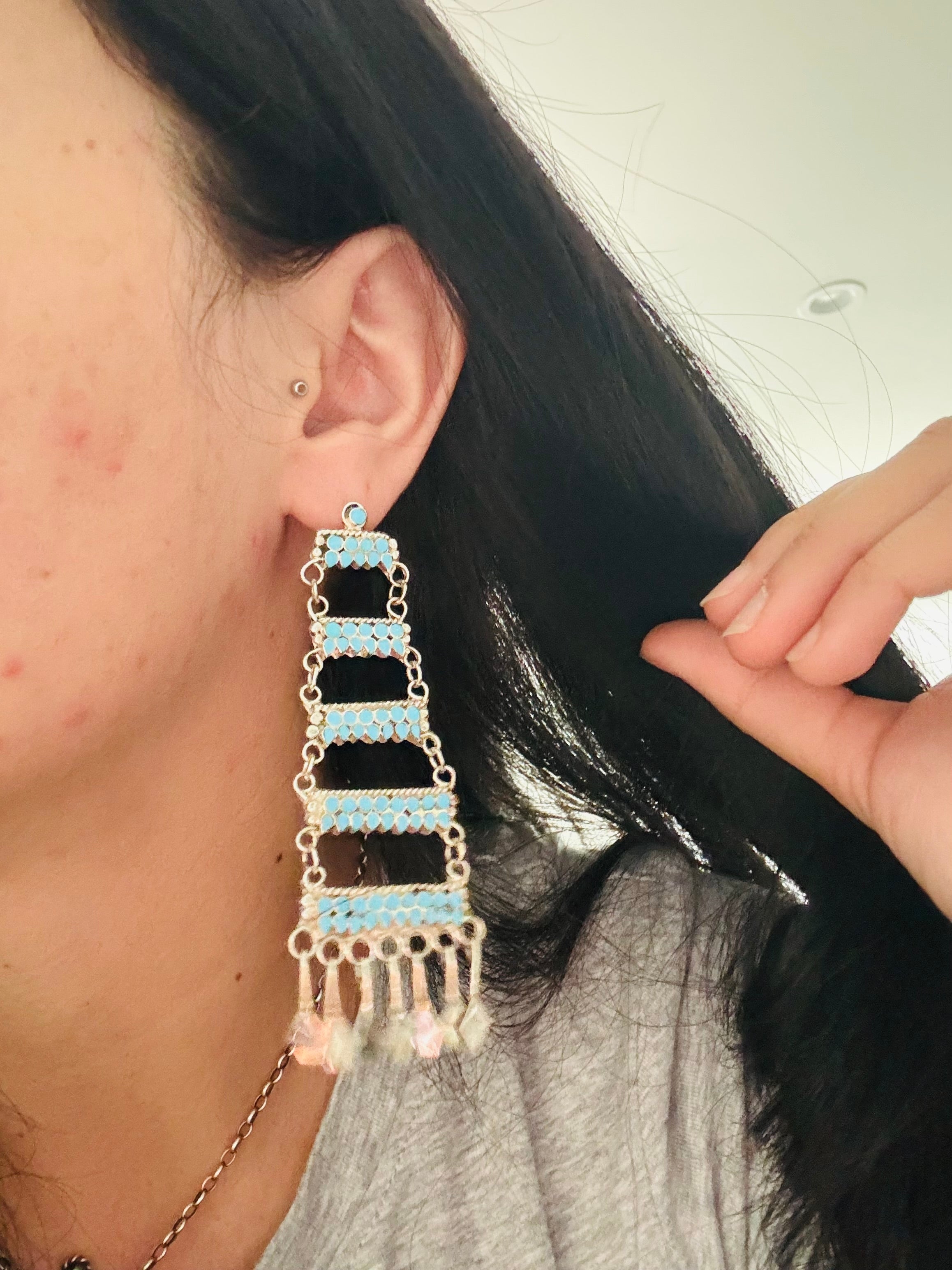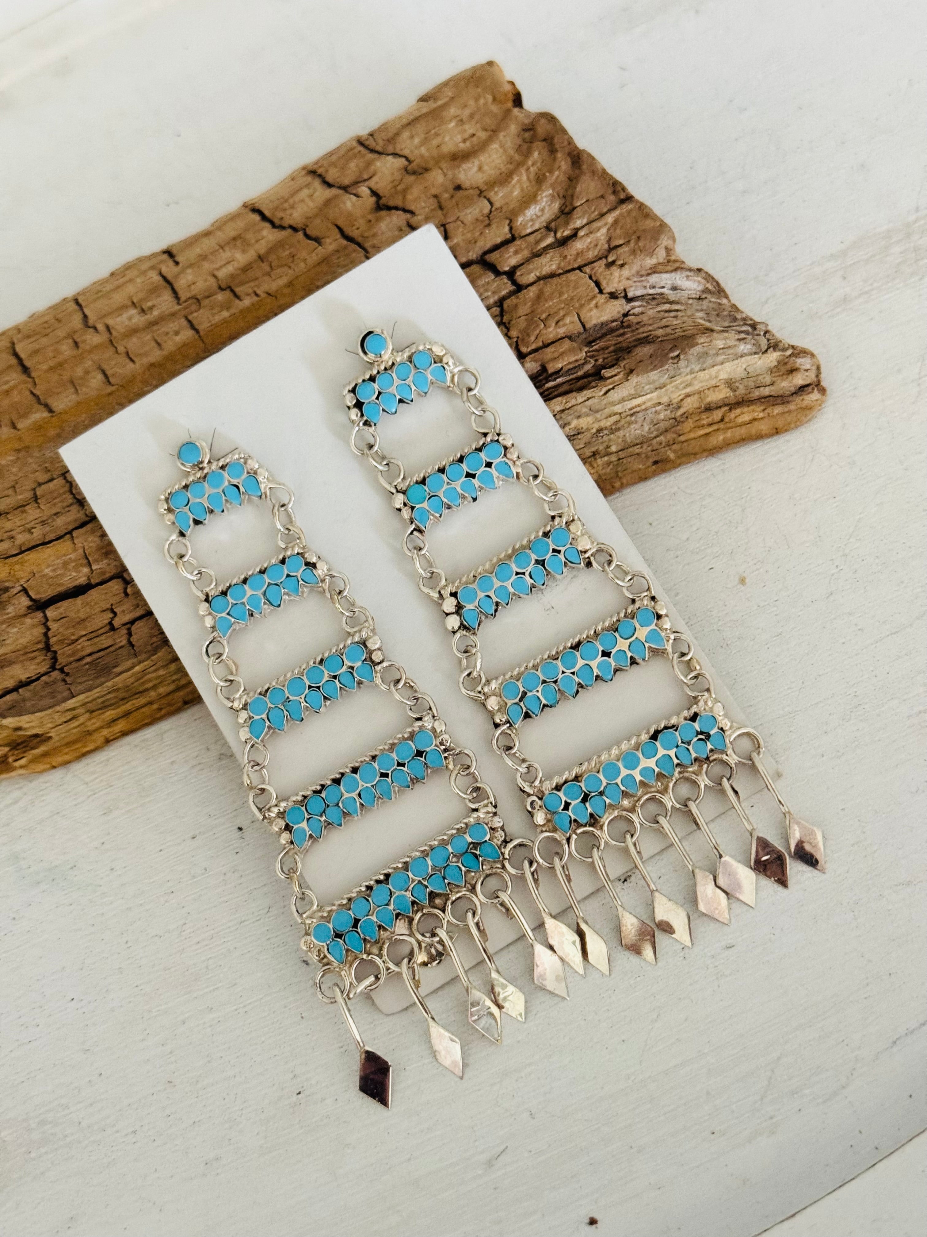 Have a spice of blue in your everyday. Zuni Made Kingman Turquoise & Sterling Silver Post Dangle Earrings. It measures 3 5/8 inches long and 1 1/4 inches wide. Stamped sterling silver and signed by artist.