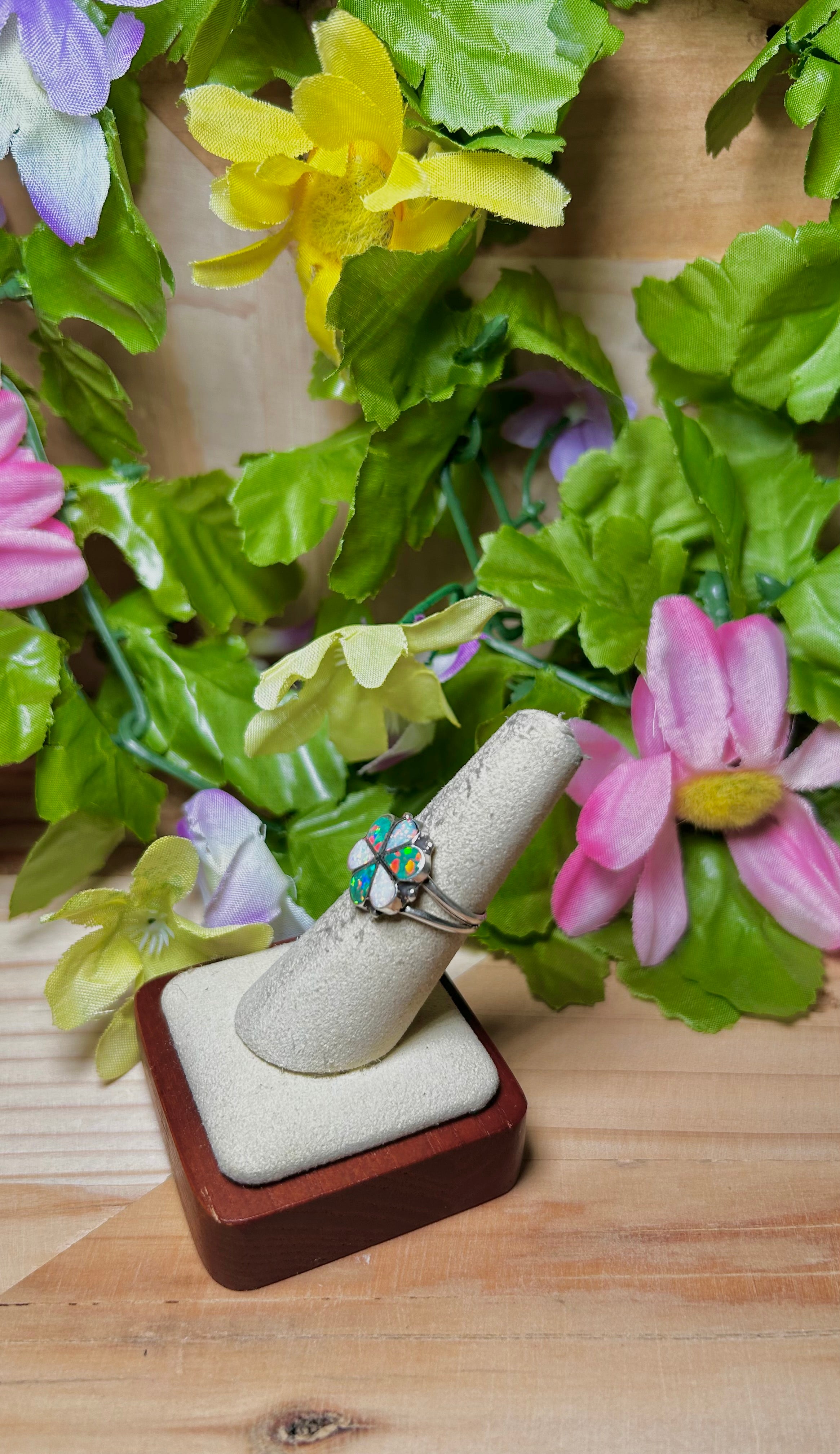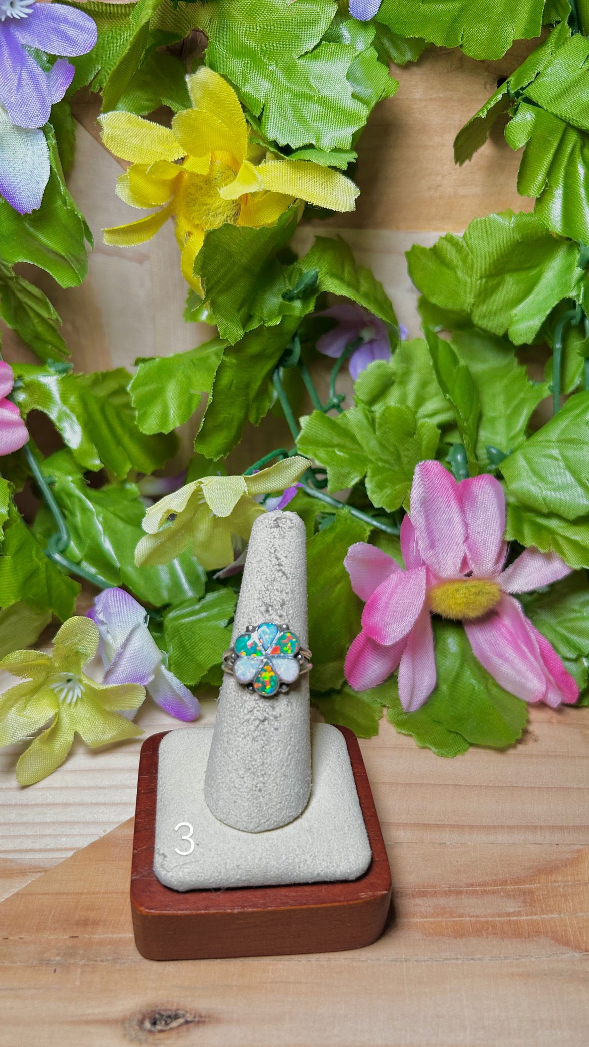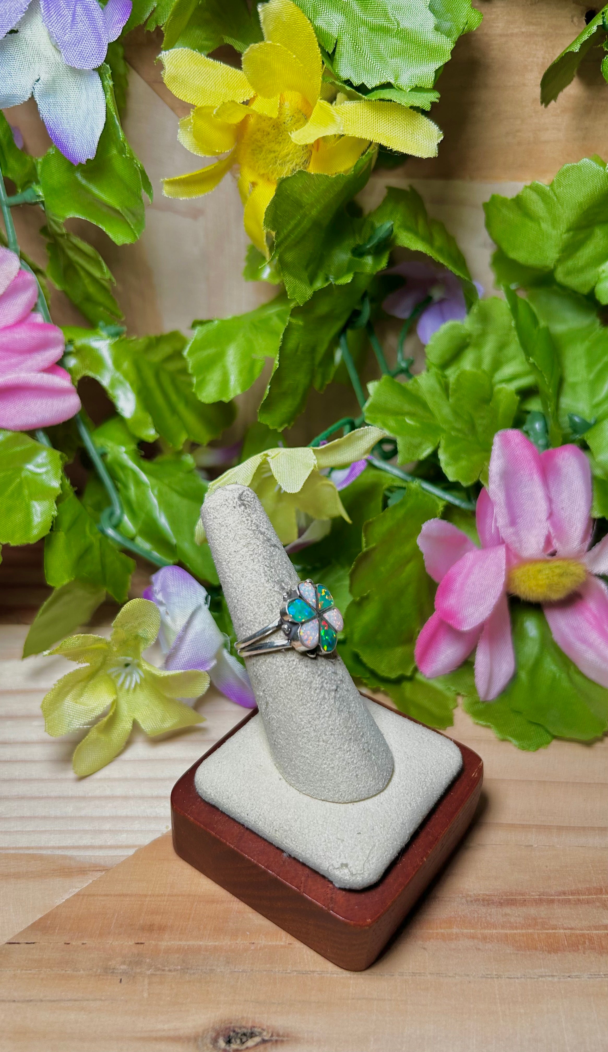 Zuni Made Opal & Sterling Silver Ring. It measures 5/8 of an inch long and 5/8 of an inch wide. Stamped sterling silver.