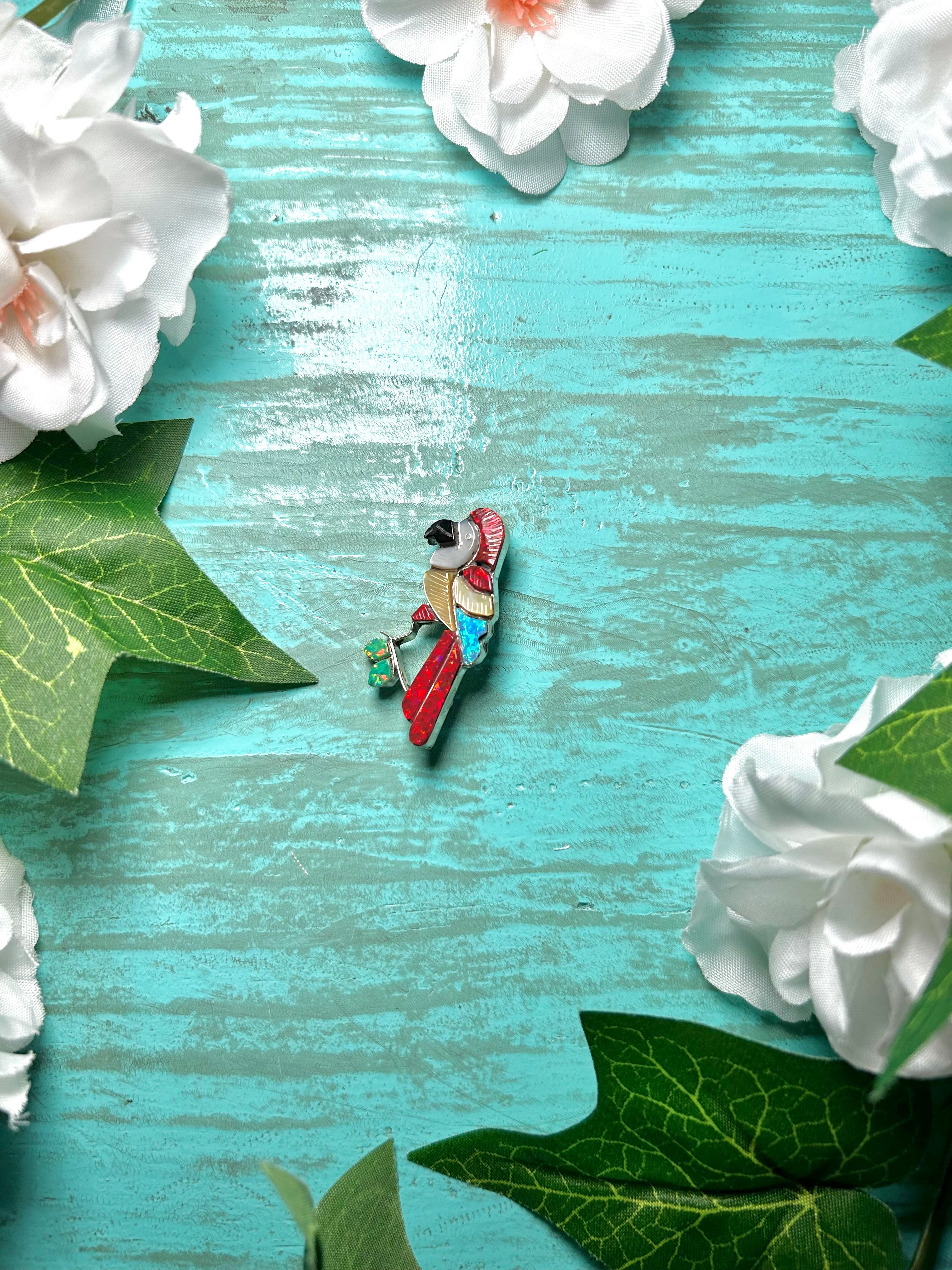 Zuni Man Multi Stone Inlay Sterling Silver Pendant/Pin. It measures 1 1/2 inches long and 5/8 of an inch wide. Pendant/Pin Only! Signed by the artist and stamped sterling silver.