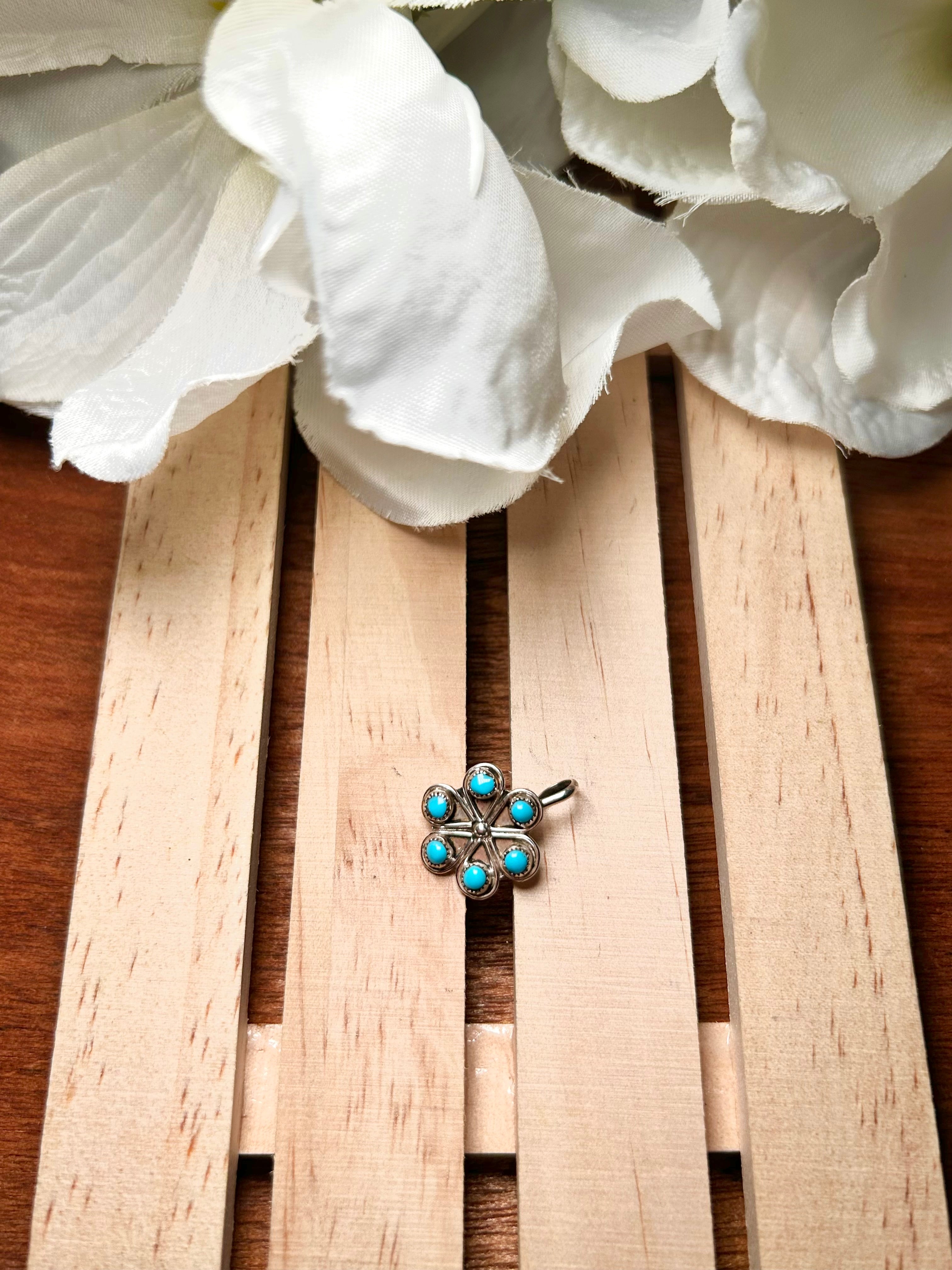 Zuni Made Kingman Turquoise & Sterling Silver Pendant. It measures 7/8 of an inch long and 5/8 of an inch wide. Pendant Only. Signed by the artist and stamped sterling silver.