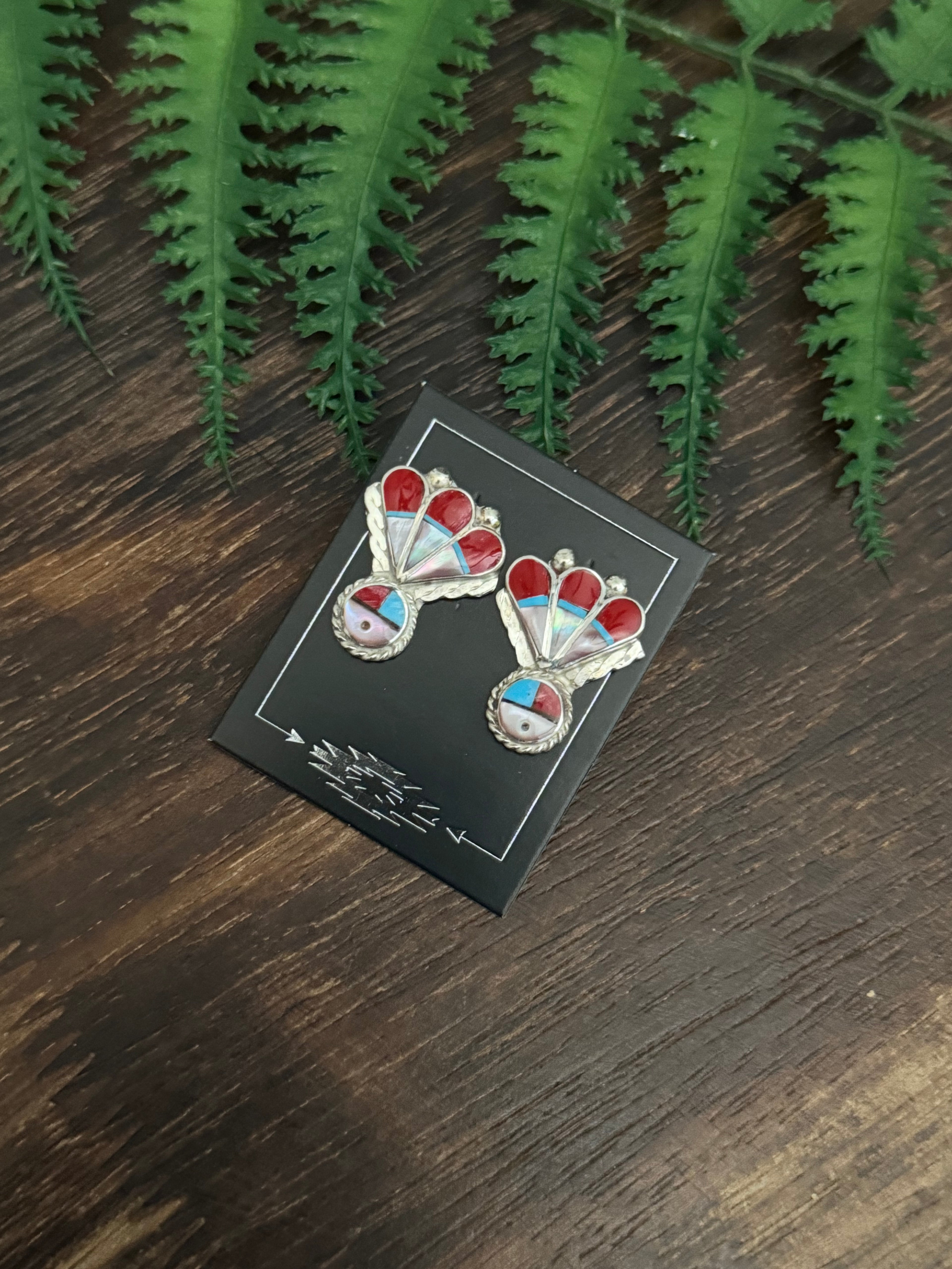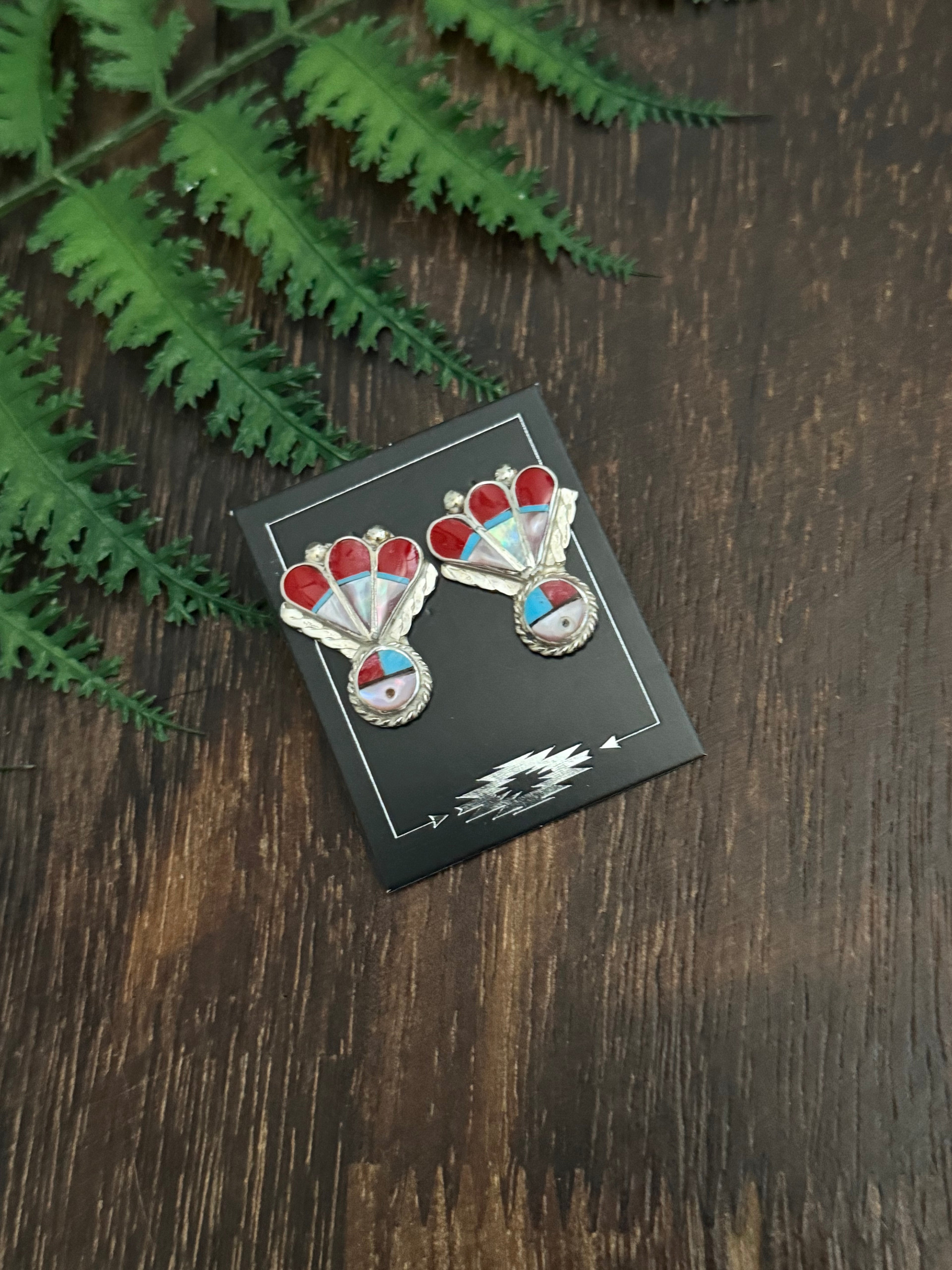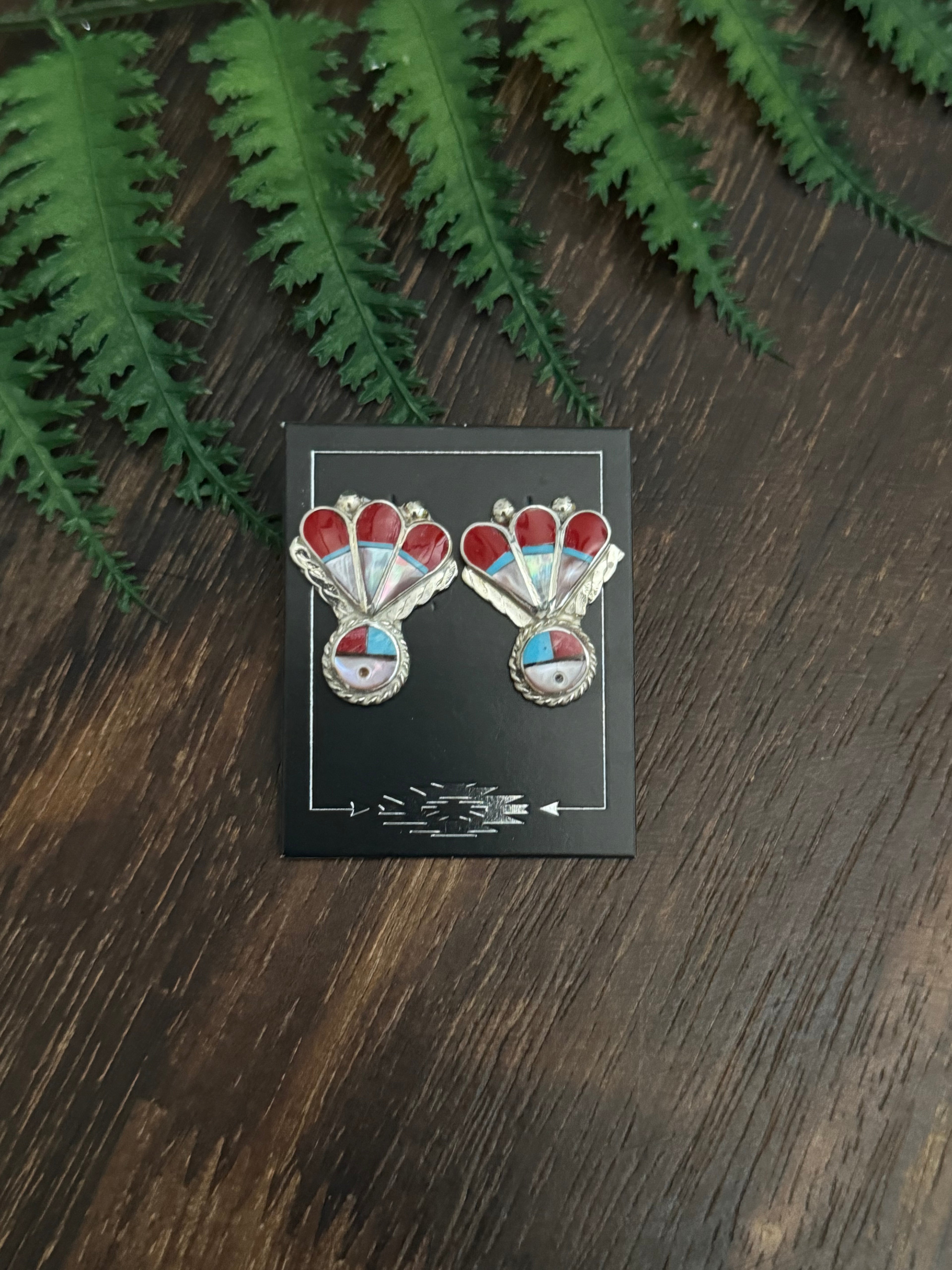 Zuni Made Multi Stone & Sterling Silver Post Dangle Sunface Cluster Earrings