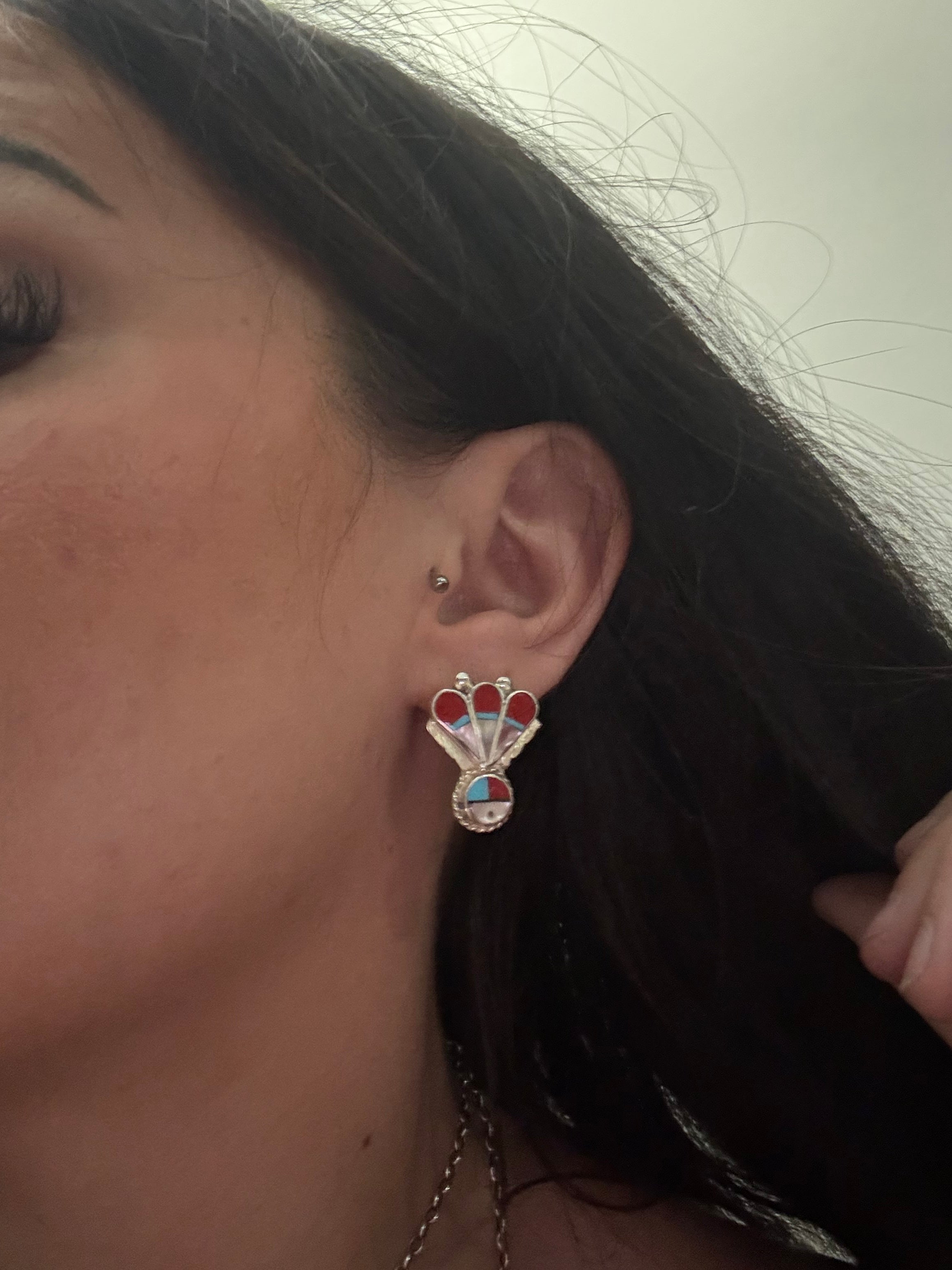 Have a spice in your everyday. Zuni Made Multi Stone & Sterling Silver Post Dangle Sunface Cluster Earrings. It measures 1 inch long and just over 3/4 of an inch wide.
